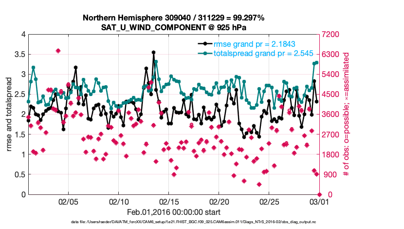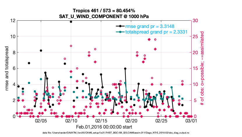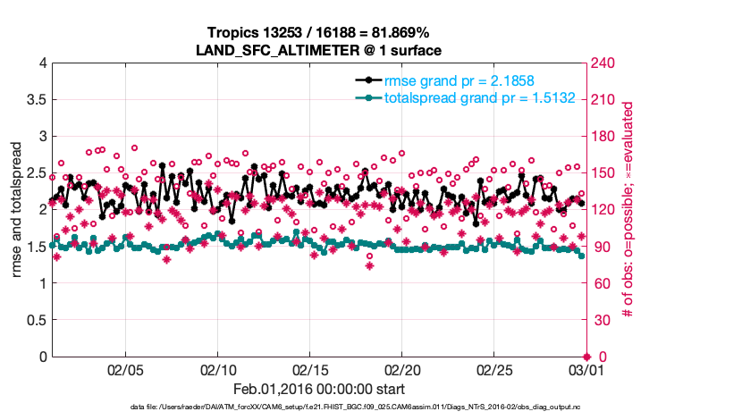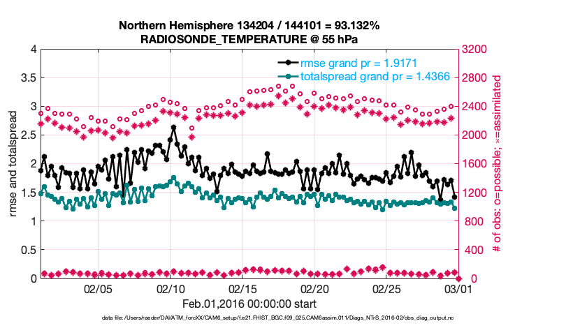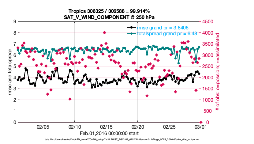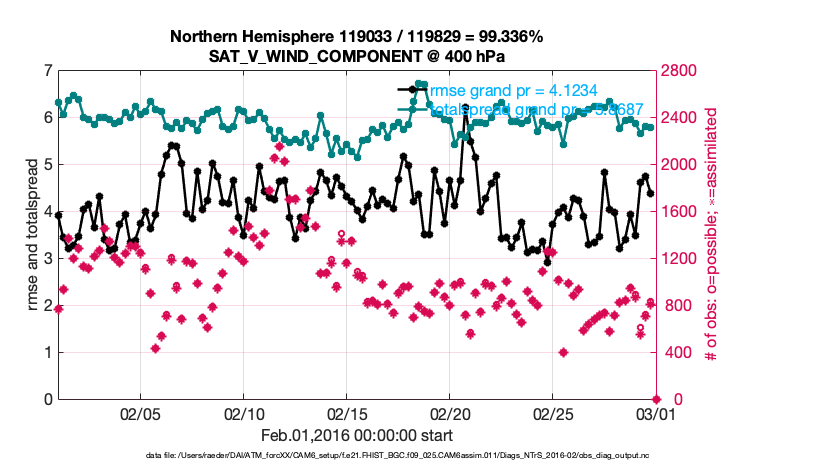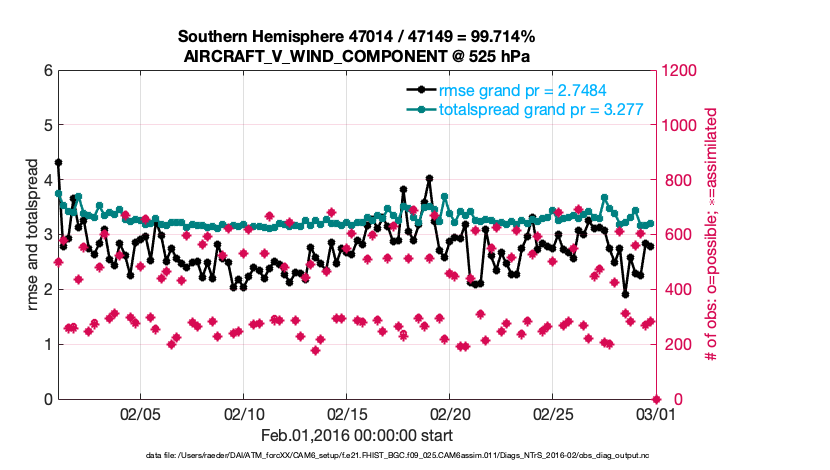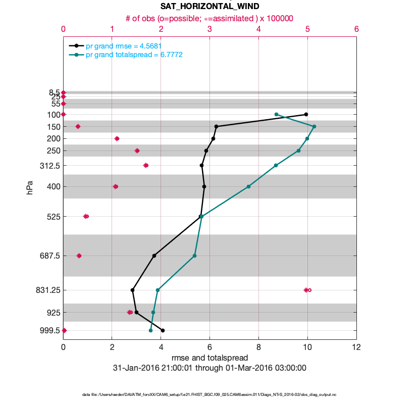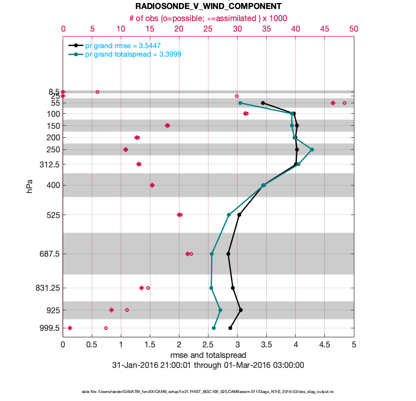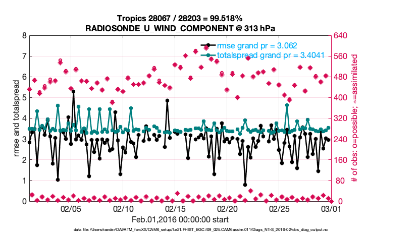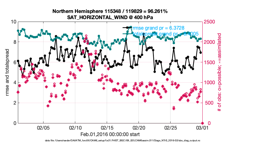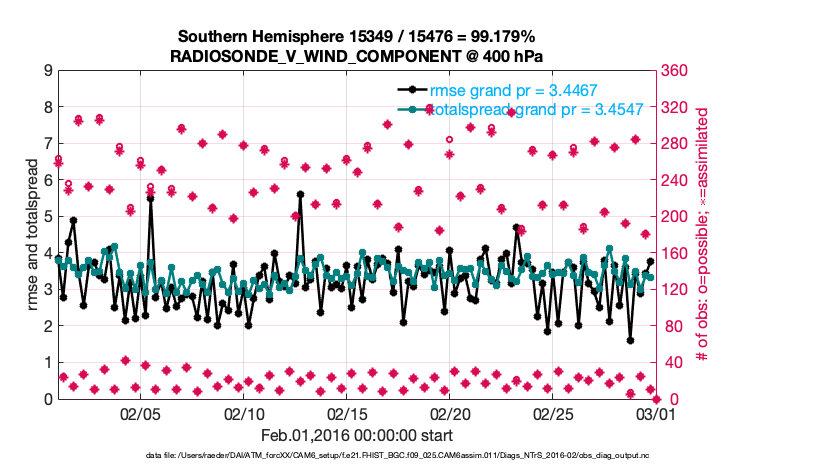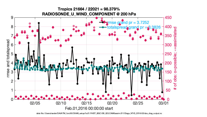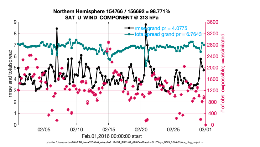 For each observation kind, the root-mean-squared-error (RMSE) is plotted together with: (i) BIAS and (ii) TOTALSPREAD. The number of available, assimilated (evaluated) and rejected observations are also shown on the plots.