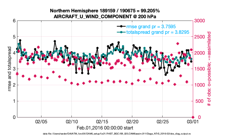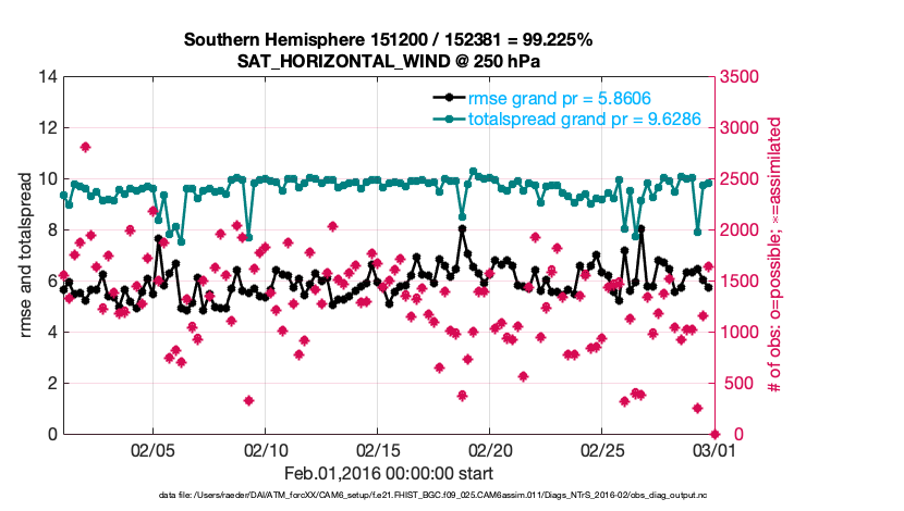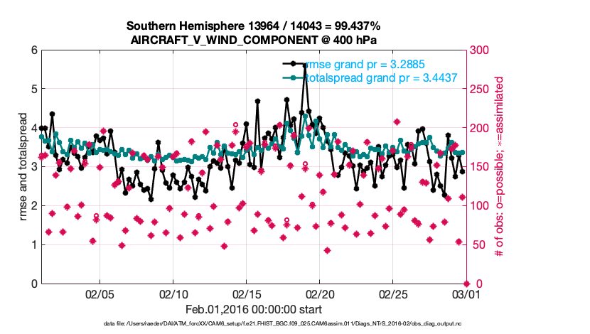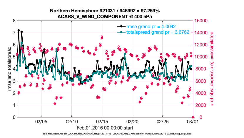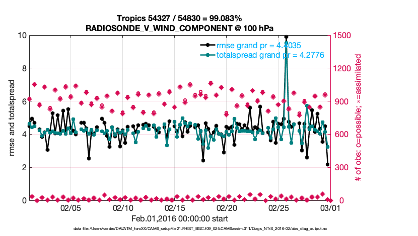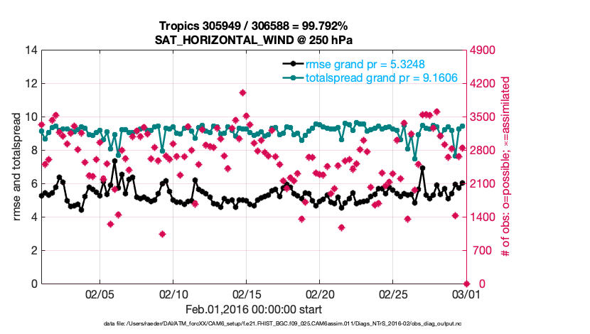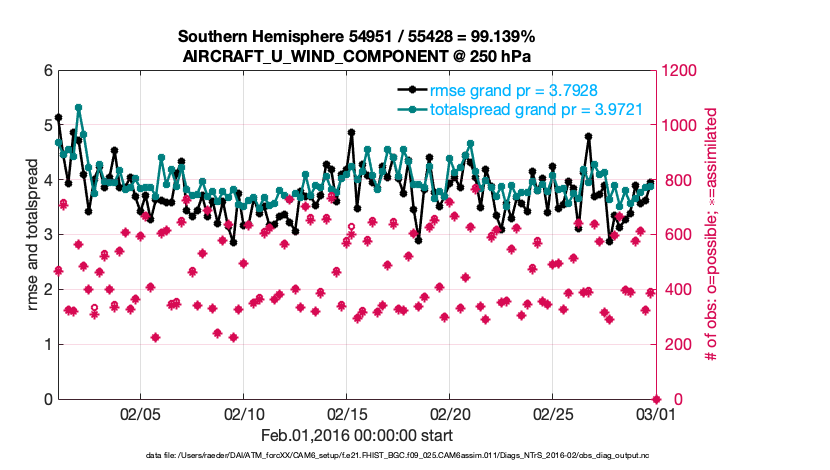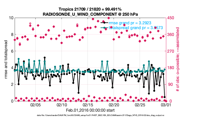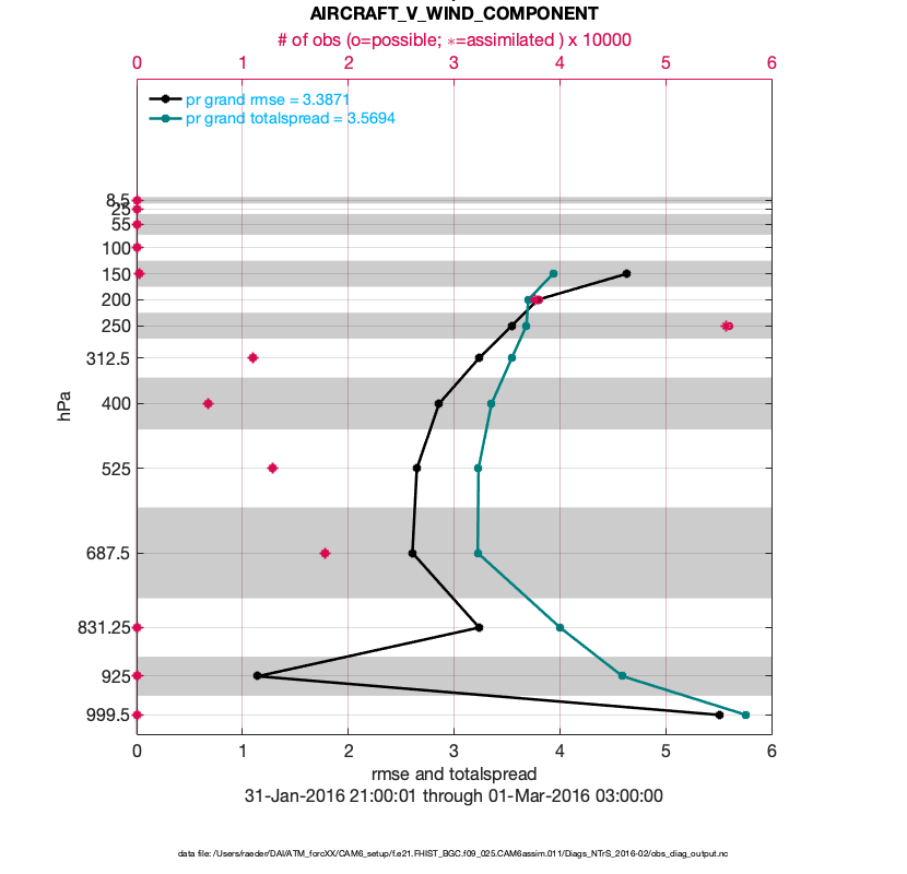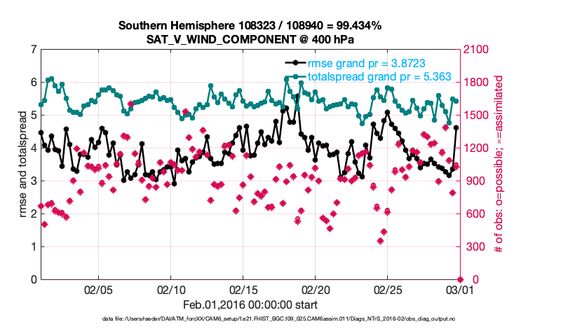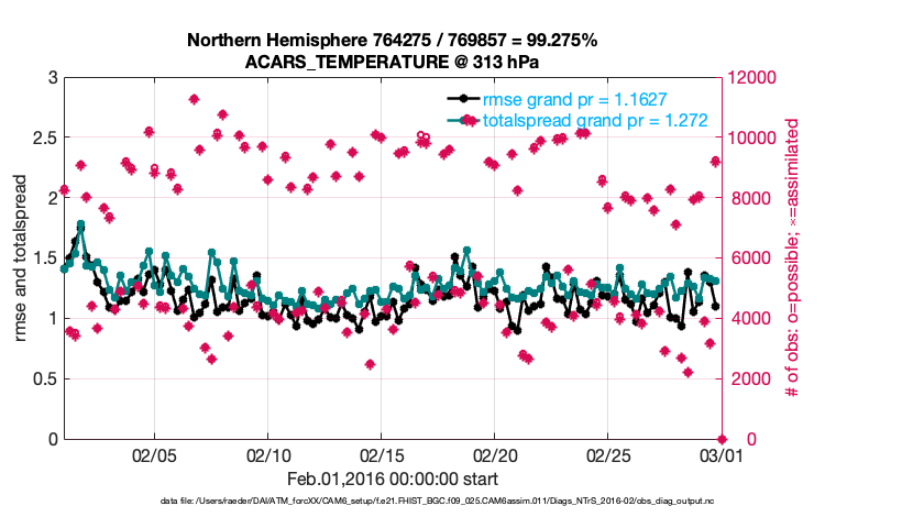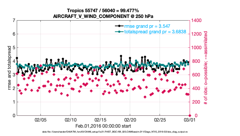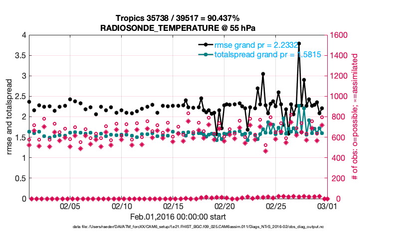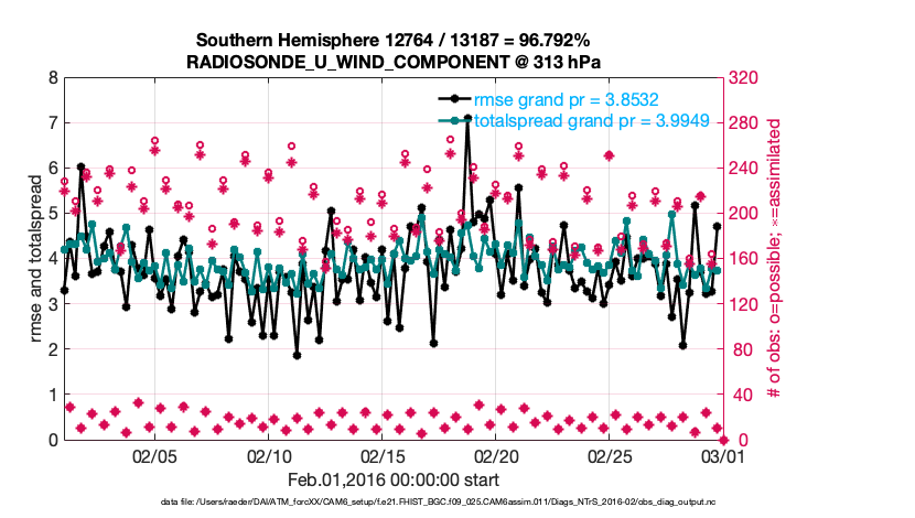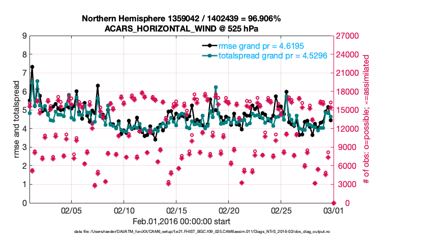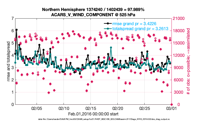 For each observation kind, the root-mean-squared-error (RMSE) is plotted together with: (i) BIAS and (ii) TOTALSPREAD. The number of available, assimilated (evaluated) and rejected observations are also shown on the plots.