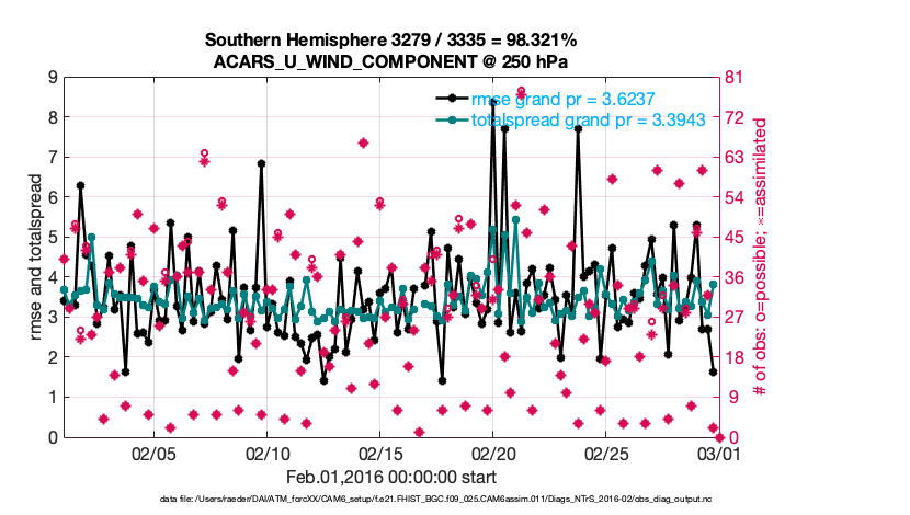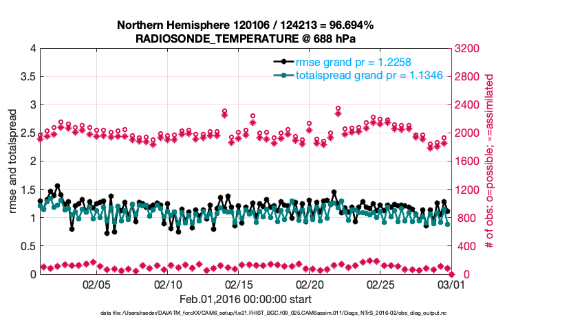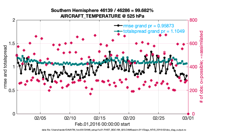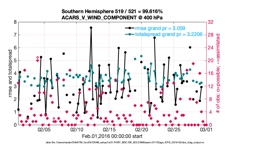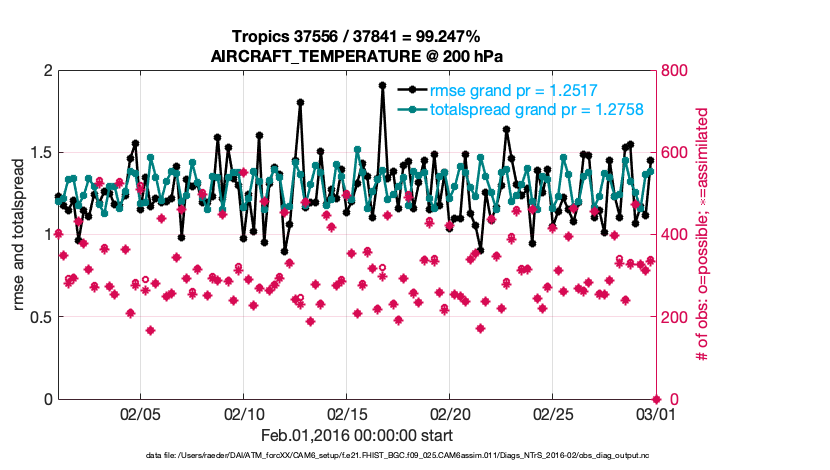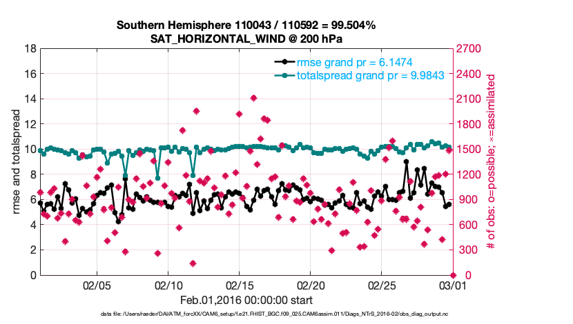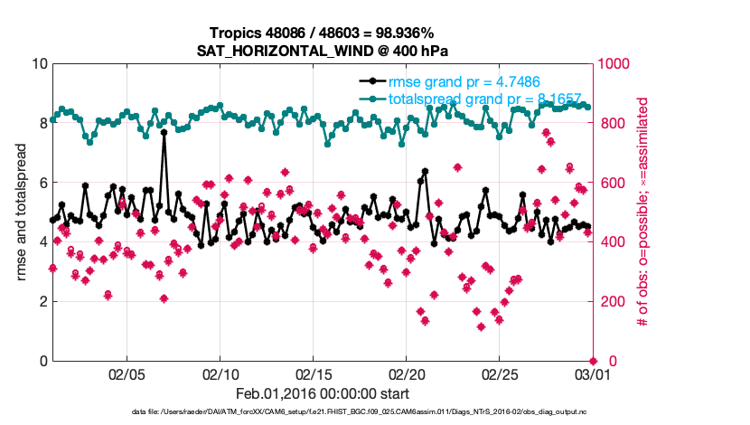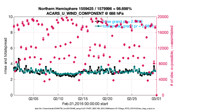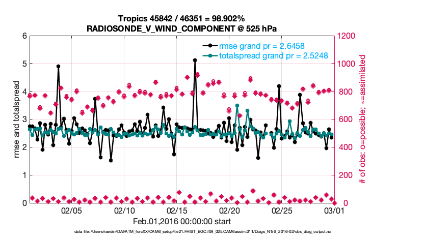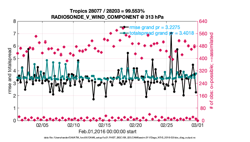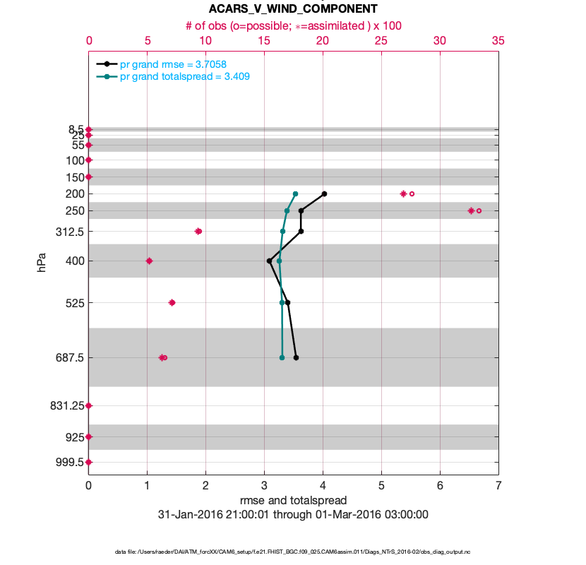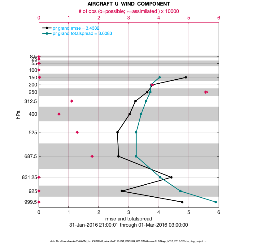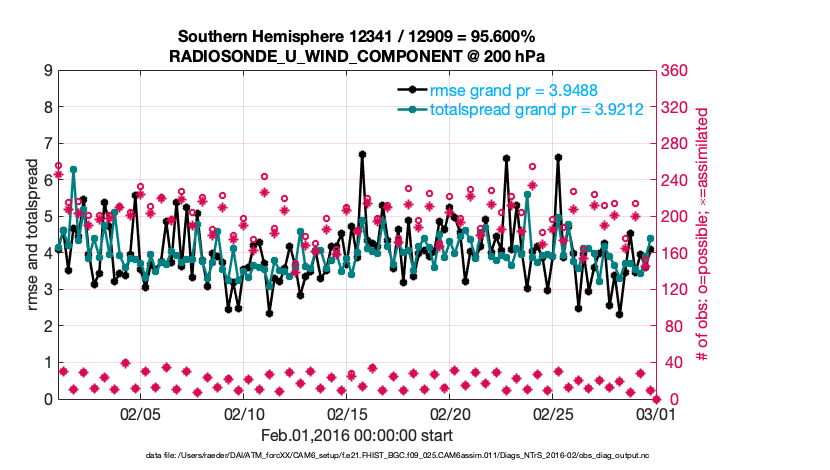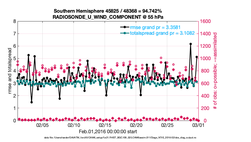 For each observation kind, the root-mean-squared-error (RMSE) is plotted together with: (i) BIAS and (ii) TOTALSPREAD. The number of available, assimilated (evaluated) and rejected observations are also shown on the plots.