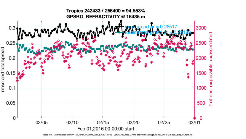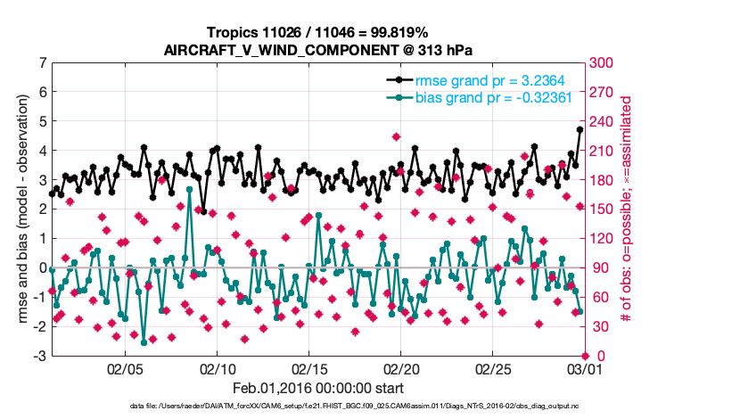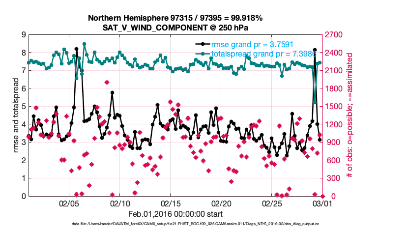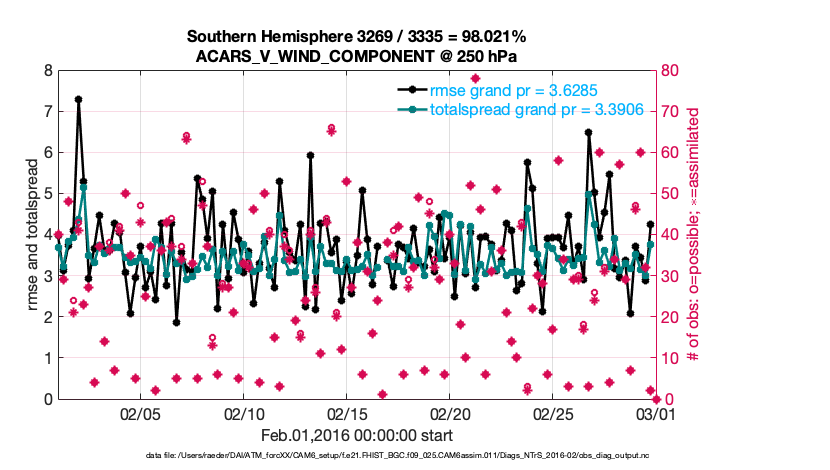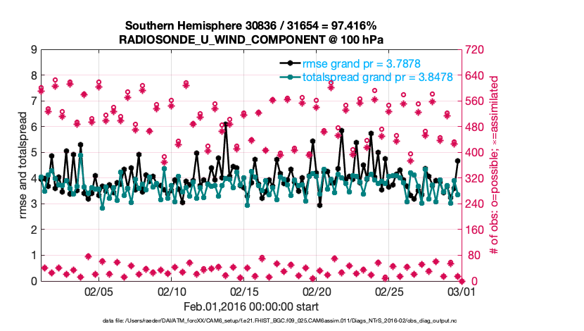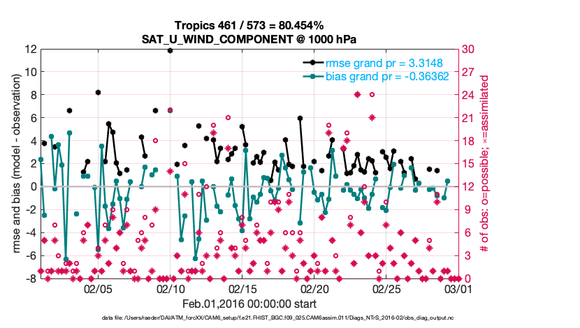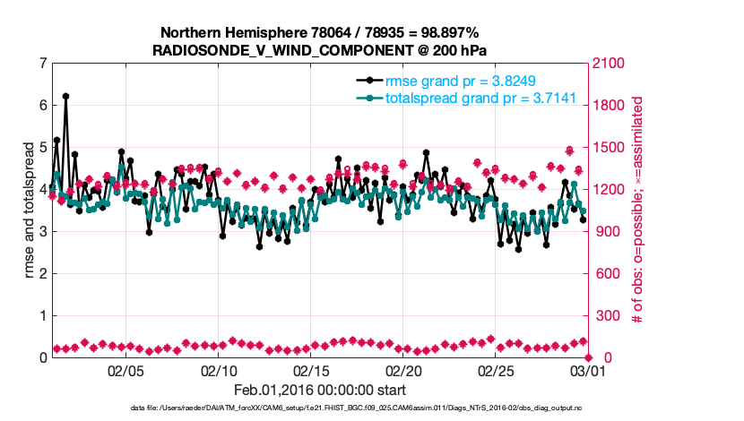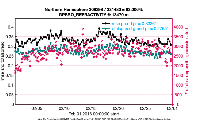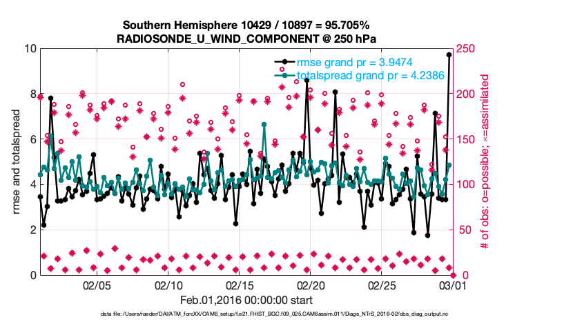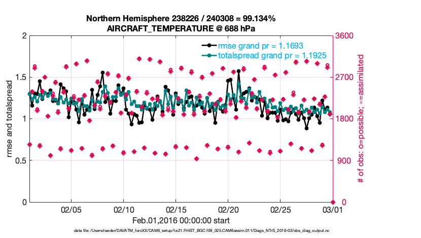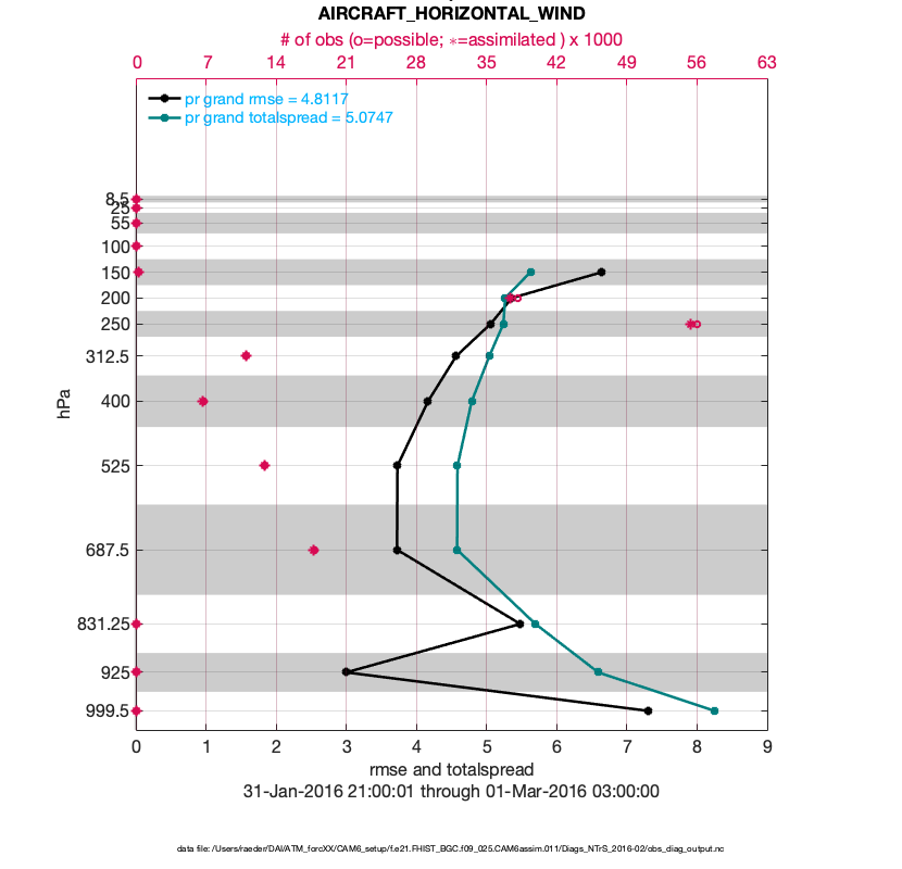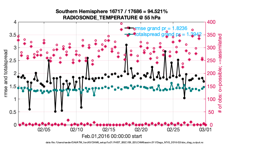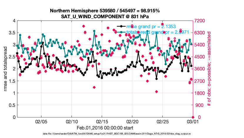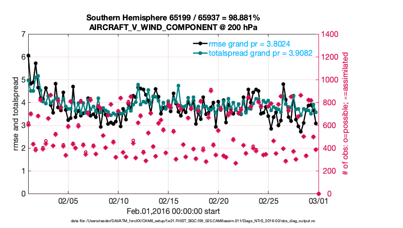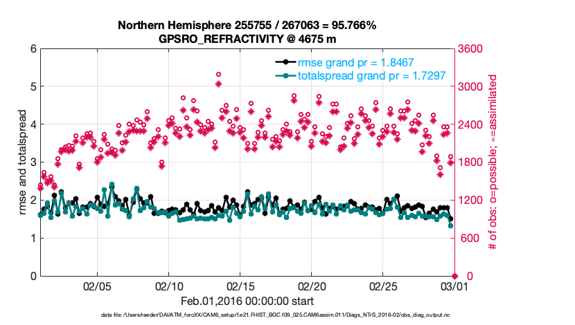 For each observation kind, the root-mean-squared-error (RMSE) is plotted together with: (i) BIAS and (ii) TOTALSPREAD. The number of available, assimilated (evaluated) and rejected observations are also shown on the plots.