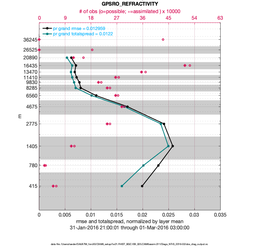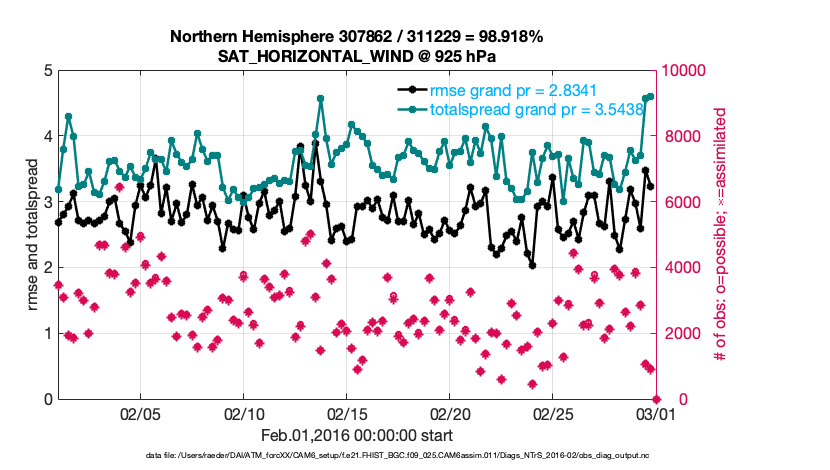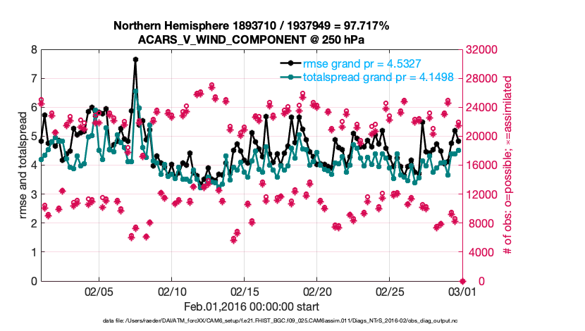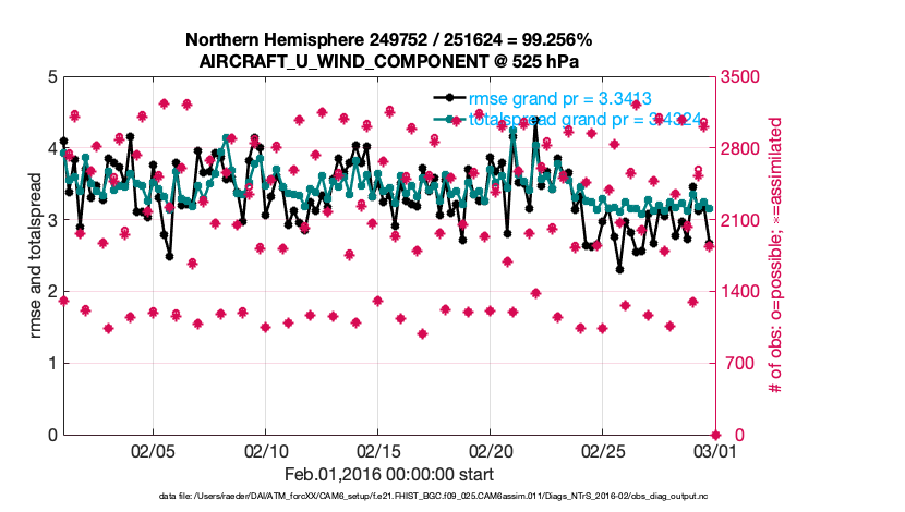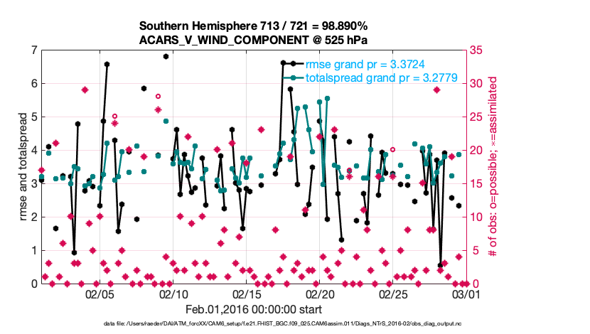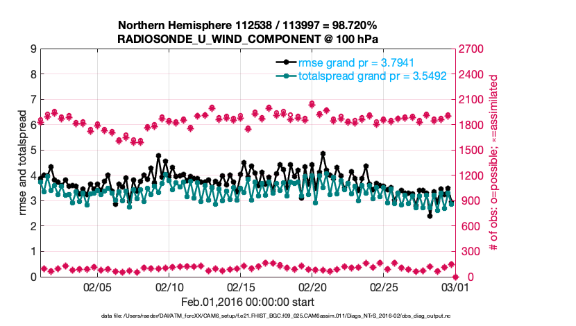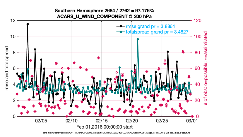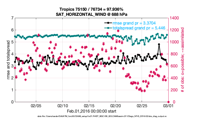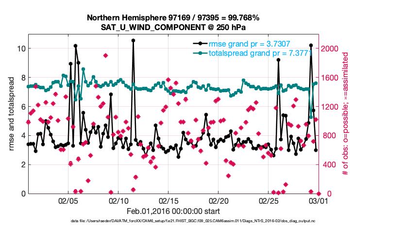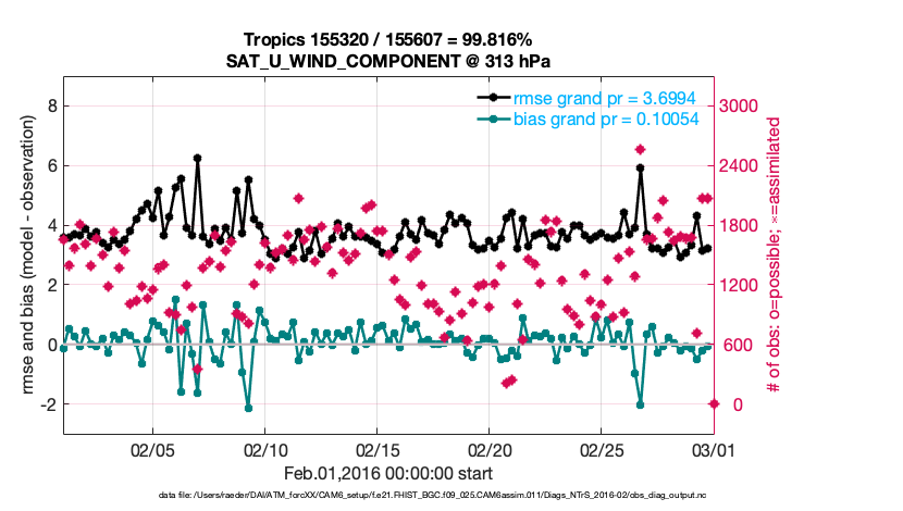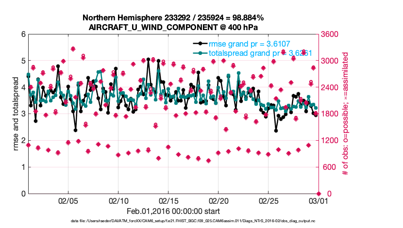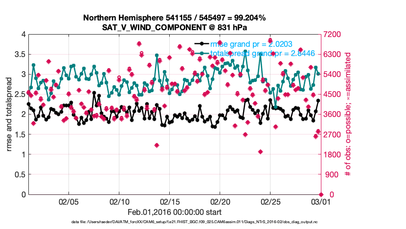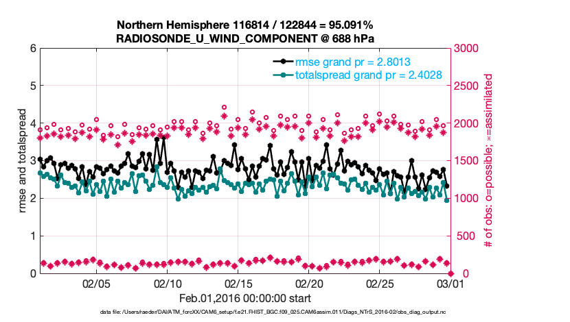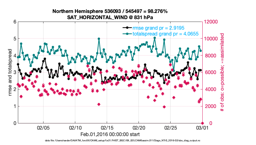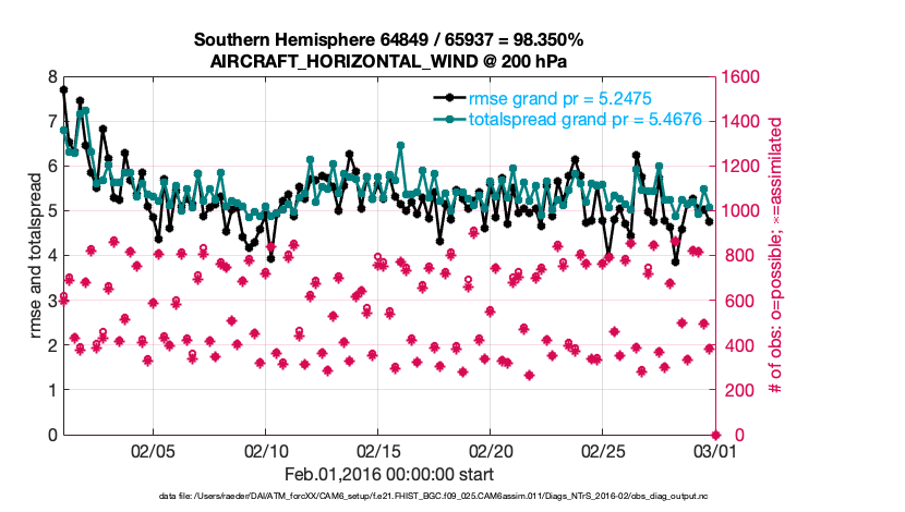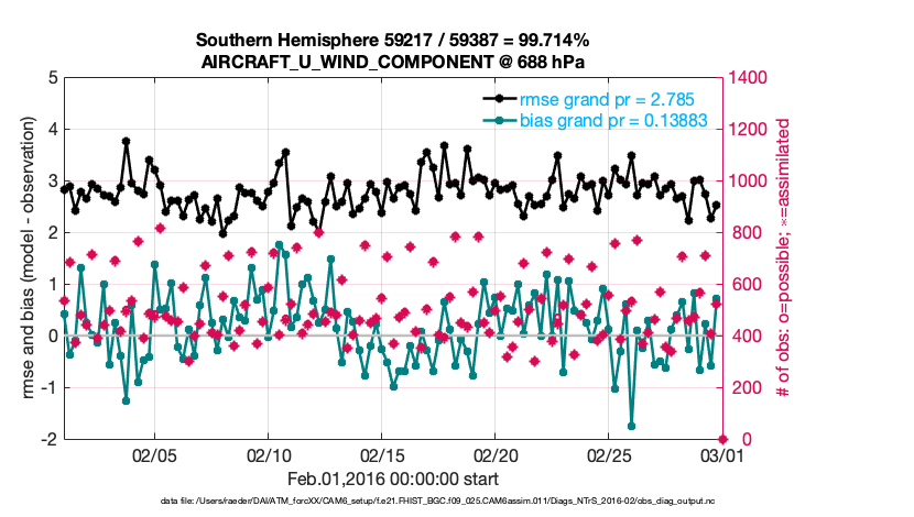 For each observation kind, the root-mean-squared-error (RMSE) is plotted together with: (i) BIAS and (ii) TOTALSPREAD. The number of available, assimilated (evaluated) and rejected observations are also shown on the plots.