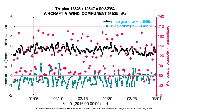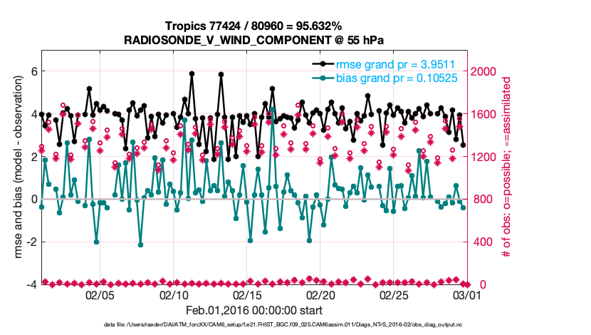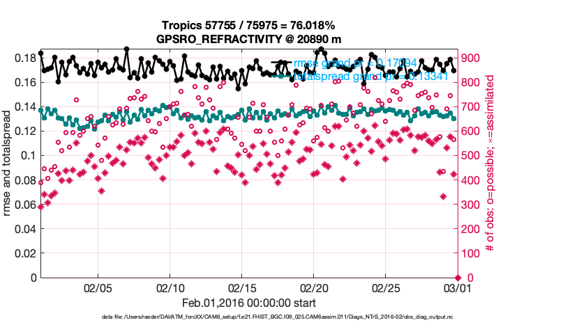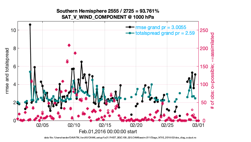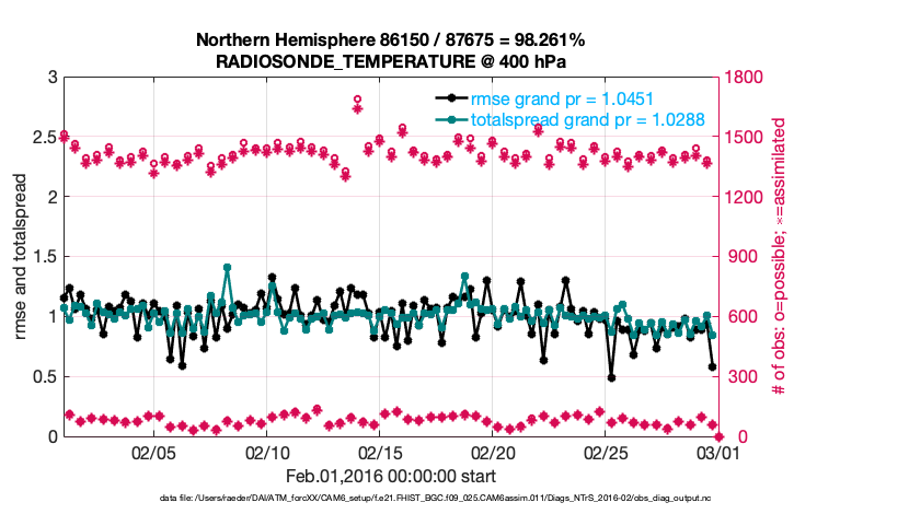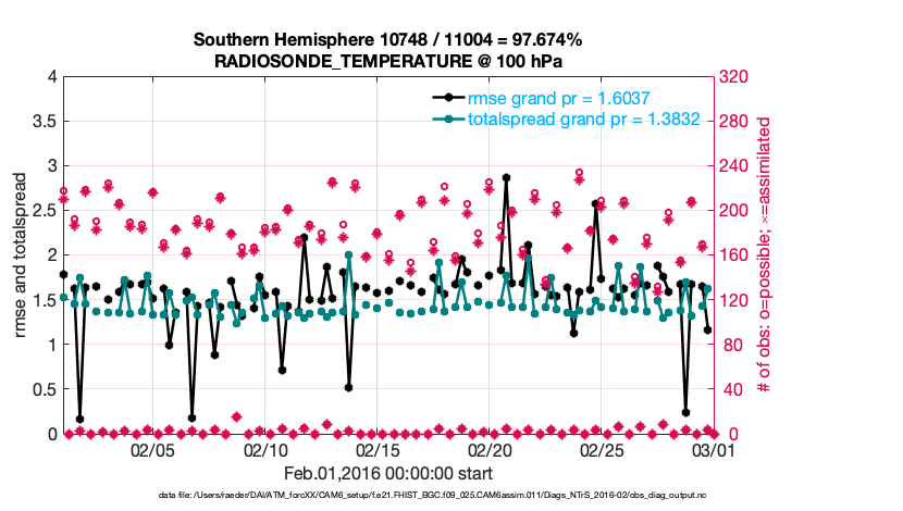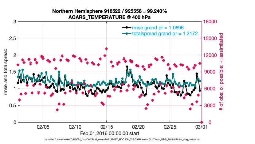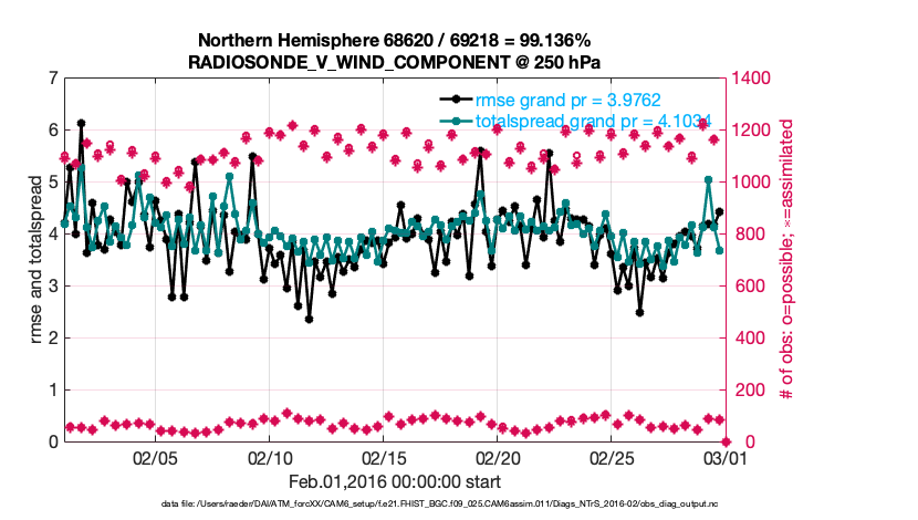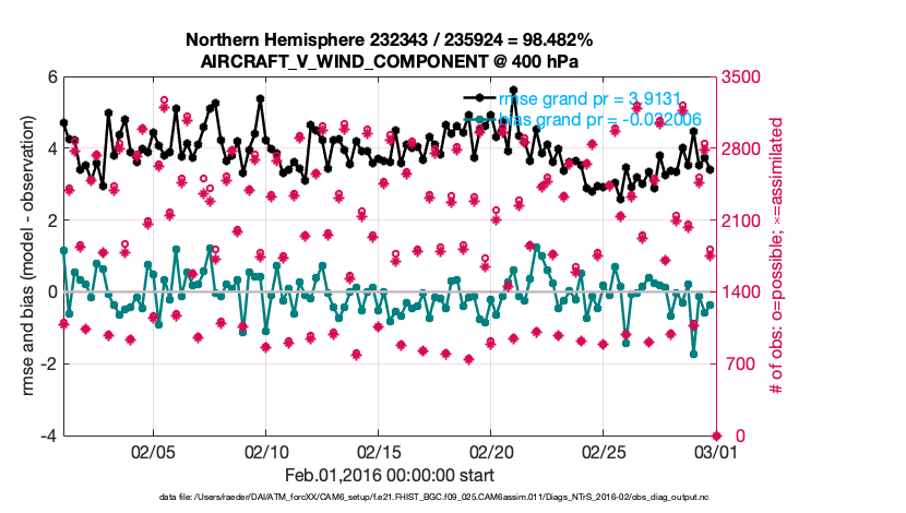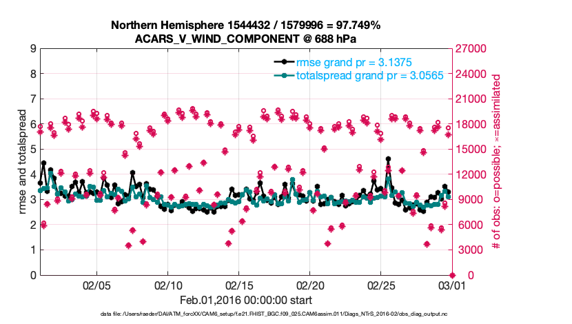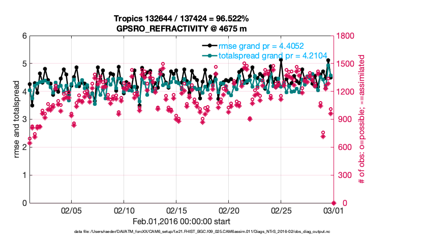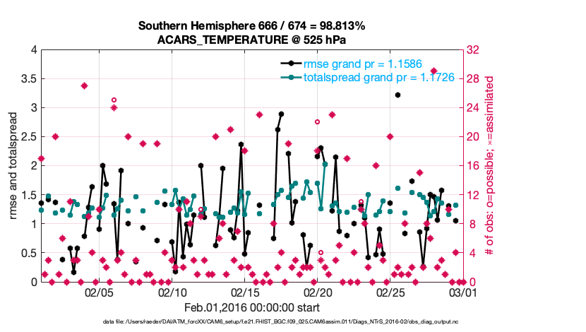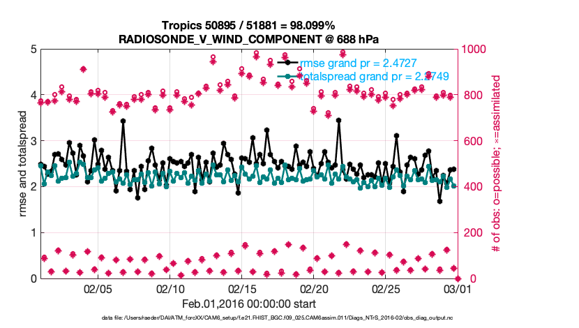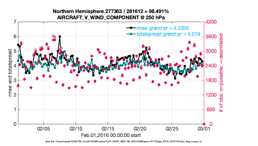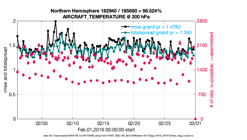 For each observation kind, the root-mean-squared-error (RMSE) is plotted together with: (i) BIAS and (ii) TOTALSPREAD. The number of available, assimilated (evaluated) and rejected observations are also shown on the plots.