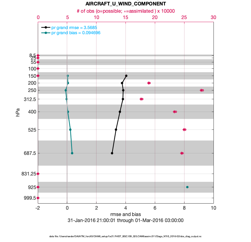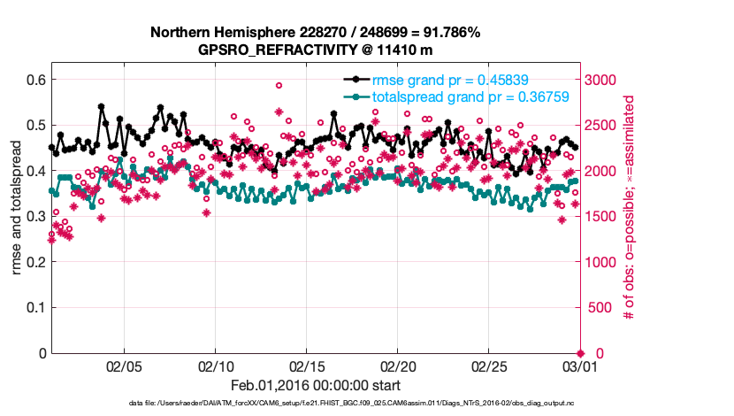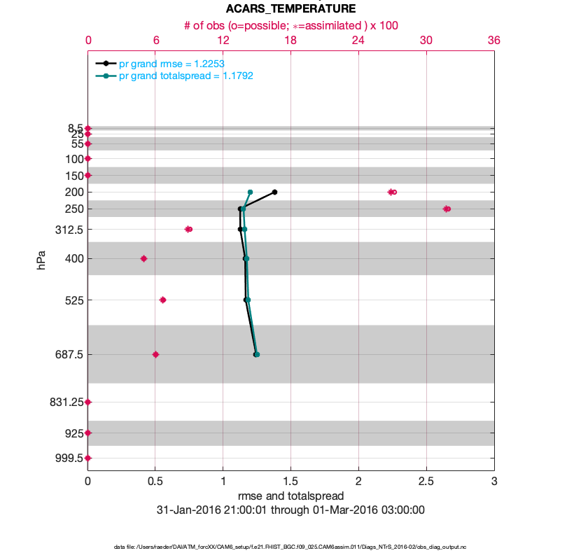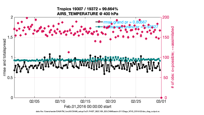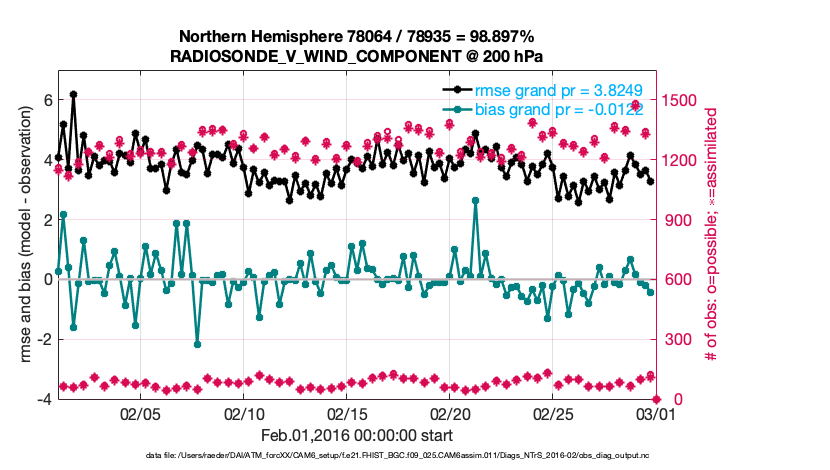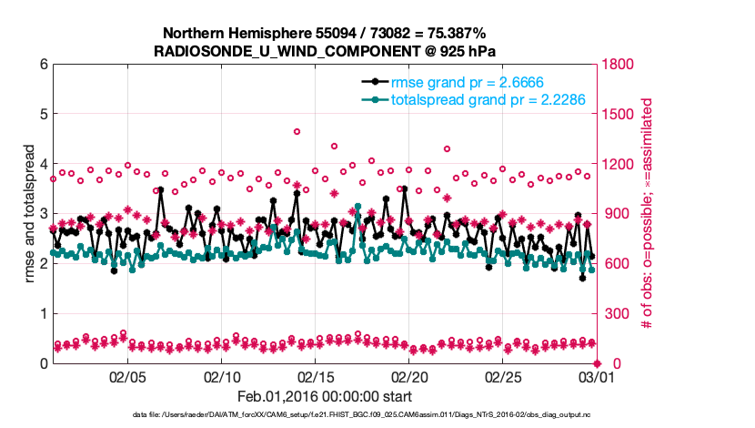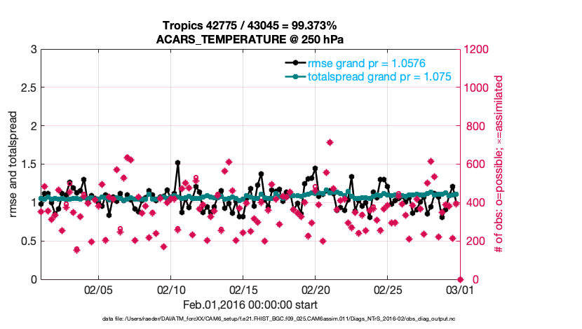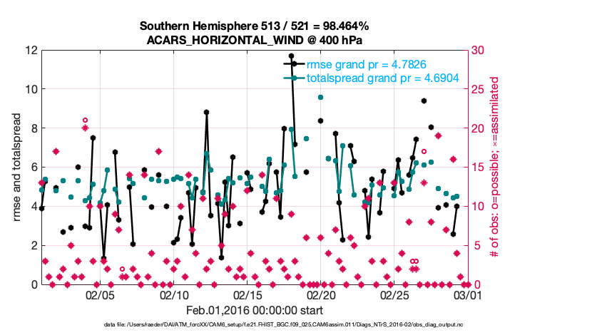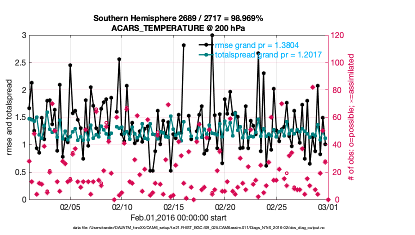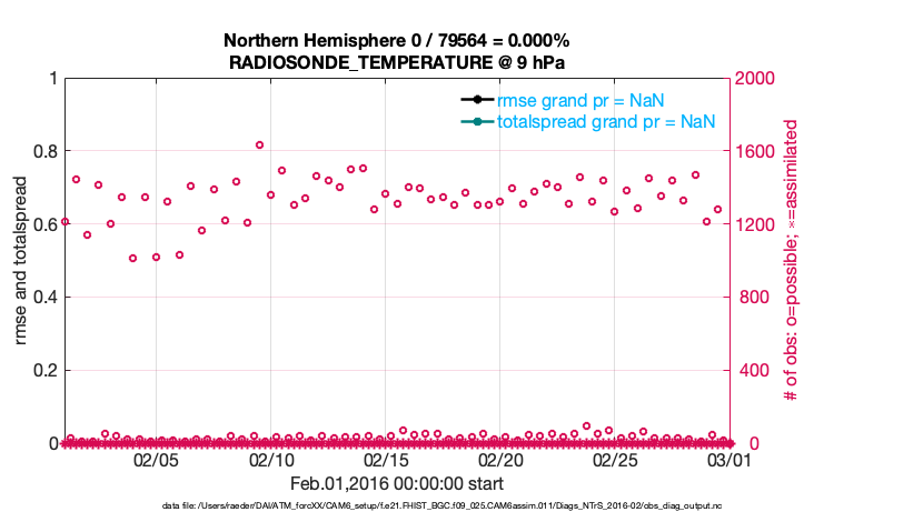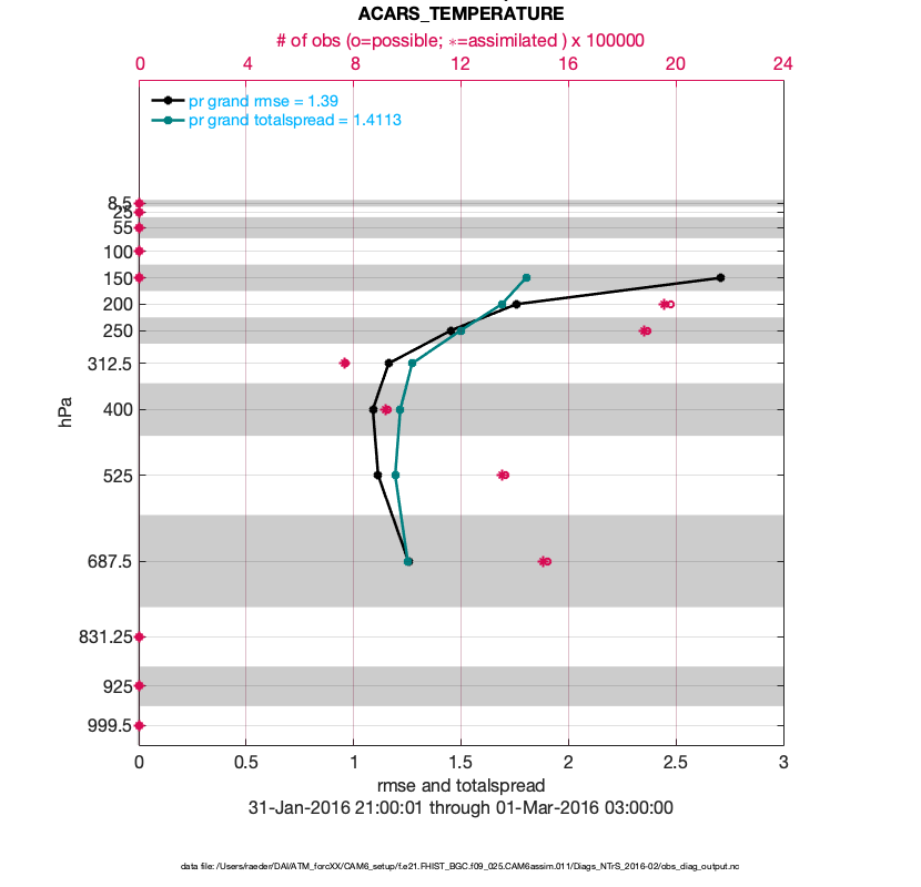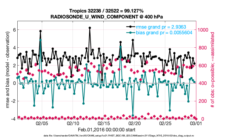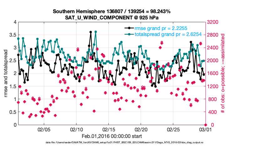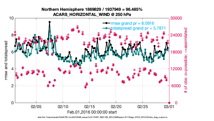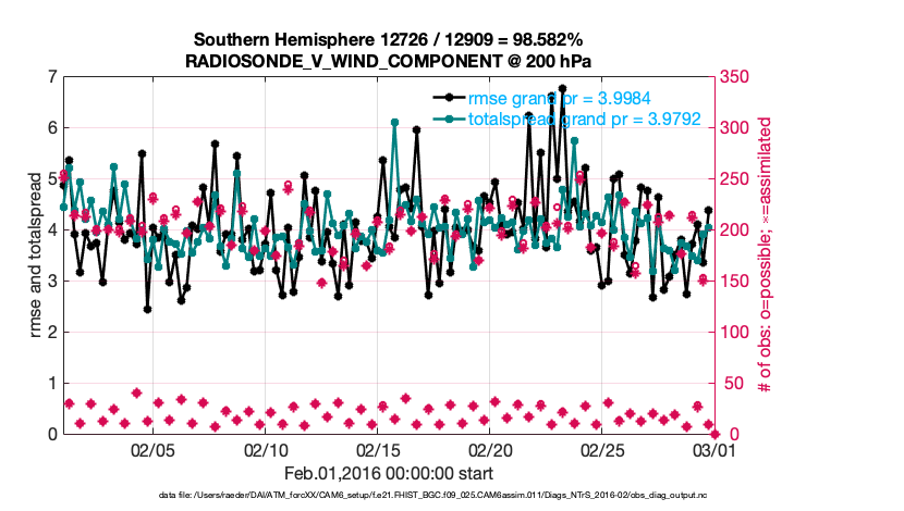 For each observation kind, the root-mean-squared-error (RMSE) is plotted together with: (i) BIAS and (ii) TOTALSPREAD. The number of available, assimilated (evaluated) and rejected observations are also shown on the plots.
