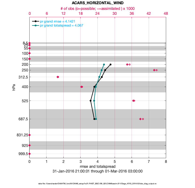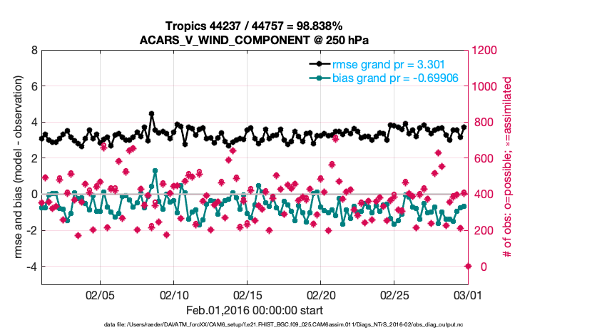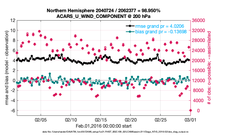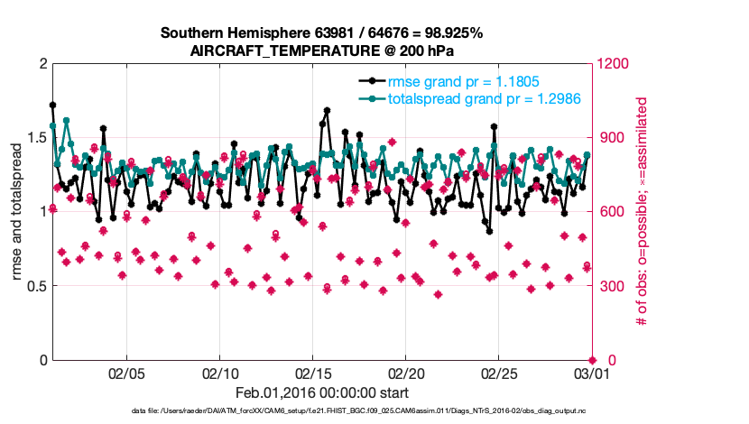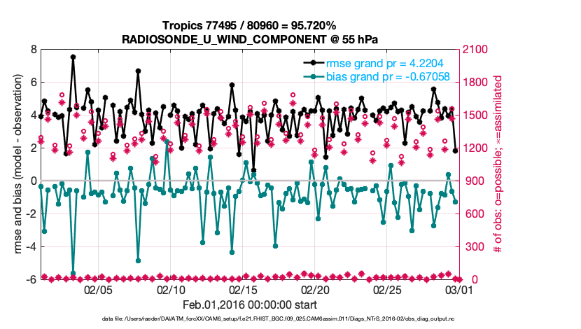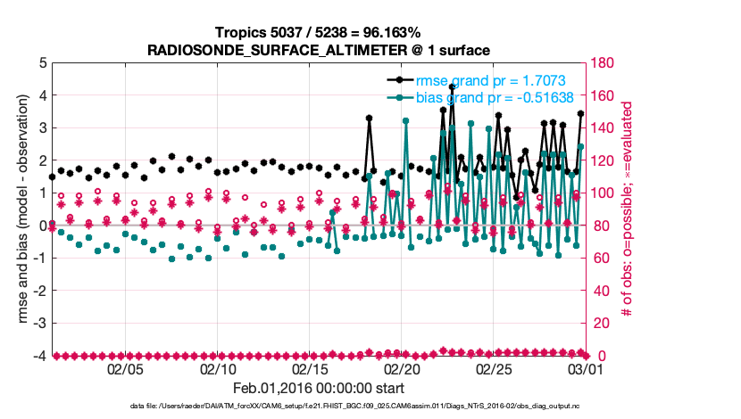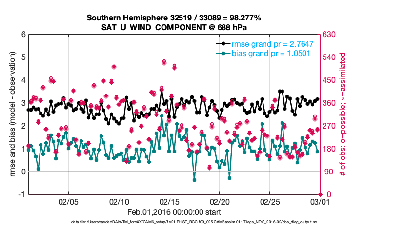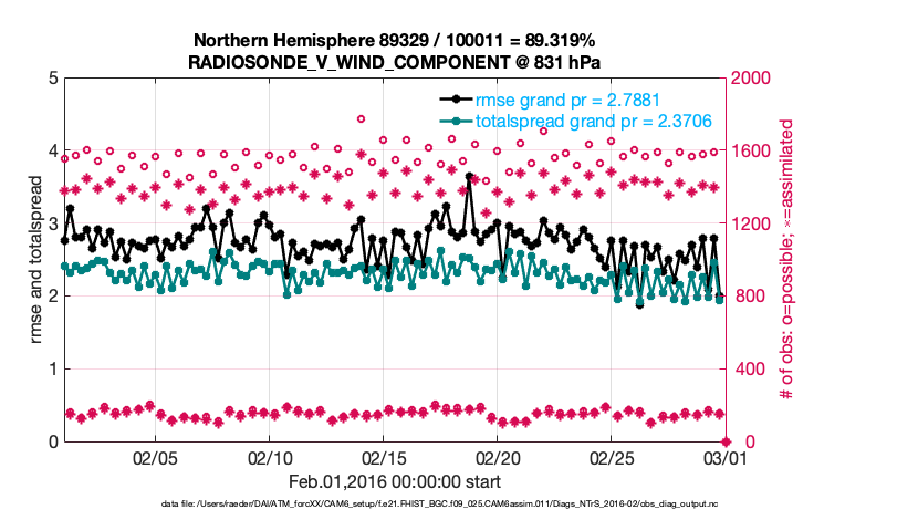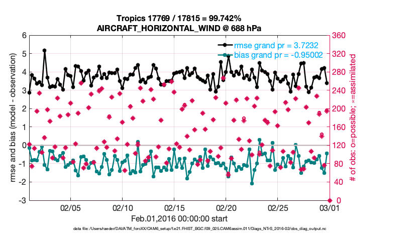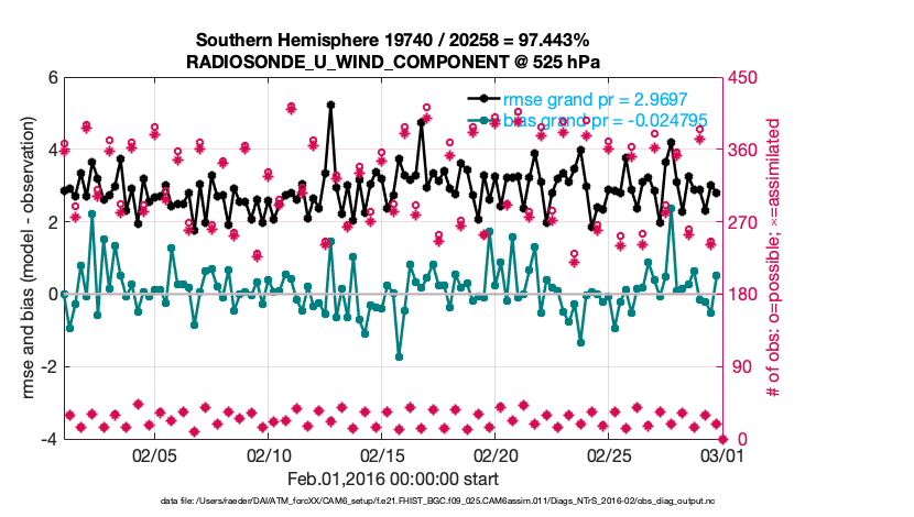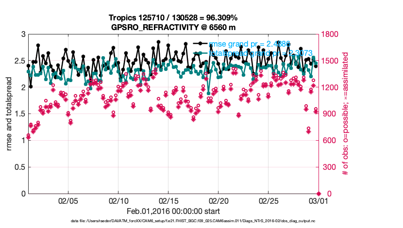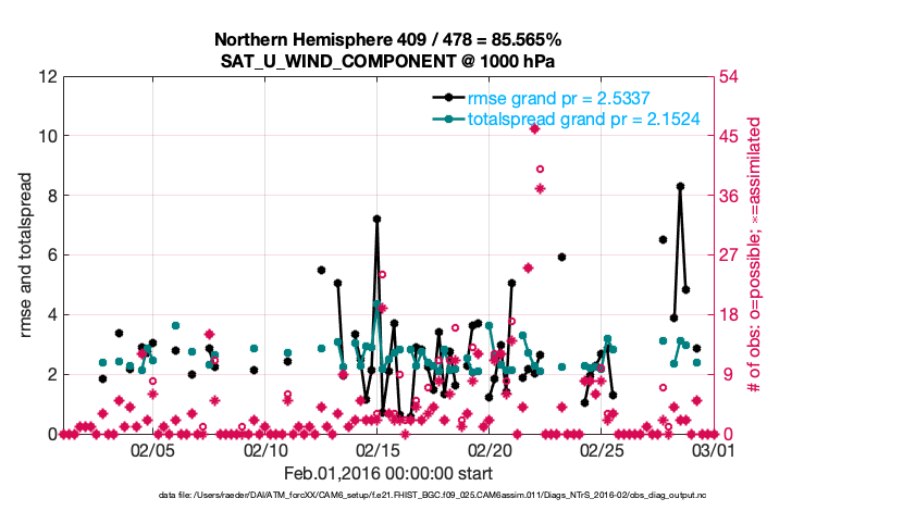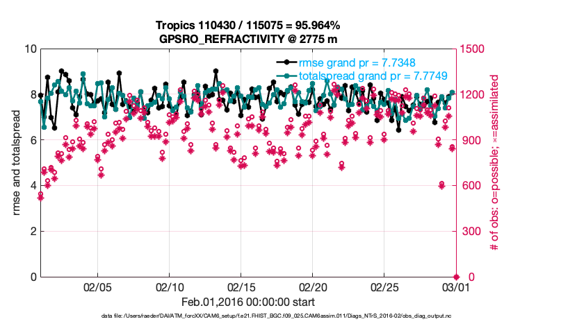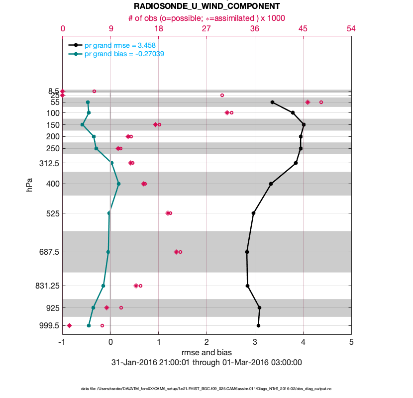 For each observation kind, the root-mean-squared-error (RMSE) is plotted together with: (i) BIAS and (ii) TOTALSPREAD. The number of available, assimilated (evaluated) and rejected observations are also shown on the plots.