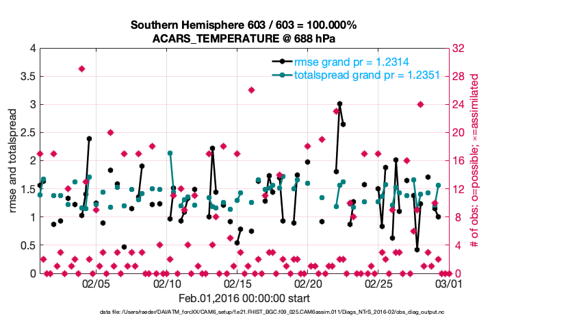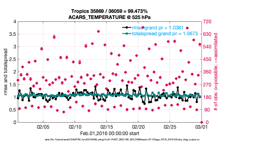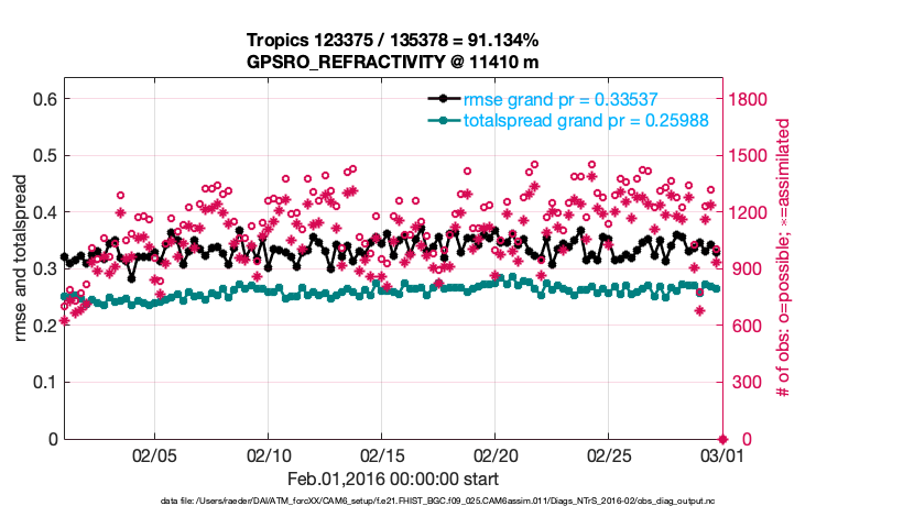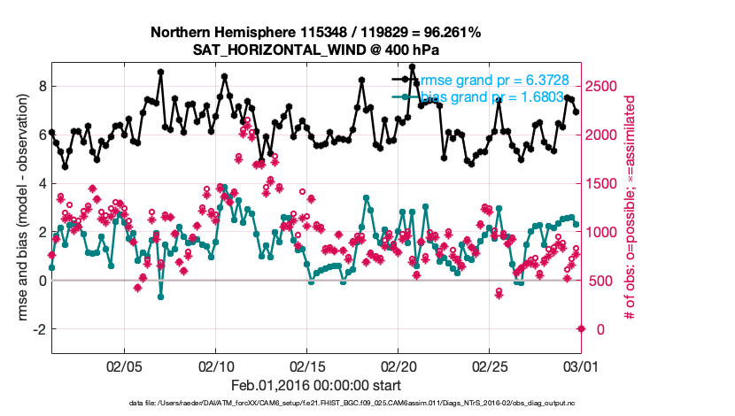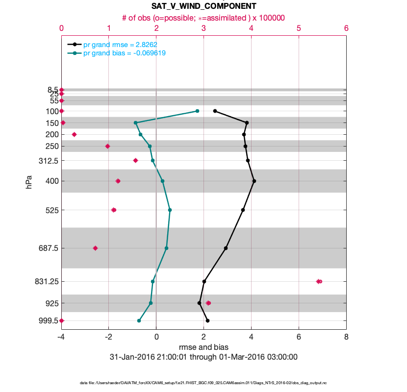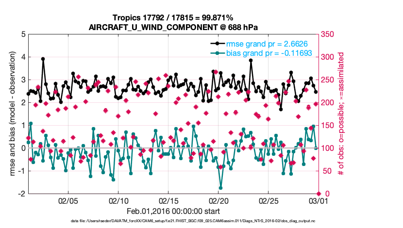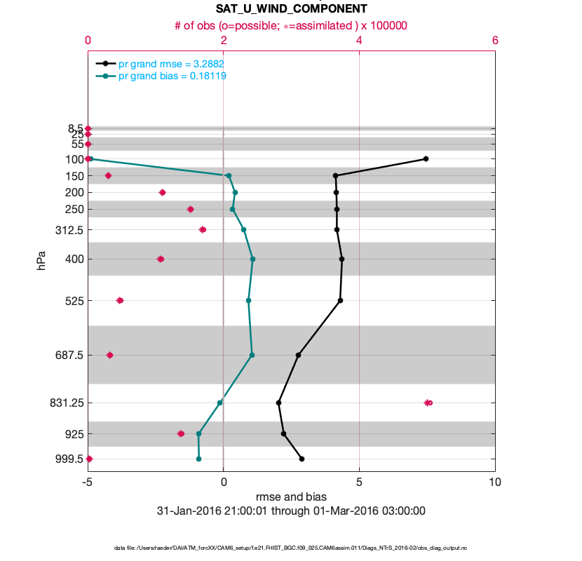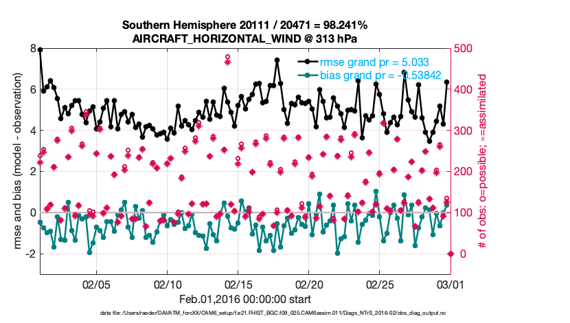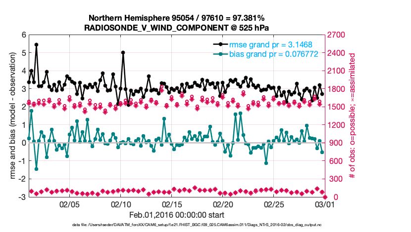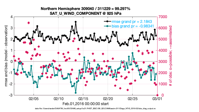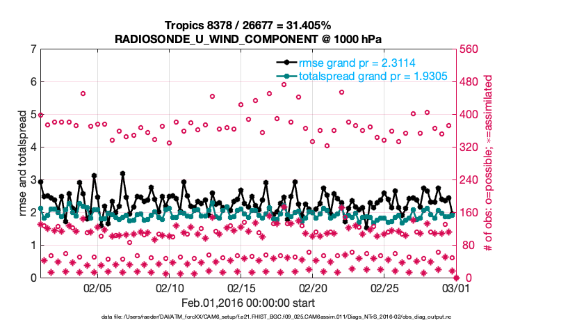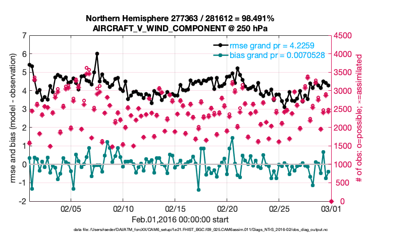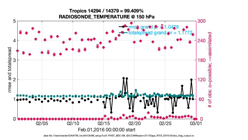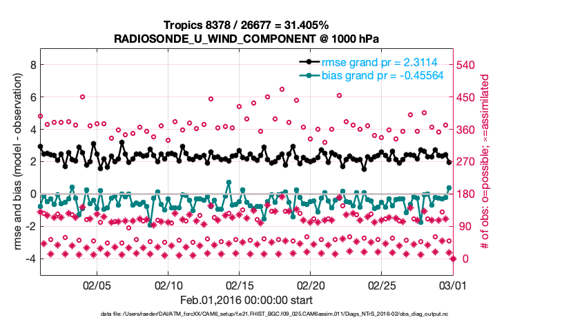 For each observation kind, the root-mean-squared-error (RMSE) is plotted together with: (i) BIAS and (ii) TOTALSPREAD. The number of available, assimilated (evaluated) and rejected observations are also shown on the plots.