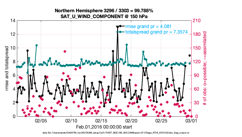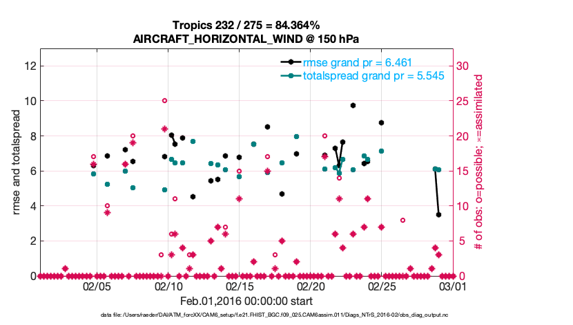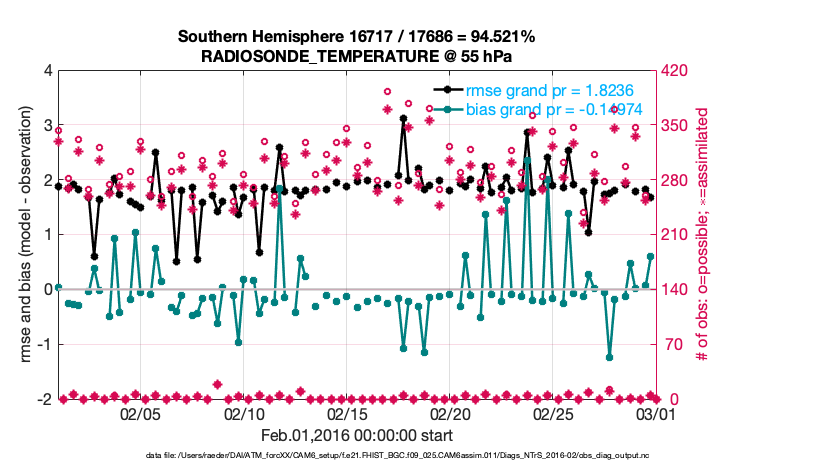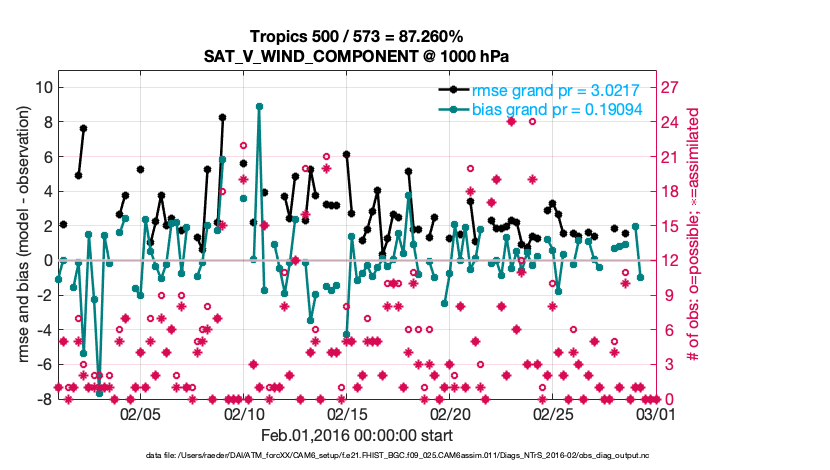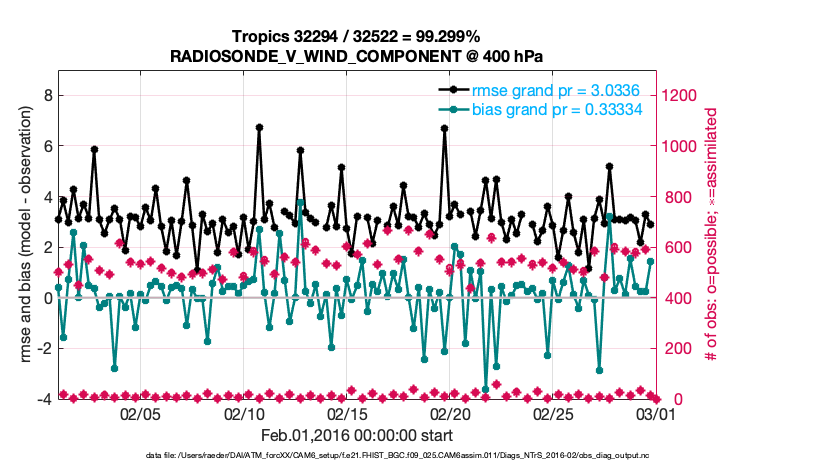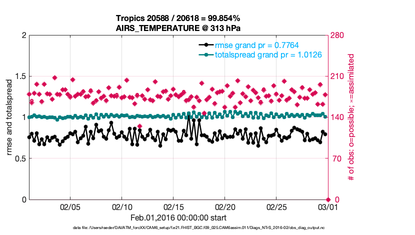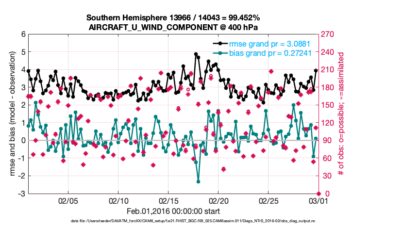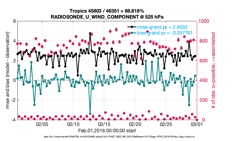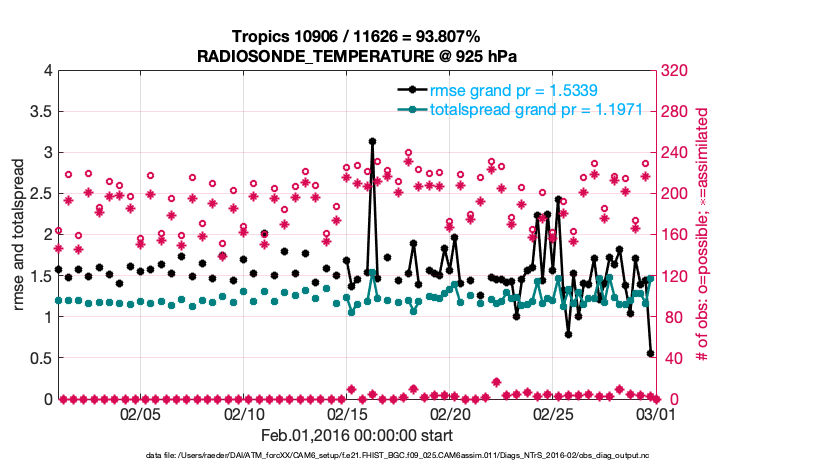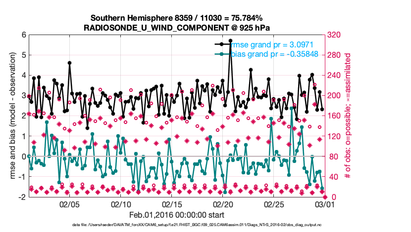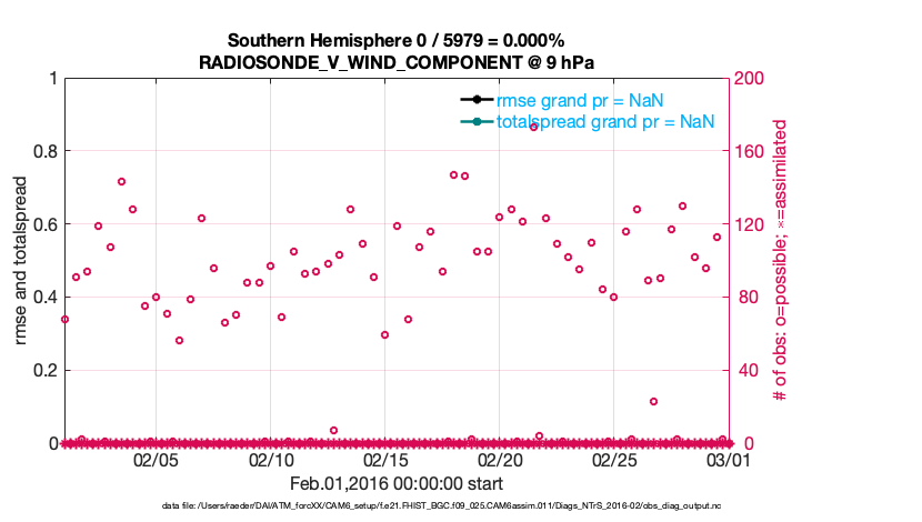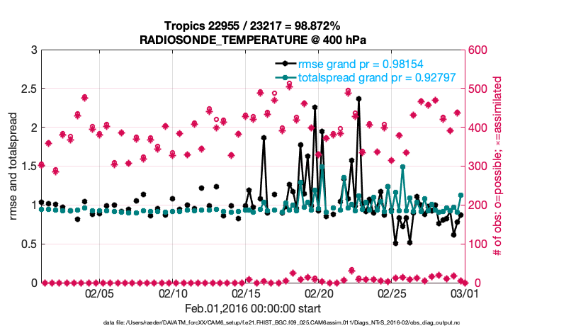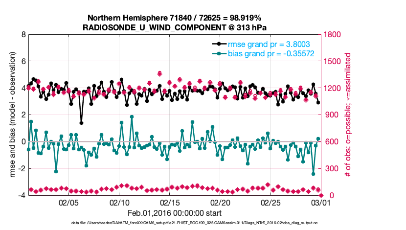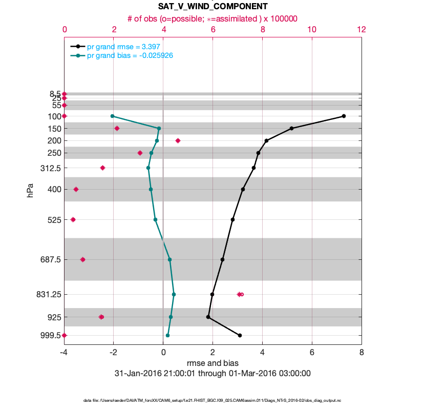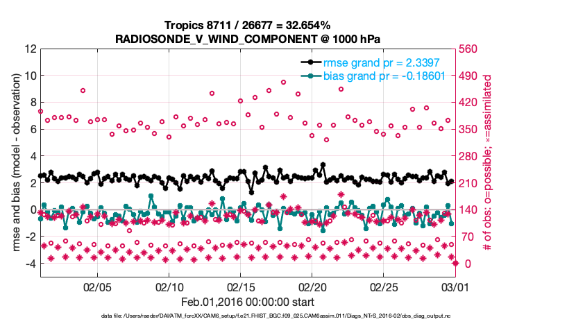 For each observation kind, the root-mean-squared-error (RMSE) is plotted together with: (i) BIAS and (ii) TOTALSPREAD. The number of available, assimilated (evaluated) and rejected observations are also shown on the plots.