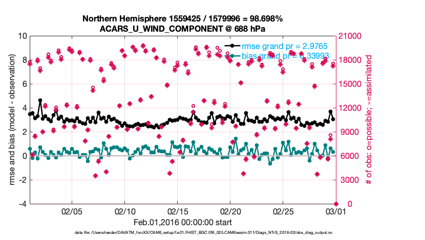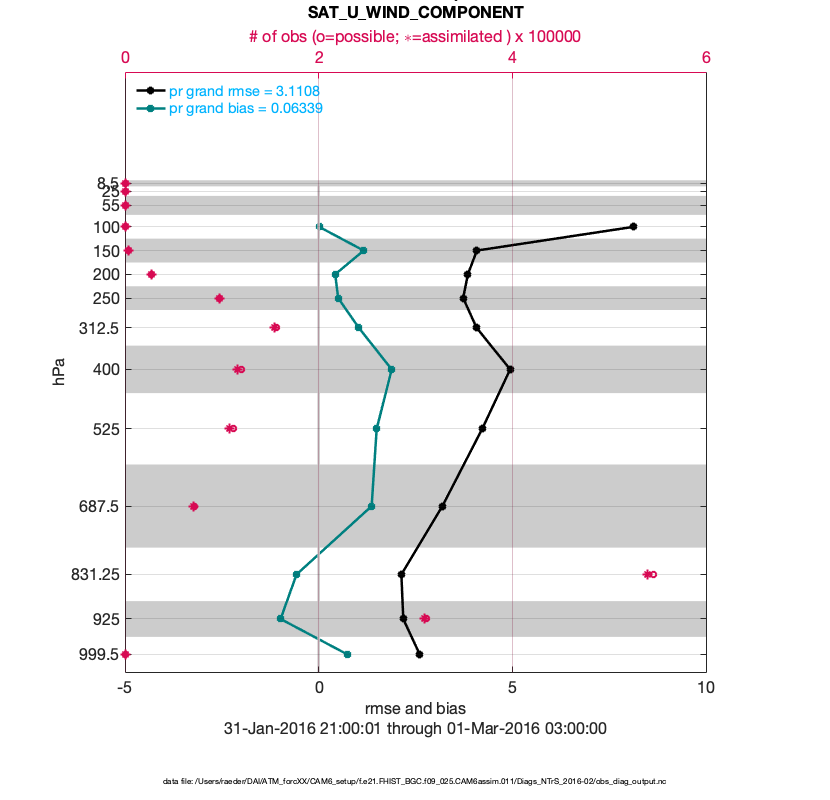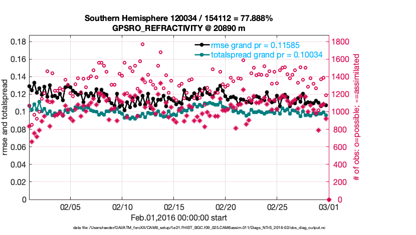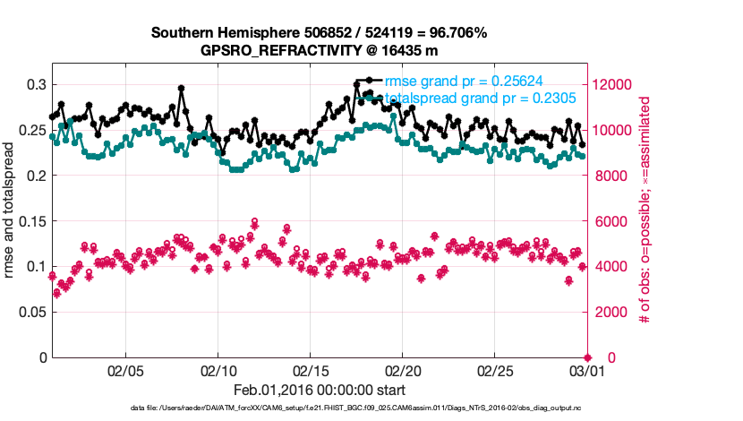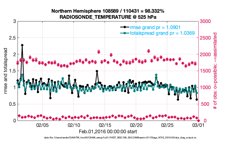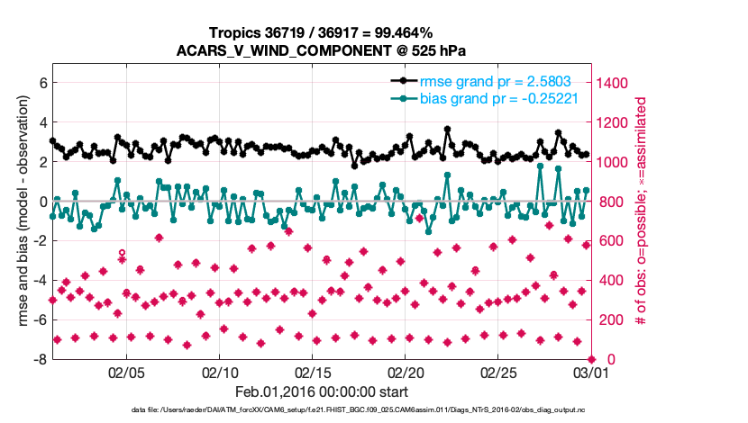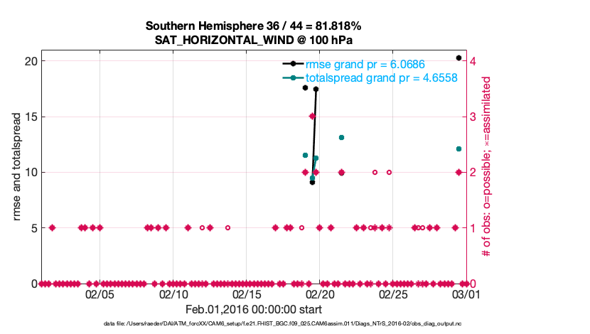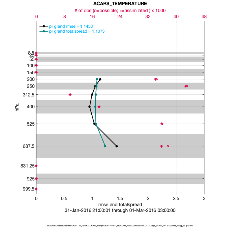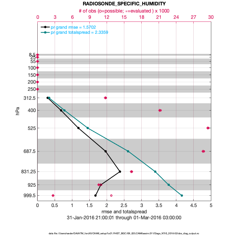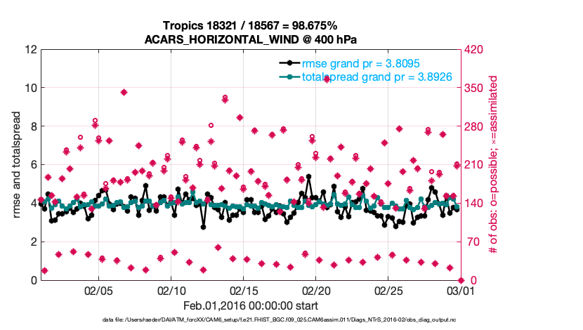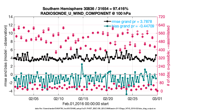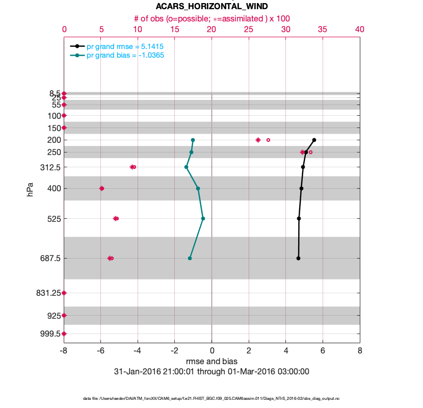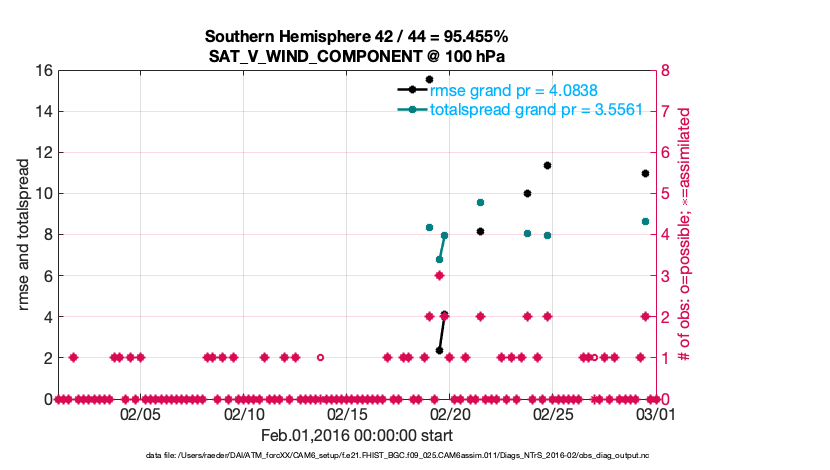 For each observation kind, the root-mean-squared-error (RMSE) is plotted together with: (i) BIAS and (ii) TOTALSPREAD. The number of available, assimilated (evaluated) and rejected observations are also shown on the plots.