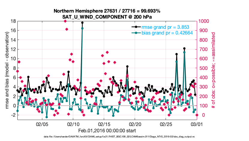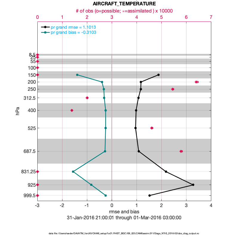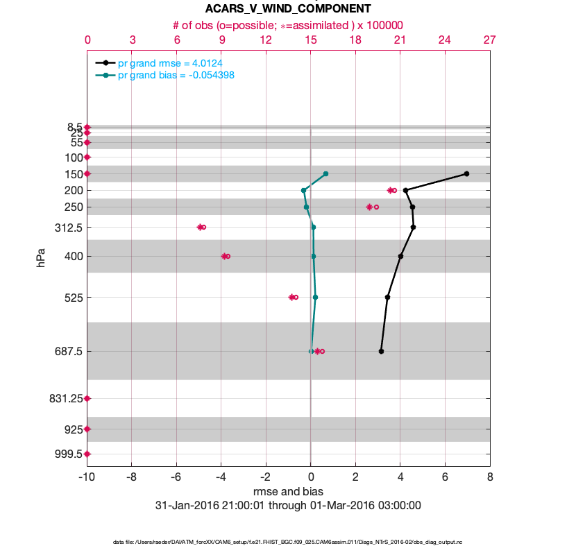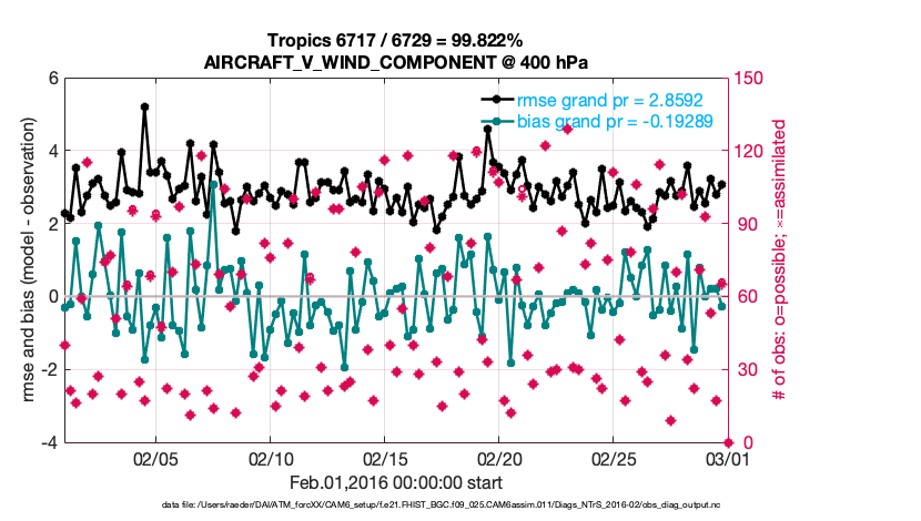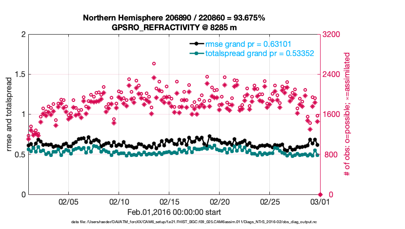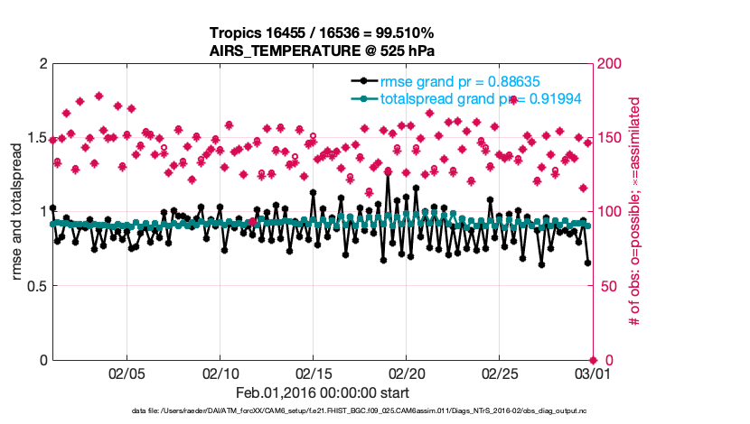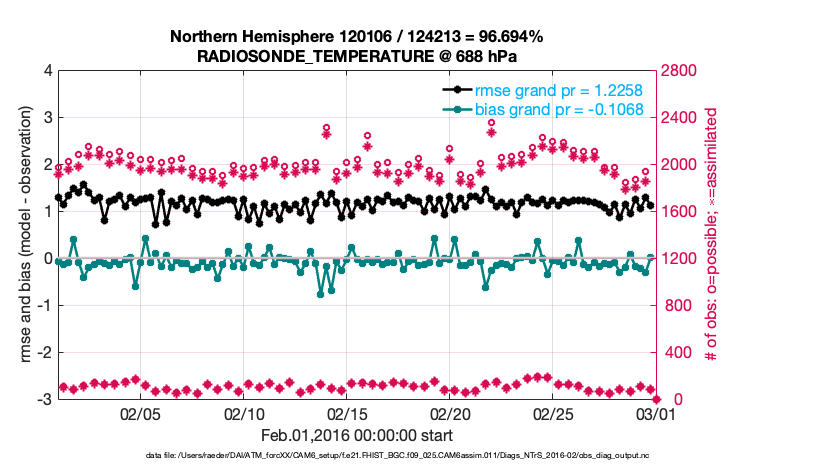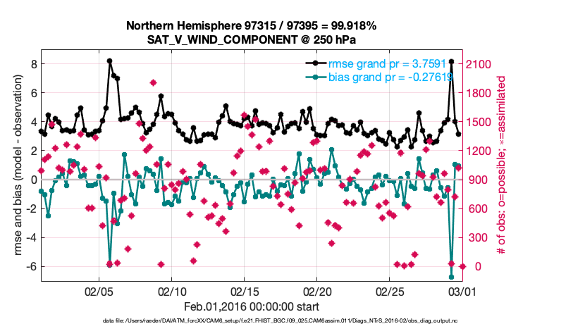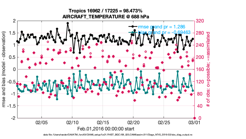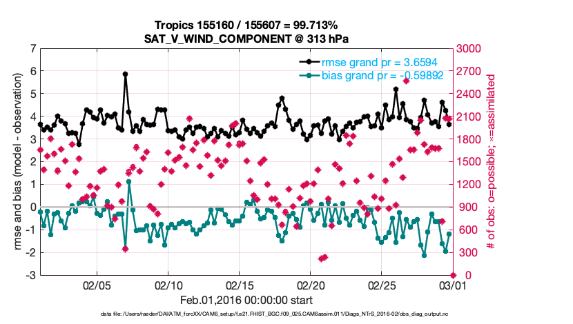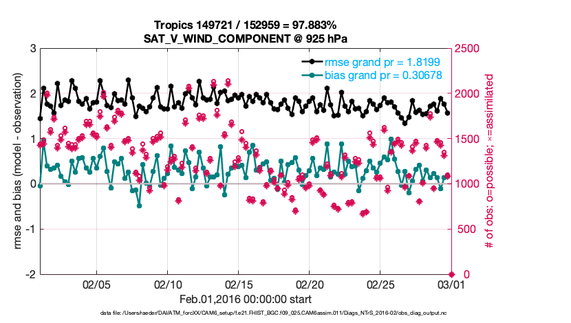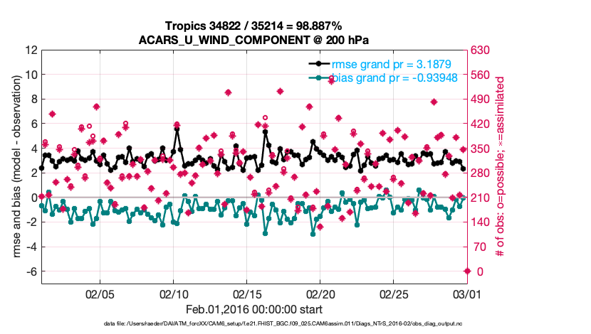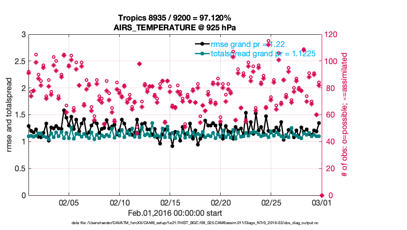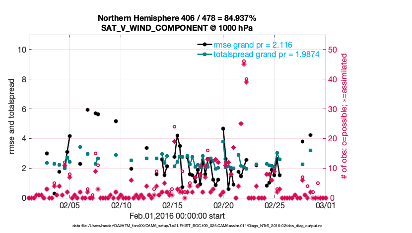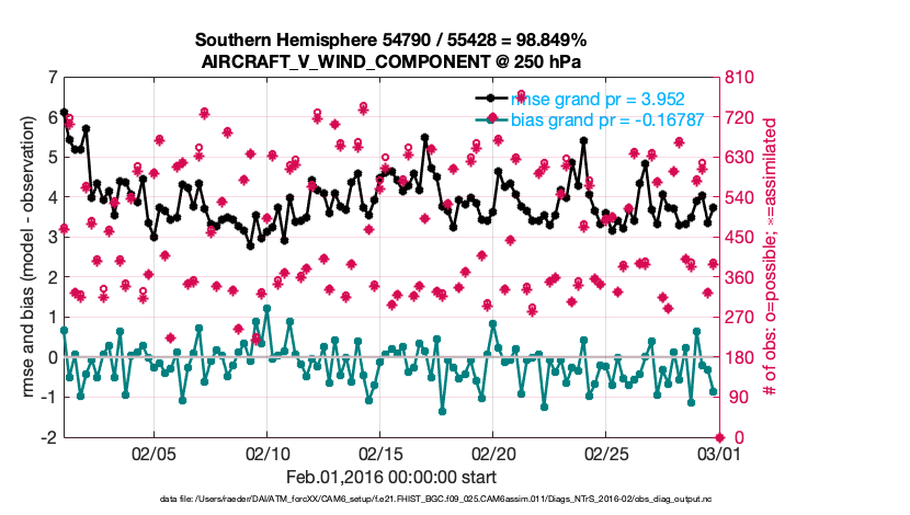 For each observation kind, the root-mean-squared-error (RMSE) is plotted together with: (i) BIAS and (ii) TOTALSPREAD. The number of available, assimilated (evaluated) and rejected observations are also shown on the plots.