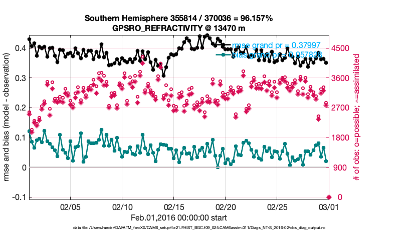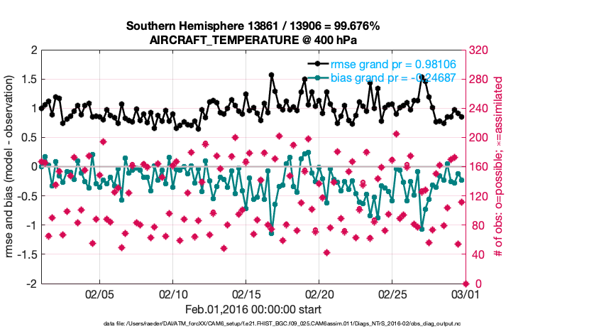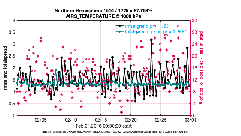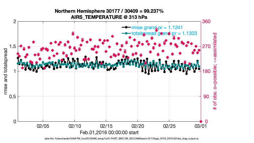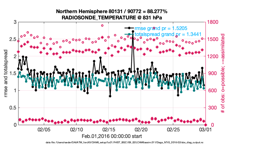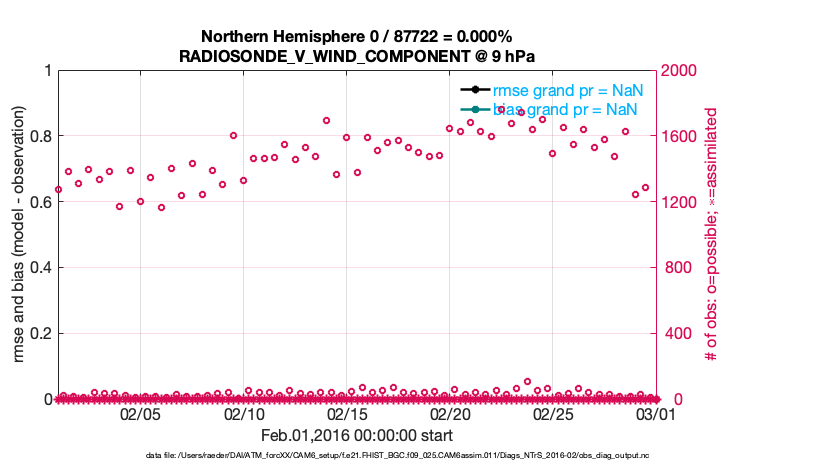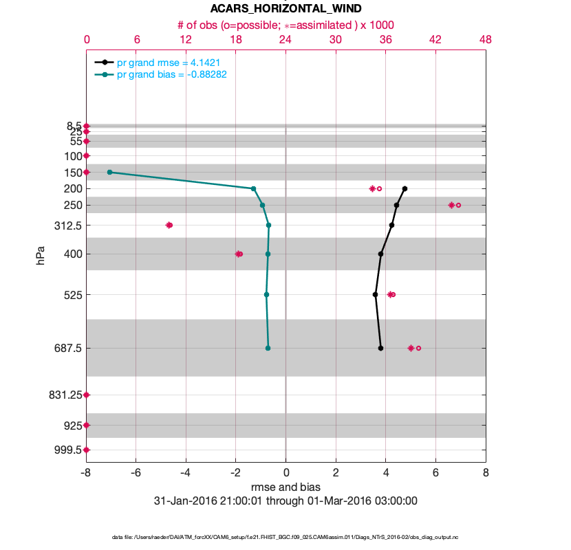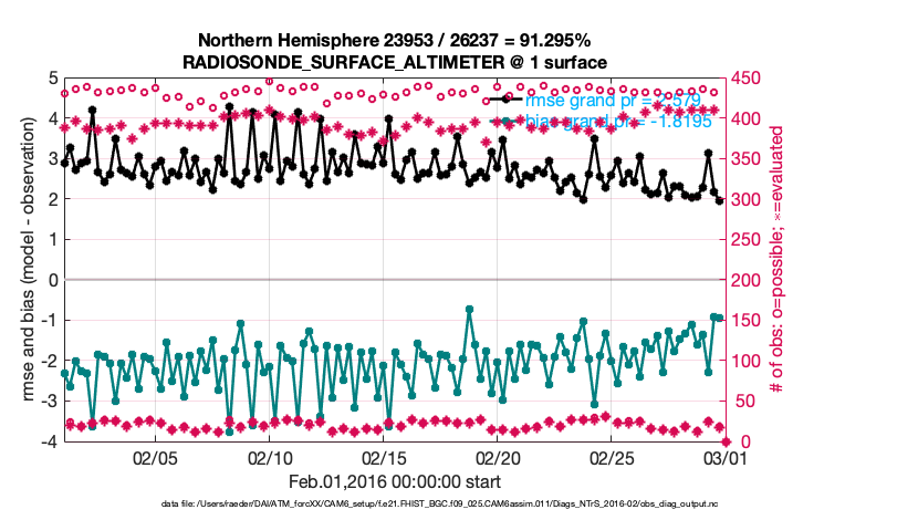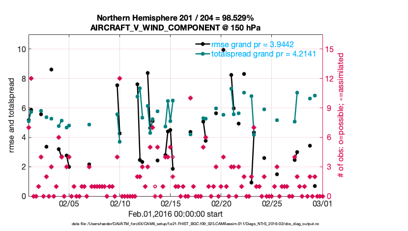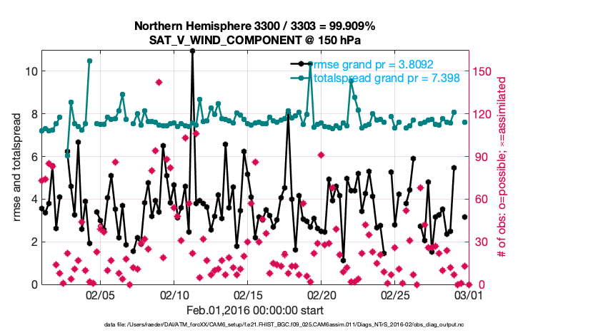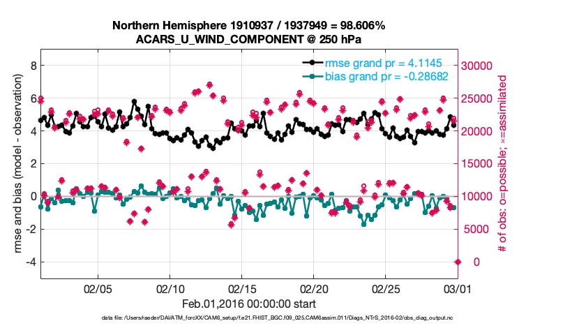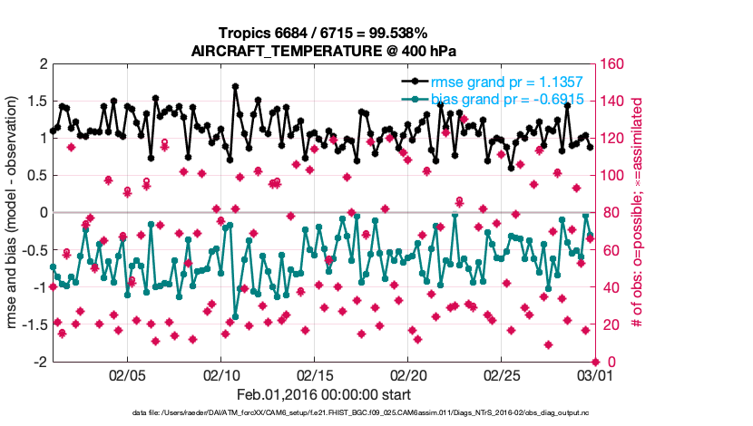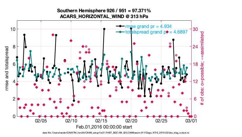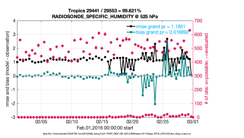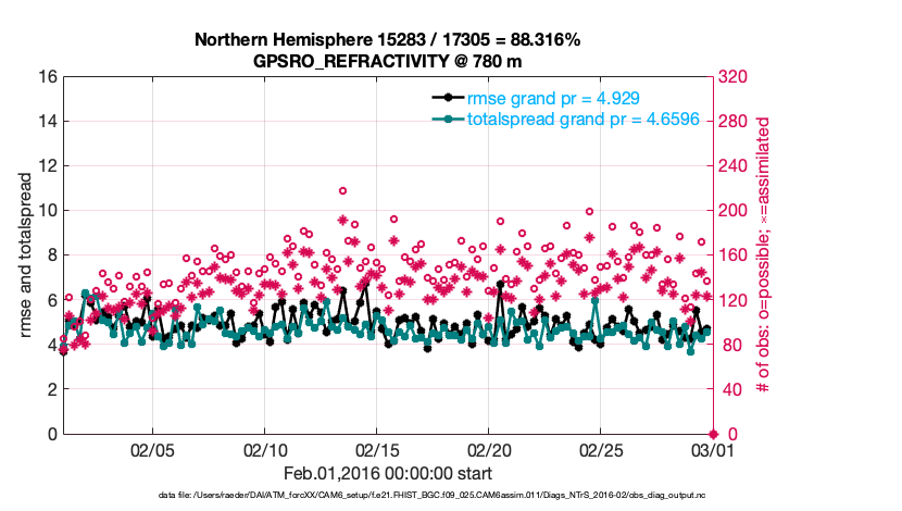 For each observation kind, the root-mean-squared-error (RMSE) is plotted together with: (i) BIAS and (ii) TOTALSPREAD. The number of available, assimilated (evaluated) and rejected observations are also shown on the plots.