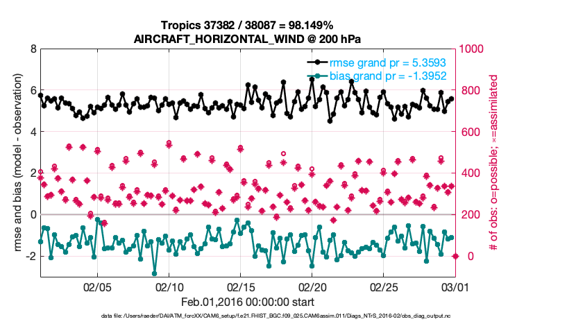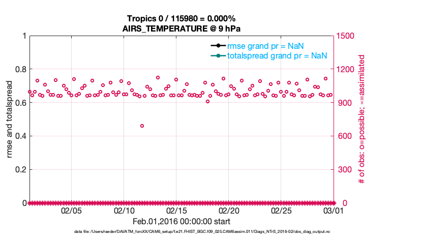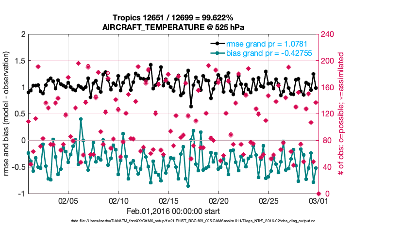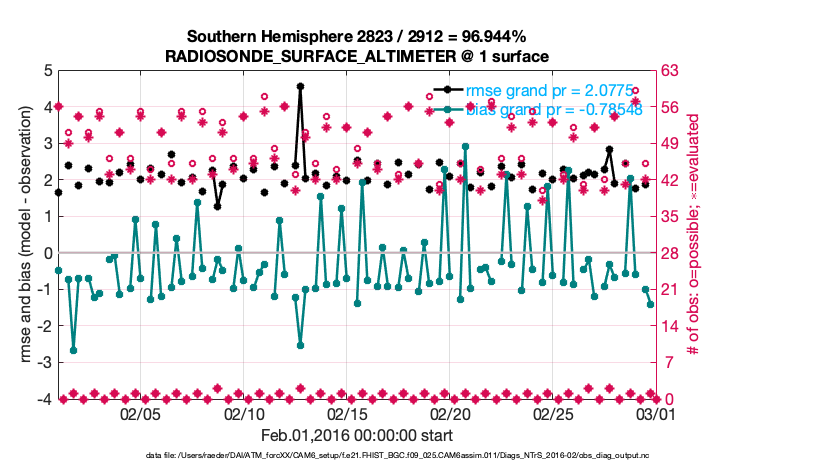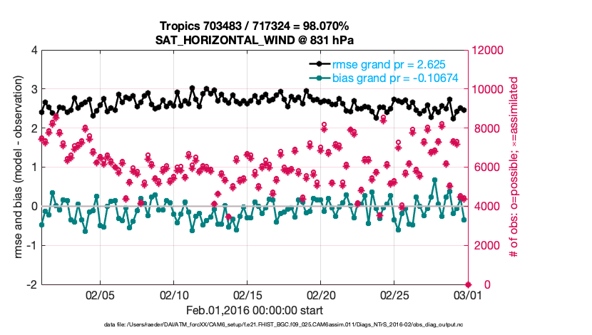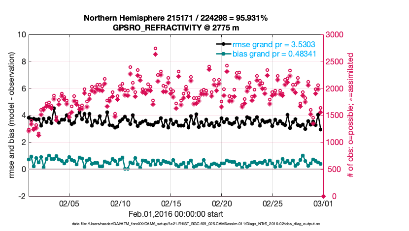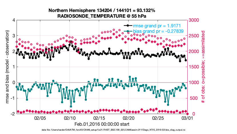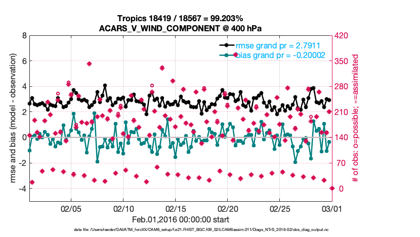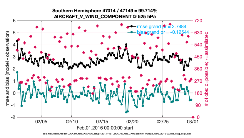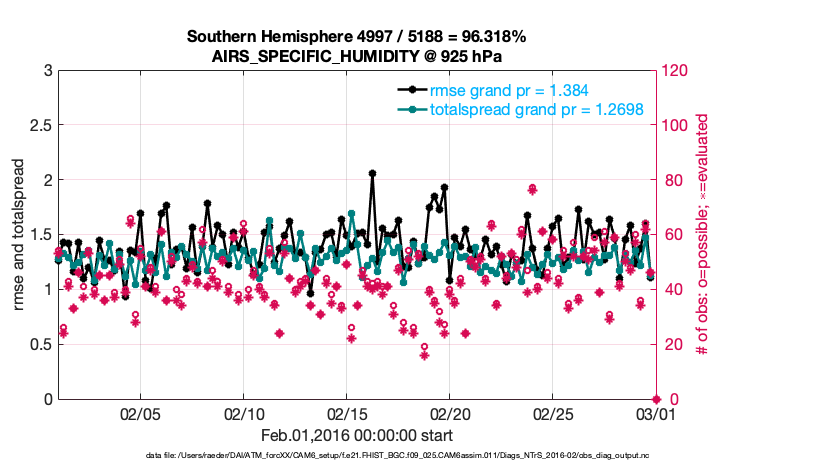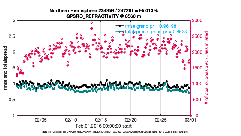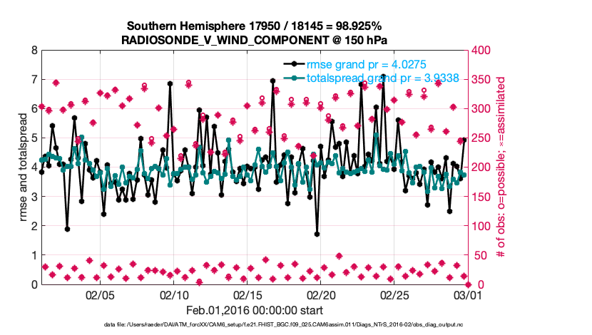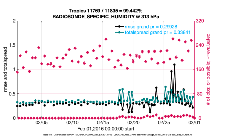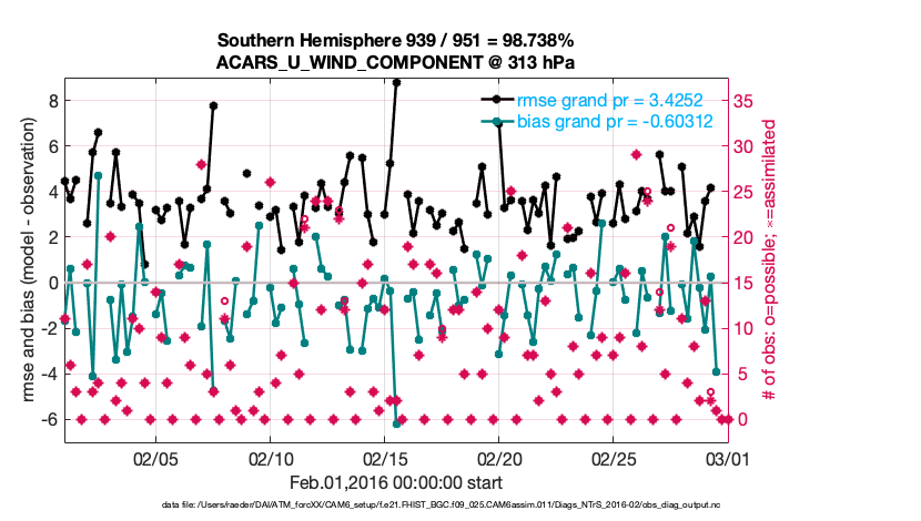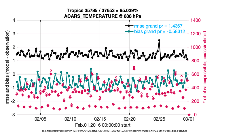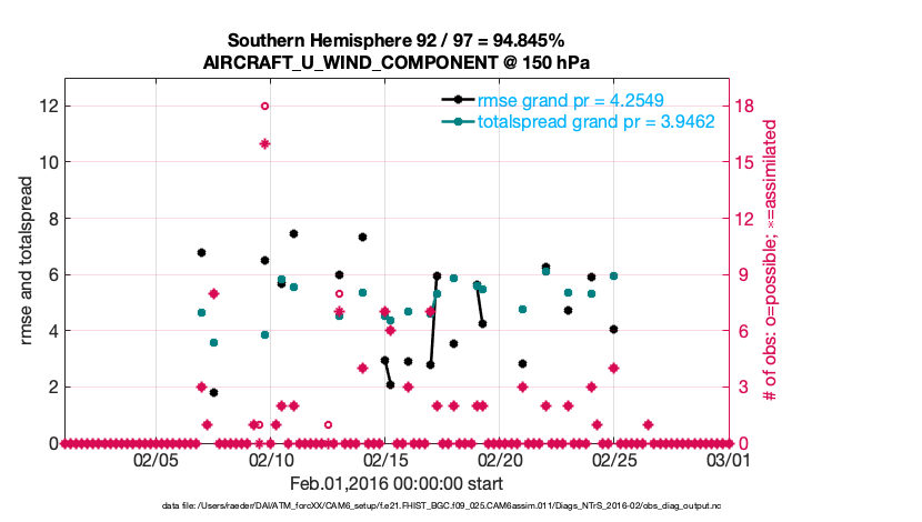 For each observation kind, the root-mean-squared-error (RMSE) is plotted together with: (i) BIAS and (ii) TOTALSPREAD. The number of available, assimilated (evaluated) and rejected observations are also shown on the plots.