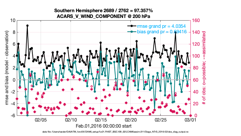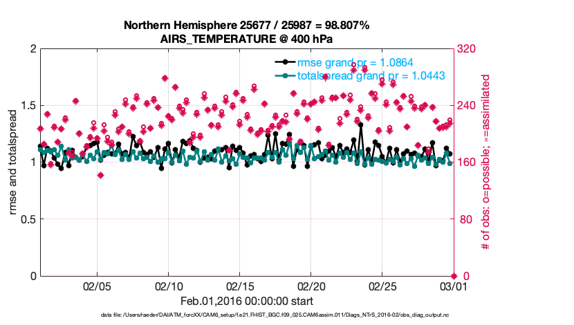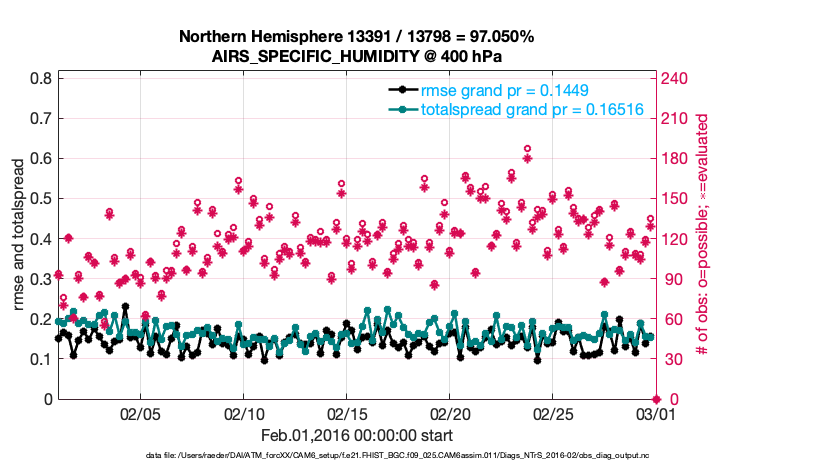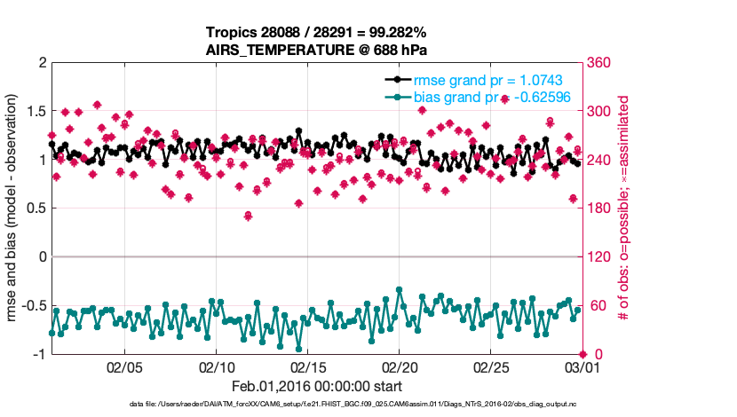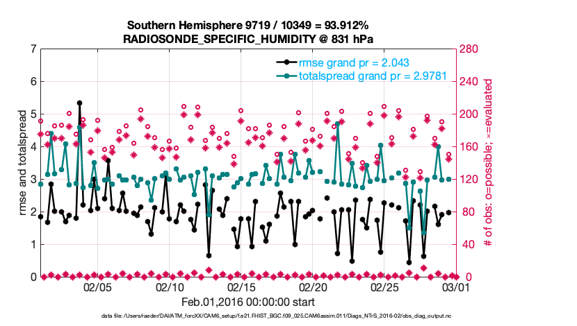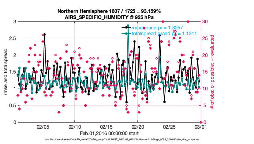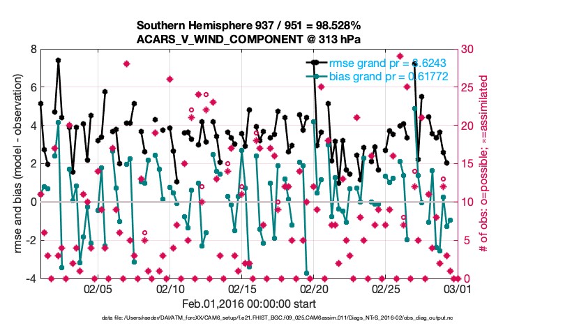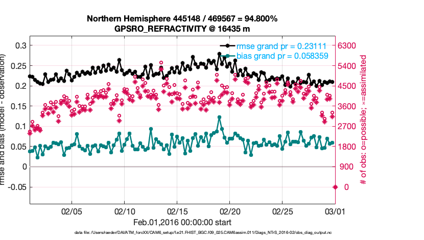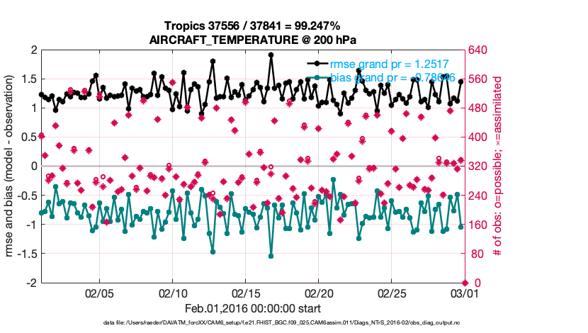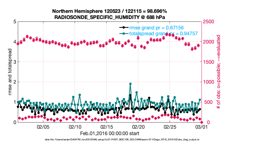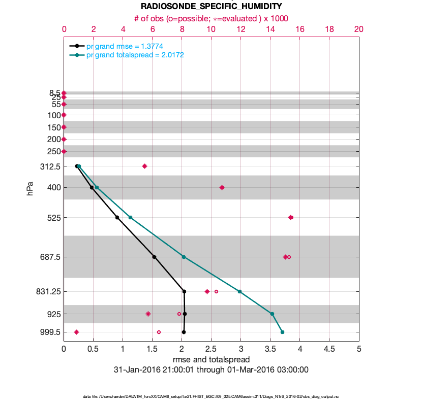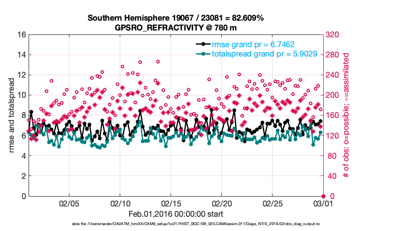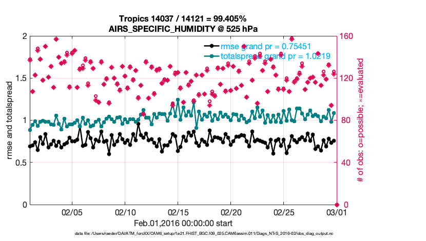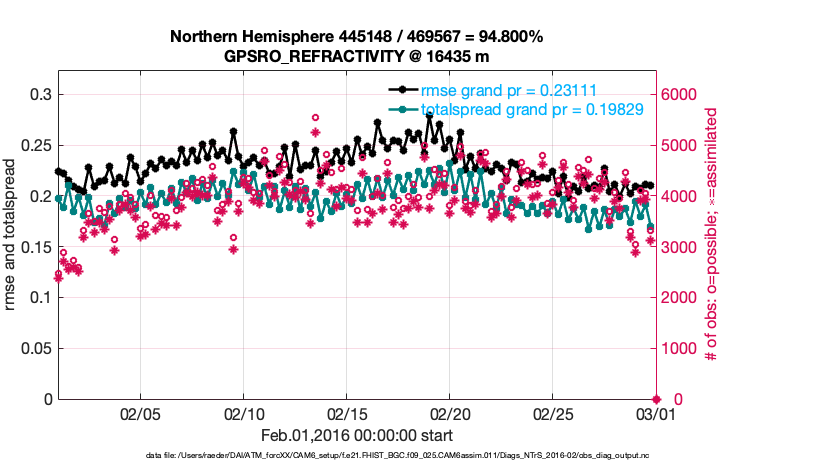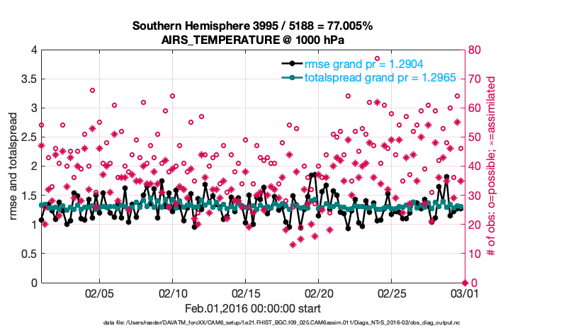 For each observation kind, the root-mean-squared-error (RMSE) is plotted together with: (i) BIAS and (ii) TOTALSPREAD. The number of available, assimilated (evaluated) and rejected observations are also shown on the plots.