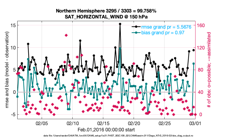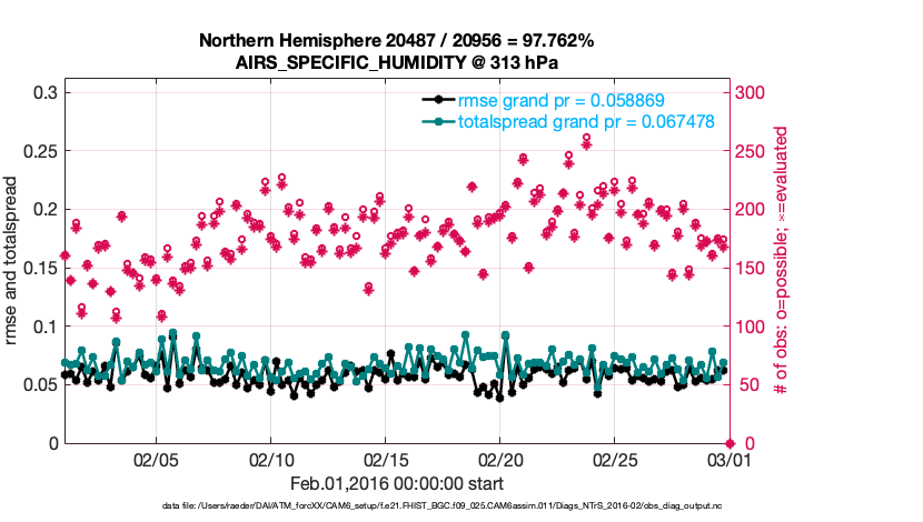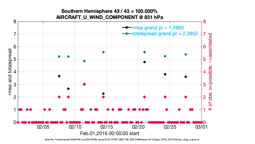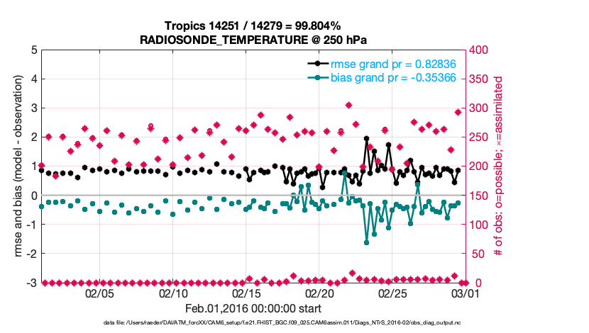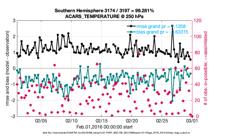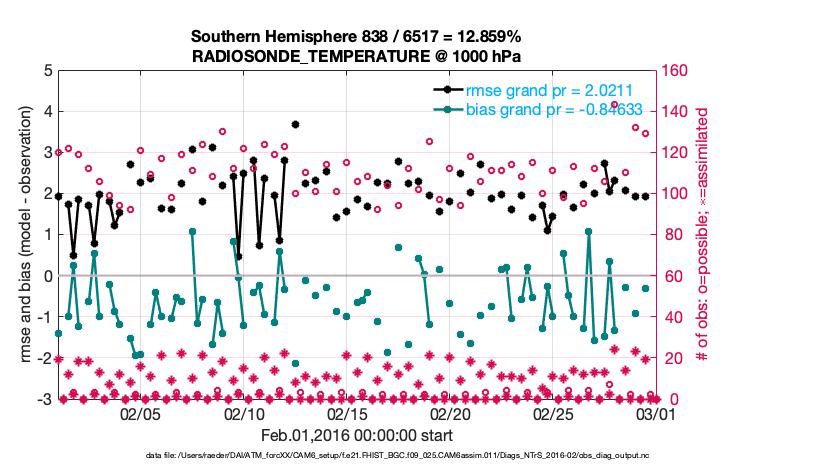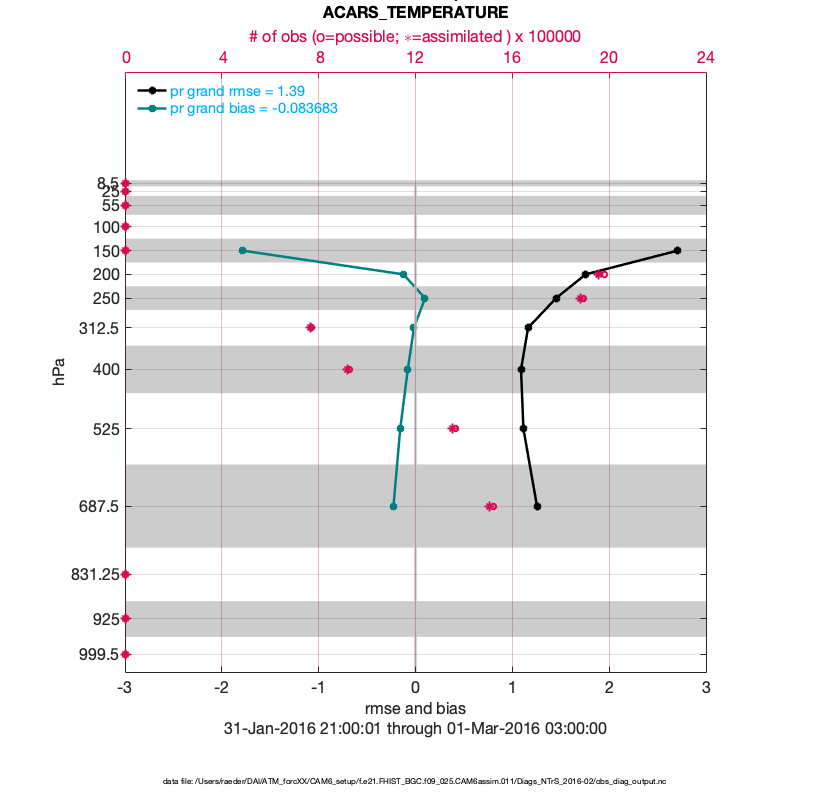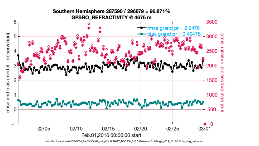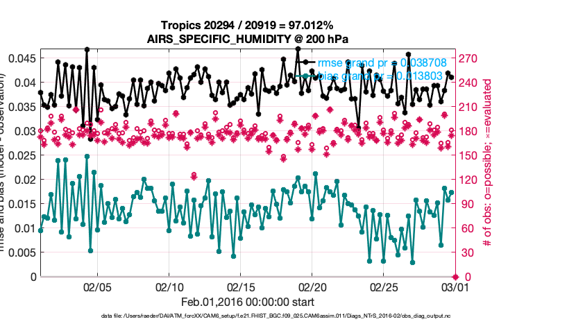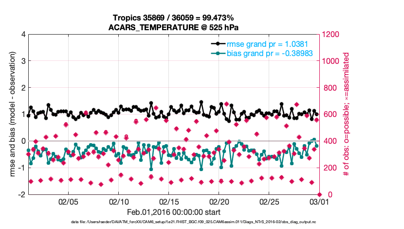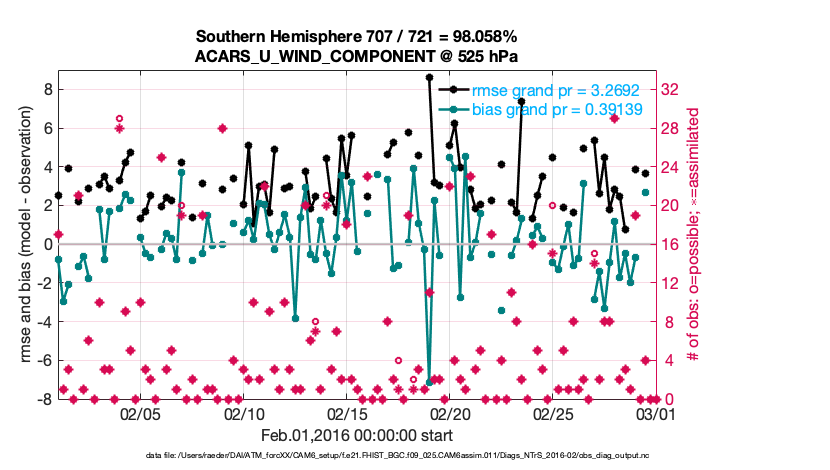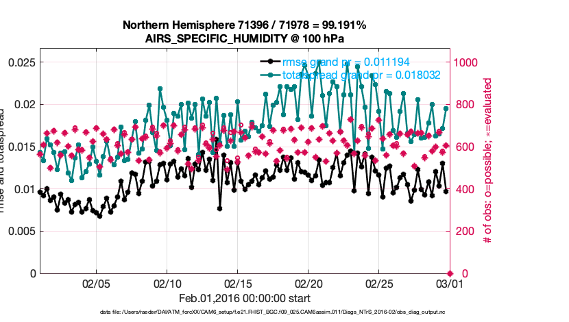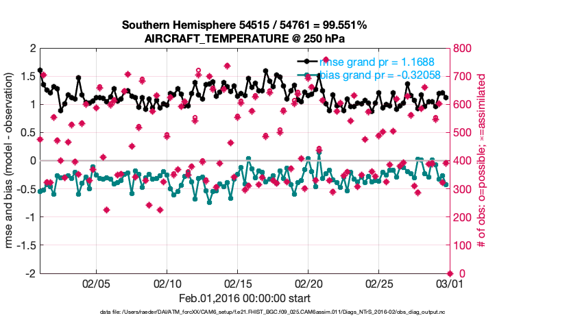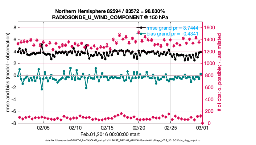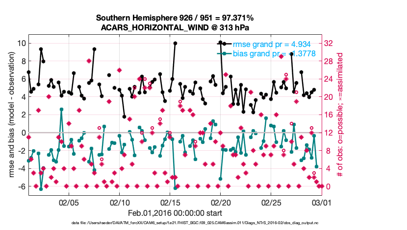 For each observation kind, the root-mean-squared-error (RMSE) is plotted together with: (i) BIAS and (ii) TOTALSPREAD. The number of available, assimilated (evaluated) and rejected observations are also shown on the plots.