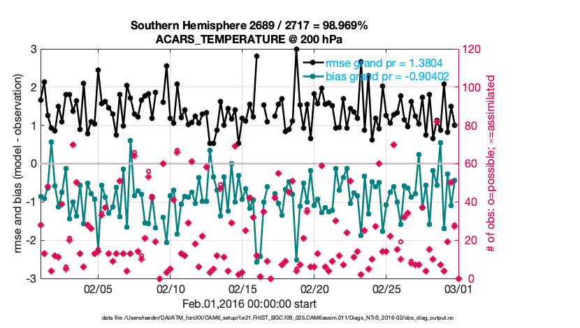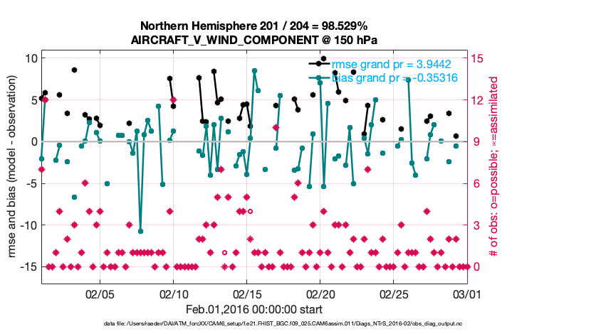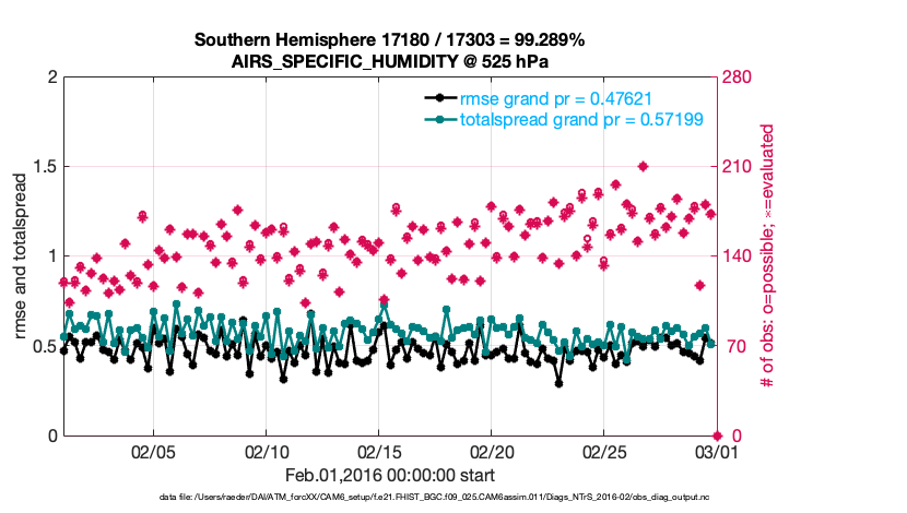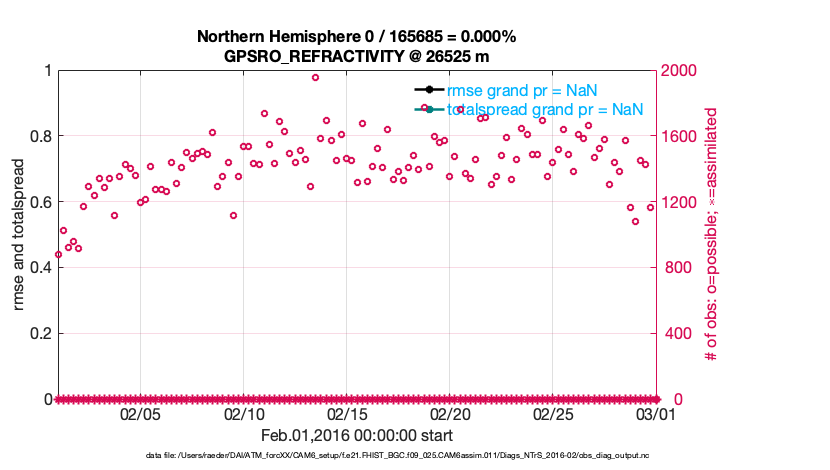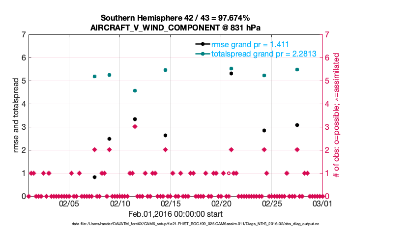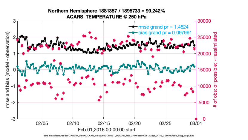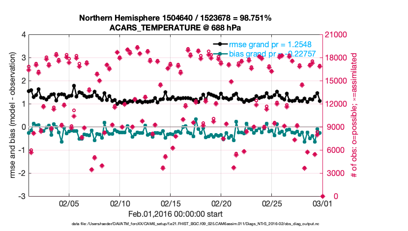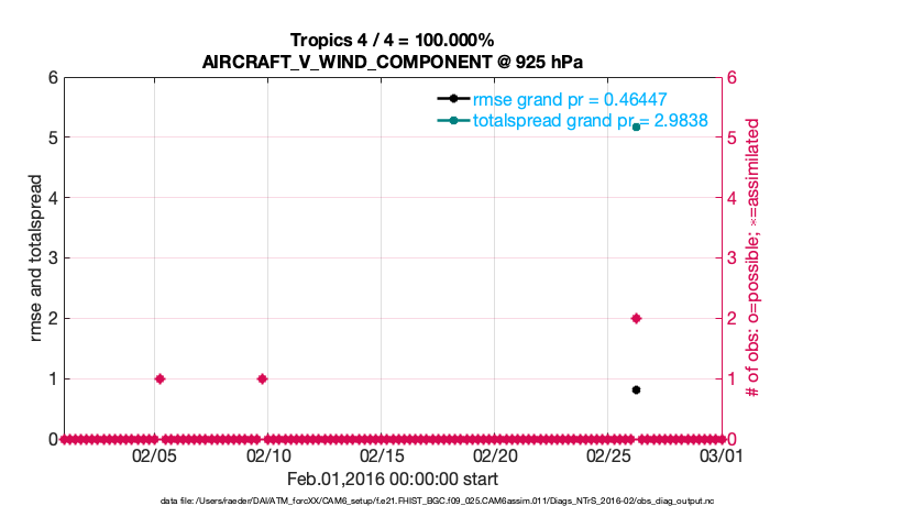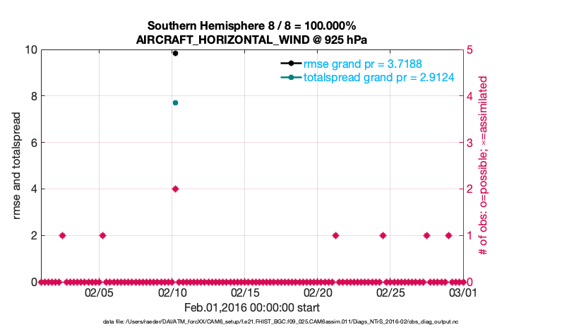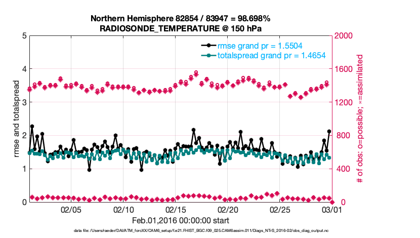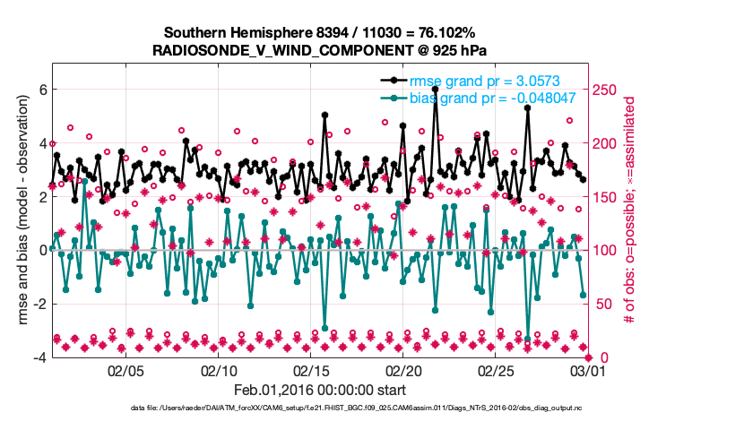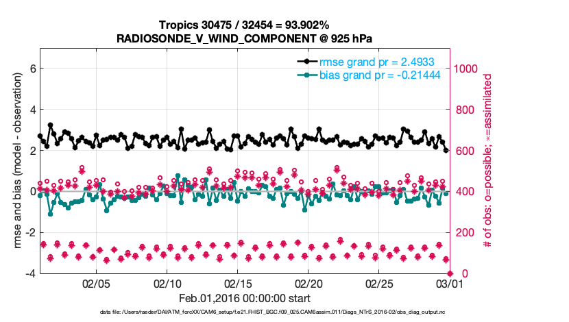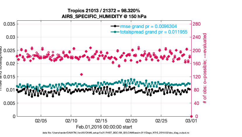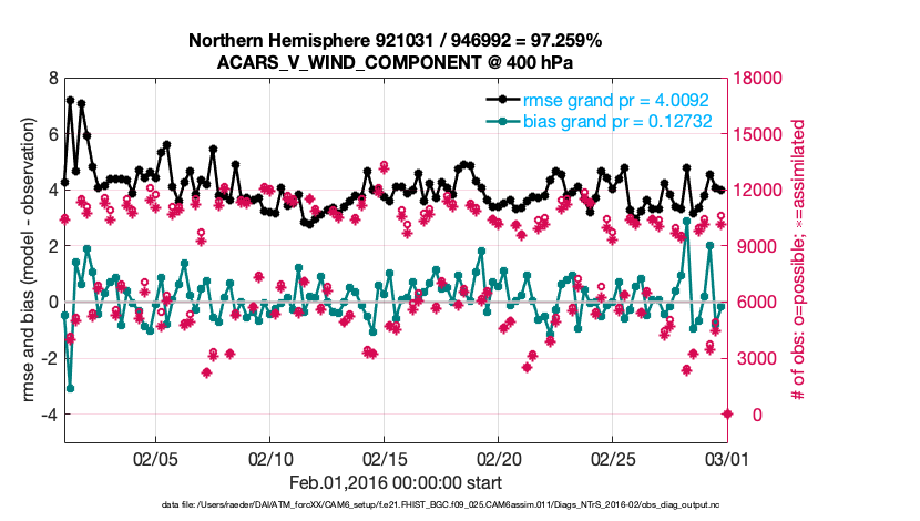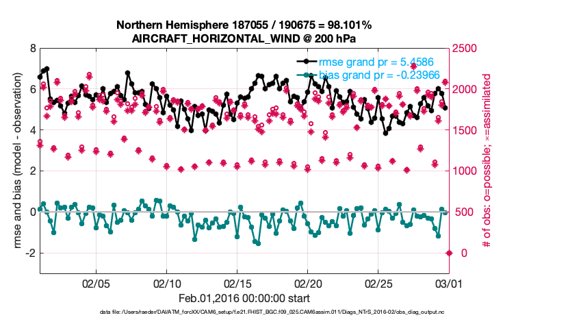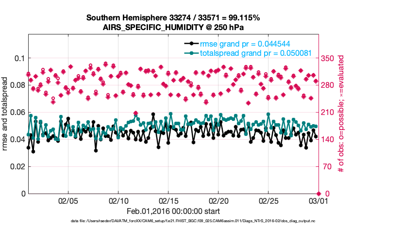For each observation kind, the root-mean-squared-error (RMSE) is plotted together with: (i) BIAS and (ii) TOTALSPREAD. The number of available, assimilated (evaluated) and rejected observations are also shown on the plots.