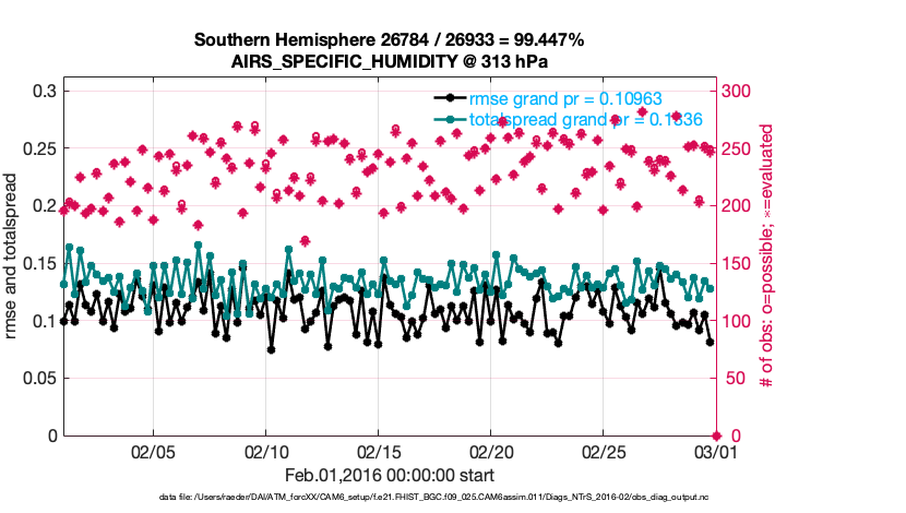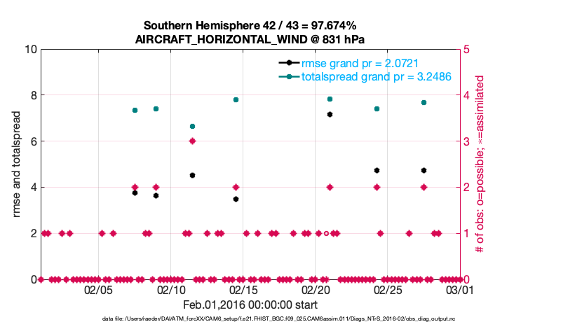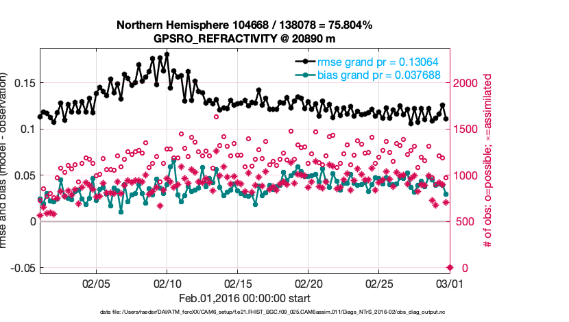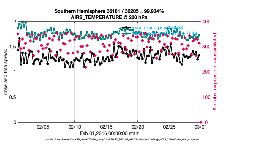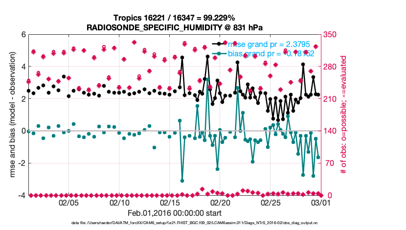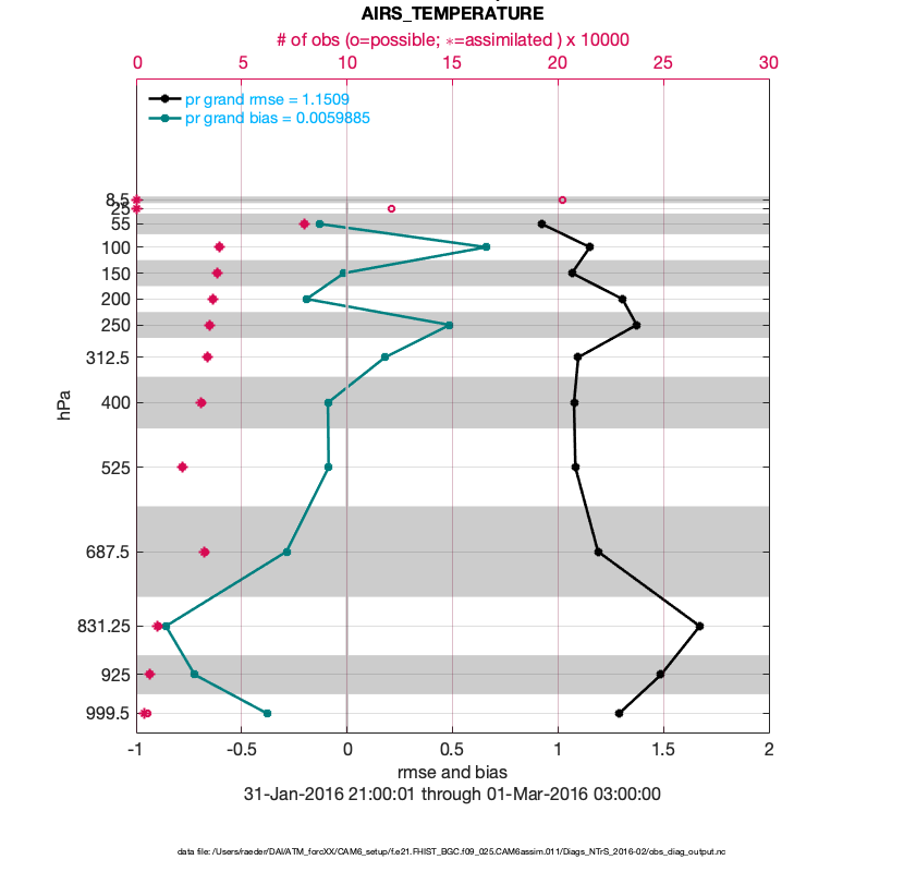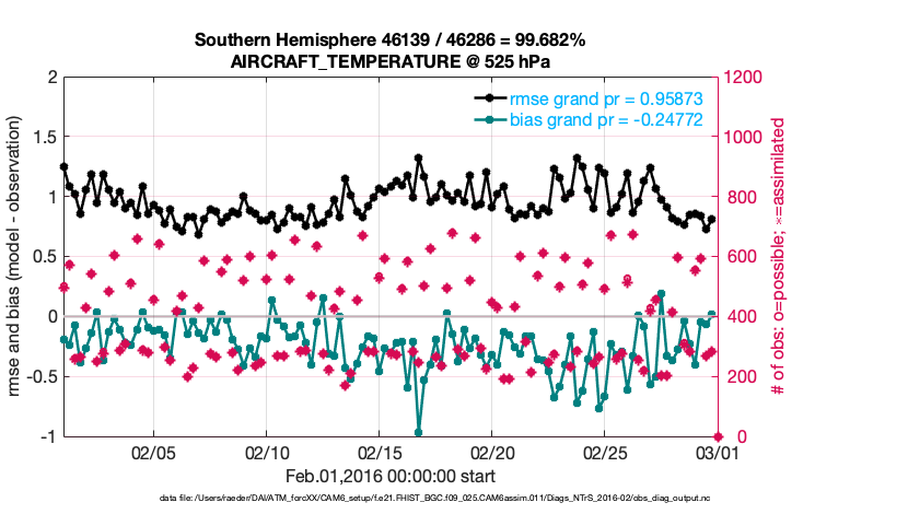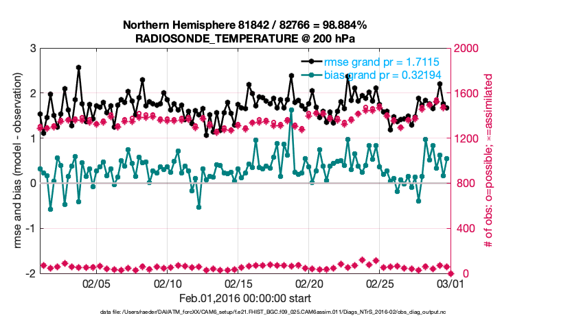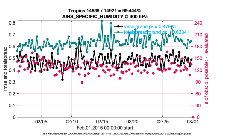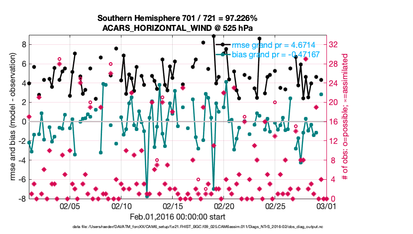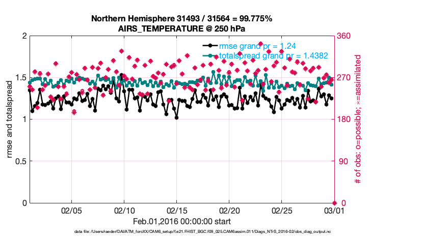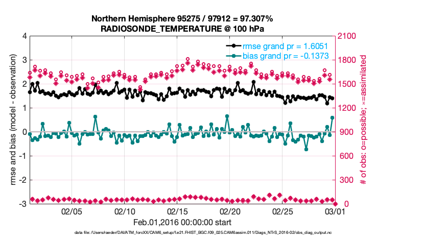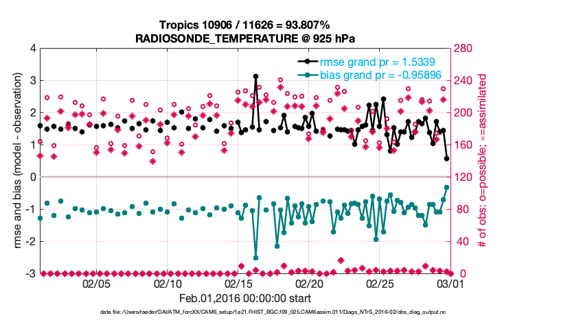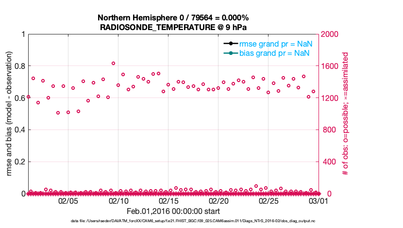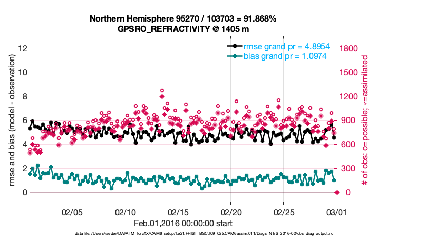 For each observation kind, the root-mean-squared-error (RMSE) is plotted together with: (i) BIAS and (ii) TOTALSPREAD. The number of available, assimilated (evaluated) and rejected observations are also shown on the plots.