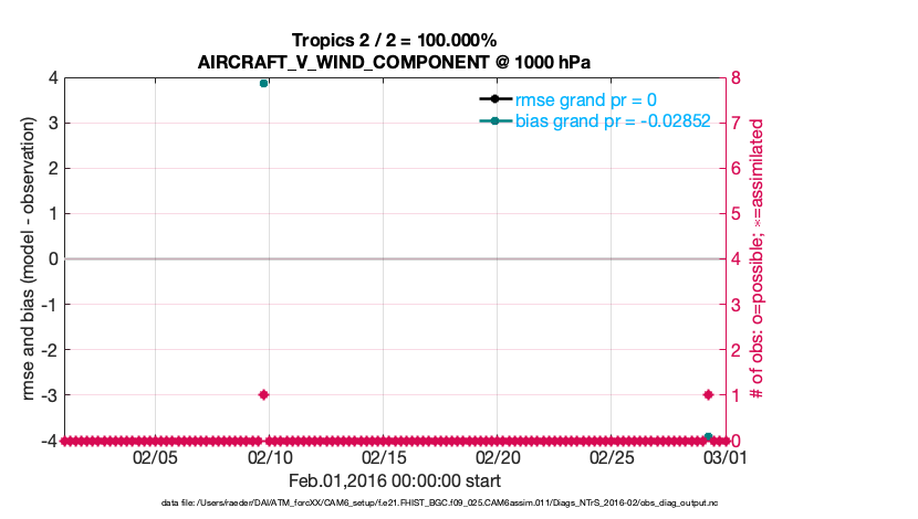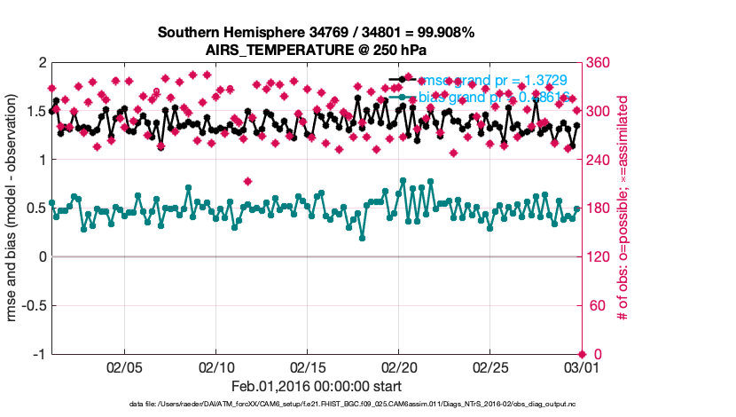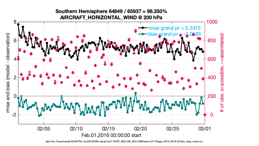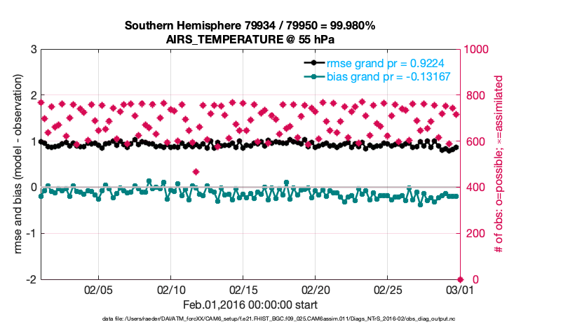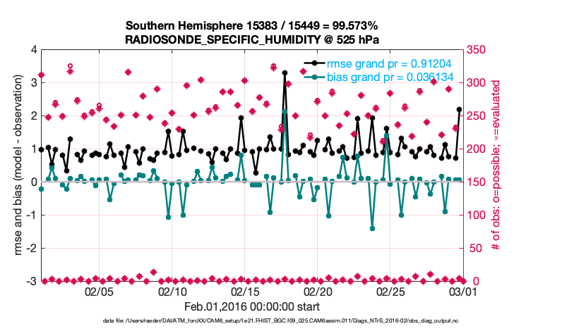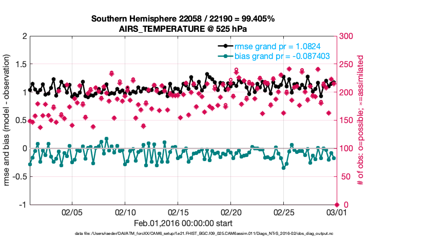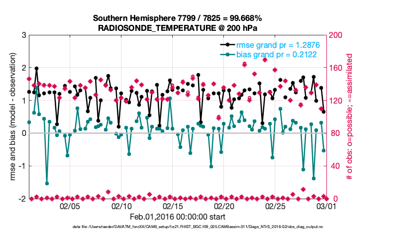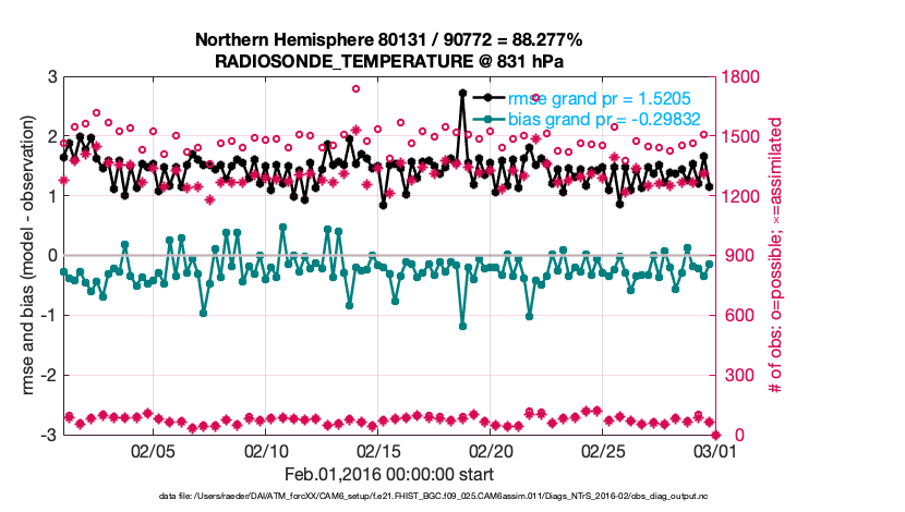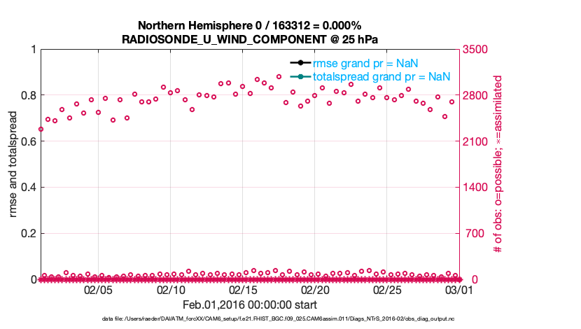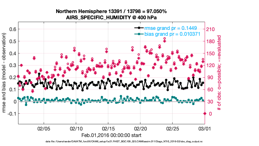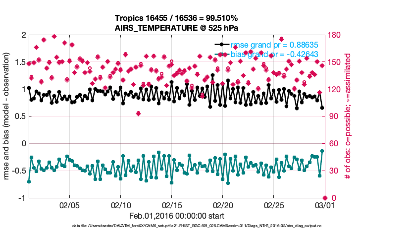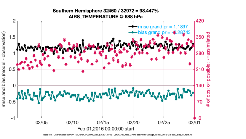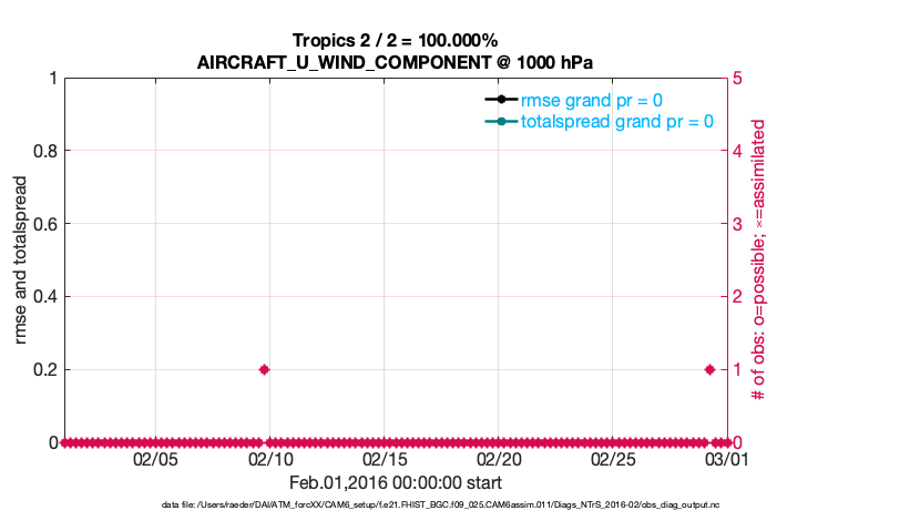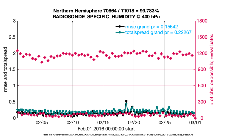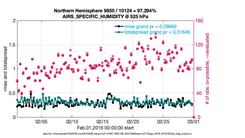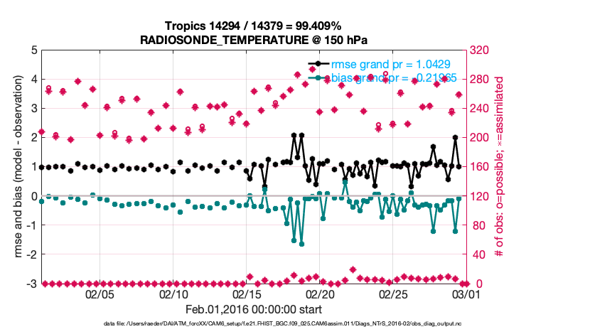 For each observation kind, the root-mean-squared-error (RMSE) is plotted together with: (i) BIAS and (ii) TOTALSPREAD. The number of available, assimilated (evaluated) and rejected observations are also shown on the plots.