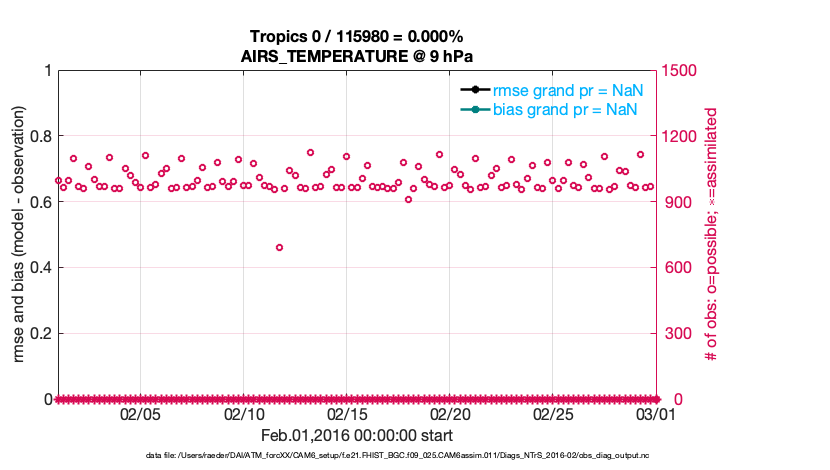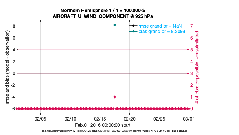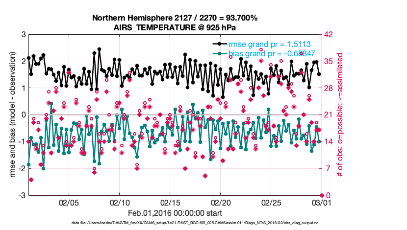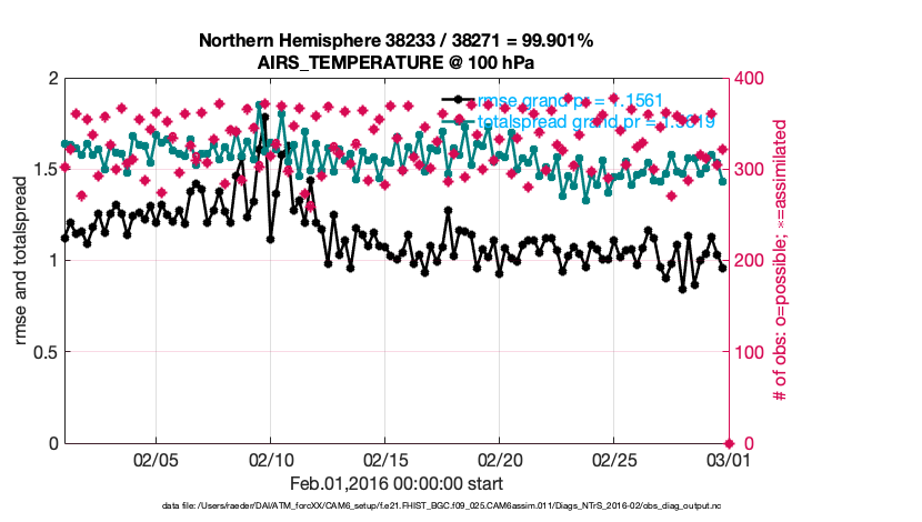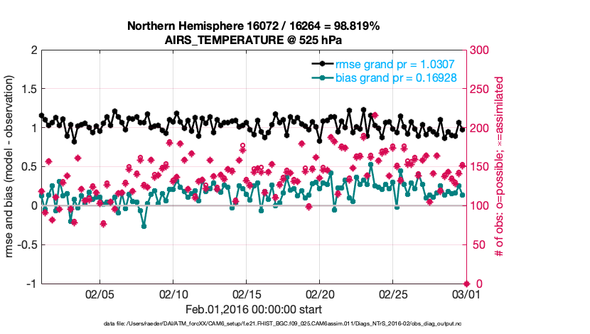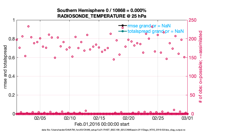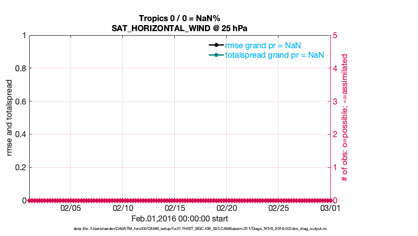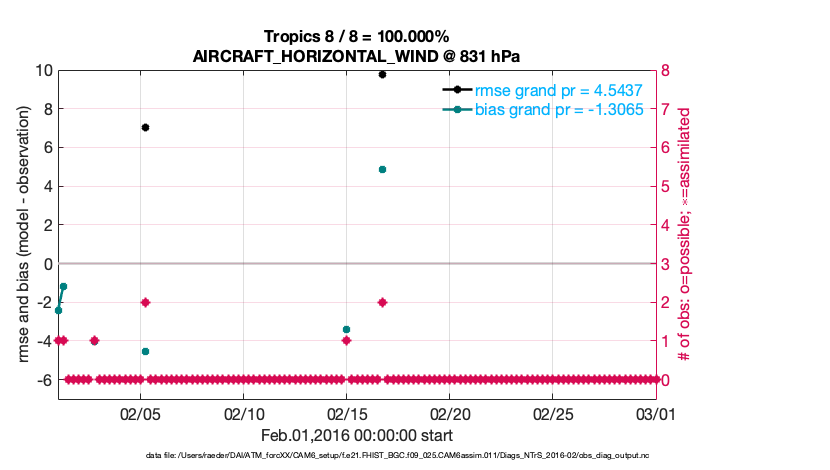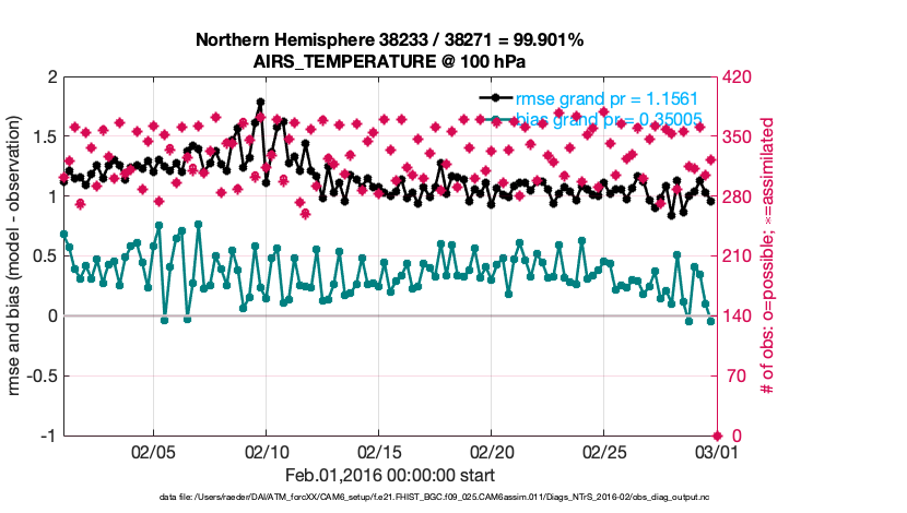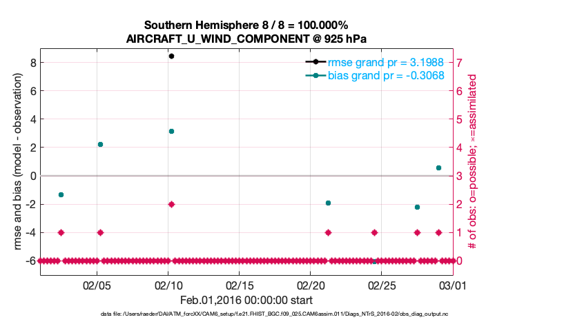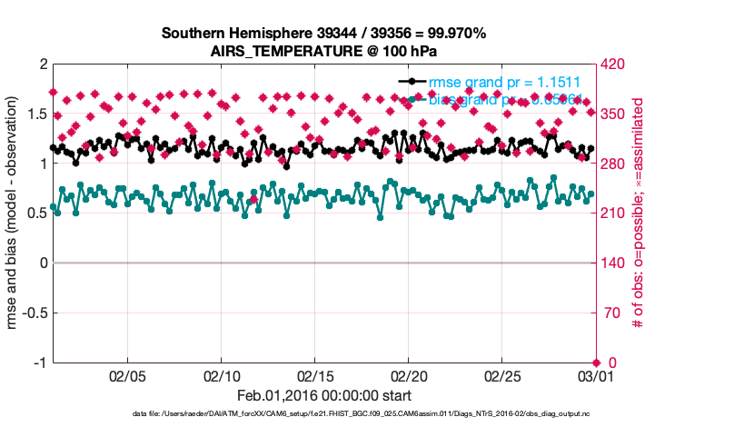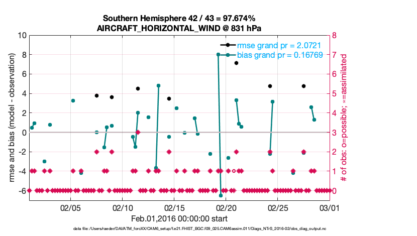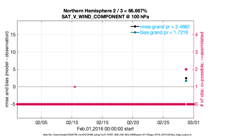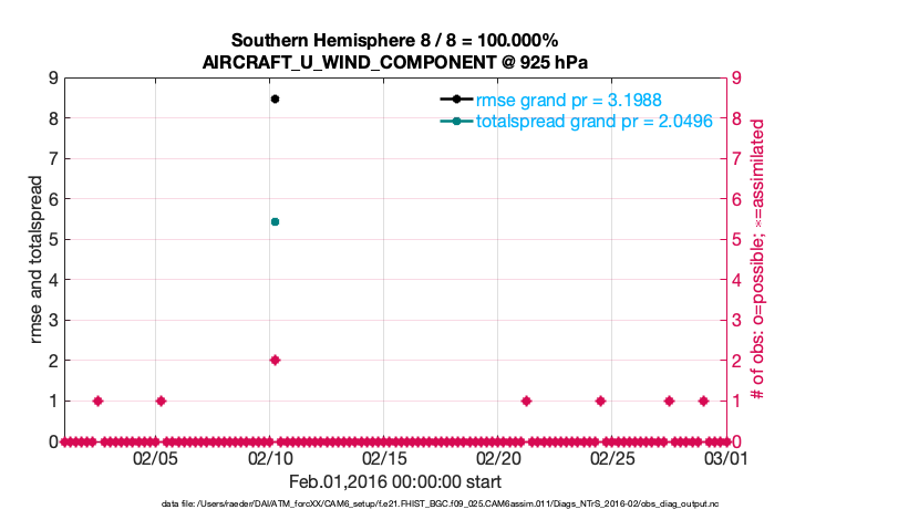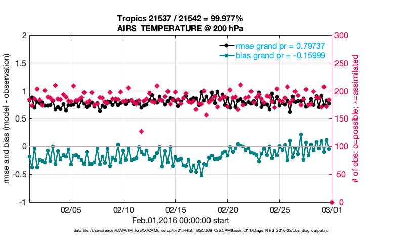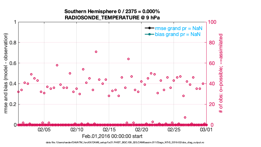 For each observation kind, the root-mean-squared-error (RMSE) is plotted together with: (i) BIAS and (ii) TOTALSPREAD. The number of available, assimilated (evaluated) and rejected observations are also shown on the plots.