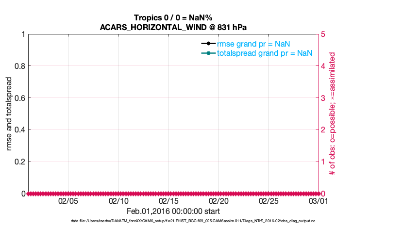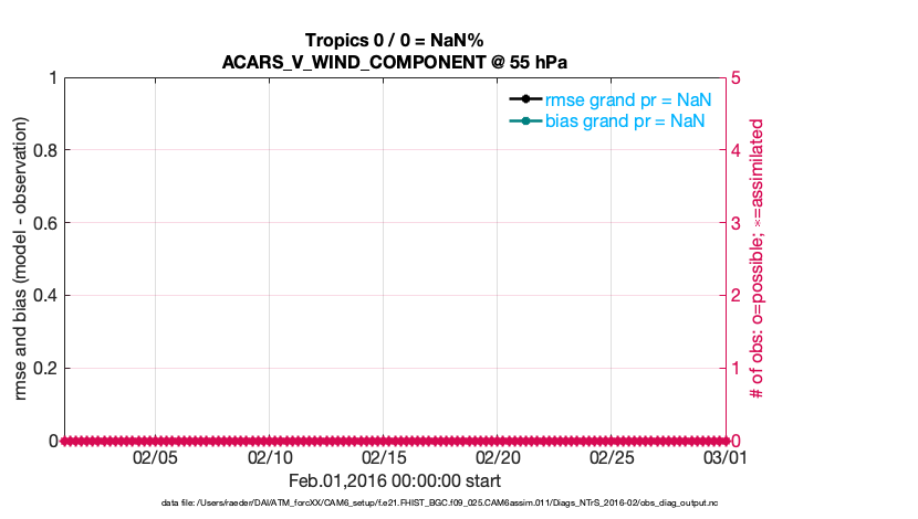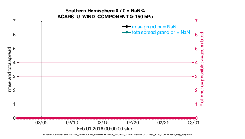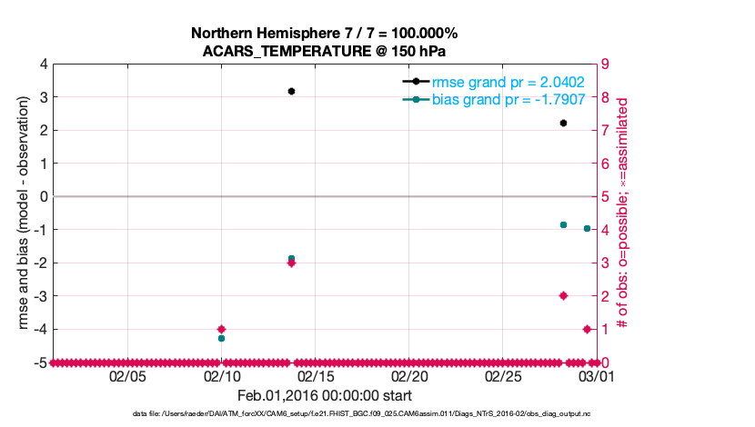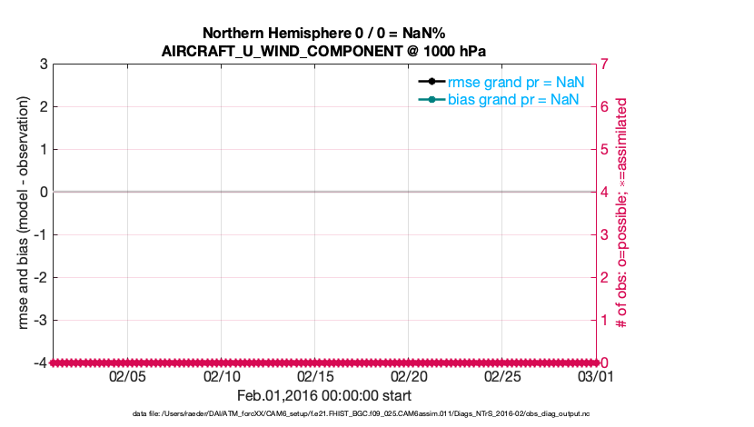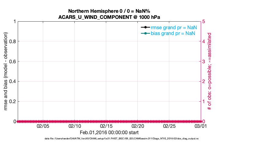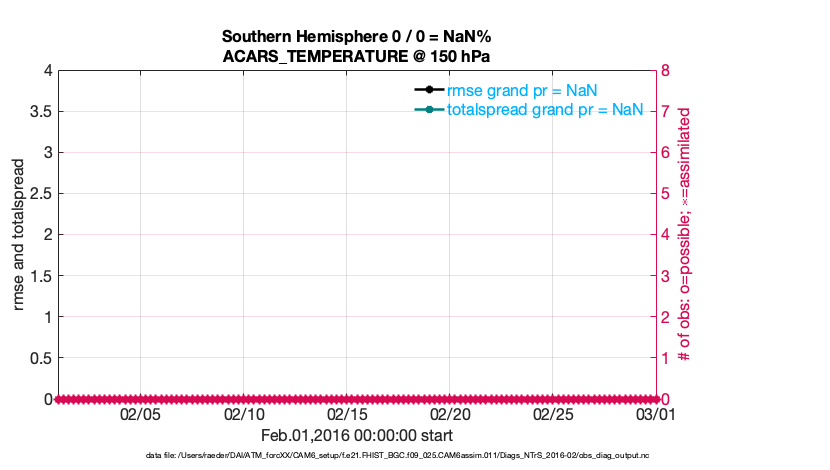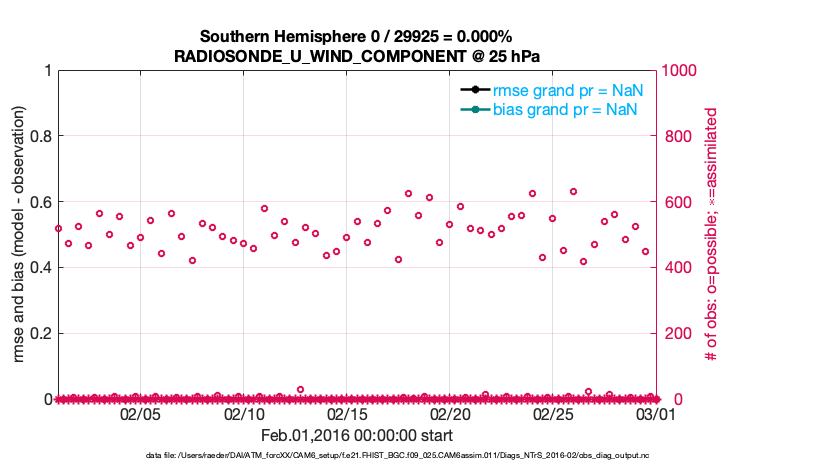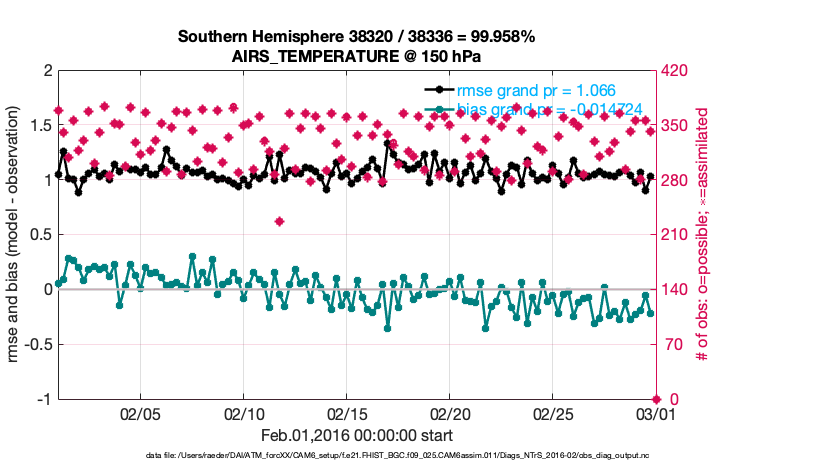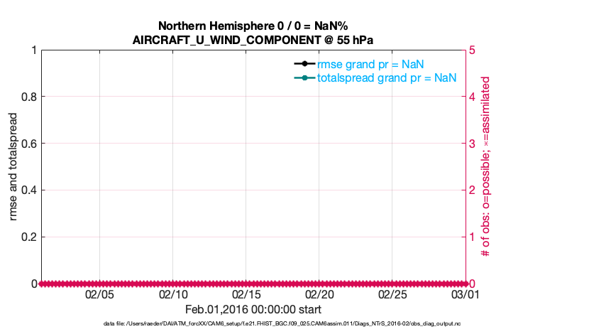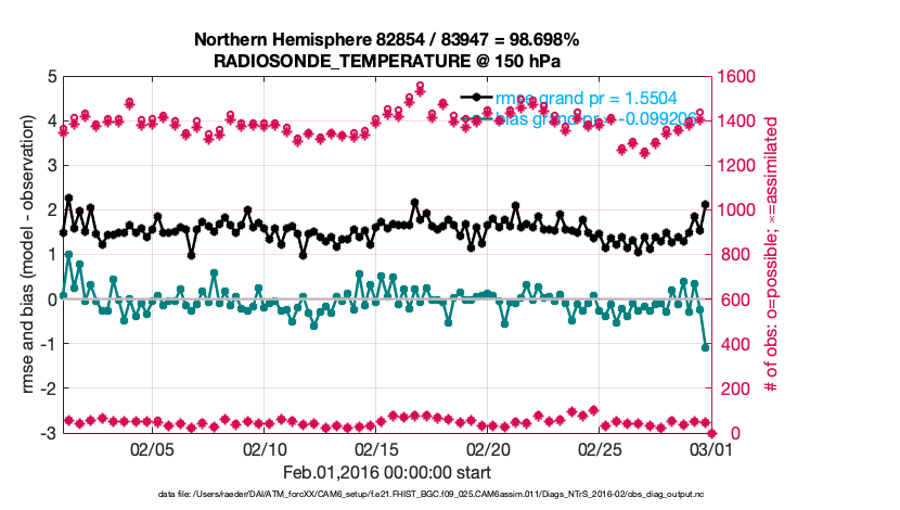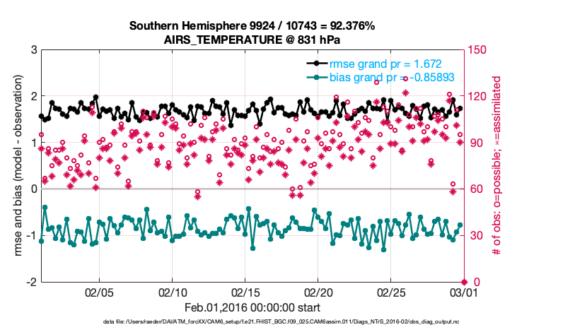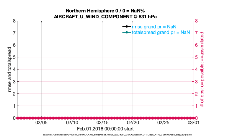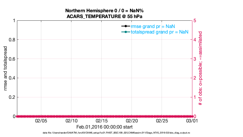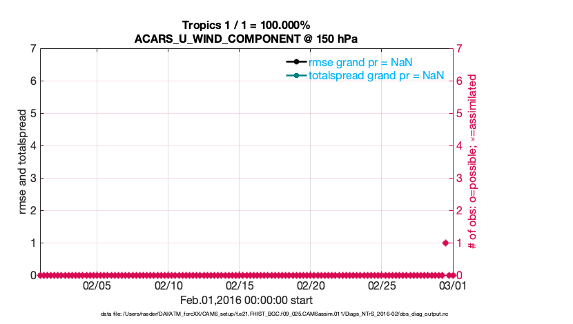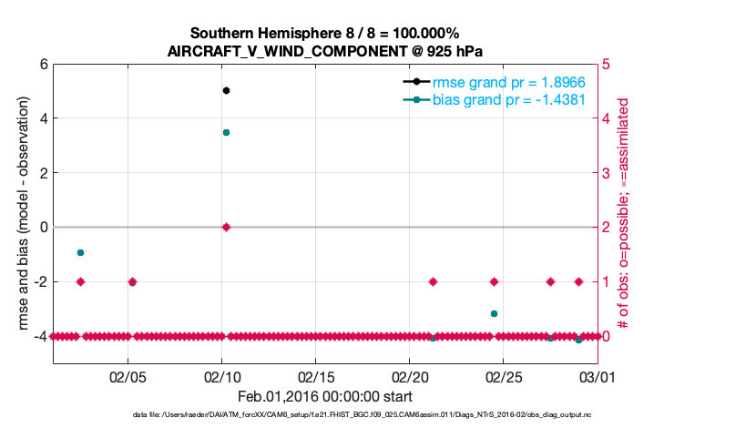 For each observation kind, the root-mean-squared-error (RMSE) is plotted together with: (i) BIAS and (ii) TOTALSPREAD. The number of available, assimilated (evaluated) and rejected observations are also shown on the plots.