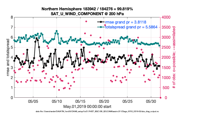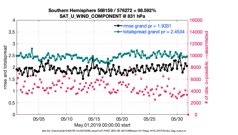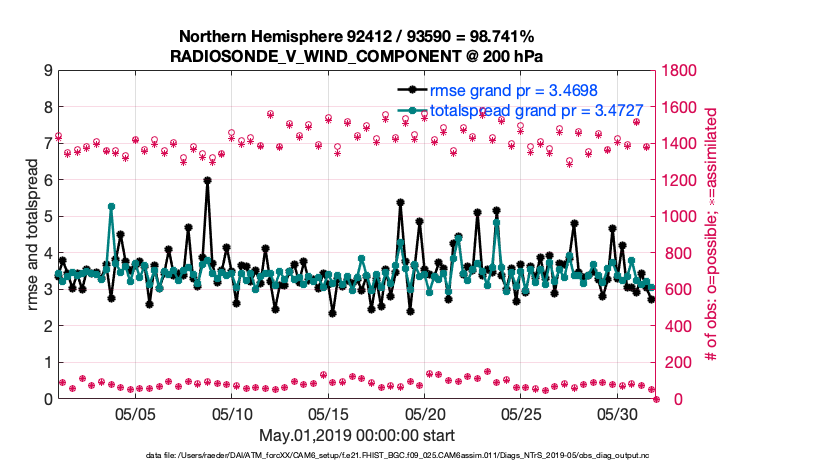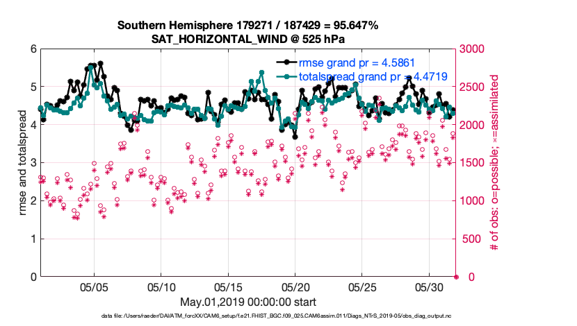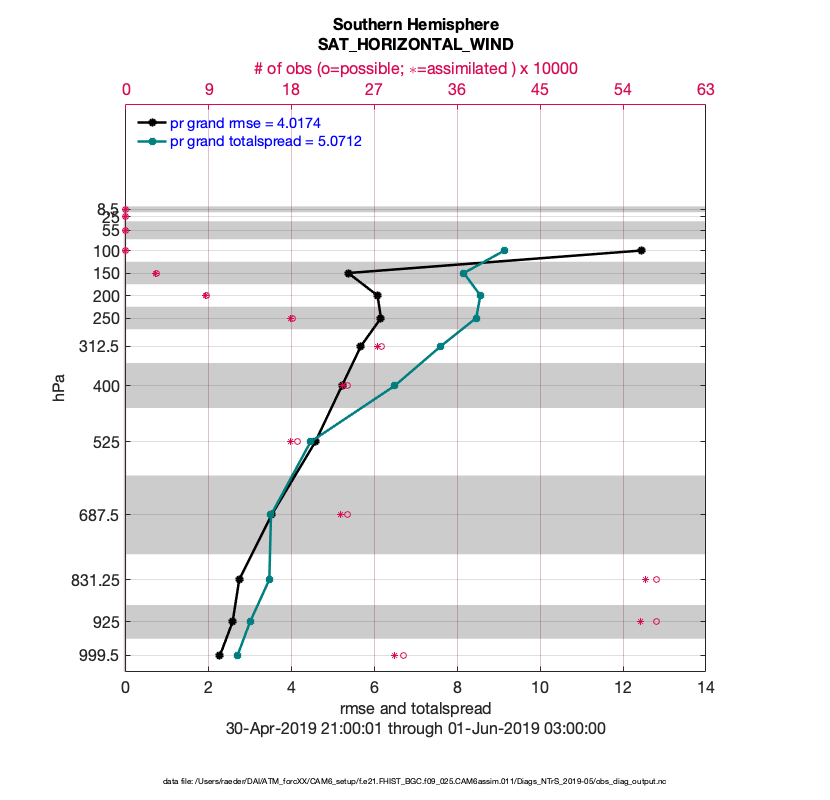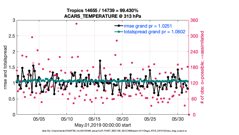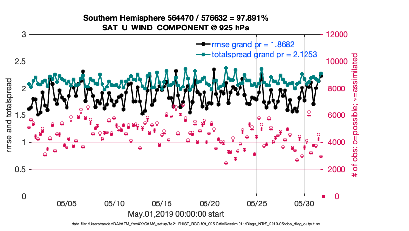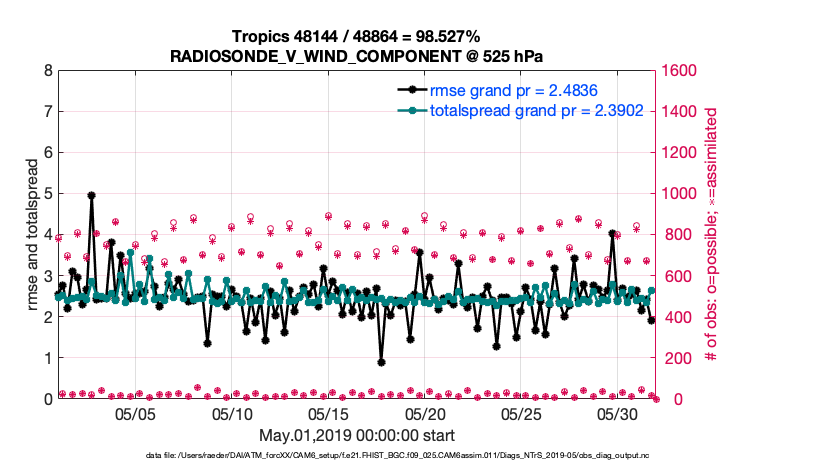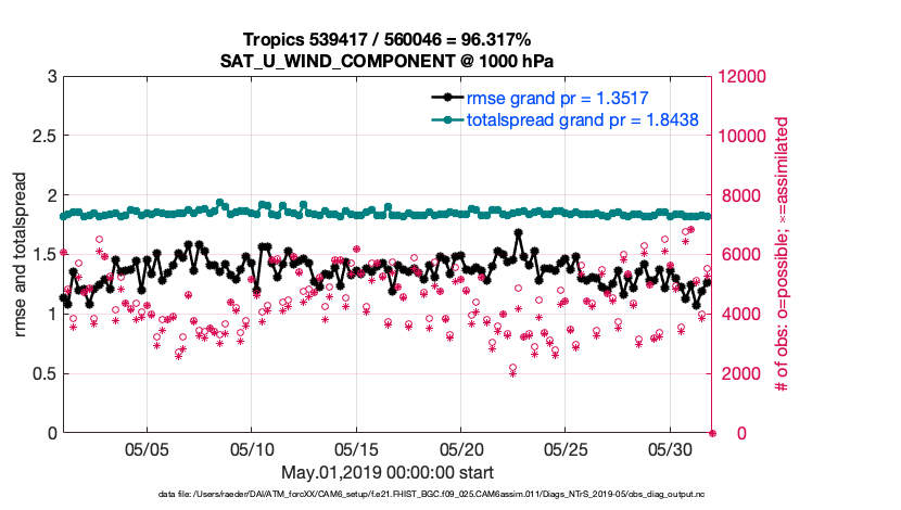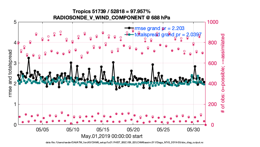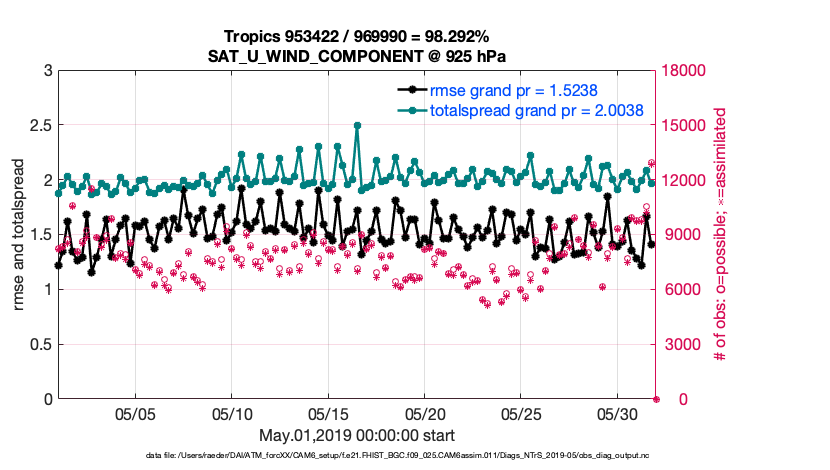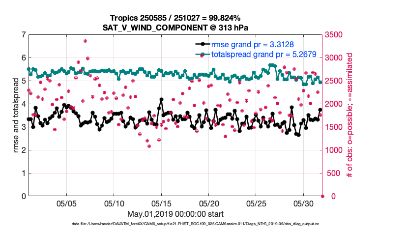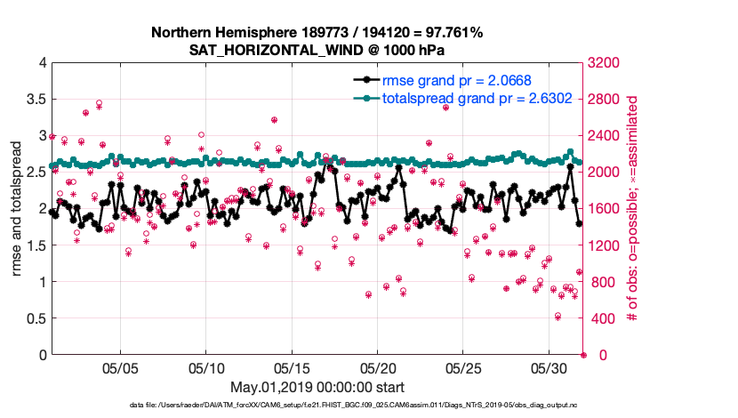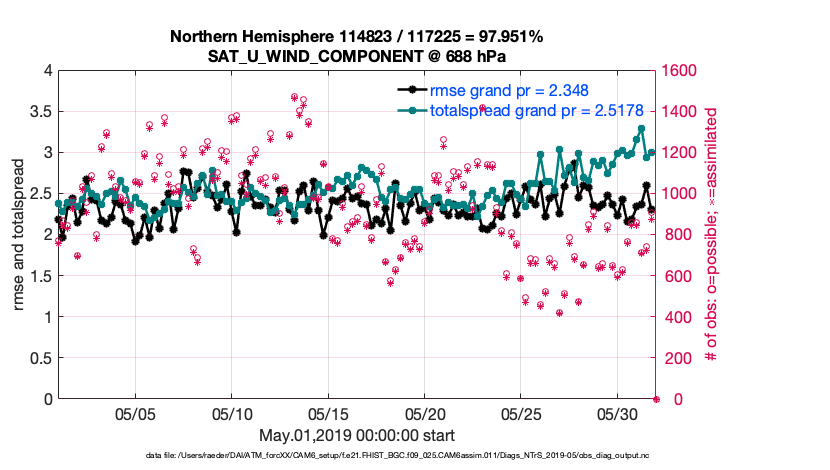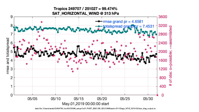 For each observation kind, the root-mean-squared-error (RMSE) is plotted together with: (i) BIAS and (ii) TOTALSPREAD. The number of available, assimilated (evaluated) and rejected observations are also shown on the plots.