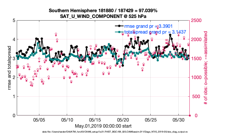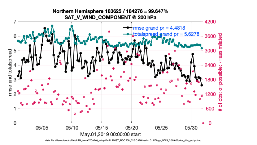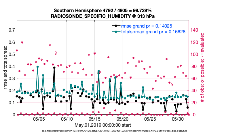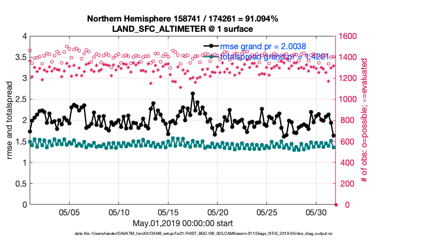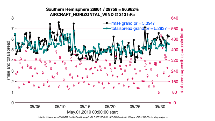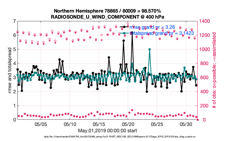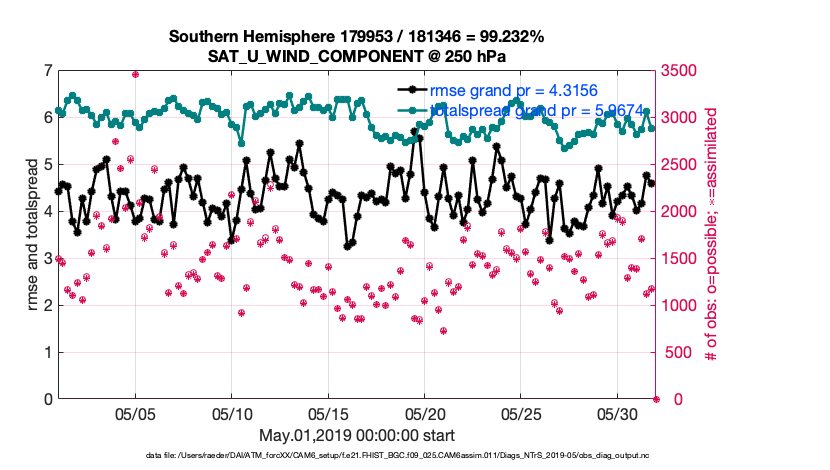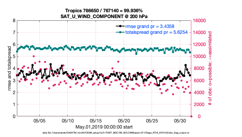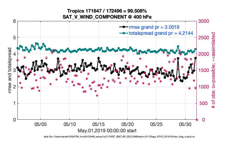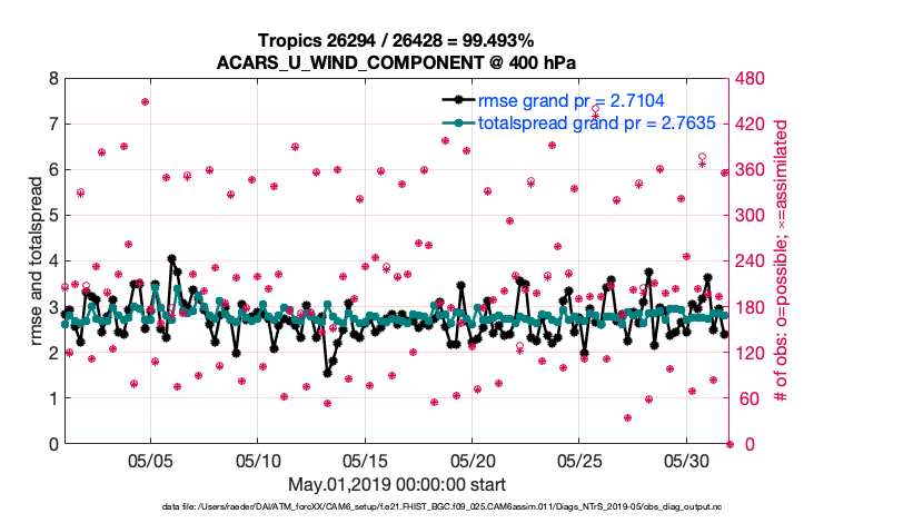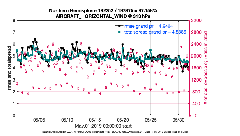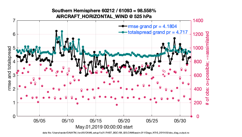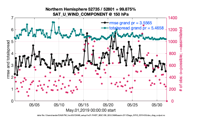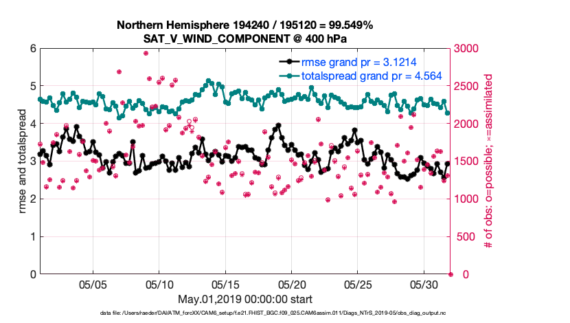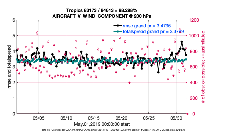 For each observation kind, the root-mean-squared-error (RMSE) is plotted together with: (i) BIAS and (ii) TOTALSPREAD. The number of available, assimilated (evaluated) and rejected observations are also shown on the plots.