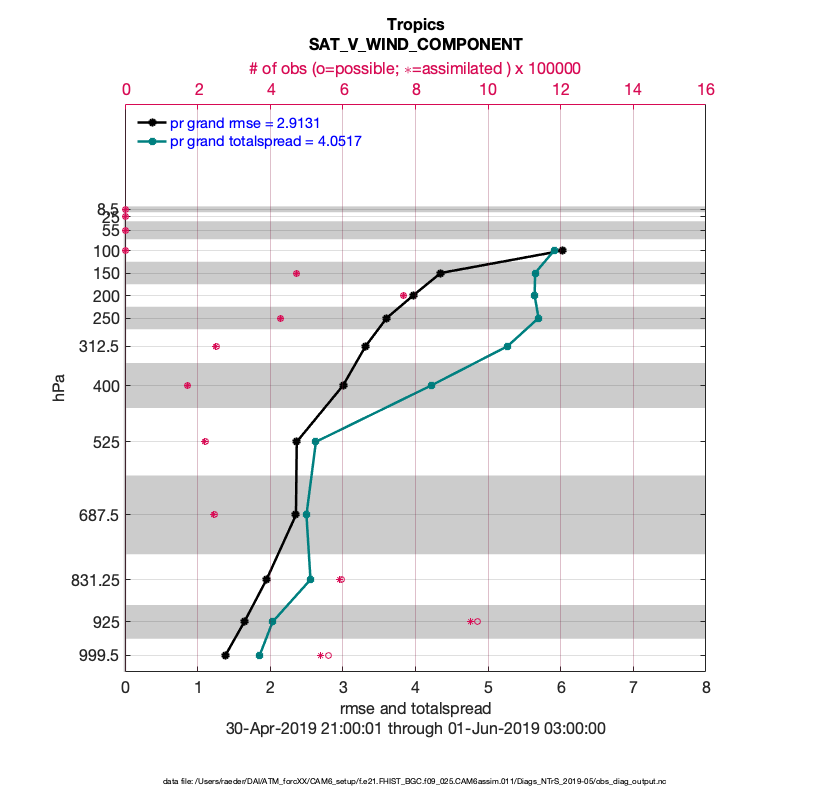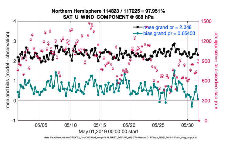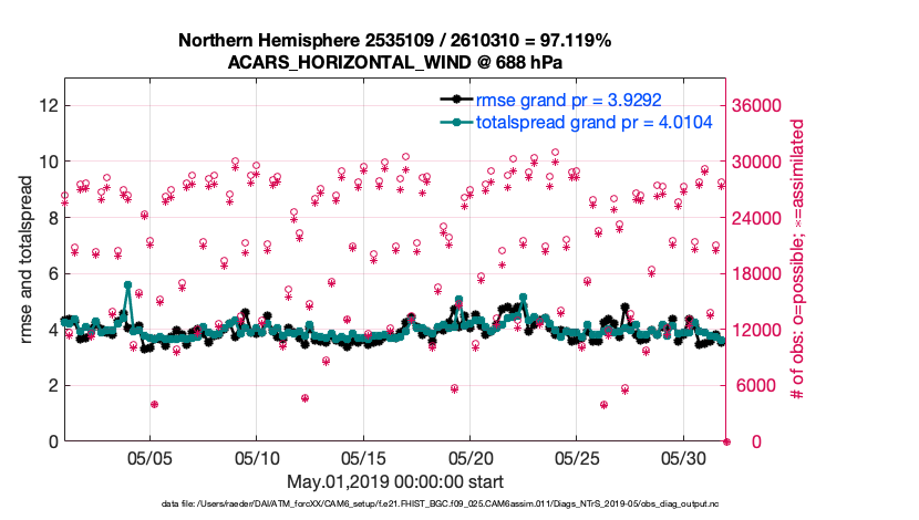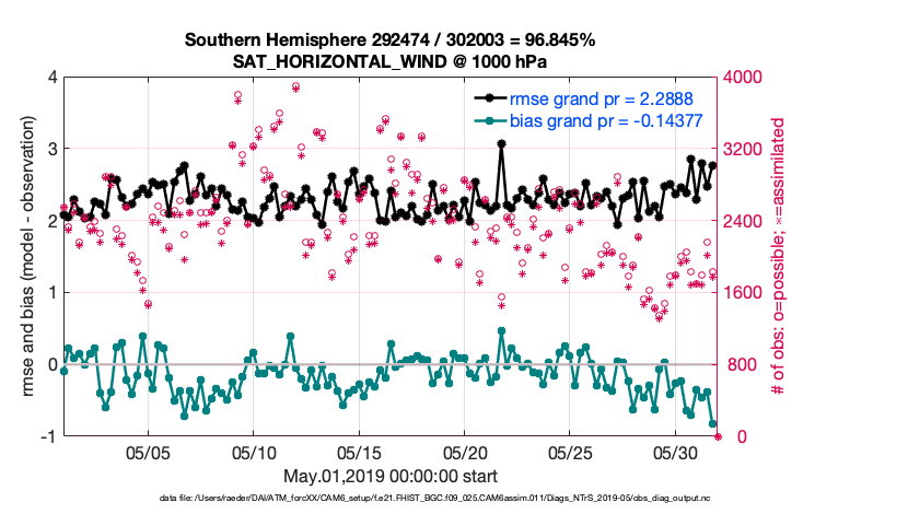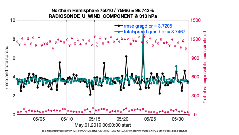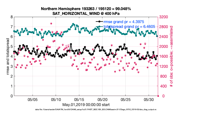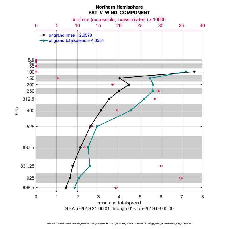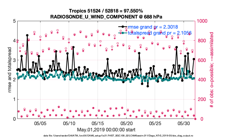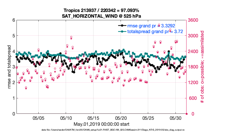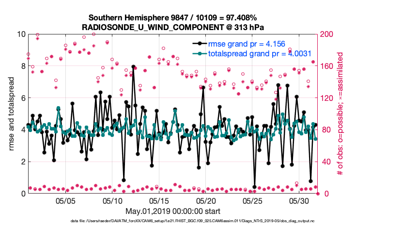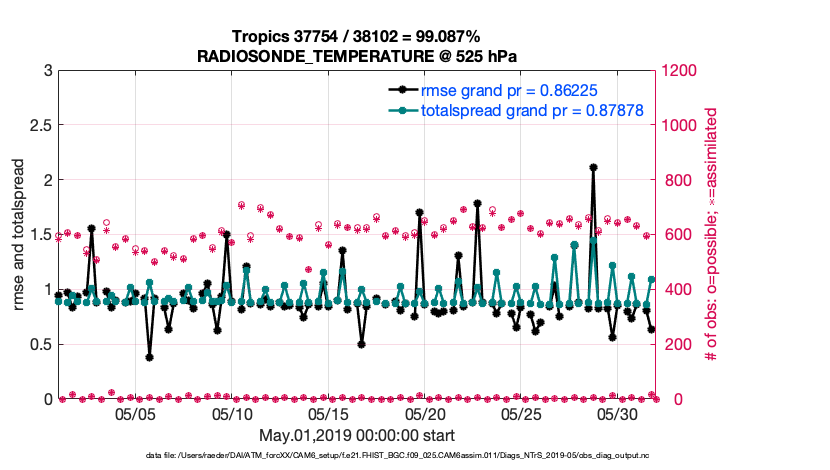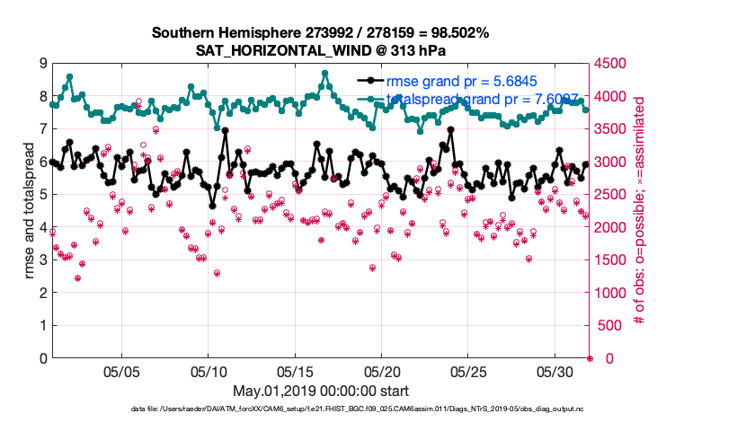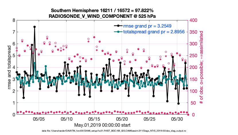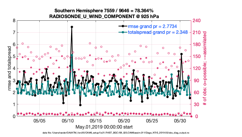 For each observation kind, the root-mean-squared-error (RMSE) is plotted together with: (i) BIAS and (ii) TOTALSPREAD. The number of available, assimilated (evaluated) and rejected observations are also shown on the plots.