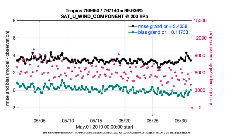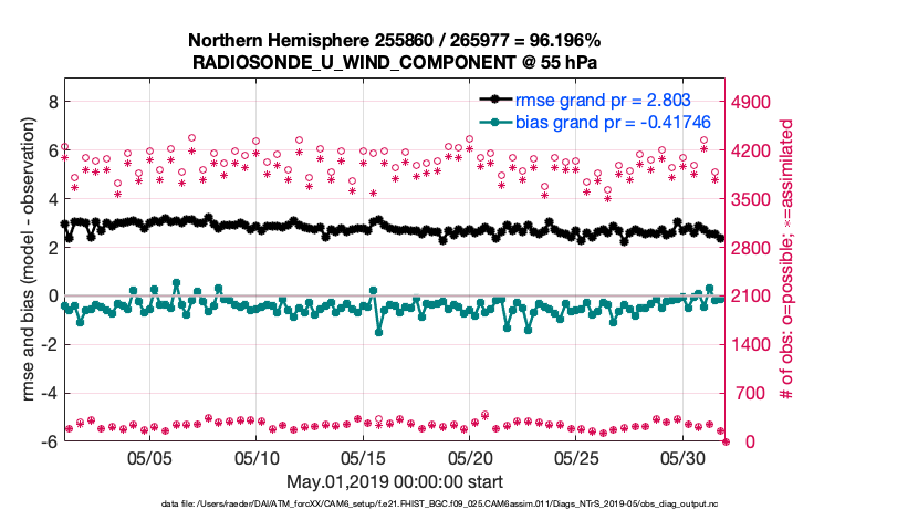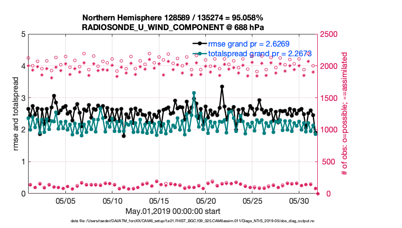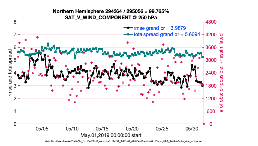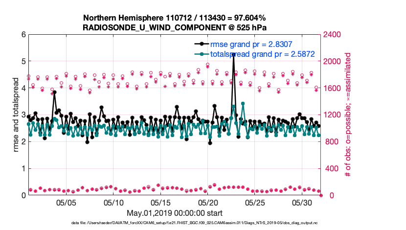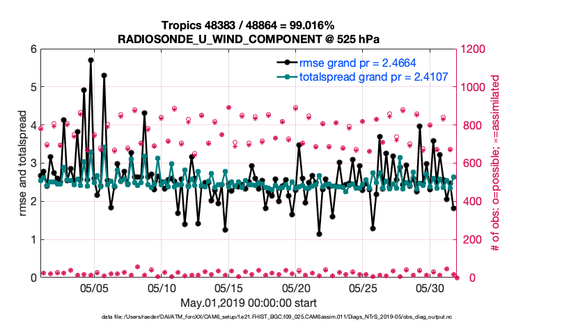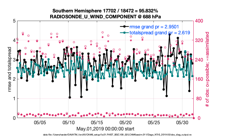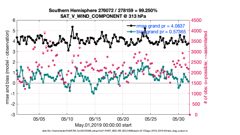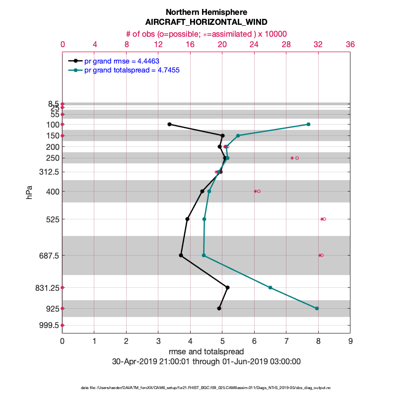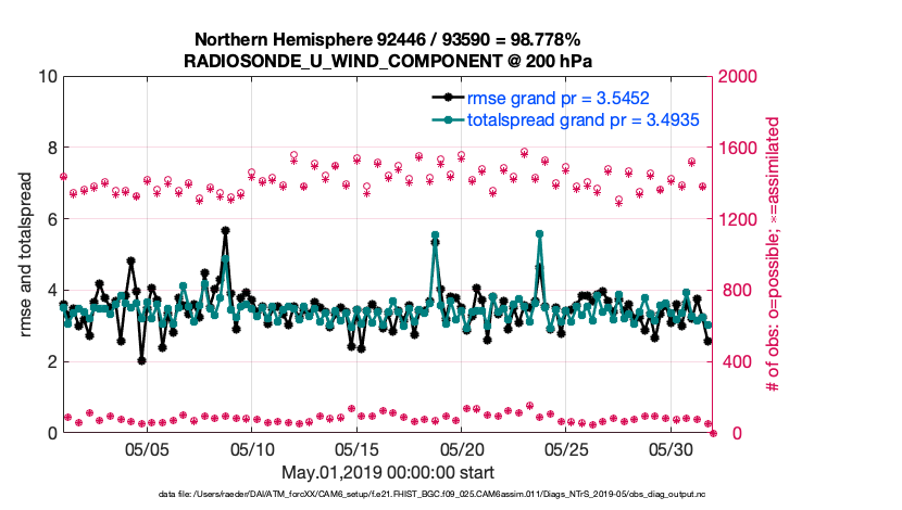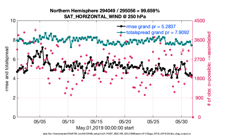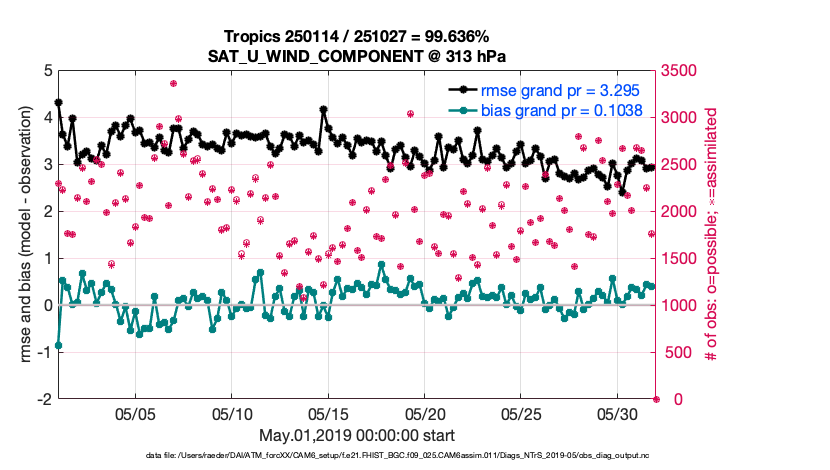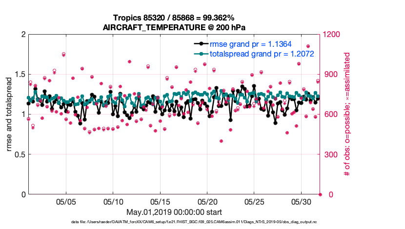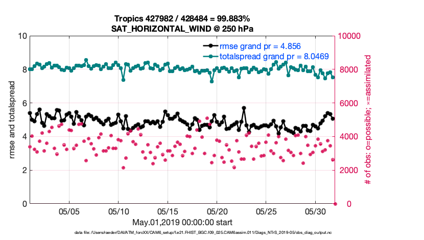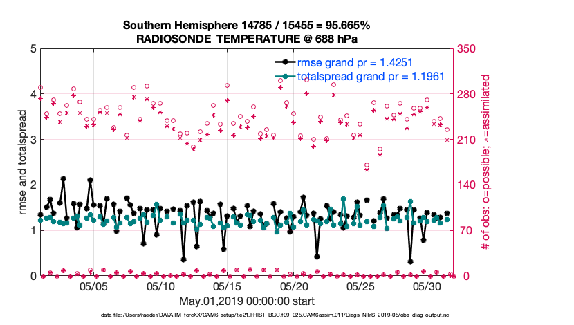 For each observation kind, the root-mean-squared-error (RMSE) is plotted together with: (i) BIAS and (ii) TOTALSPREAD. The number of available, assimilated (evaluated) and rejected observations are also shown on the plots.