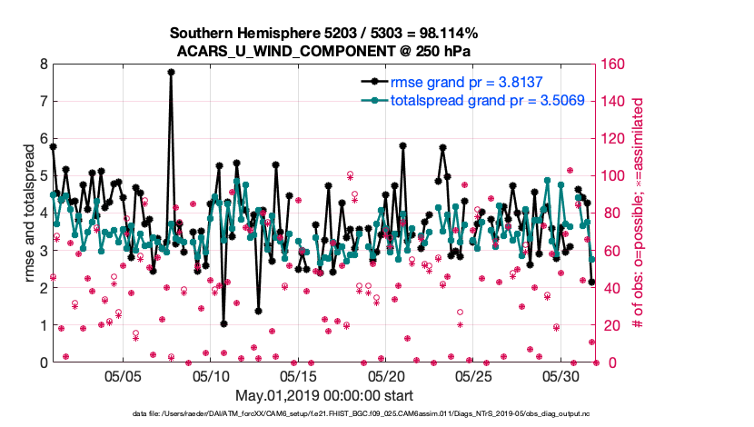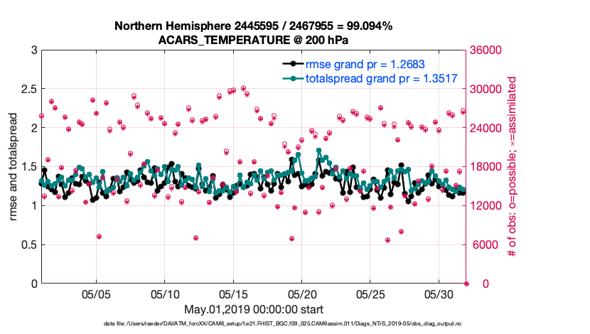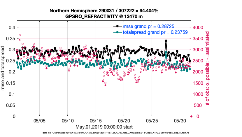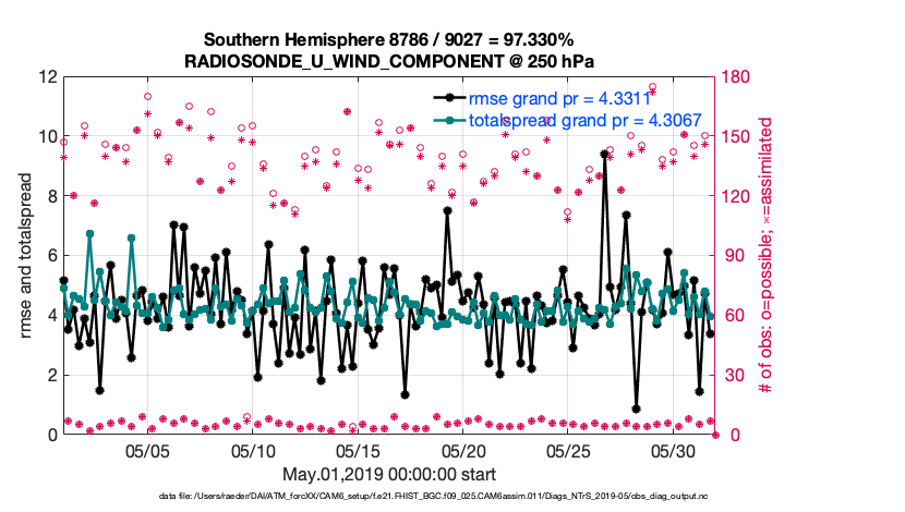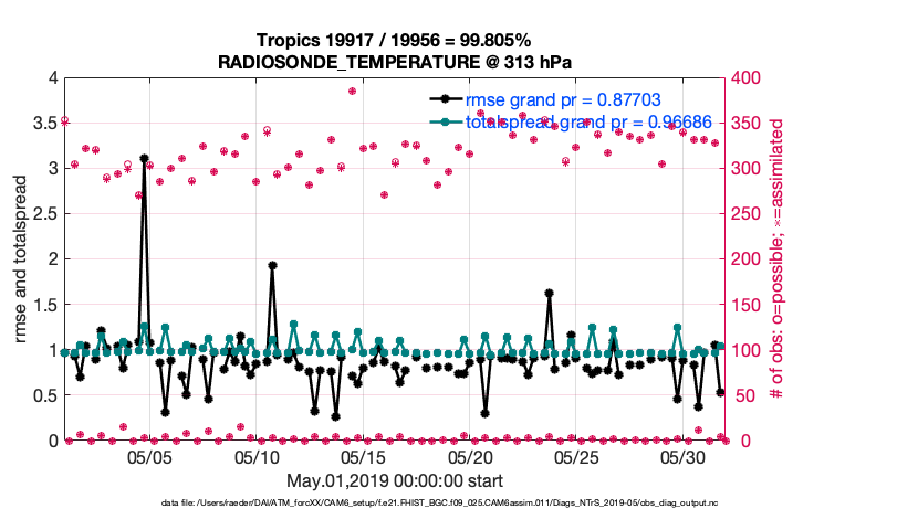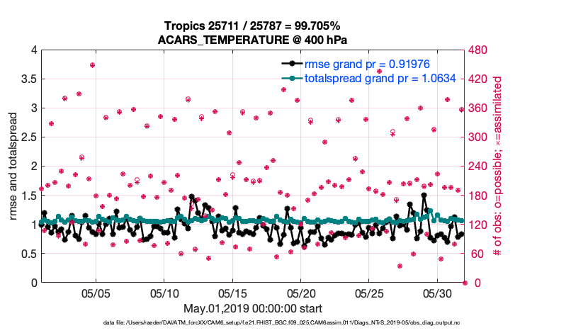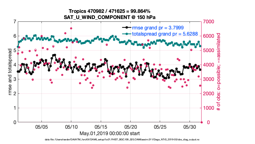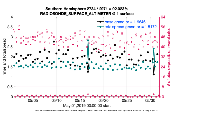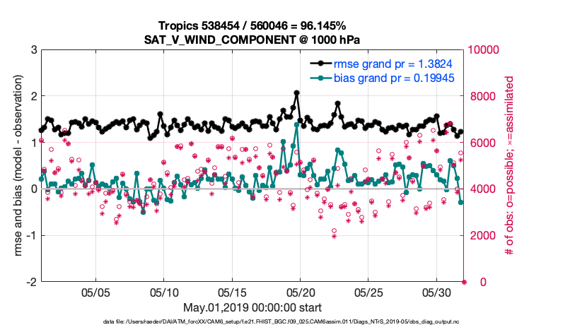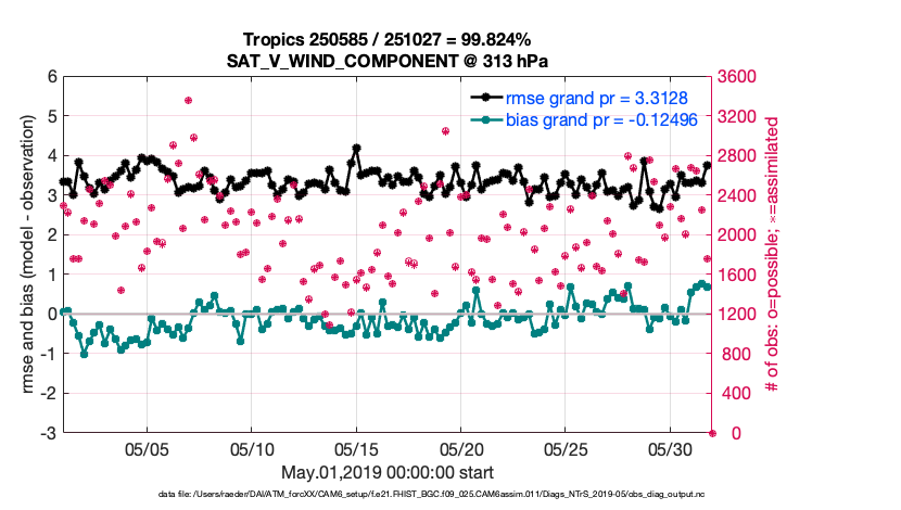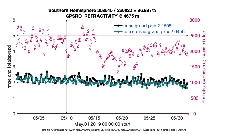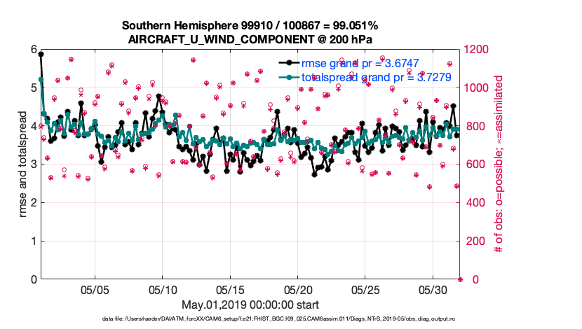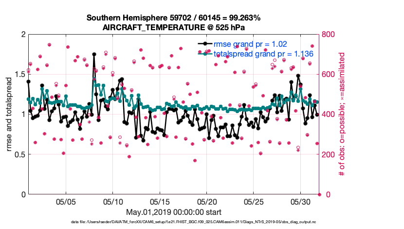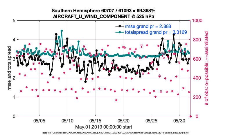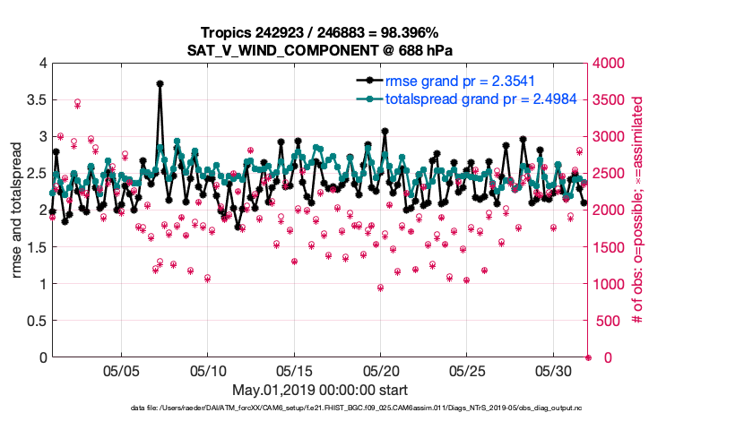 For each observation kind, the root-mean-squared-error (RMSE) is plotted together with: (i) BIAS and (ii) TOTALSPREAD. The number of available, assimilated (evaluated) and rejected observations are also shown on the plots.