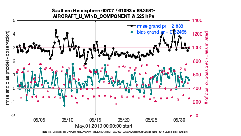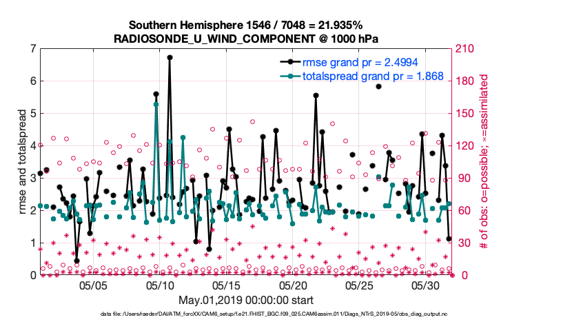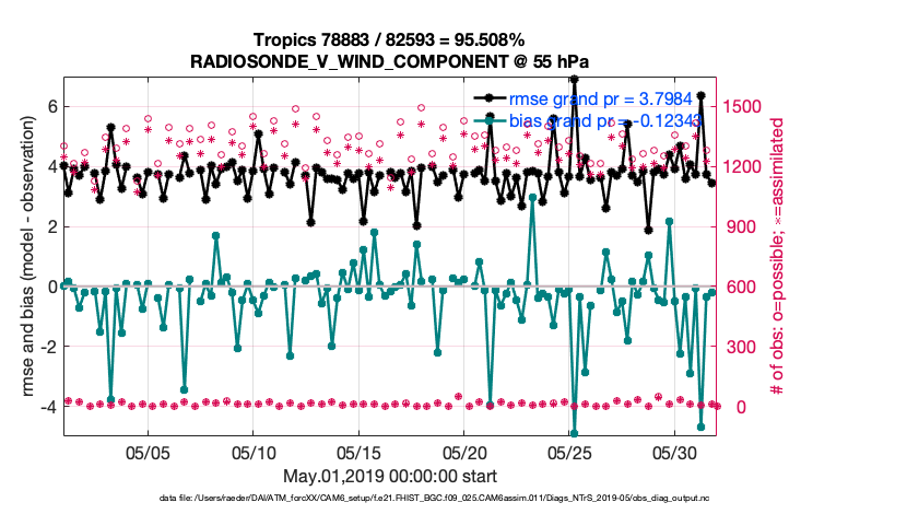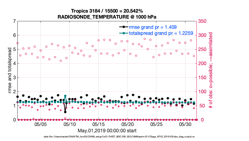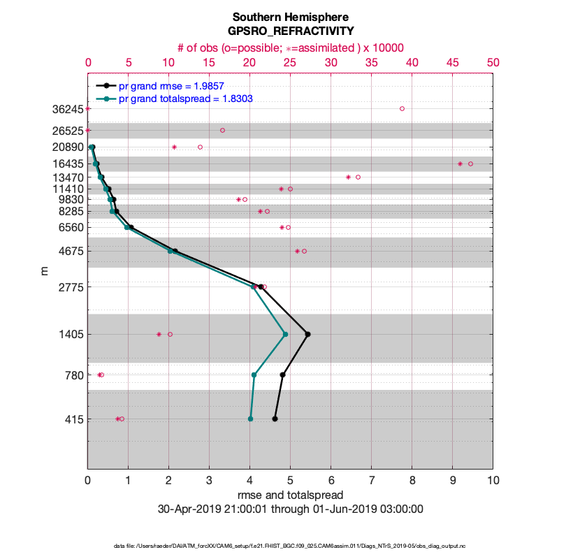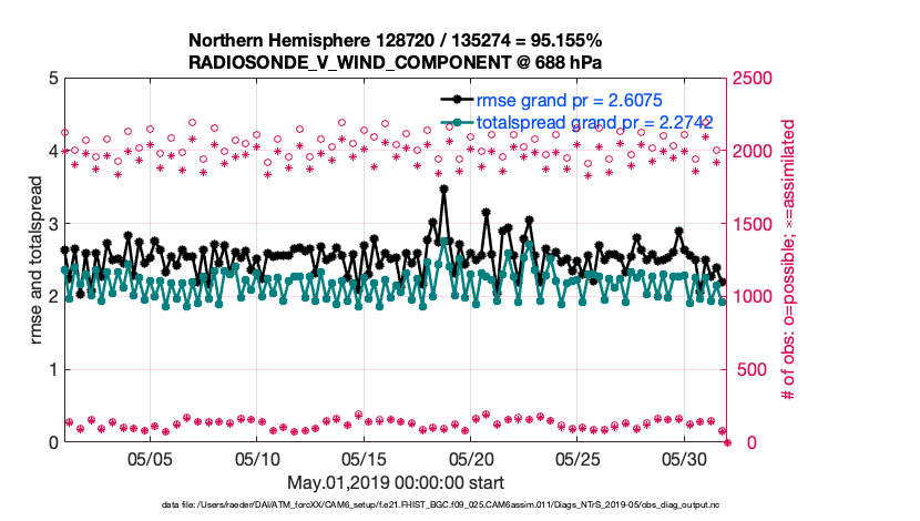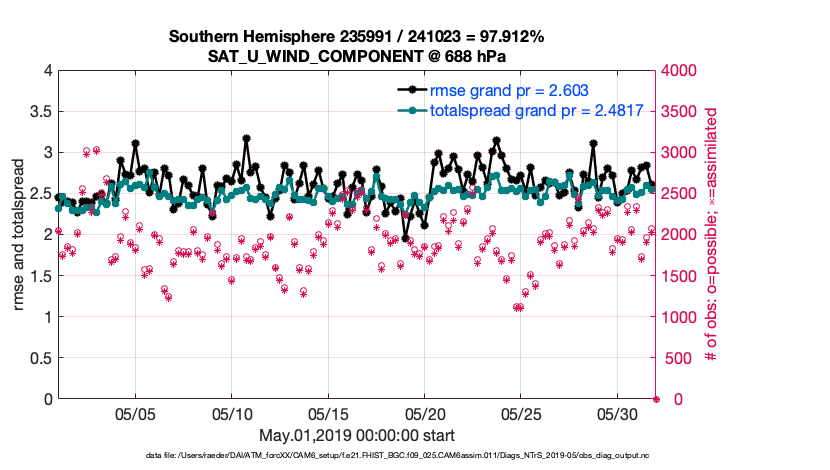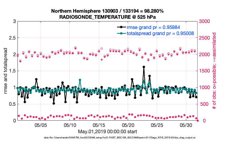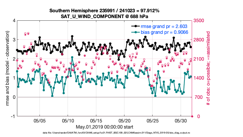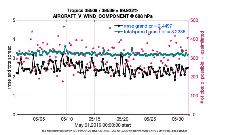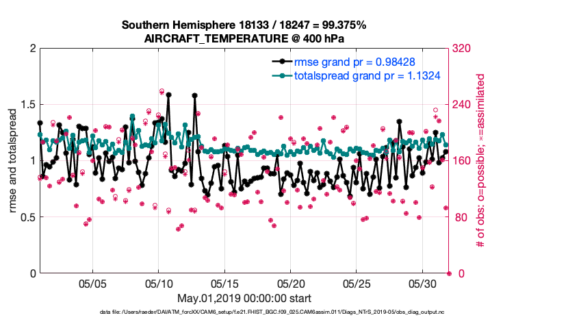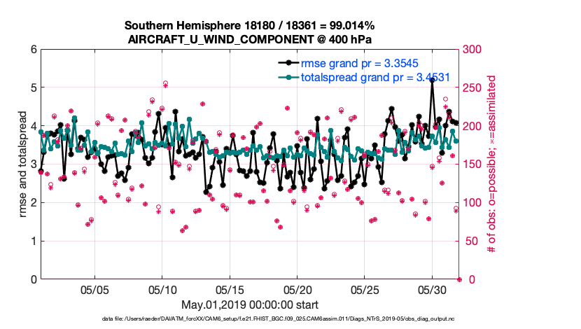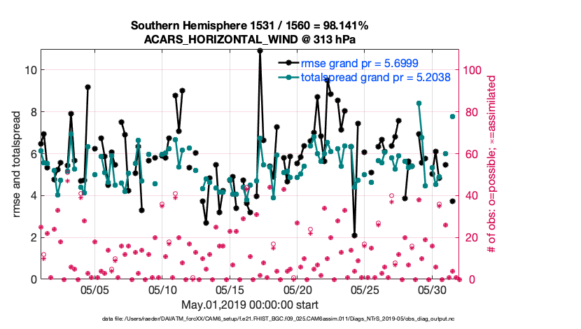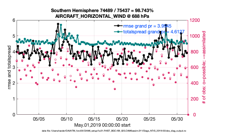 For each observation kind, the root-mean-squared-error (RMSE) is plotted together with: (i) BIAS and (ii) TOTALSPREAD. The number of available, assimilated (evaluated) and rejected observations are also shown on the plots.