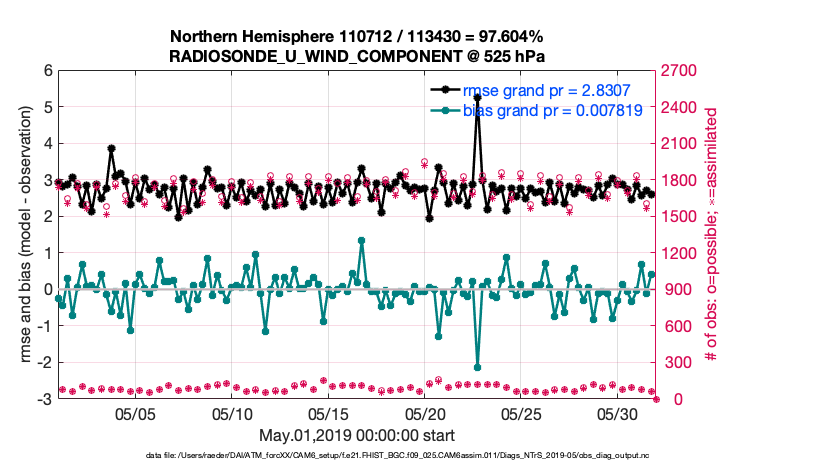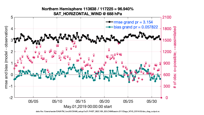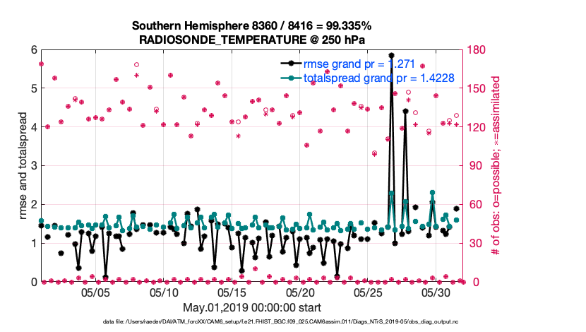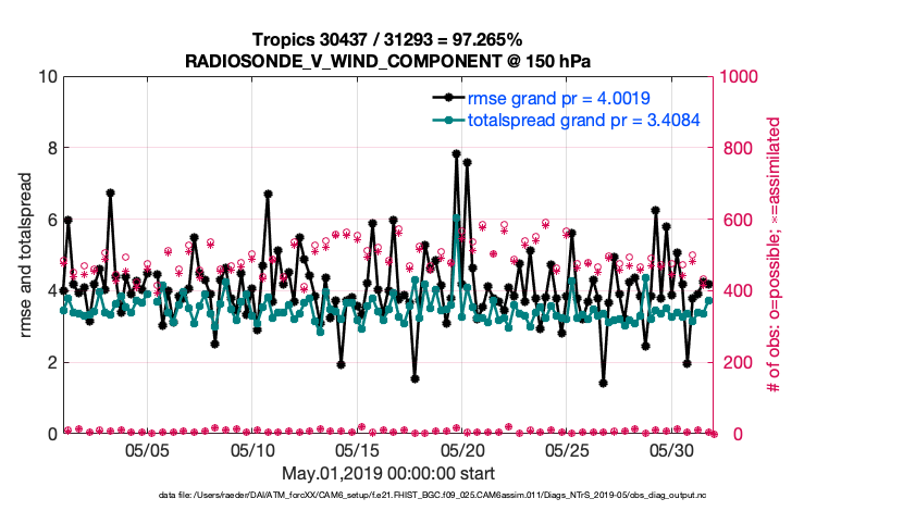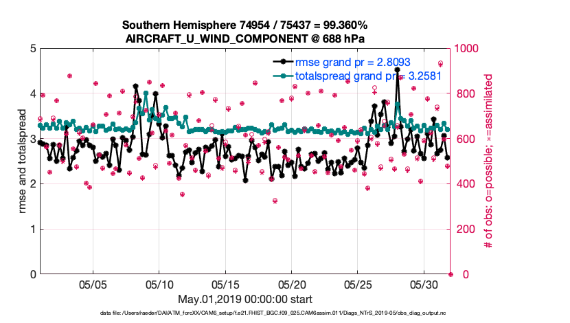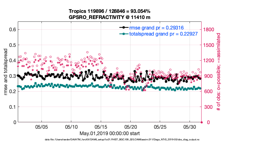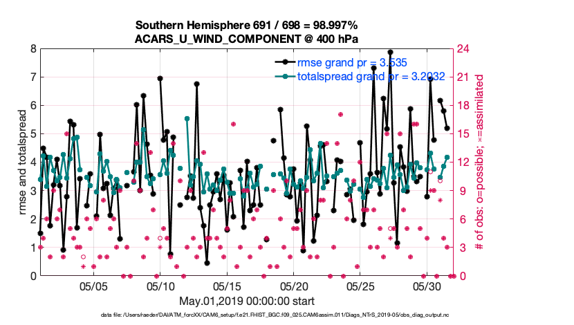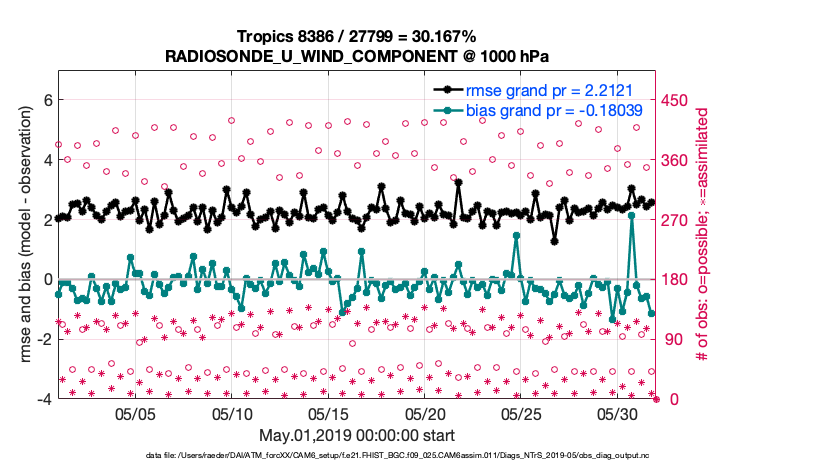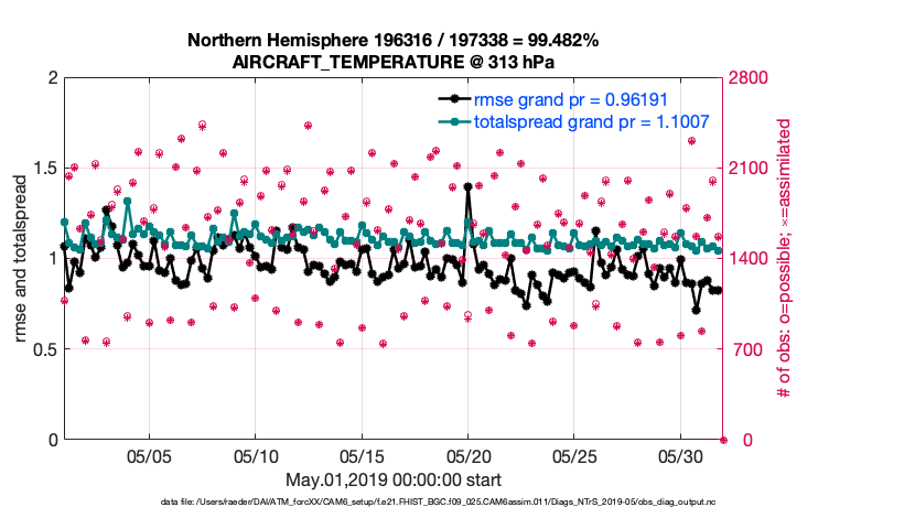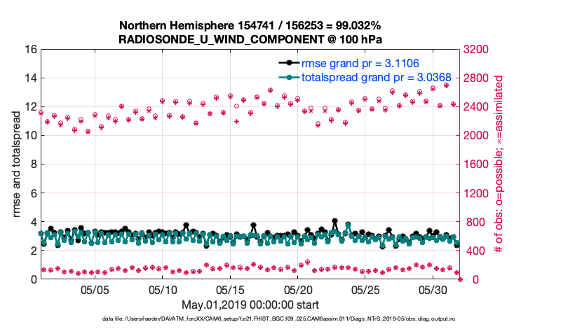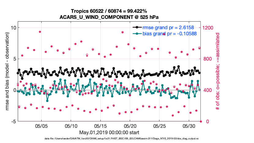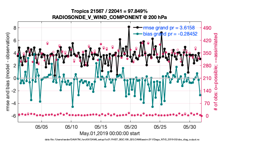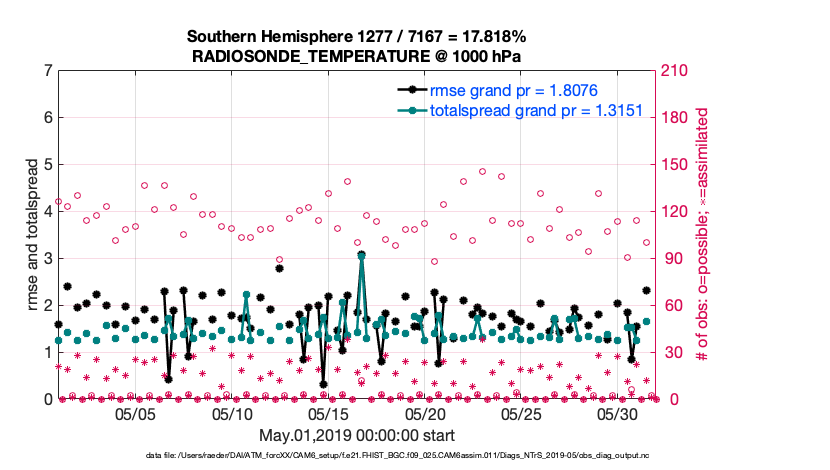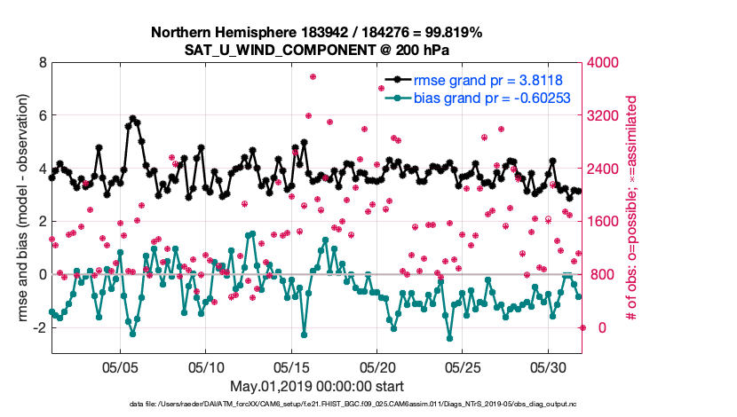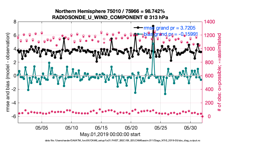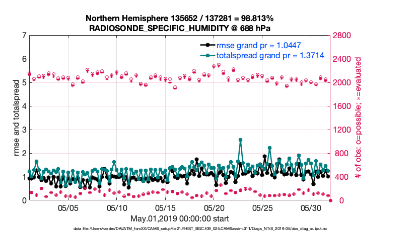 For each observation kind, the root-mean-squared-error (RMSE) is plotted together with: (i) BIAS and (ii) TOTALSPREAD. The number of available, assimilated (evaluated) and rejected observations are also shown on the plots.