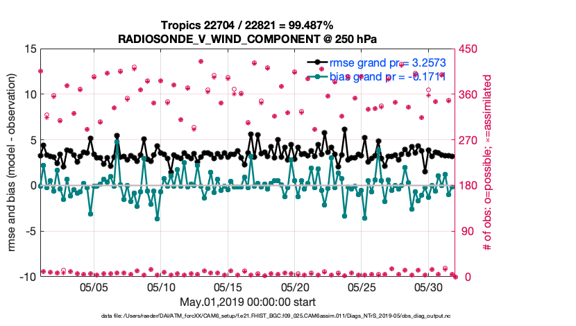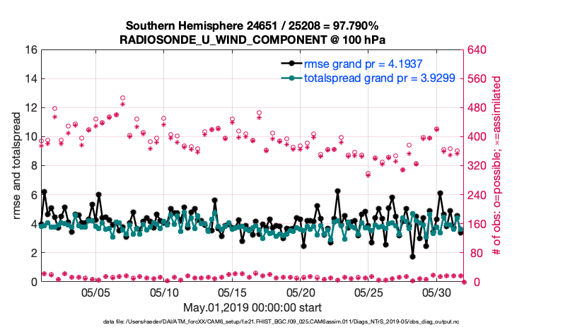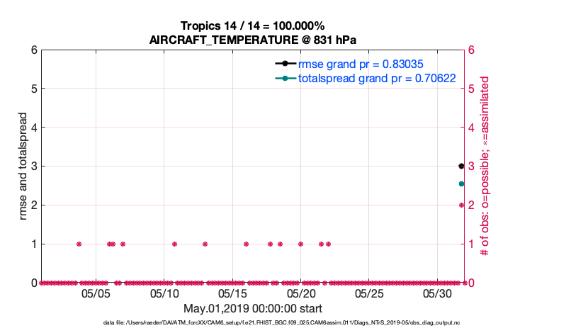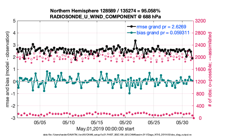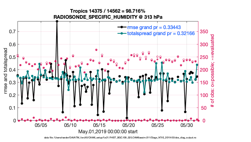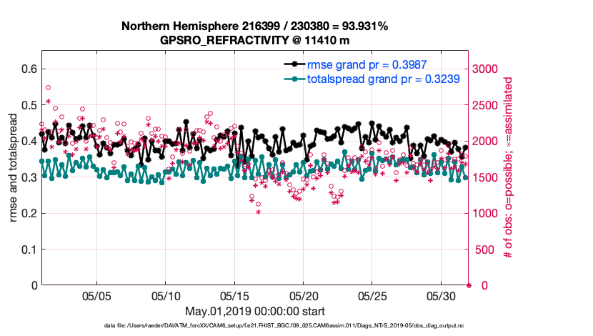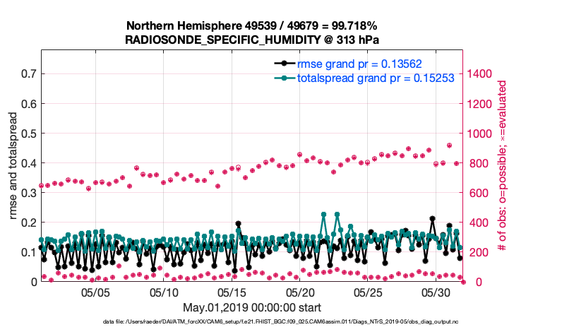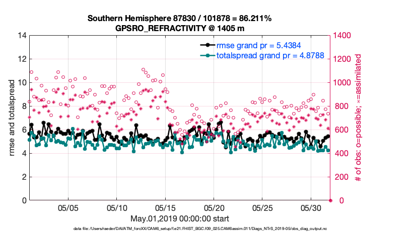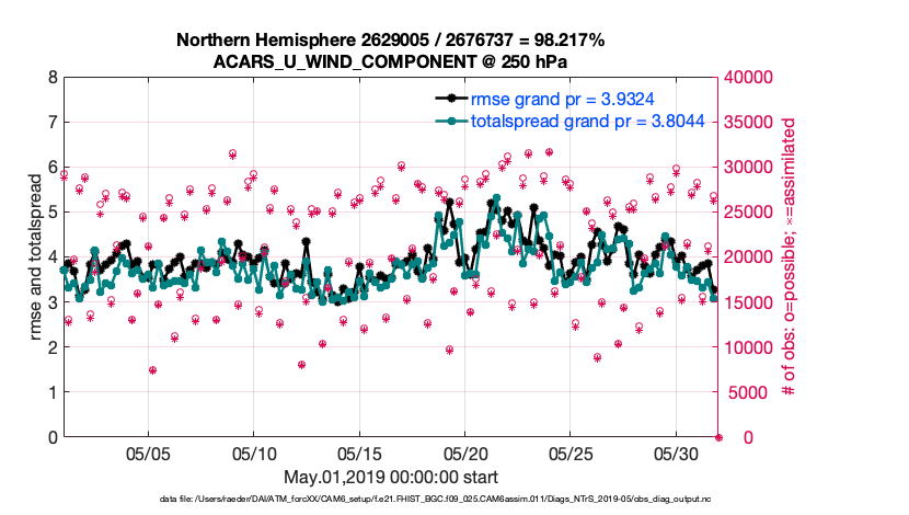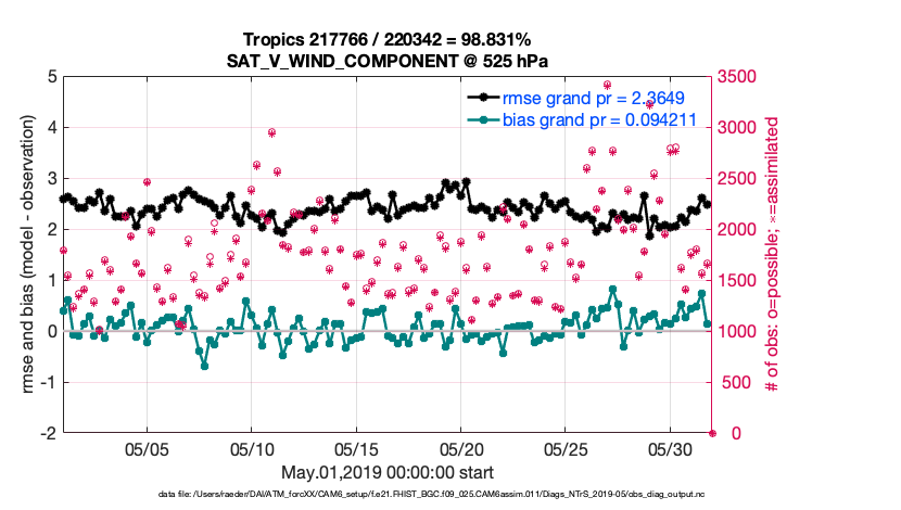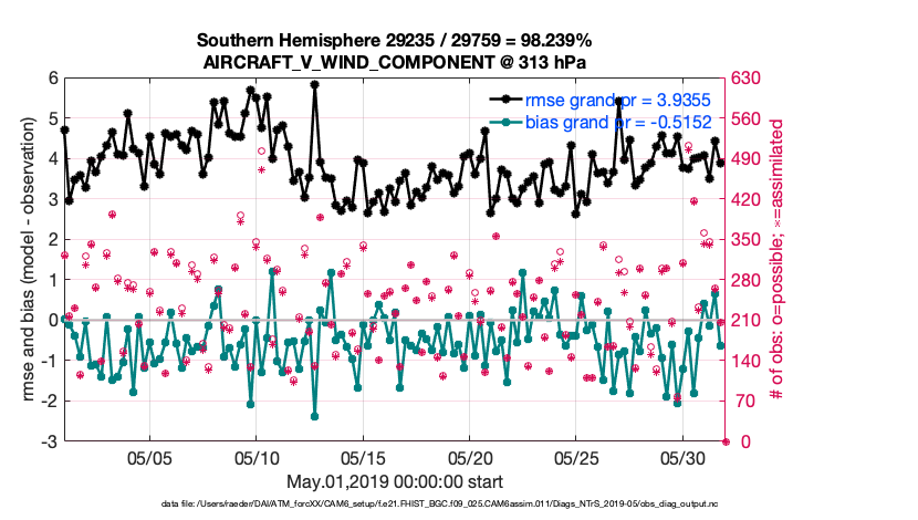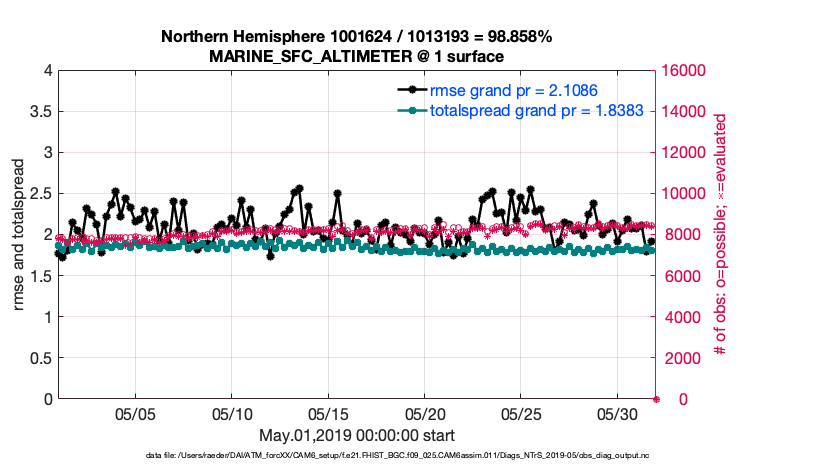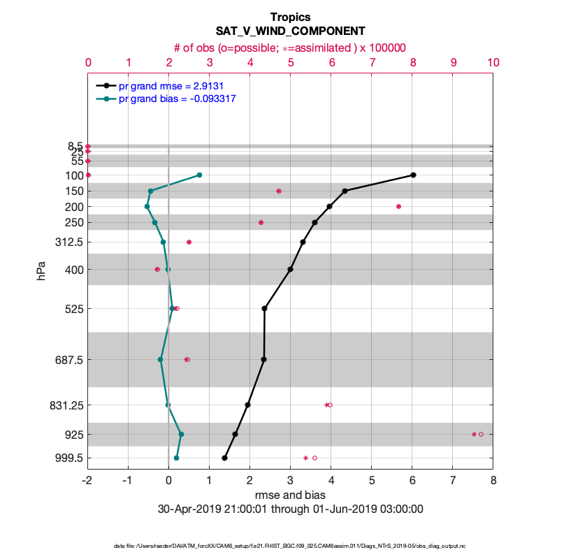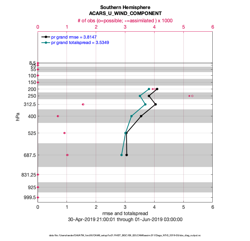For each observation kind, the root-mean-squared-error (RMSE) is plotted together with: (i) BIAS and (ii) TOTALSPREAD. The number of available, assimilated (evaluated) and rejected observations are also shown on the plots.