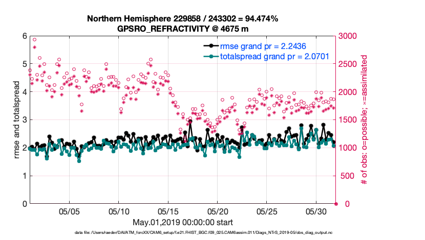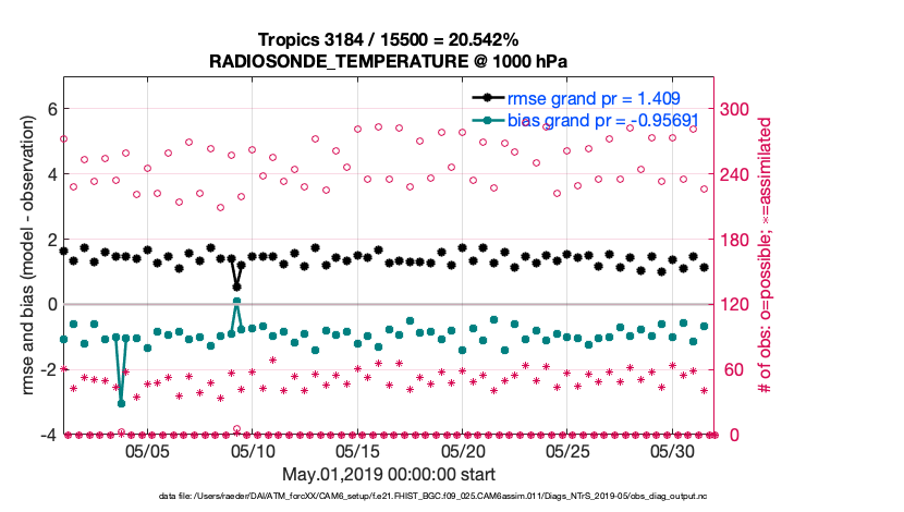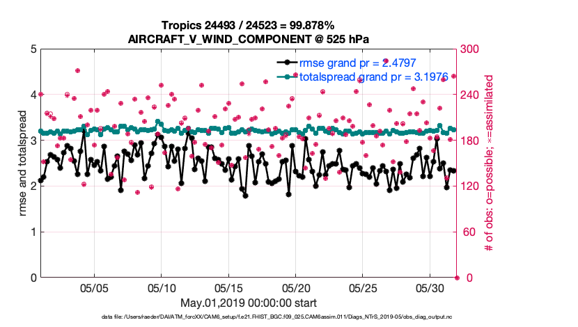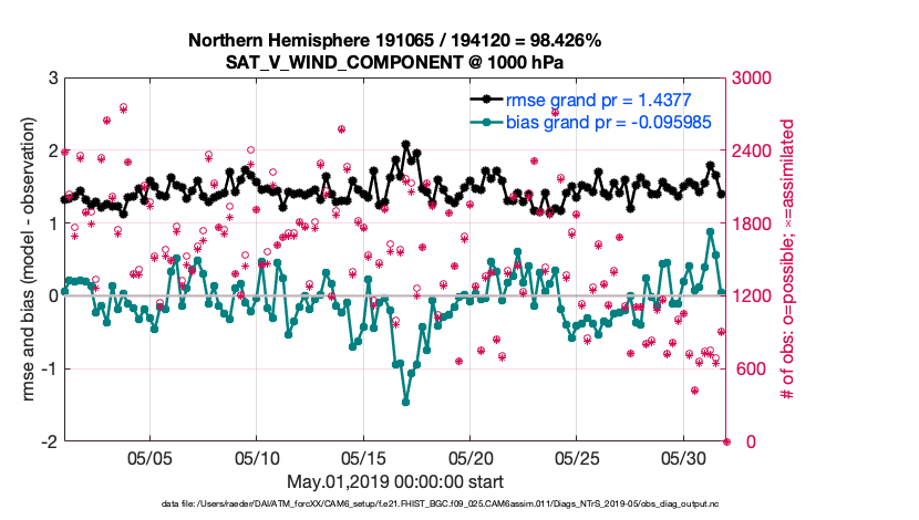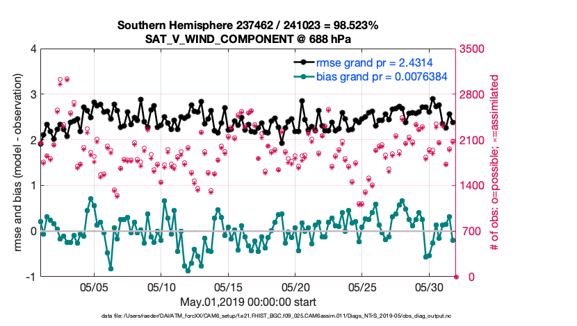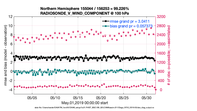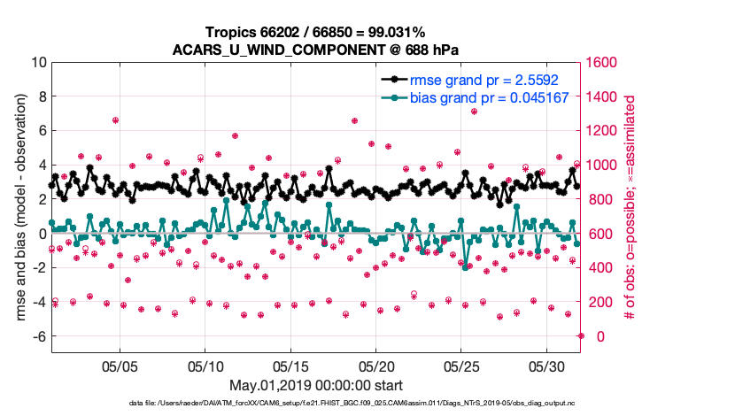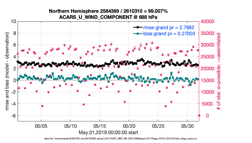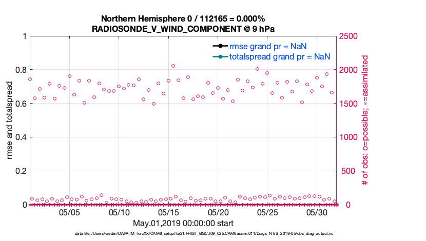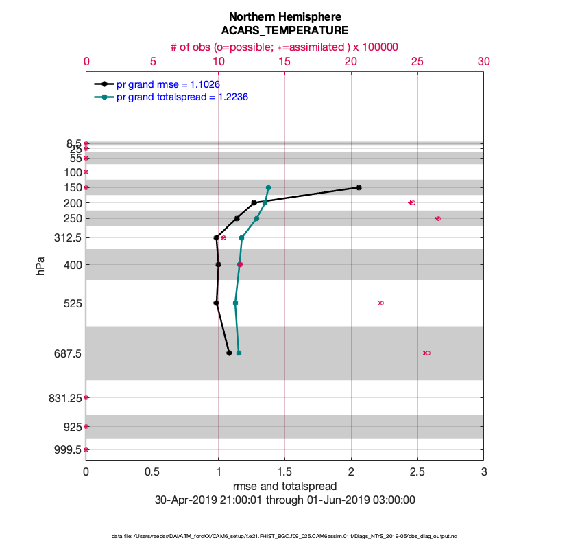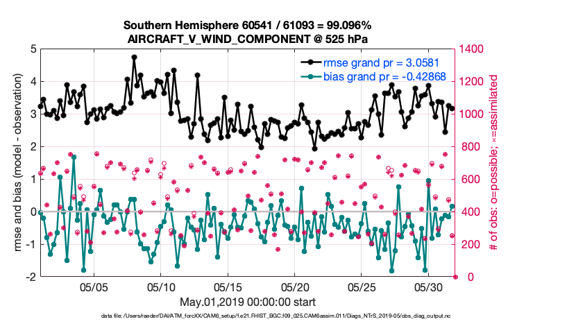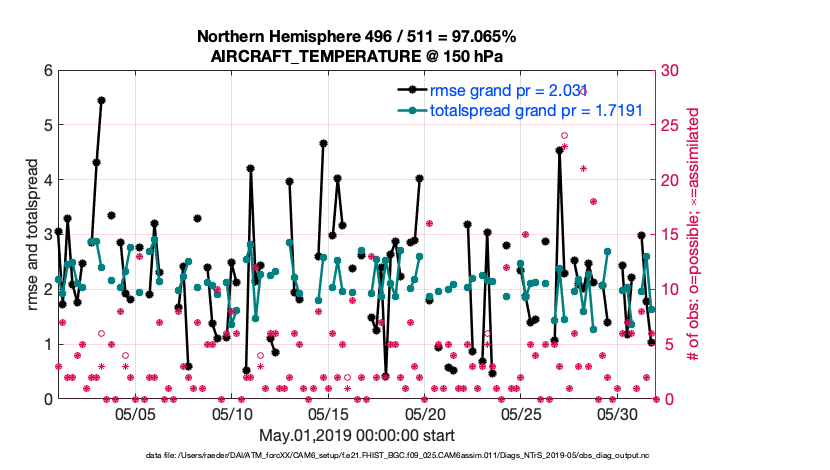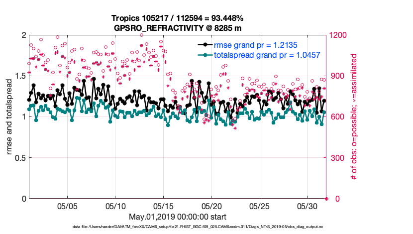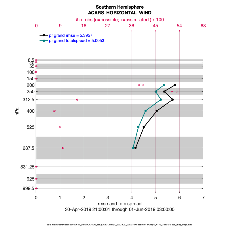 For each observation kind, the root-mean-squared-error (RMSE) is plotted together with: (i) BIAS and (ii) TOTALSPREAD. The number of available, assimilated (evaluated) and rejected observations are also shown on the plots.