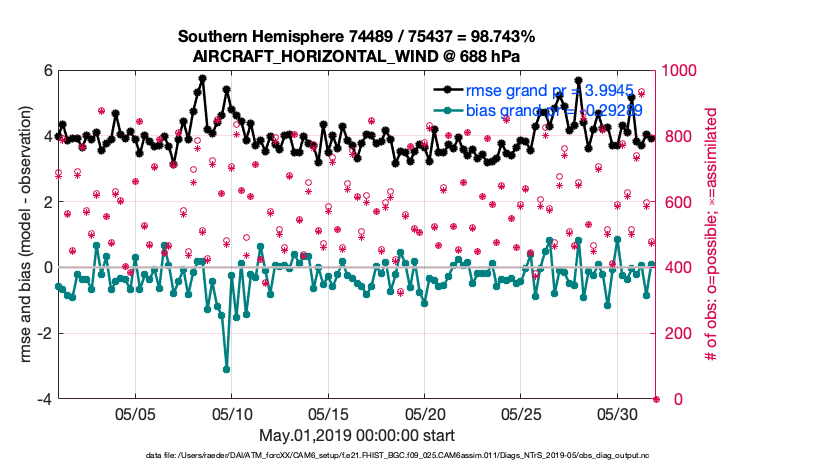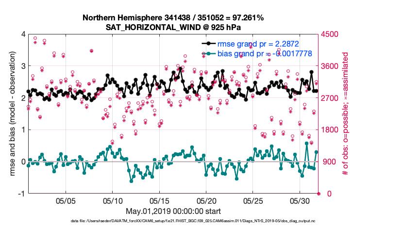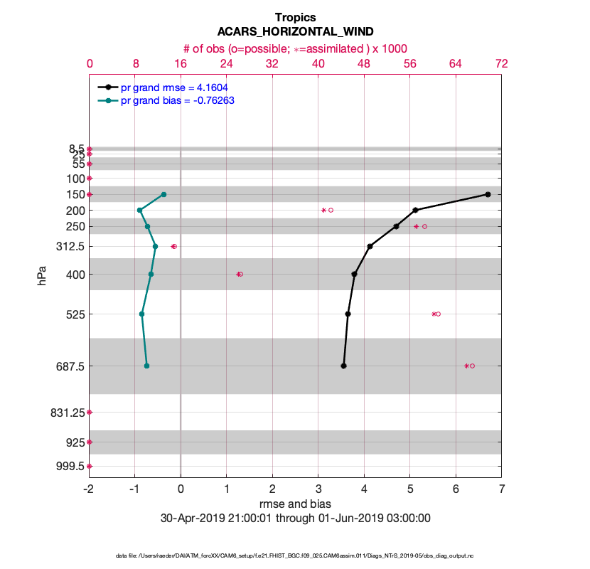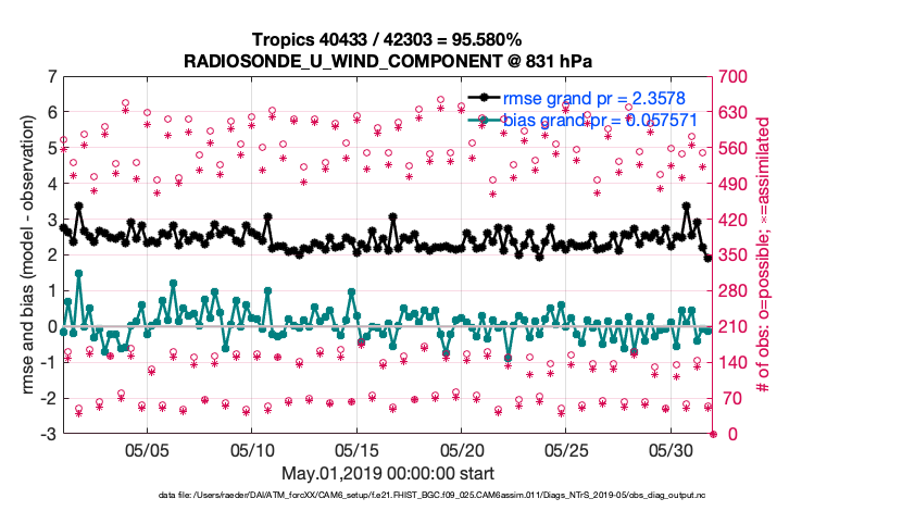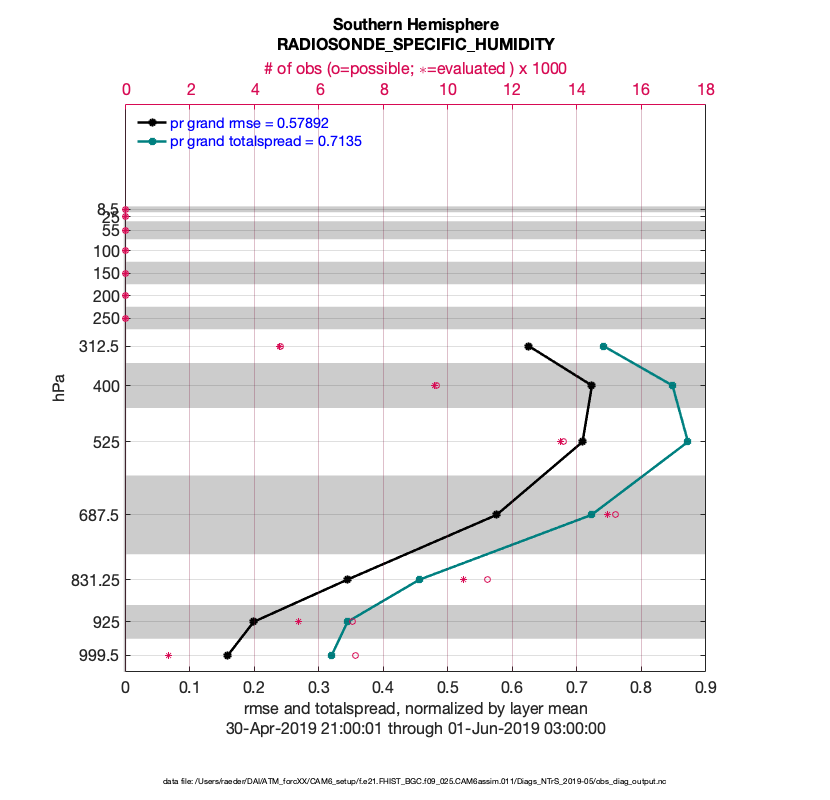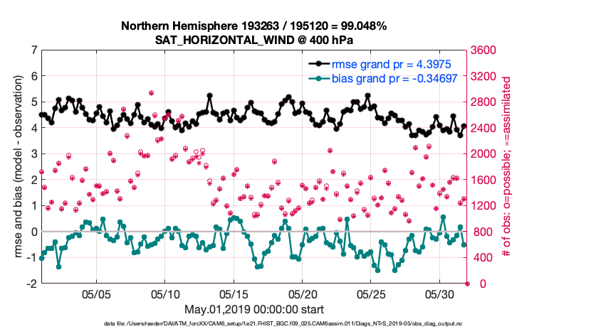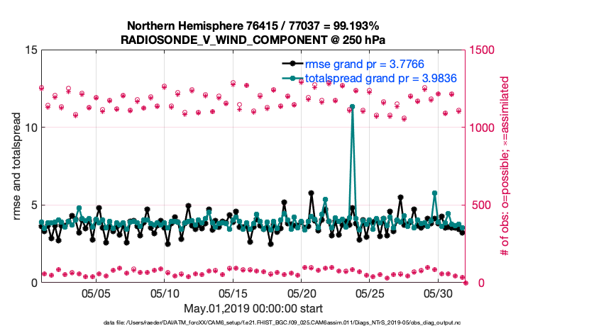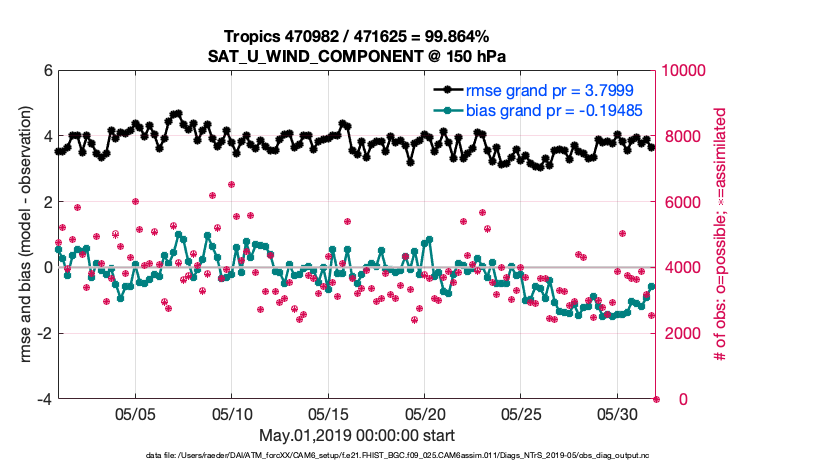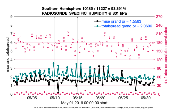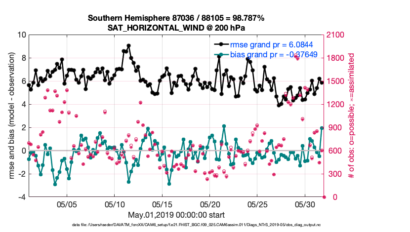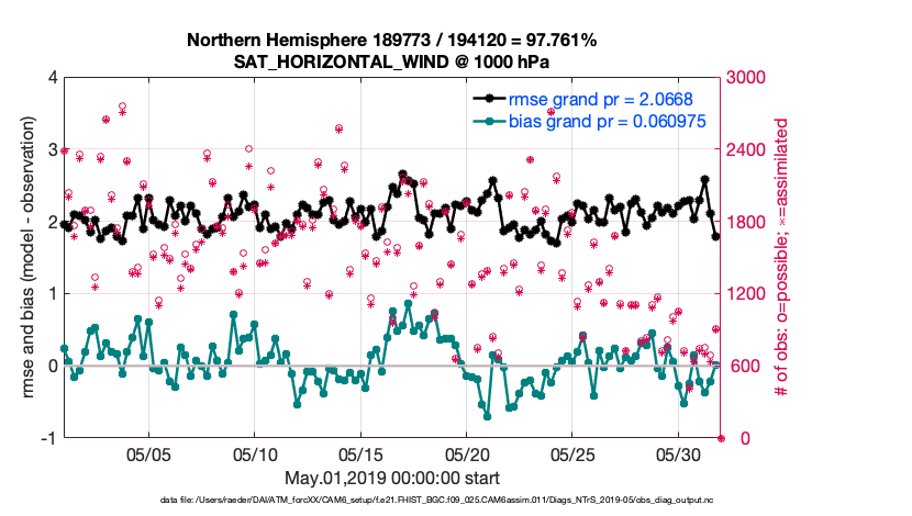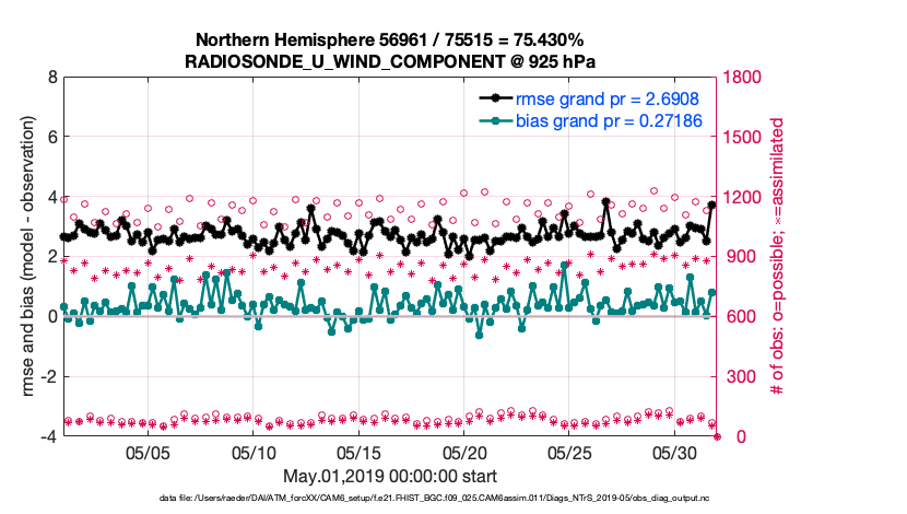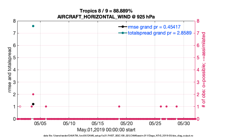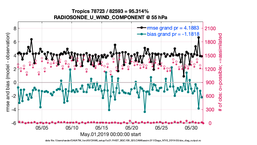 For each observation kind, the root-mean-squared-error (RMSE) is plotted together with: (i) BIAS and (ii) TOTALSPREAD. The number of available, assimilated (evaluated) and rejected observations are also shown on the plots.