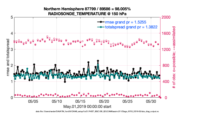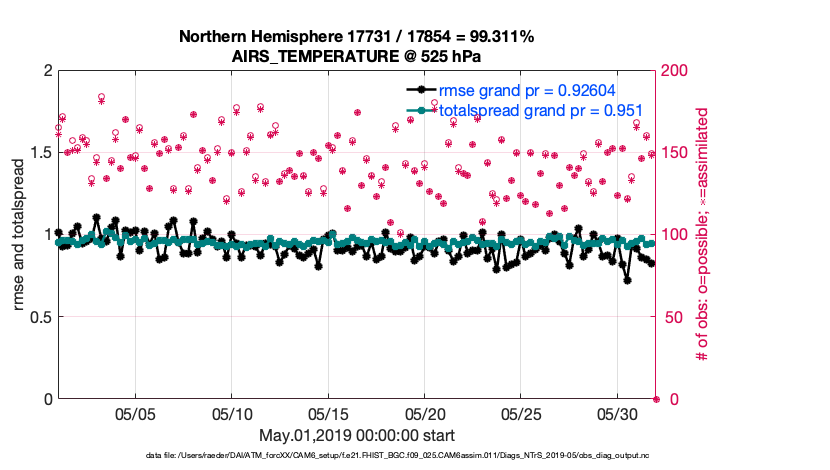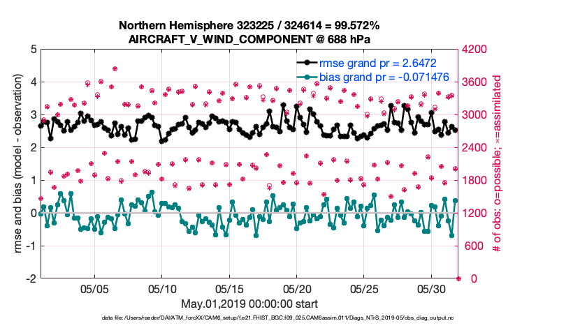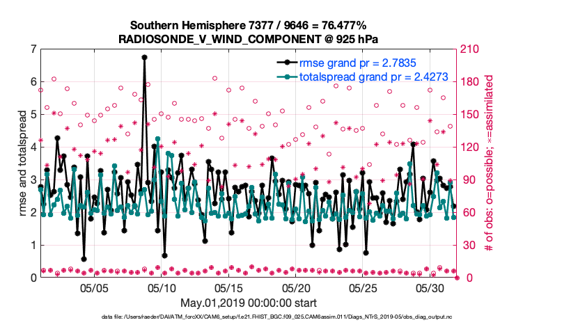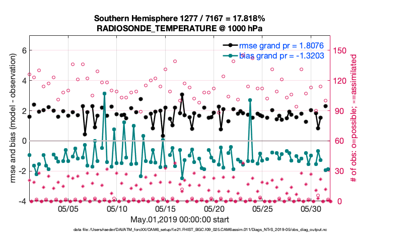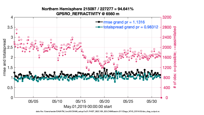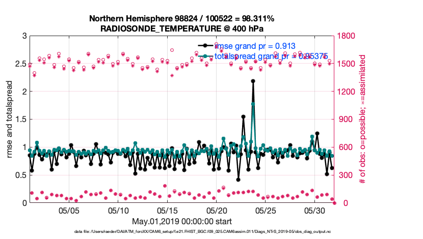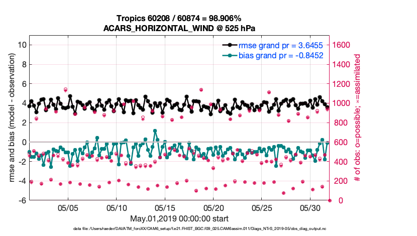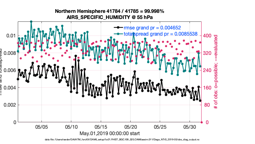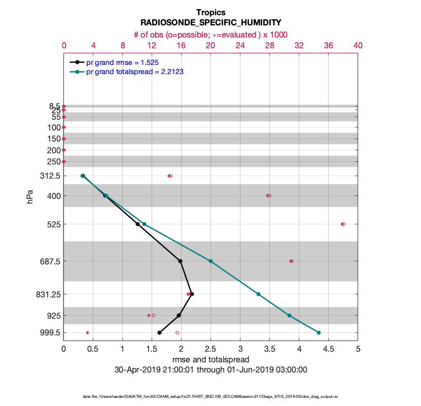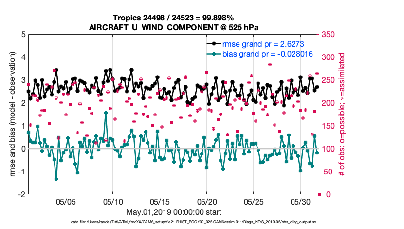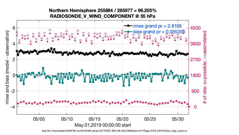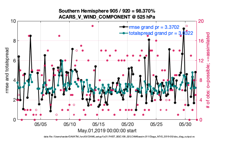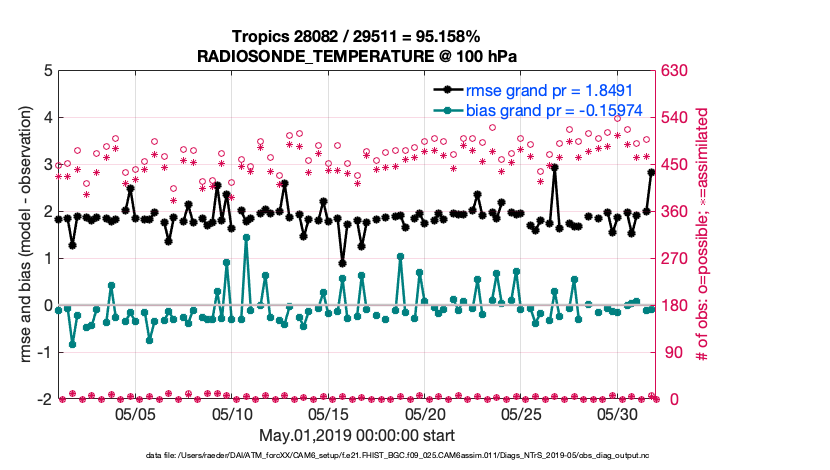 For each observation kind, the root-mean-squared-error (RMSE) is plotted together with: (i) BIAS and (ii) TOTALSPREAD. The number of available, assimilated (evaluated) and rejected observations are also shown on the plots.