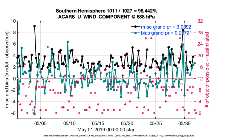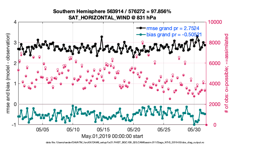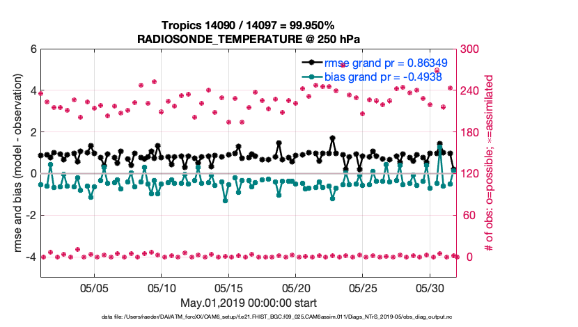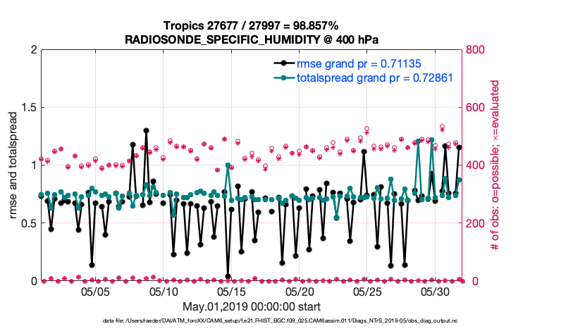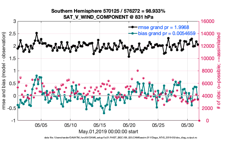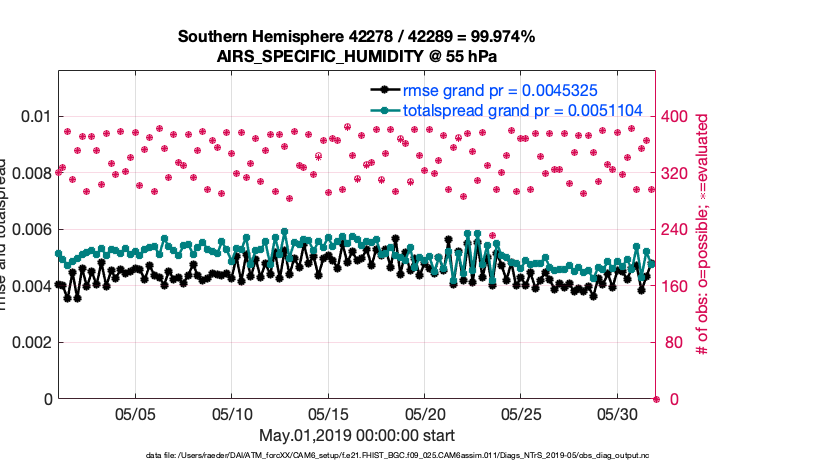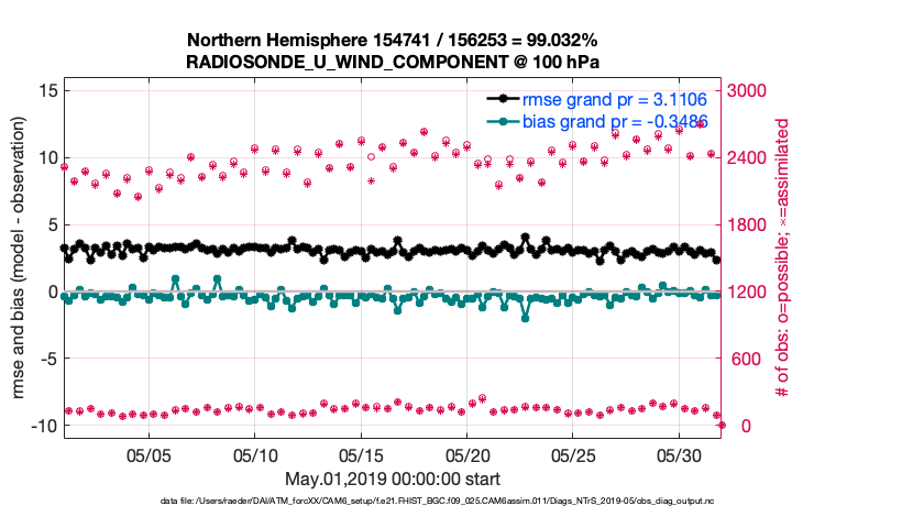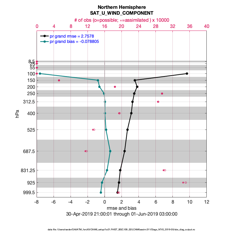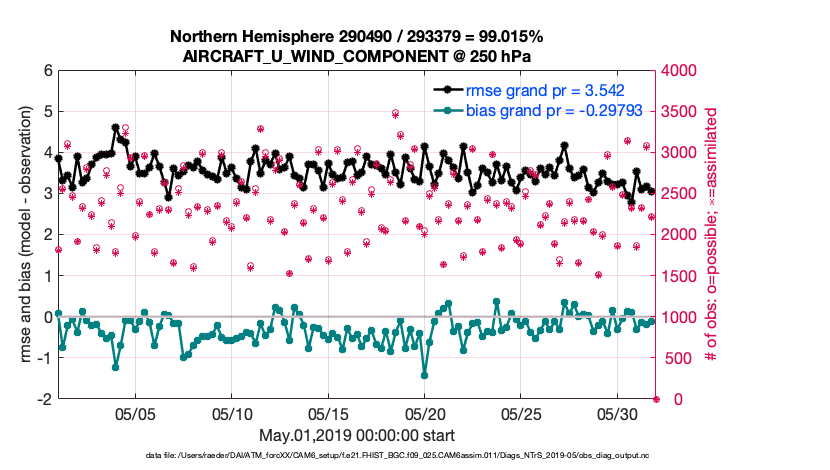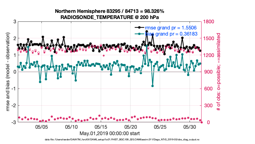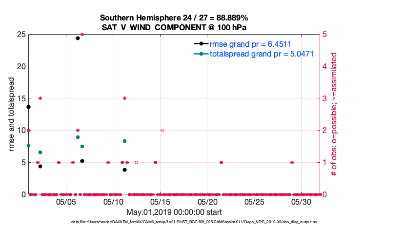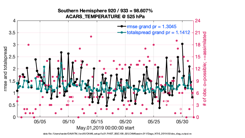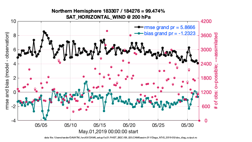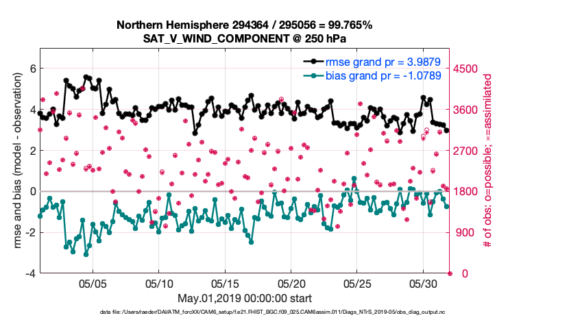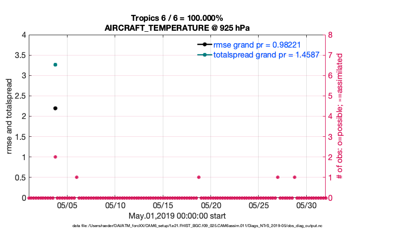 For each observation kind, the root-mean-squared-error (RMSE) is plotted together with: (i) BIAS and (ii) TOTALSPREAD. The number of available, assimilated (evaluated) and rejected observations are also shown on the plots.