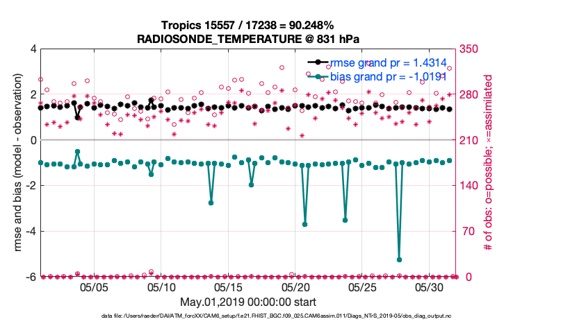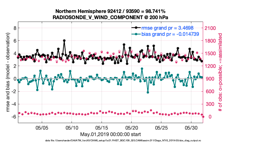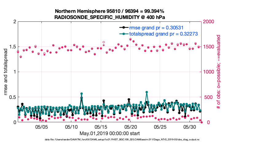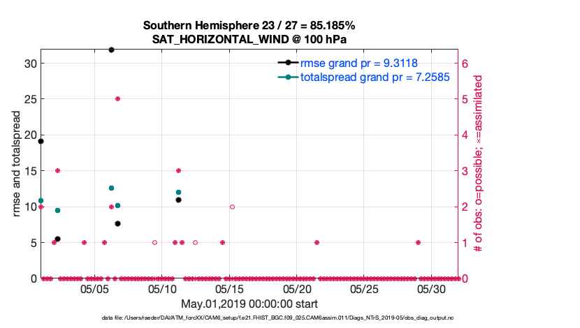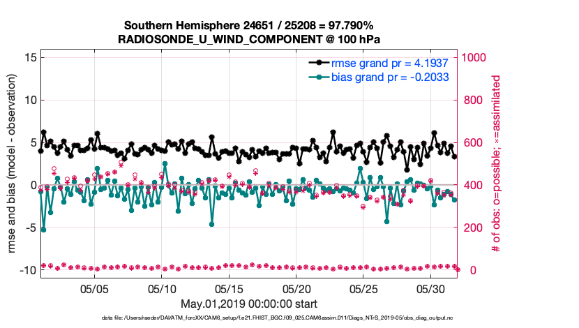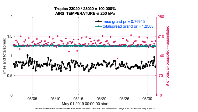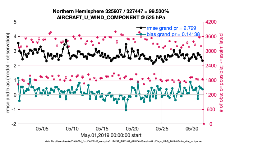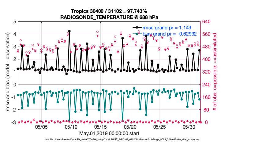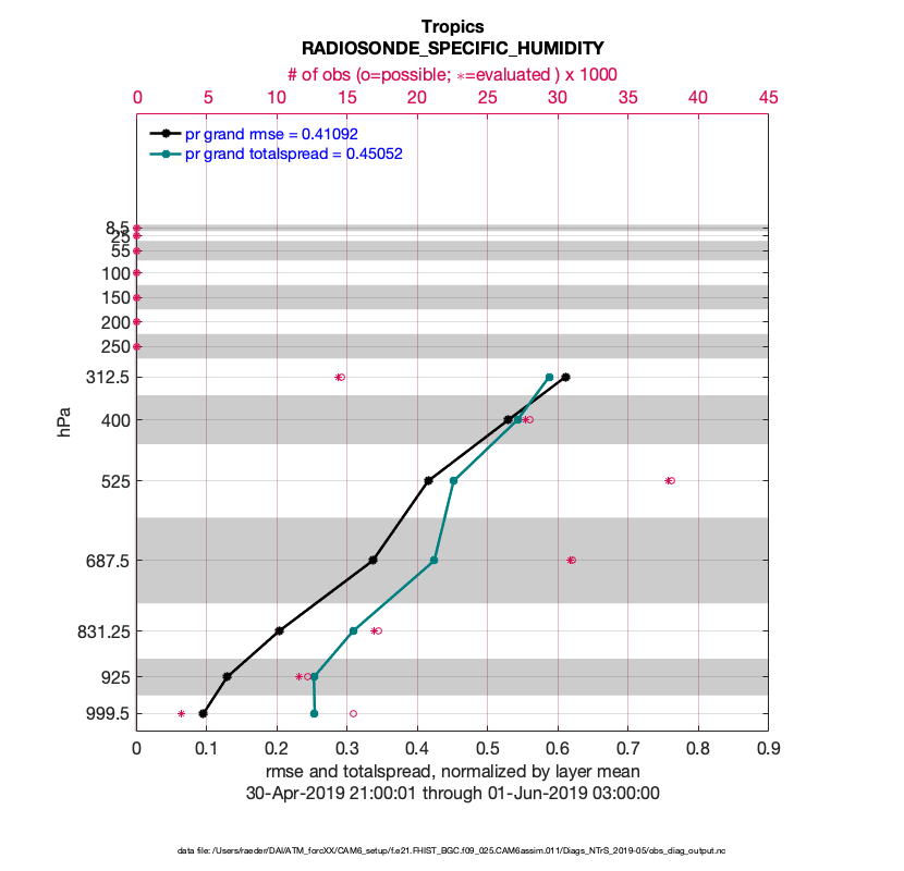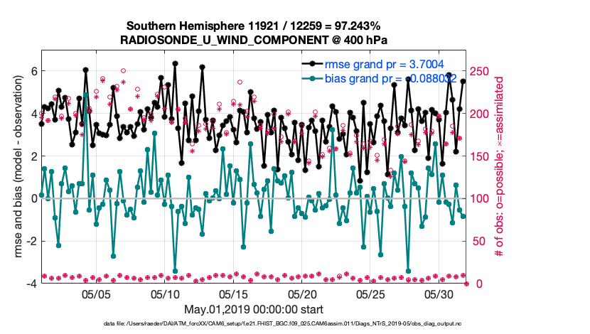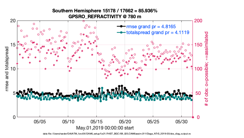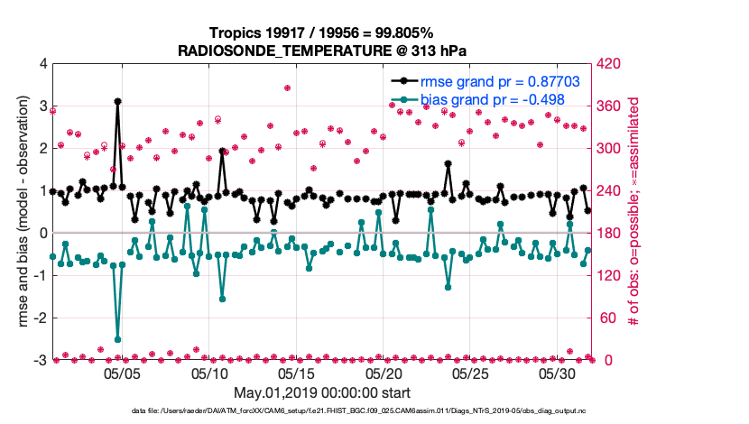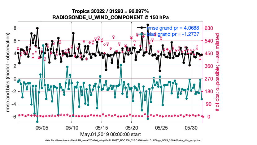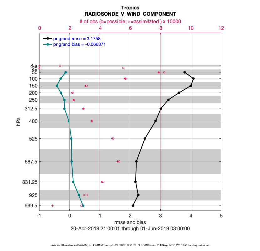 For each observation kind, the root-mean-squared-error (RMSE) is plotted together with: (i) BIAS and (ii) TOTALSPREAD. The number of available, assimilated (evaluated) and rejected observations are also shown on the plots.