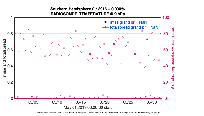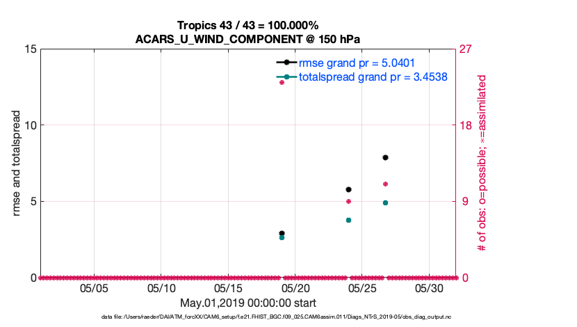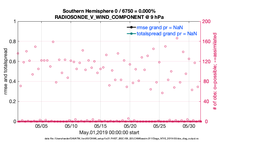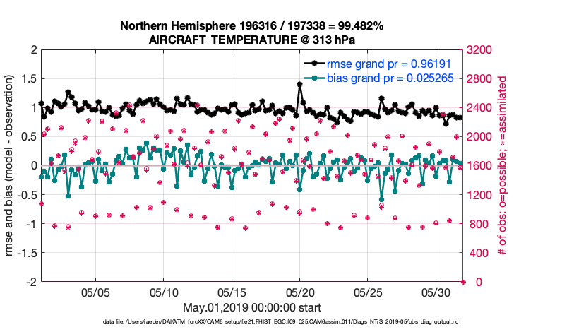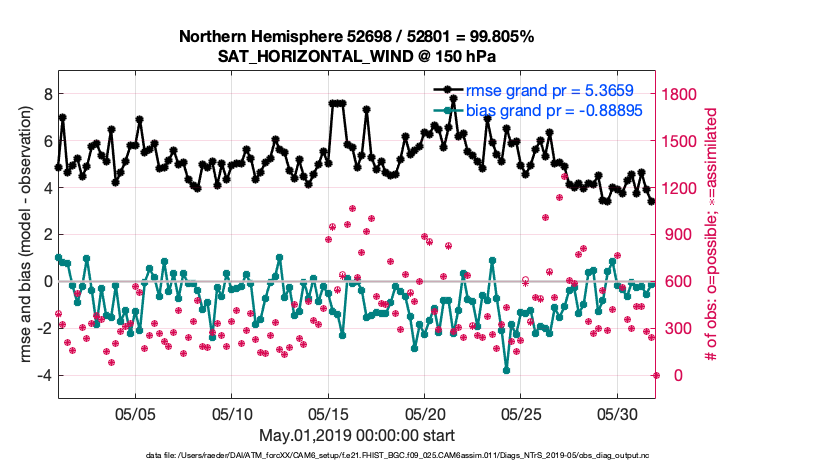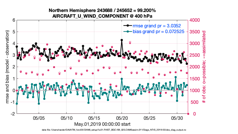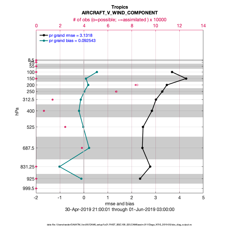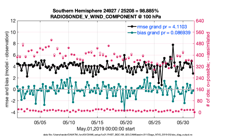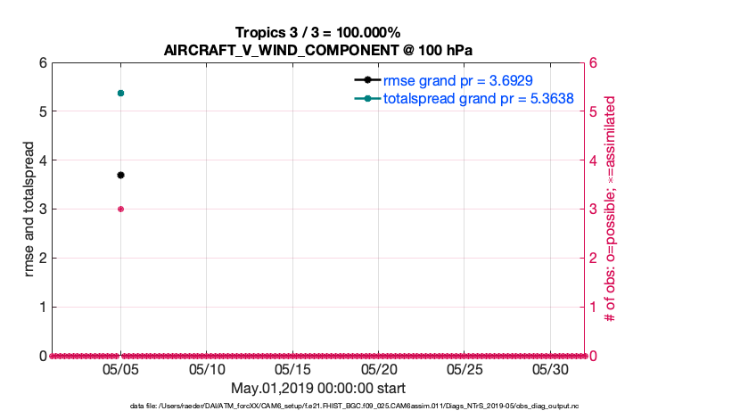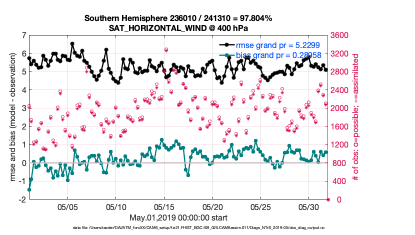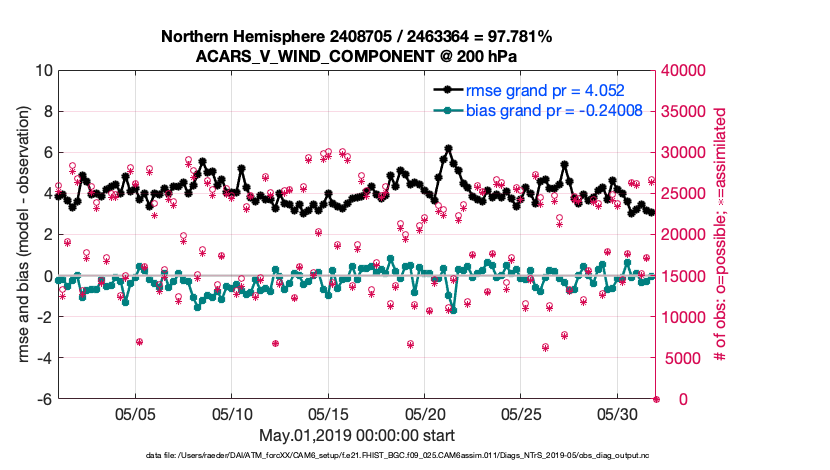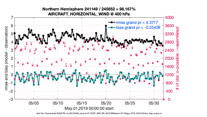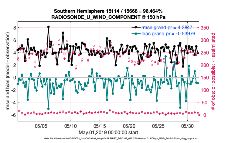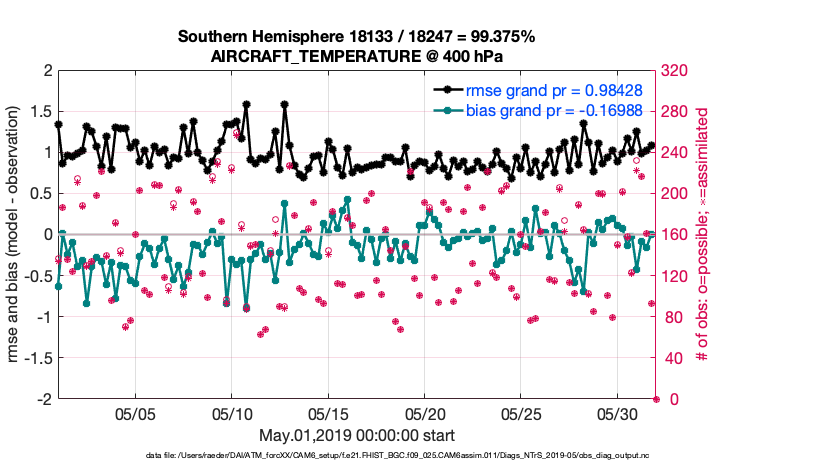 For each observation kind, the root-mean-squared-error (RMSE) is plotted together with: (i) BIAS and (ii) TOTALSPREAD. The number of available, assimilated (evaluated) and rejected observations are also shown on the plots.