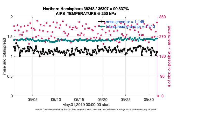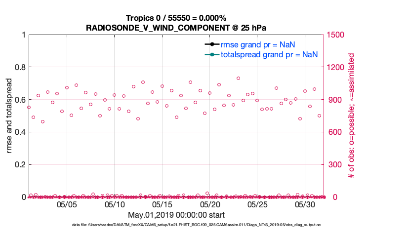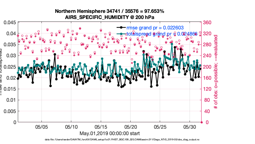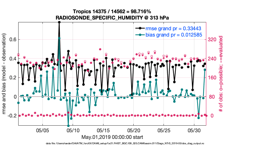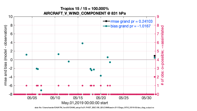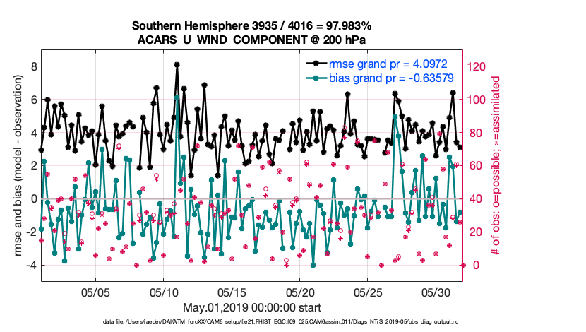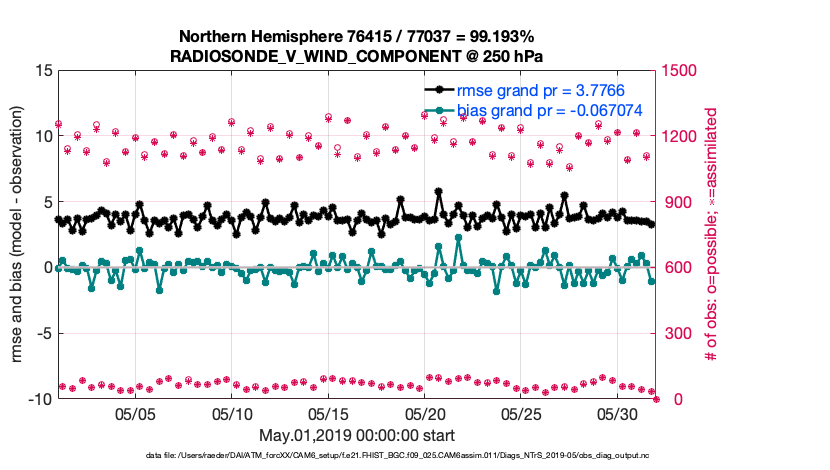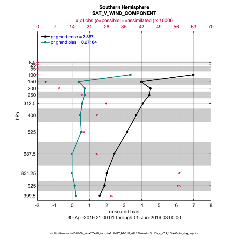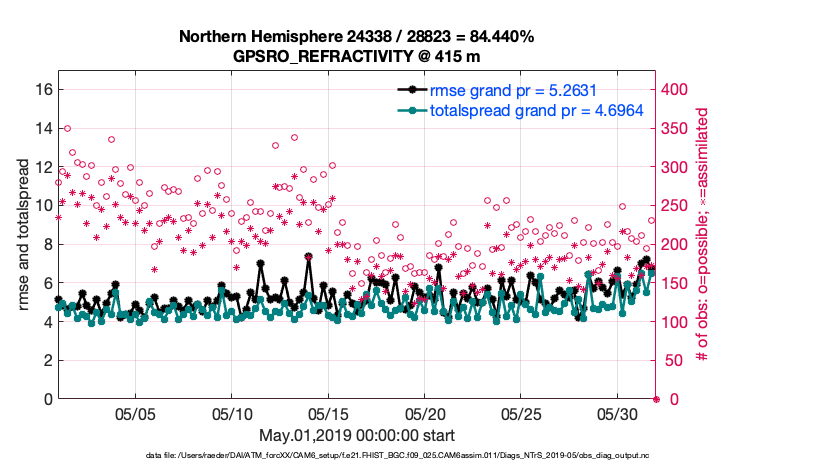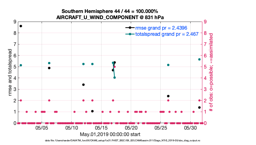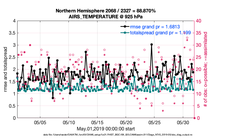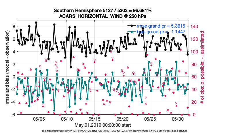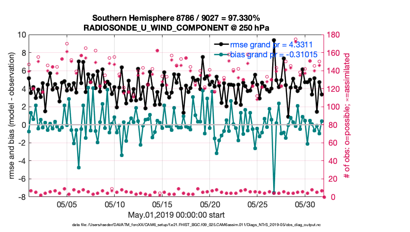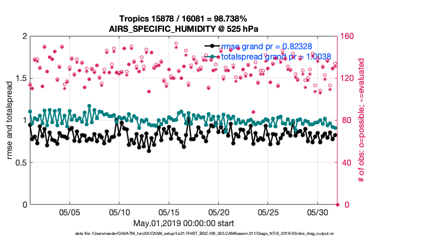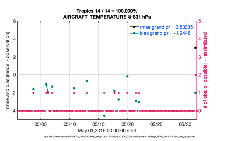 For each observation kind, the root-mean-squared-error (RMSE) is plotted together with: (i) BIAS and (ii) TOTALSPREAD. The number of available, assimilated (evaluated) and rejected observations are also shown on the plots.