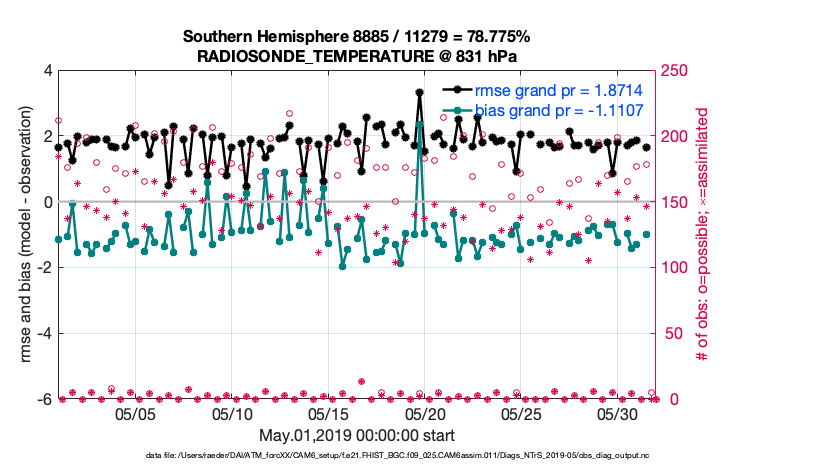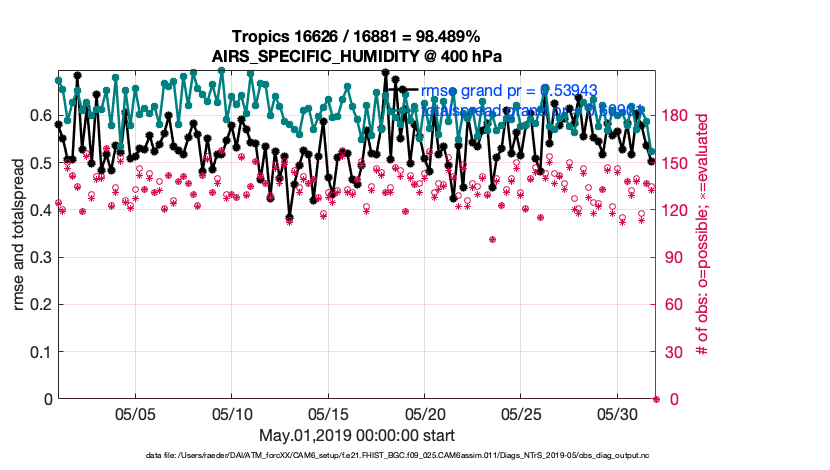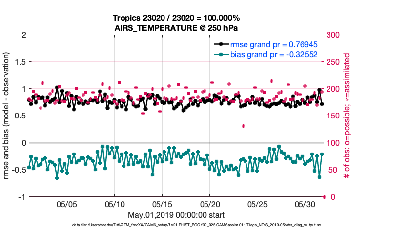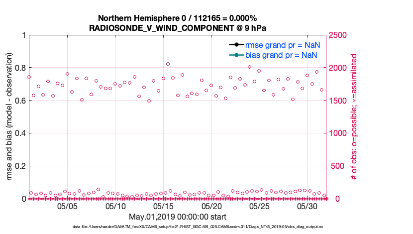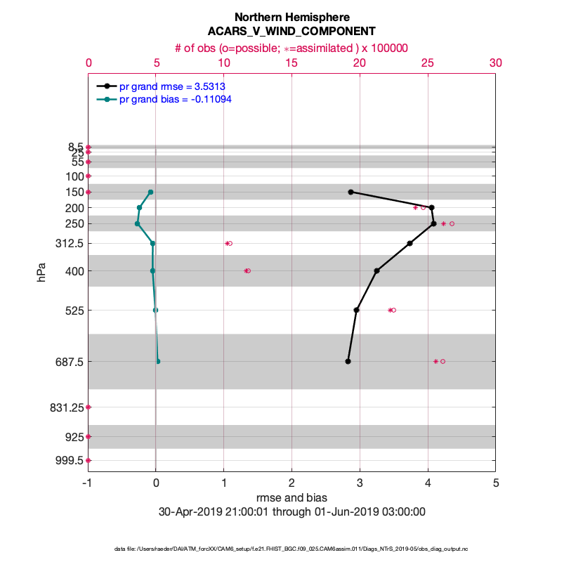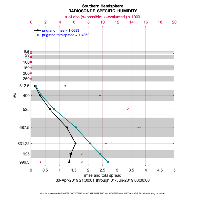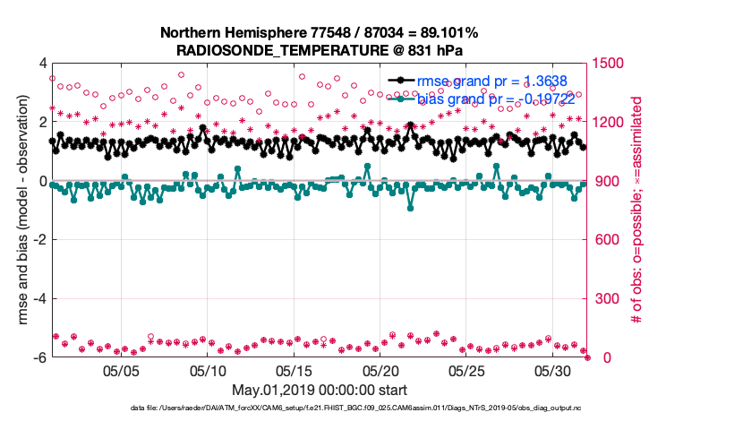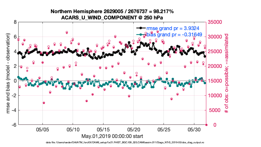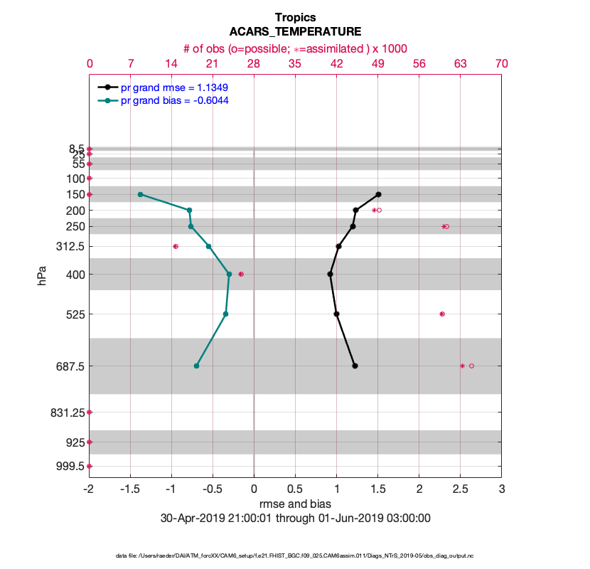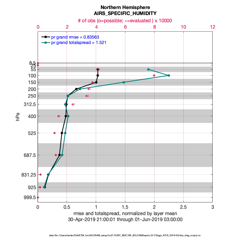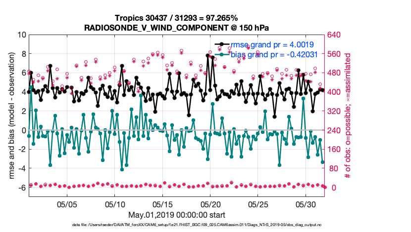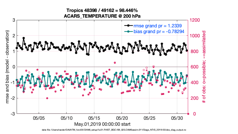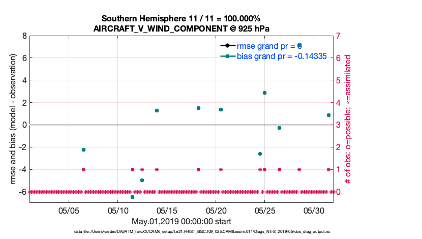 For each observation kind, the root-mean-squared-error (RMSE) is plotted together with: (i) BIAS and (ii) TOTALSPREAD. The number of available, assimilated (evaluated) and rejected observations are also shown on the plots.