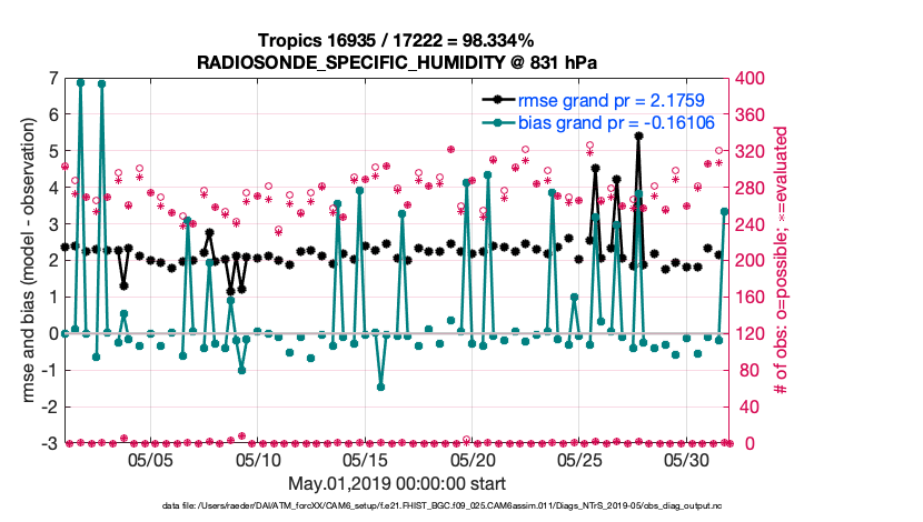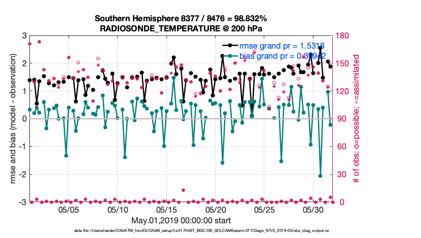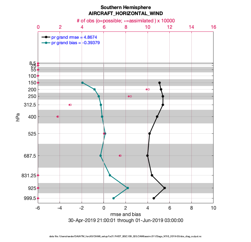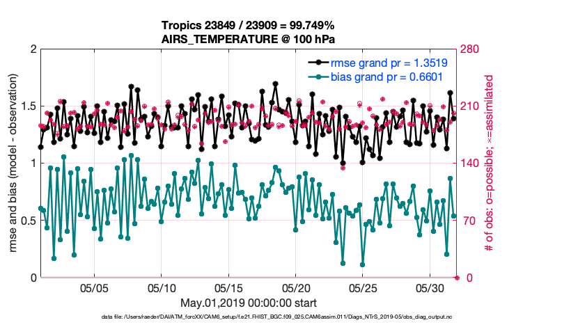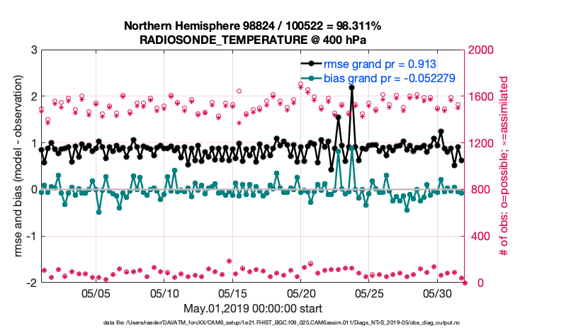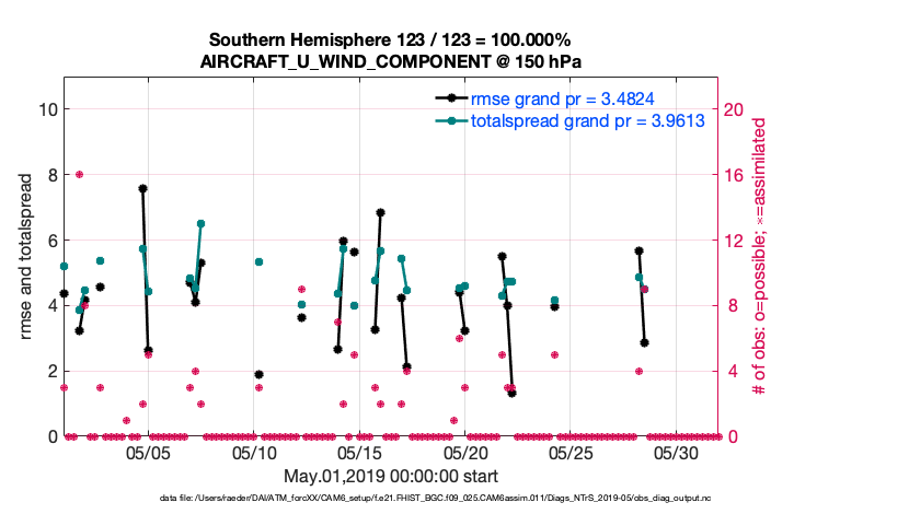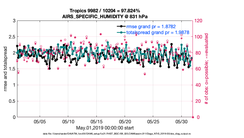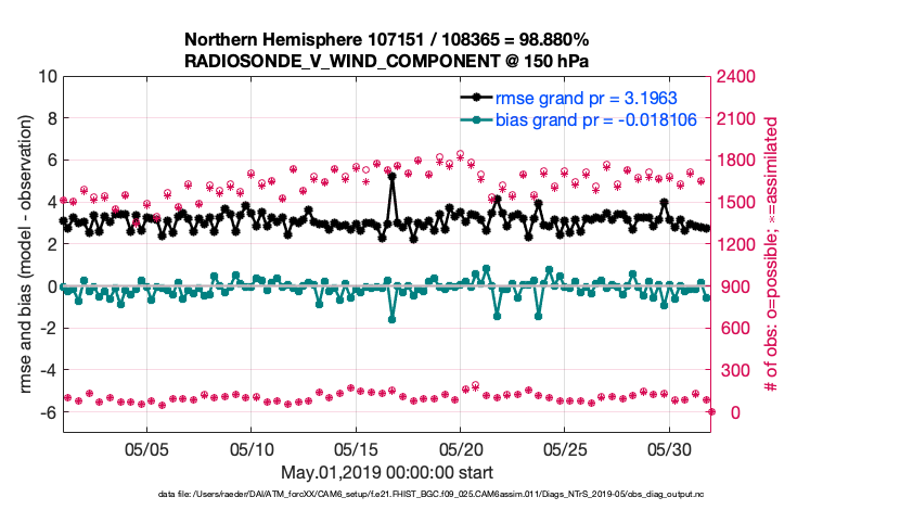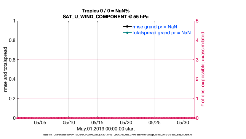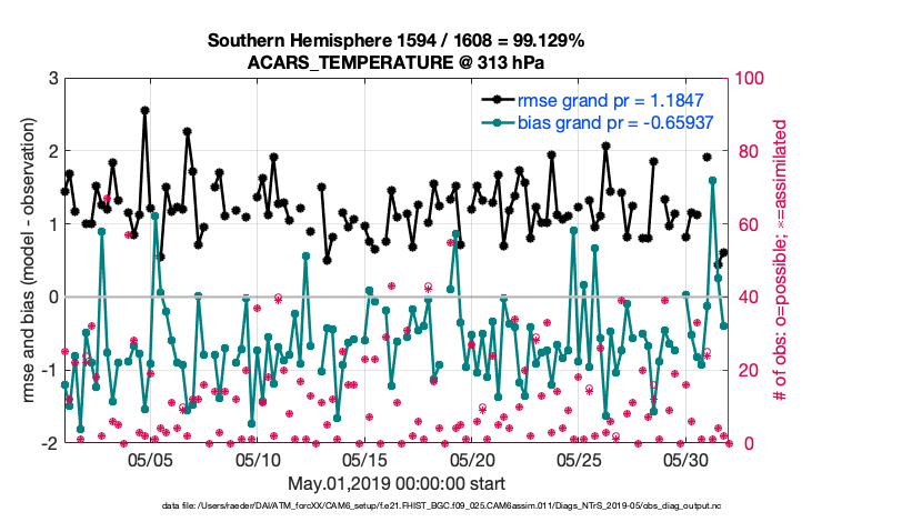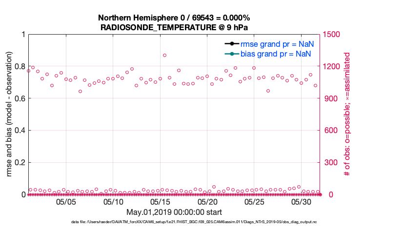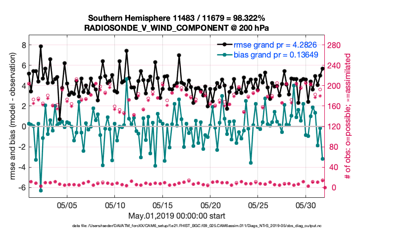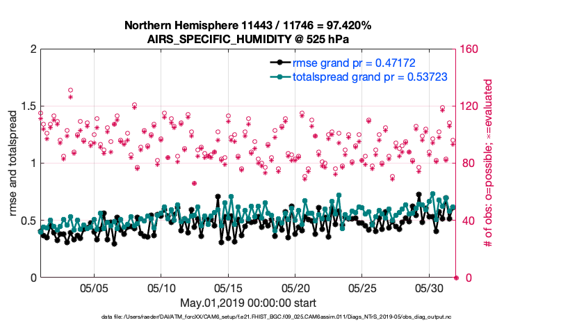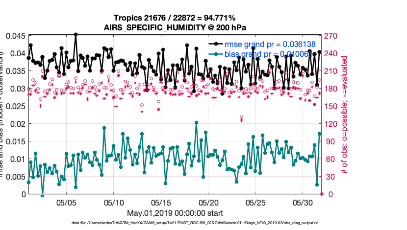 For each observation kind, the root-mean-squared-error (RMSE) is plotted together with: (i) BIAS and (ii) TOTALSPREAD. The number of available, assimilated (evaluated) and rejected observations are also shown on the plots.