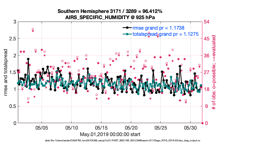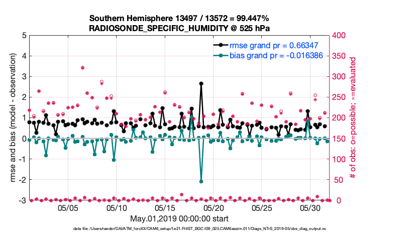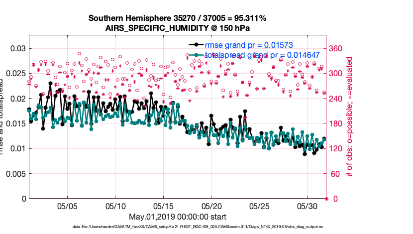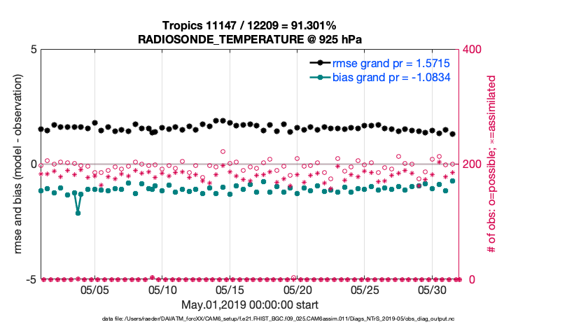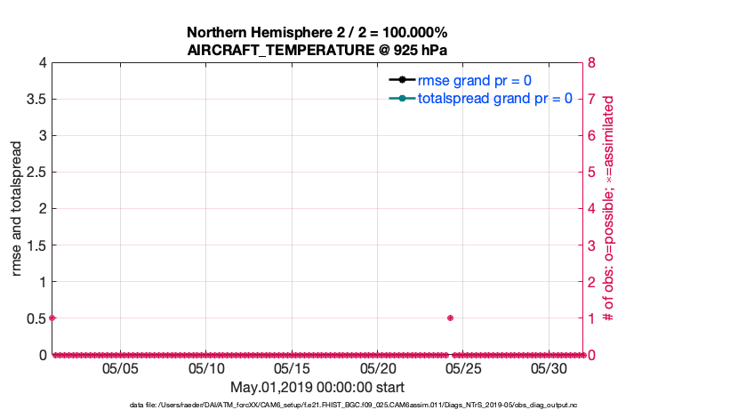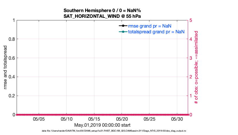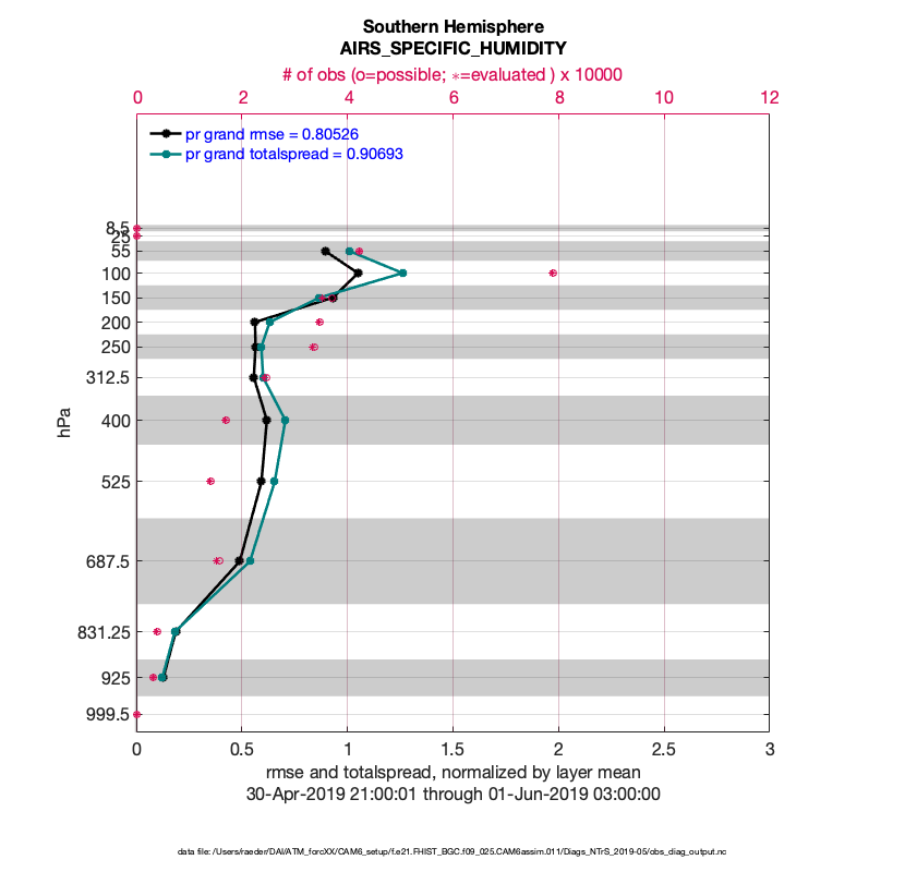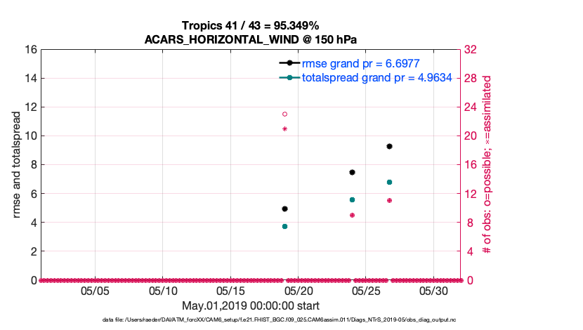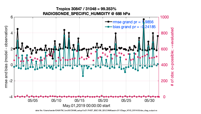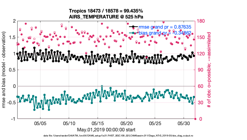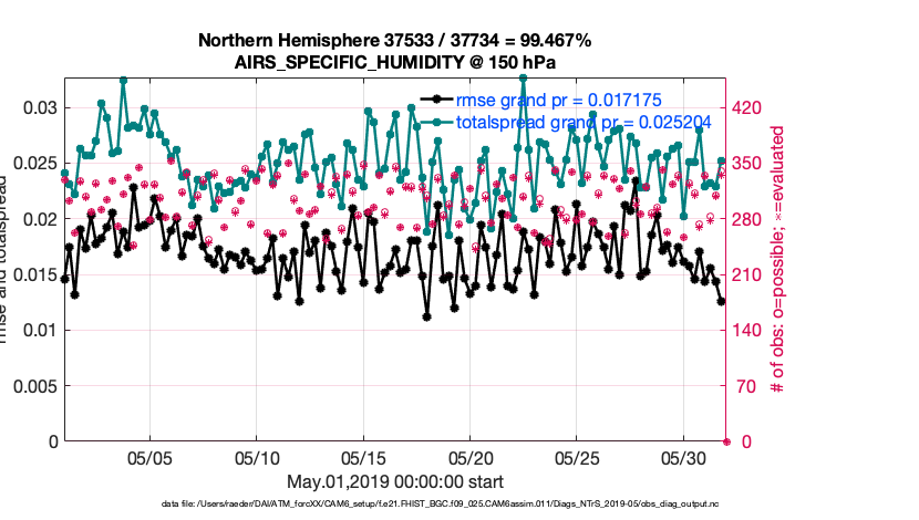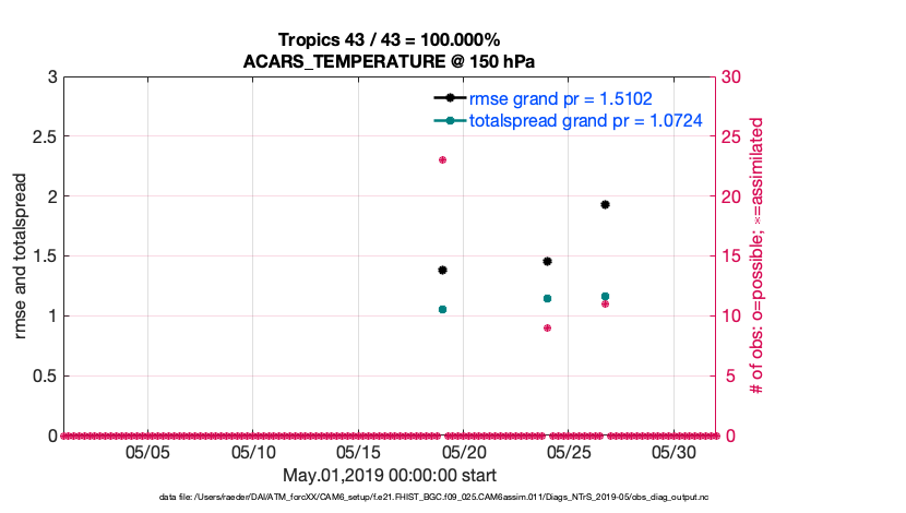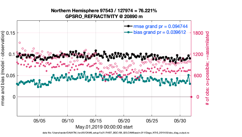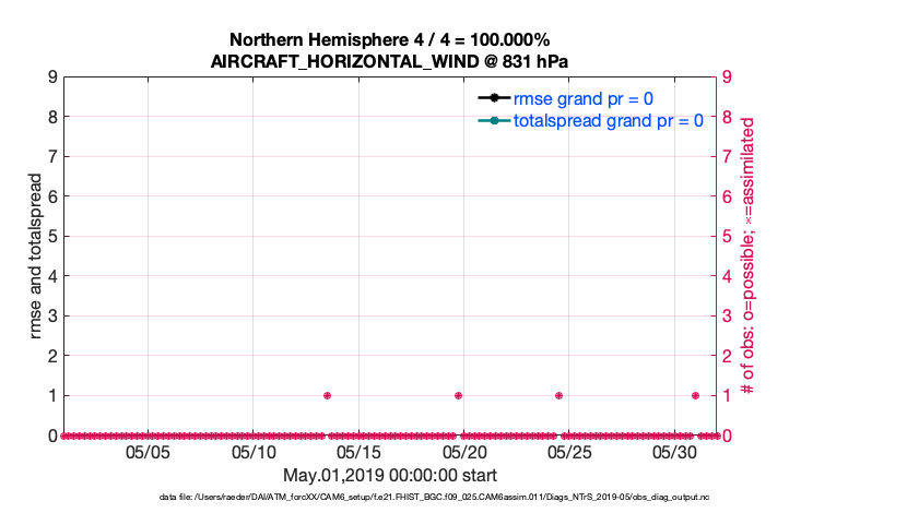 For each observation kind, the root-mean-squared-error (RMSE) is plotted together with: (i) BIAS and (ii) TOTALSPREAD. The number of available, assimilated (evaluated) and rejected observations are also shown on the plots.