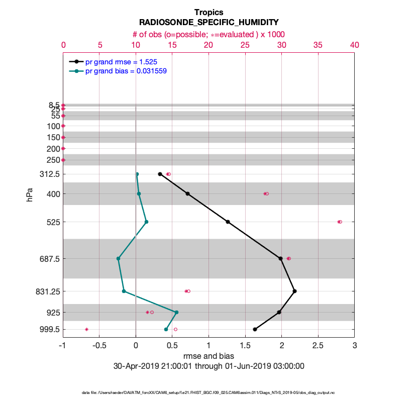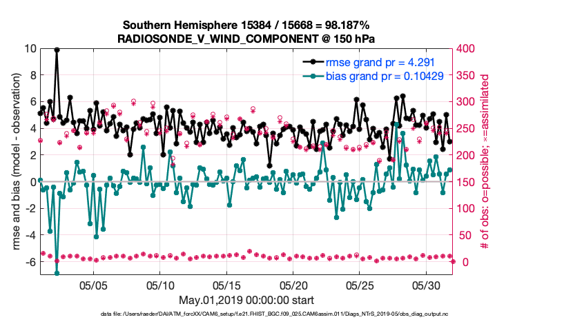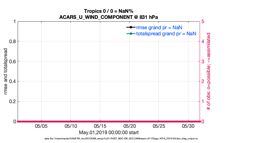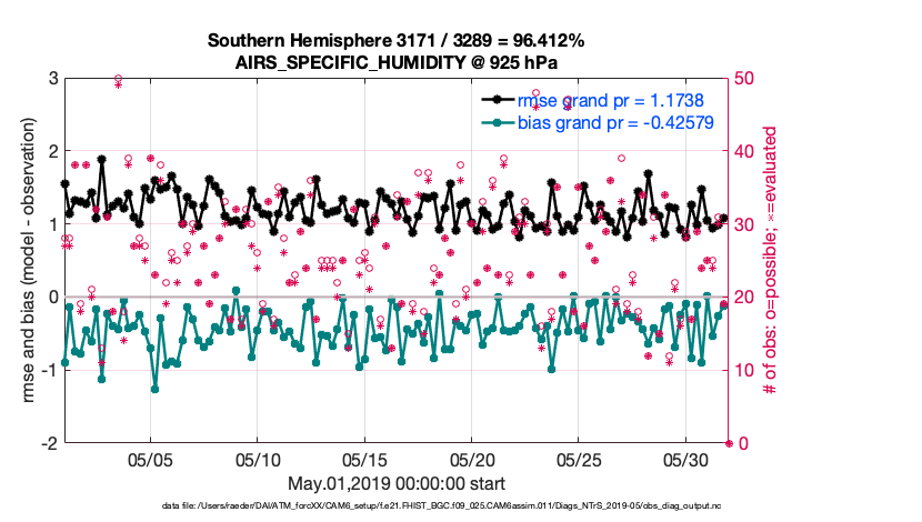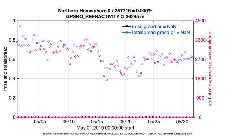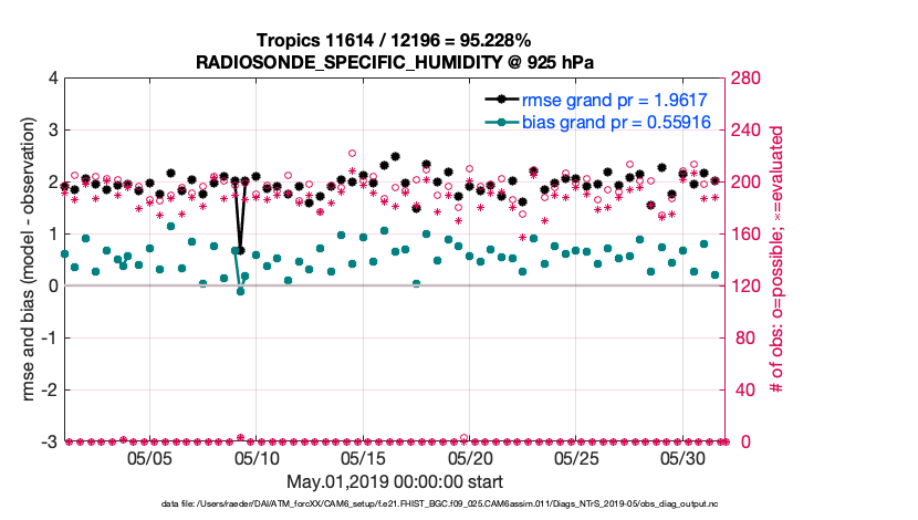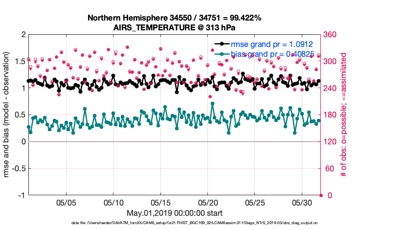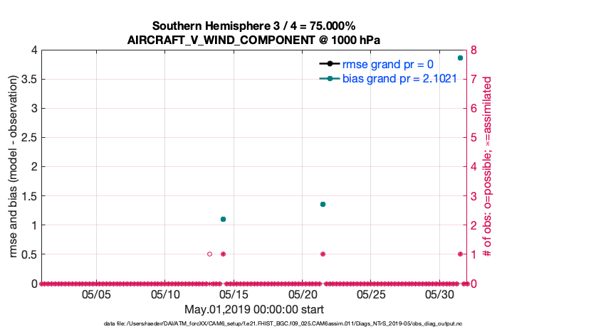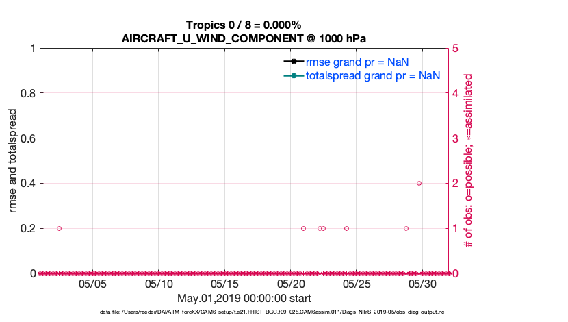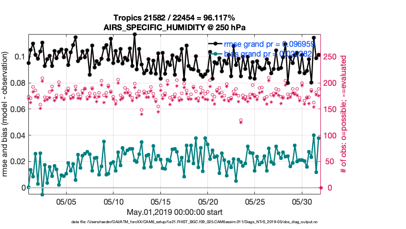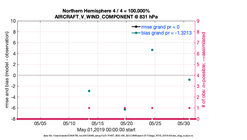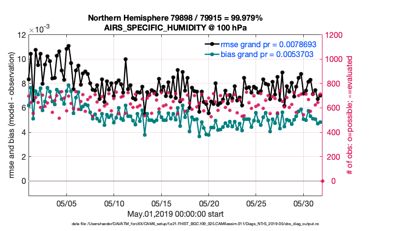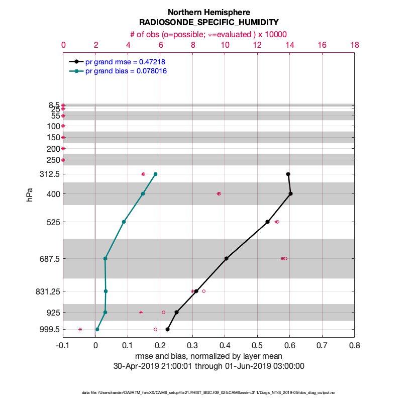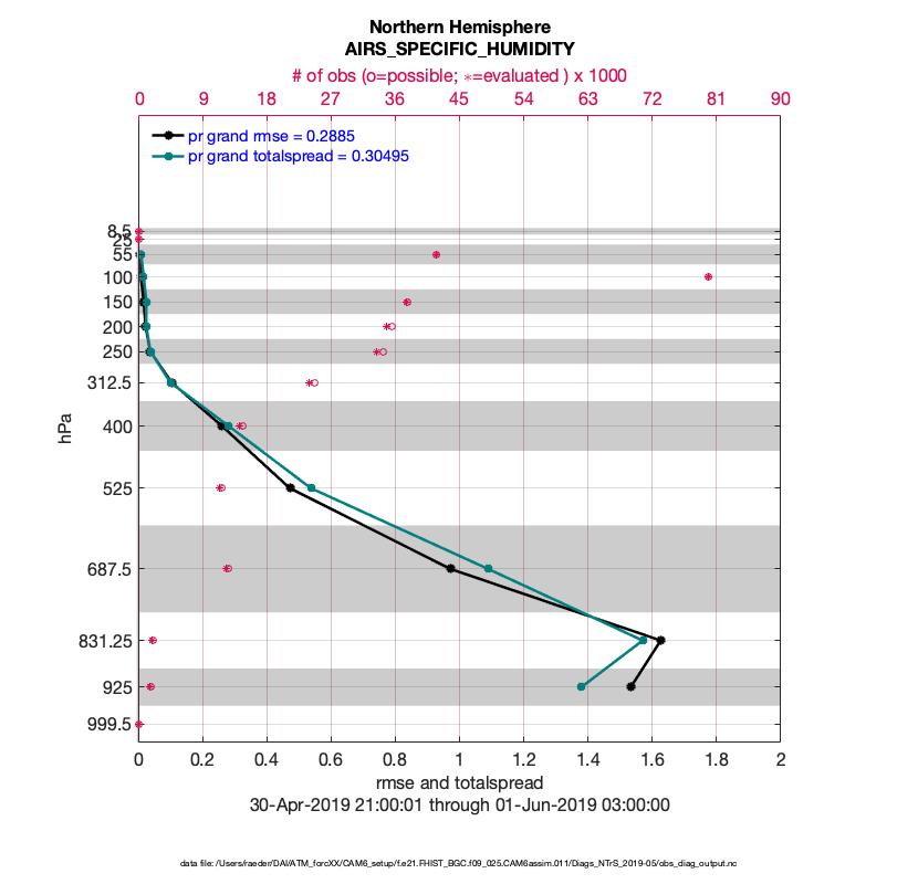 For each observation kind, the root-mean-squared-error (RMSE) is plotted together with: (i) BIAS and (ii) TOTALSPREAD. The number of available, assimilated (evaluated) and rejected observations are also shown on the plots.