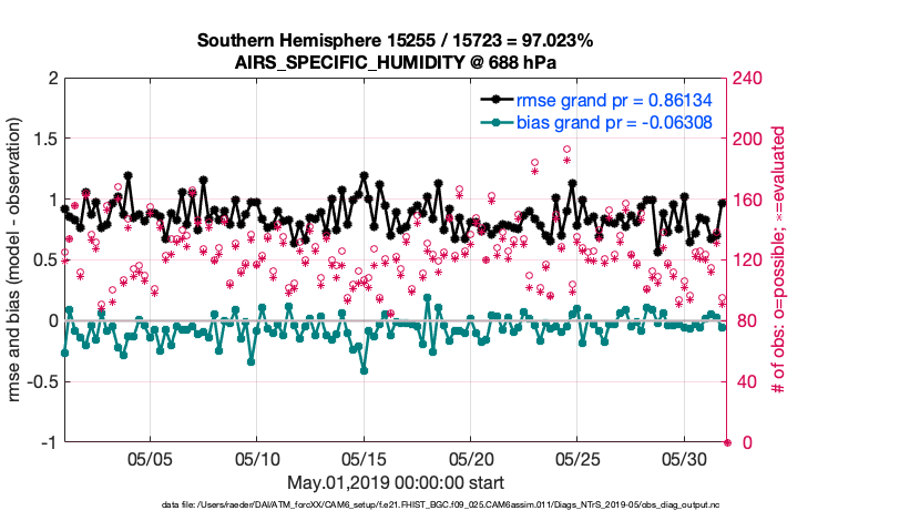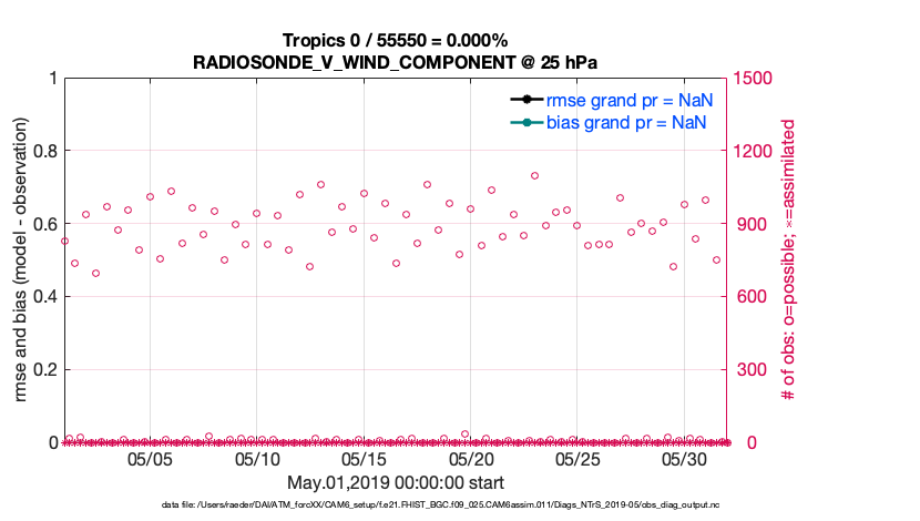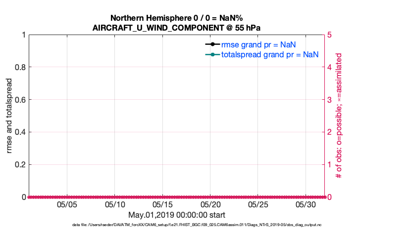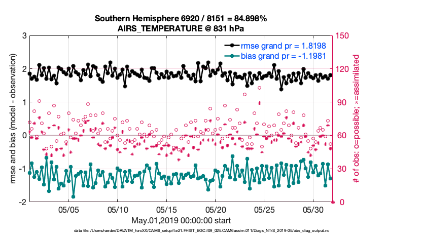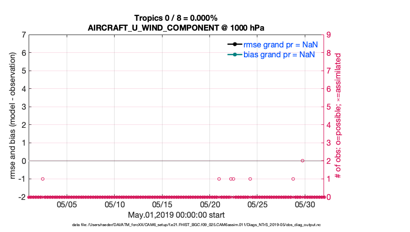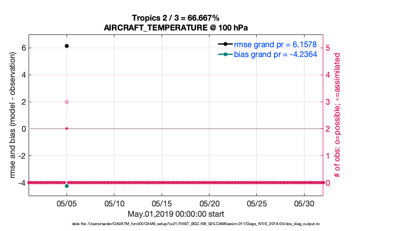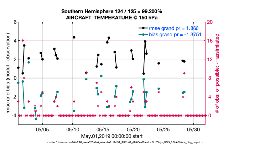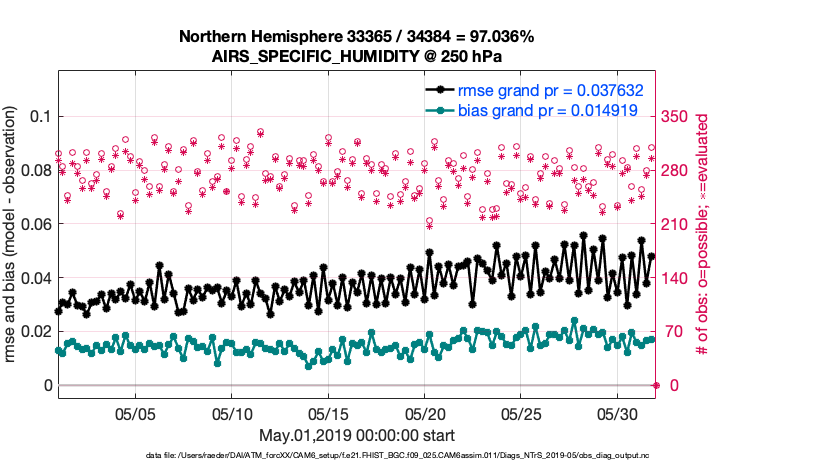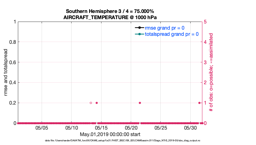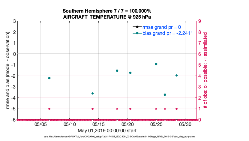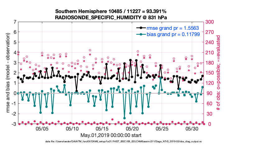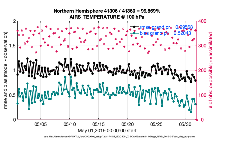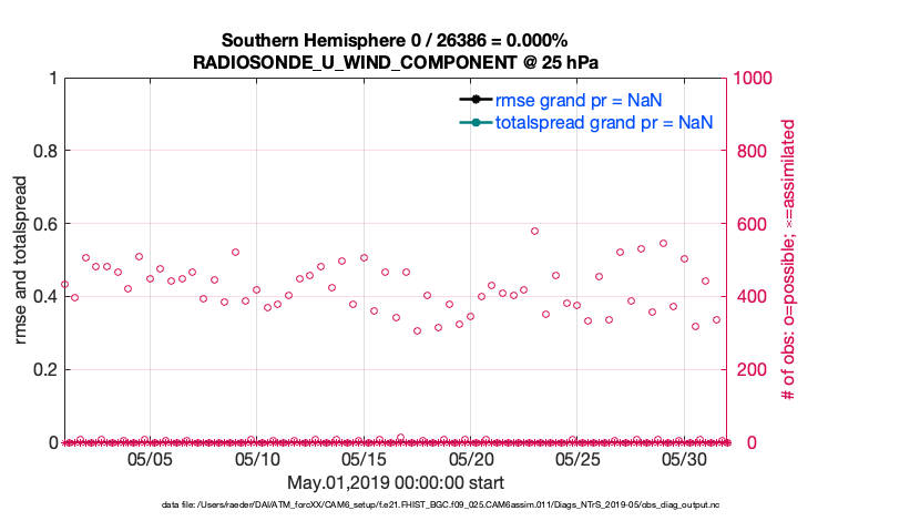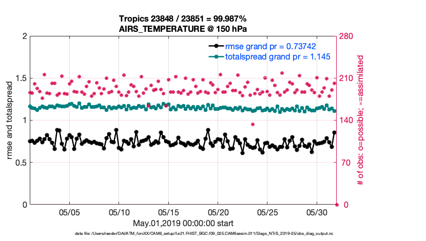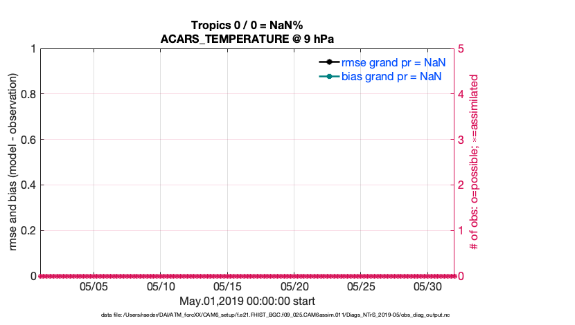 For each observation kind, the root-mean-squared-error (RMSE) is plotted together with: (i) BIAS and (ii) TOTALSPREAD. The number of available, assimilated (evaluated) and rejected observations are also shown on the plots.