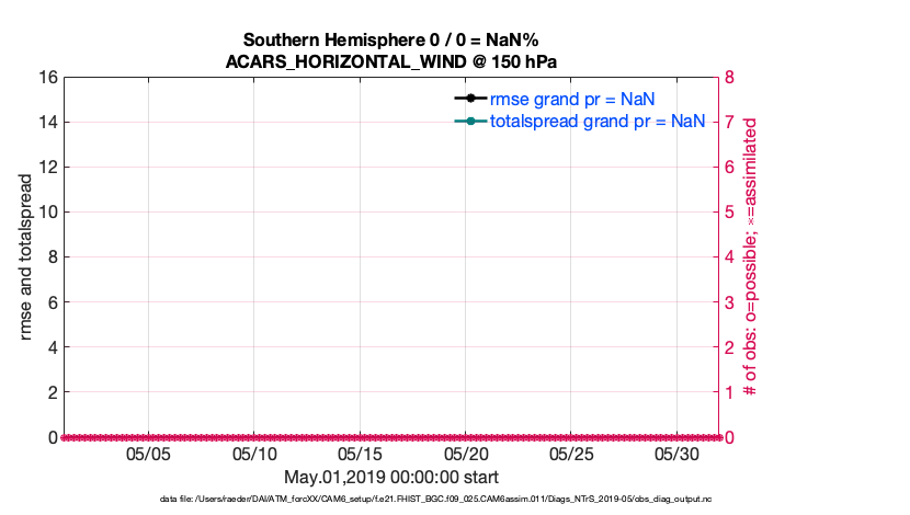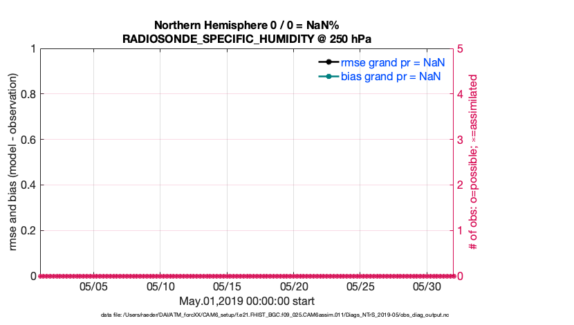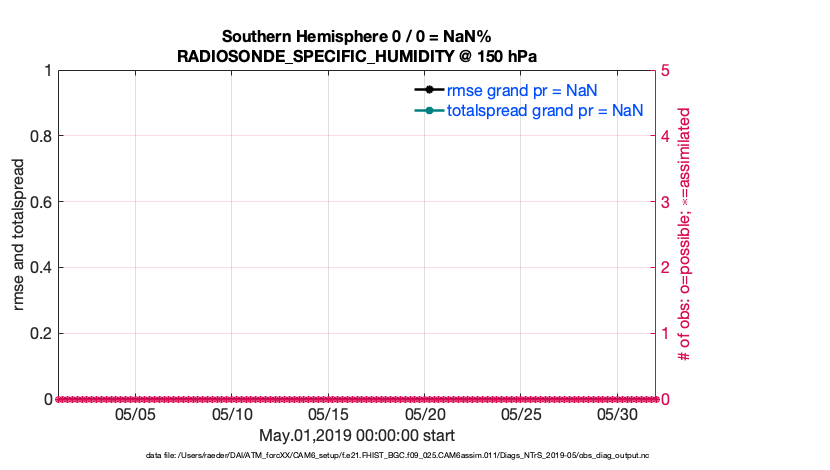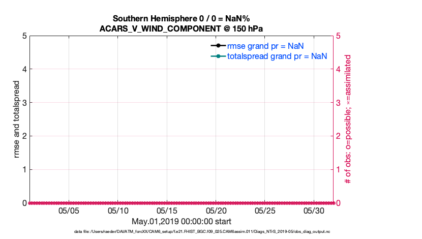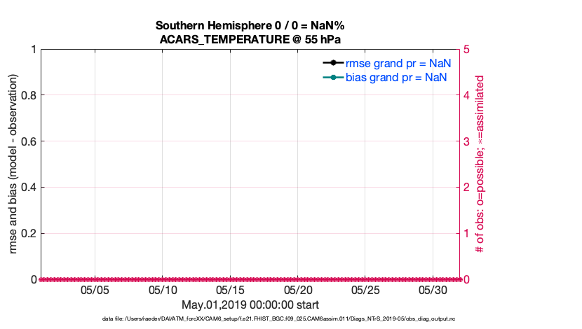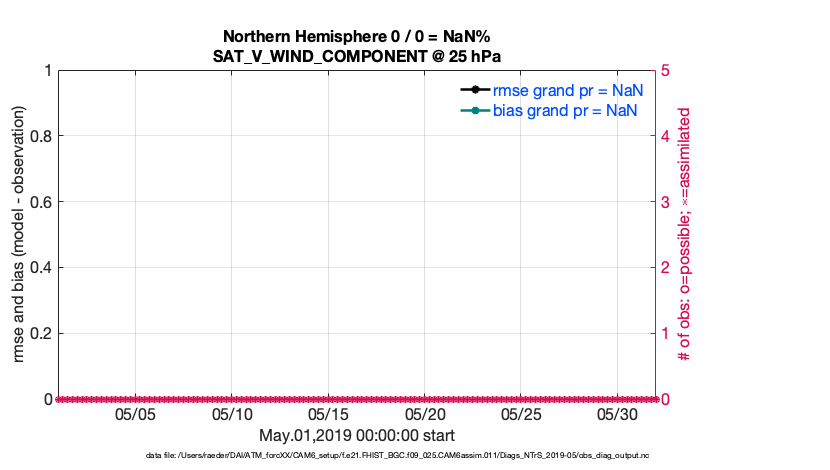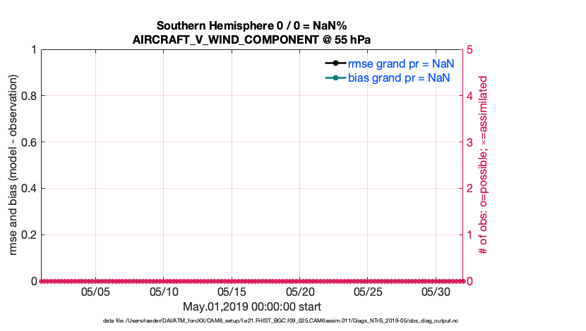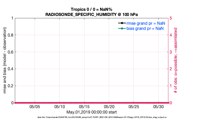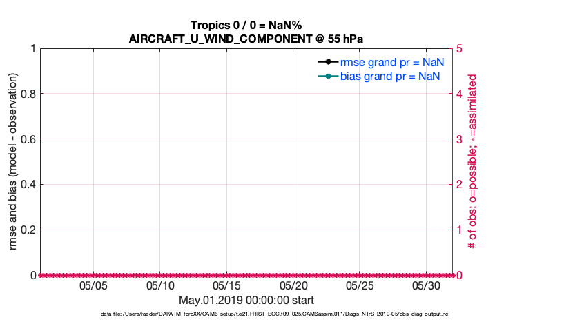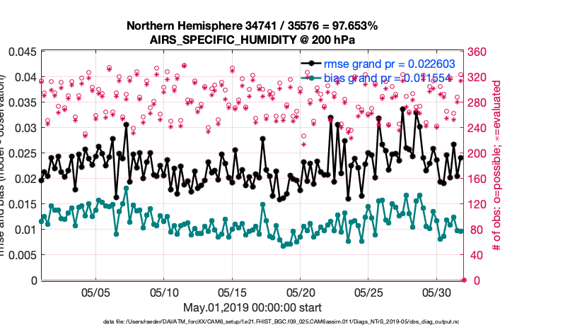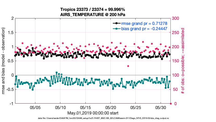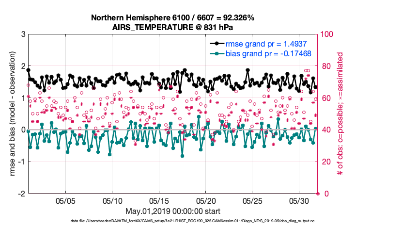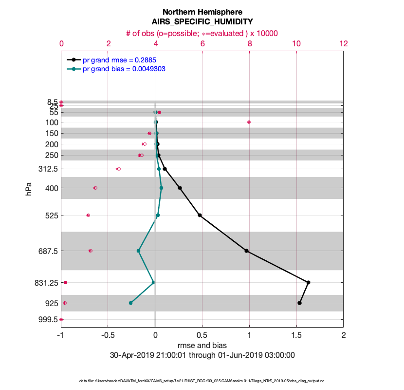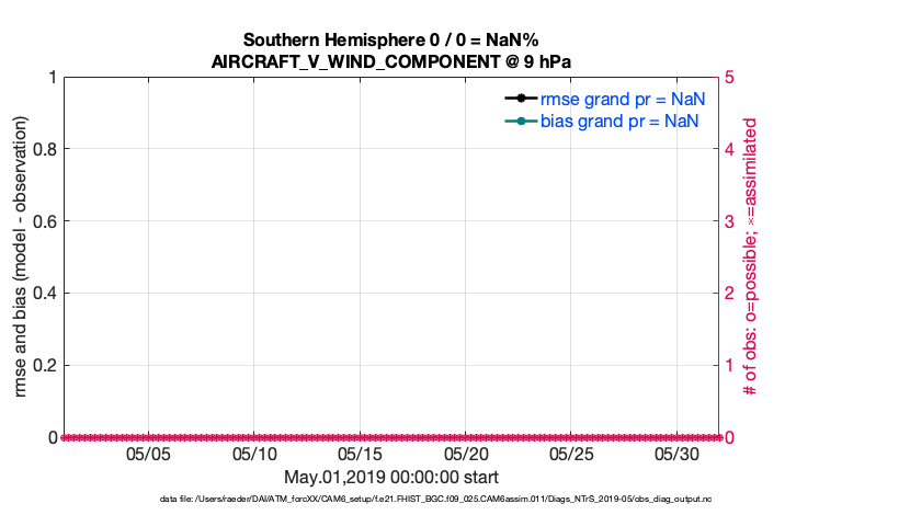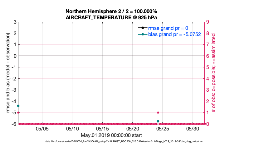 For each observation kind, the root-mean-squared-error (RMSE) is plotted together with: (i) BIAS and (ii) TOTALSPREAD. The number of available, assimilated (evaluated) and rejected observations are also shown on the plots.