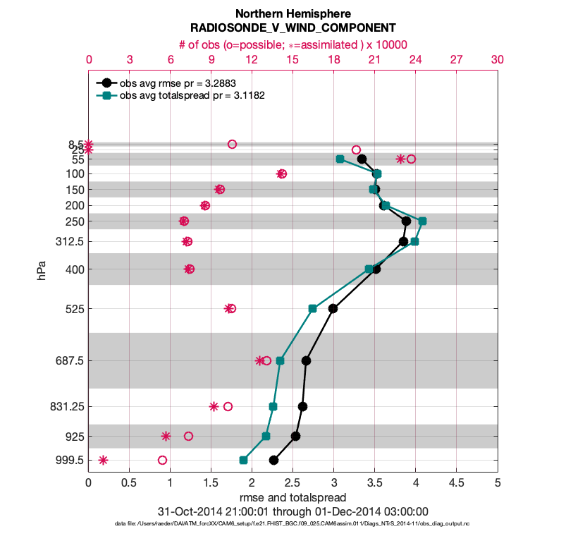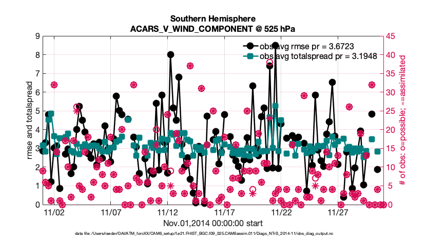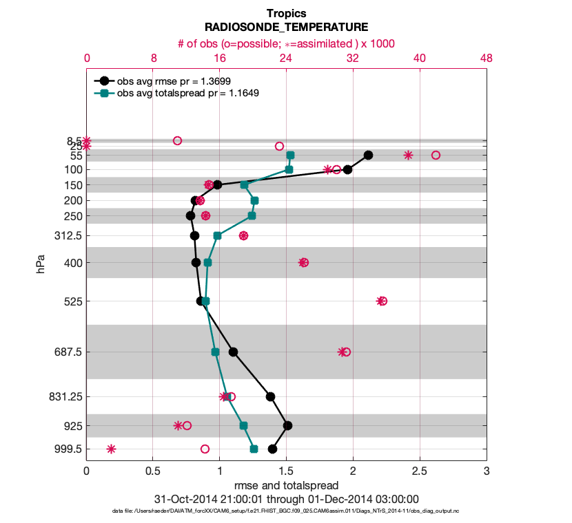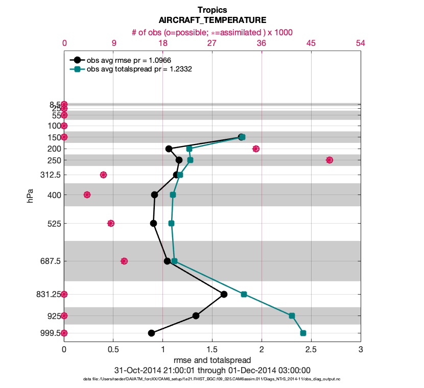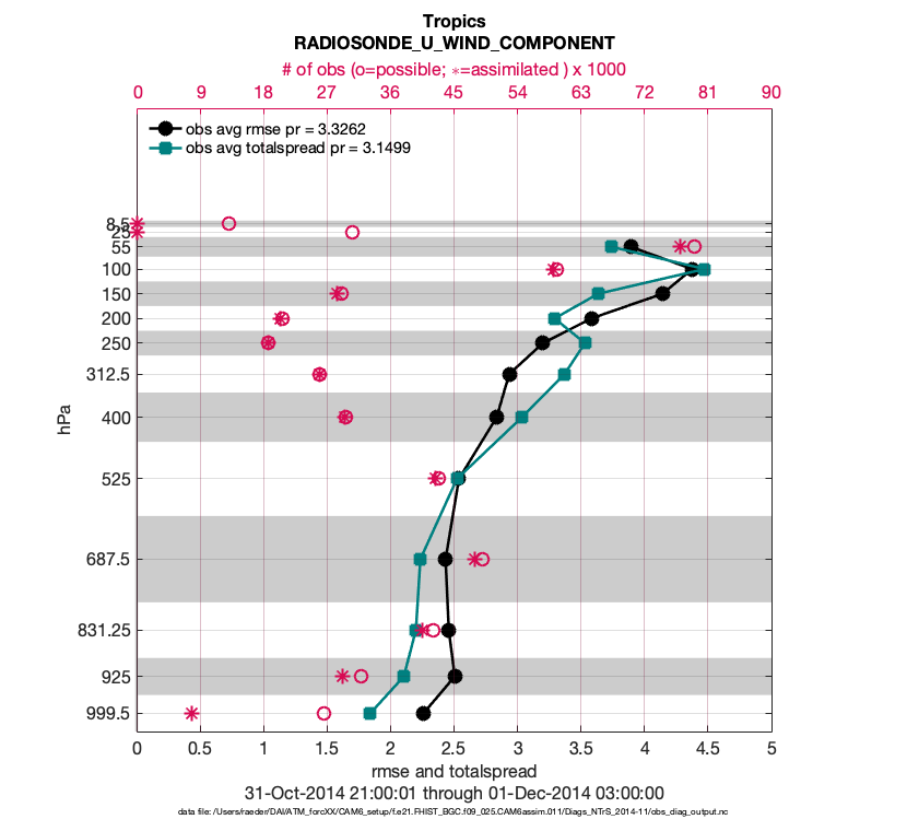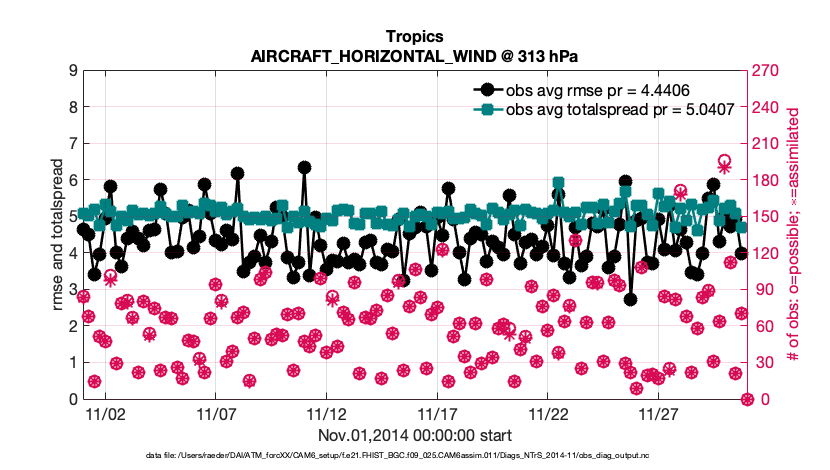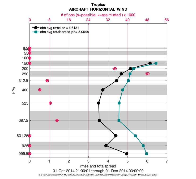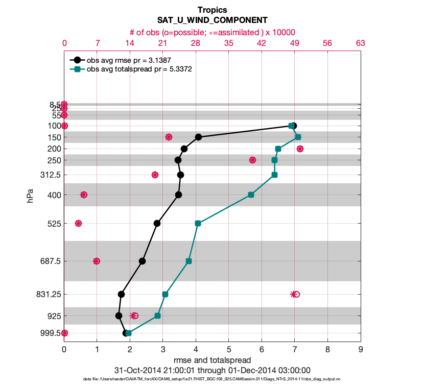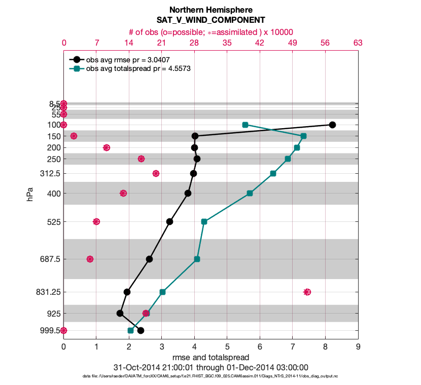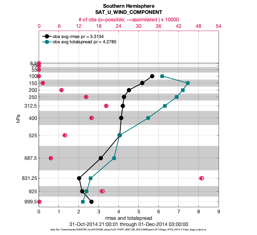 For each observation kind, the root-mean-squared-error (RMSE) is plotted together with: (i) BIAS and (ii) TOTALSPREAD. The number of available, assimilated (evaluated) and rejected observations are also shown on the plots.