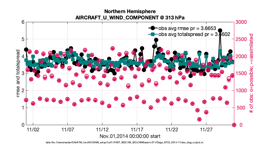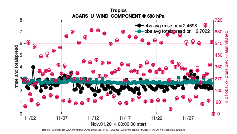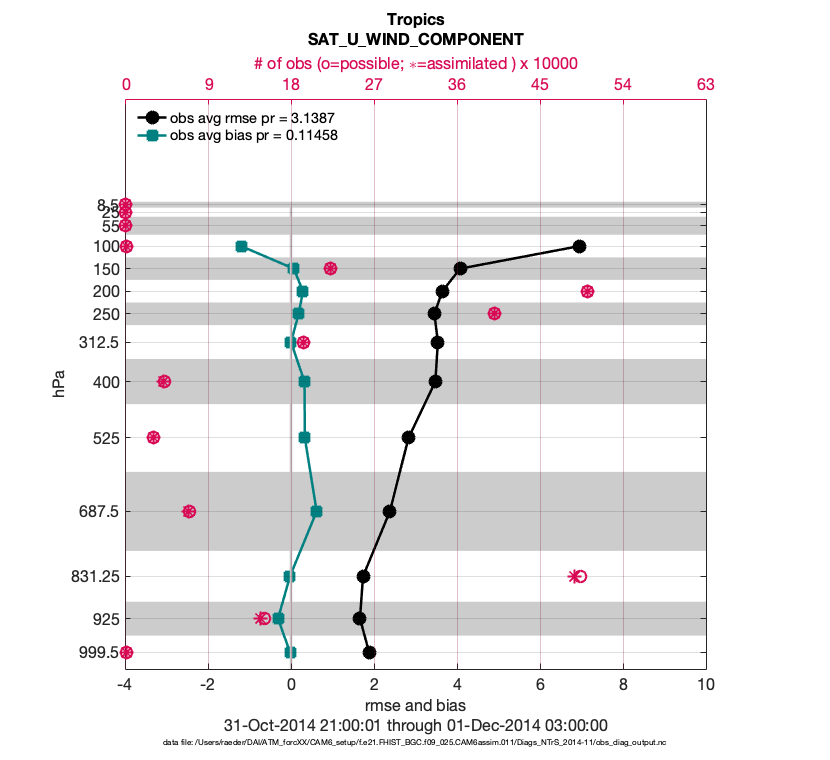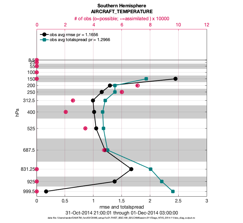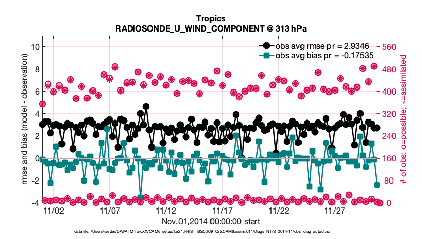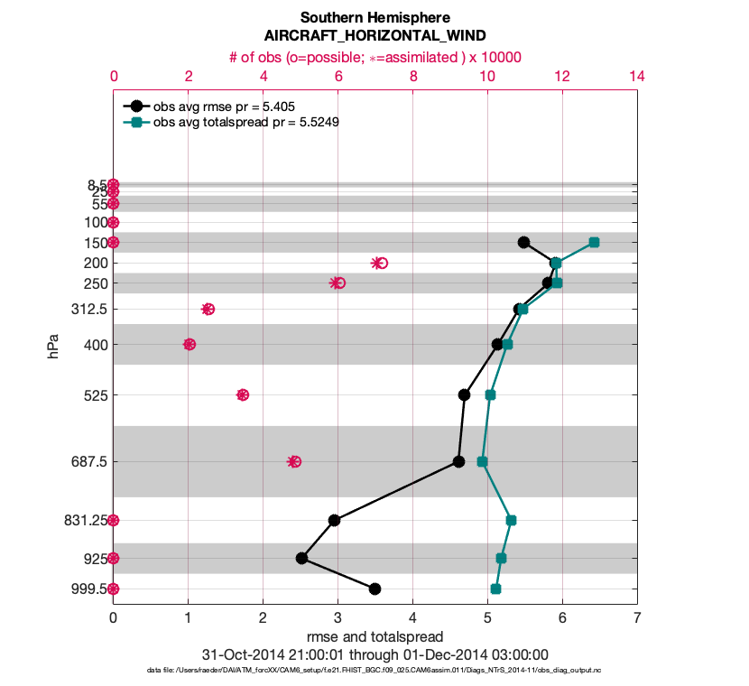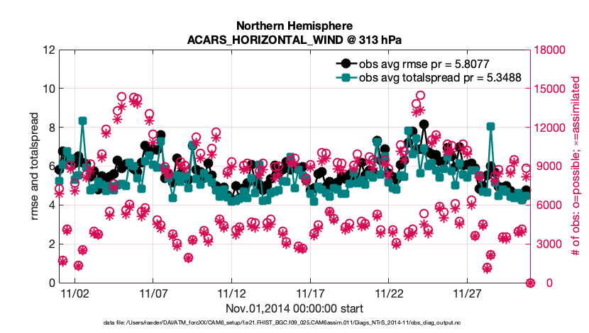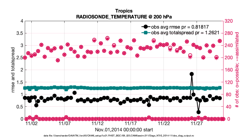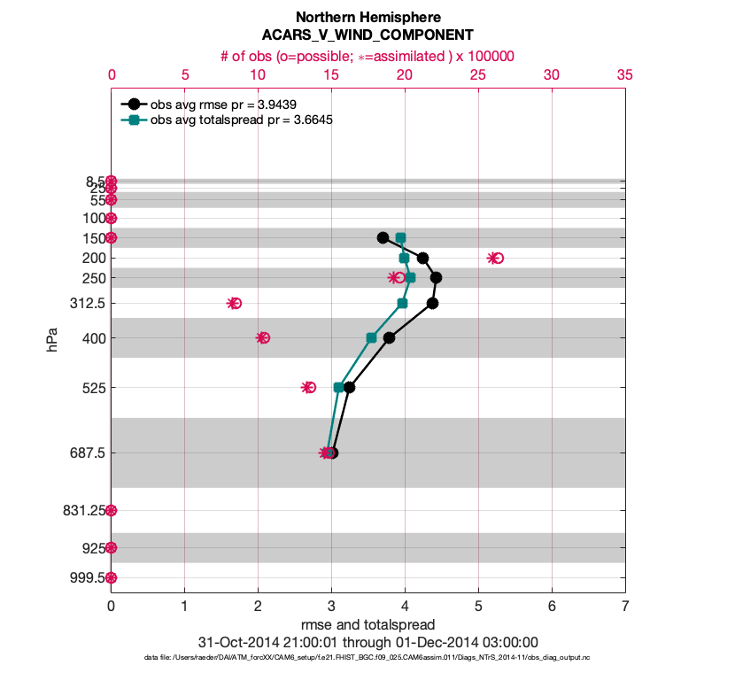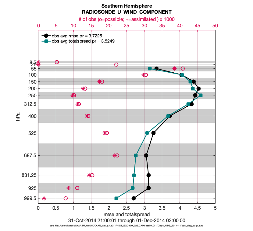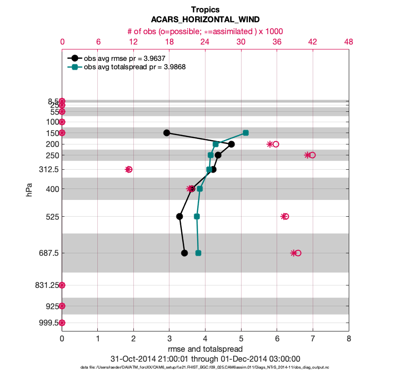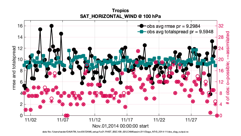 For each observation kind, the root-mean-squared-error (RMSE) is plotted together with: (i) BIAS and (ii) TOTALSPREAD. The number of available, assimilated (evaluated) and rejected observations are also shown on the plots.