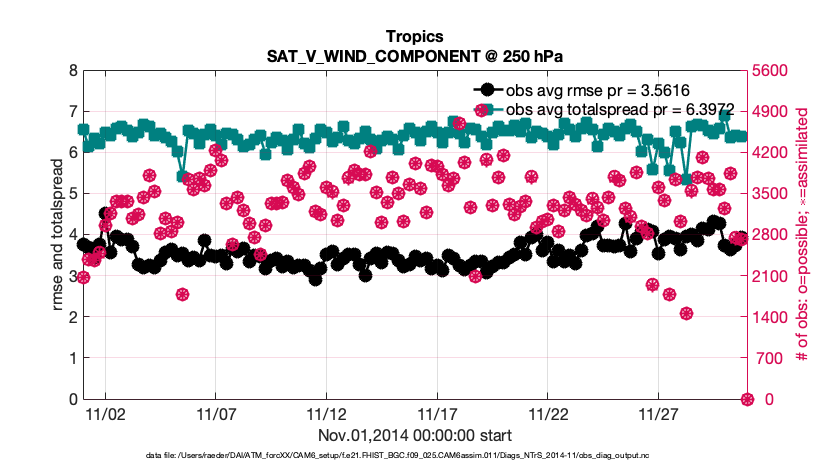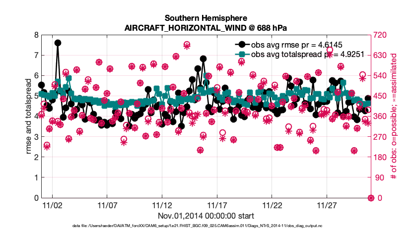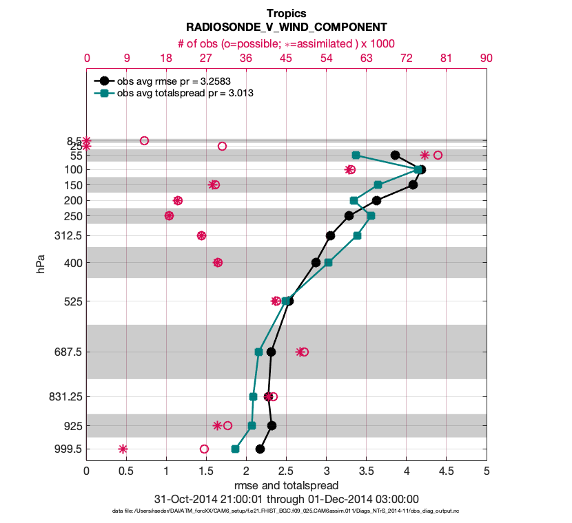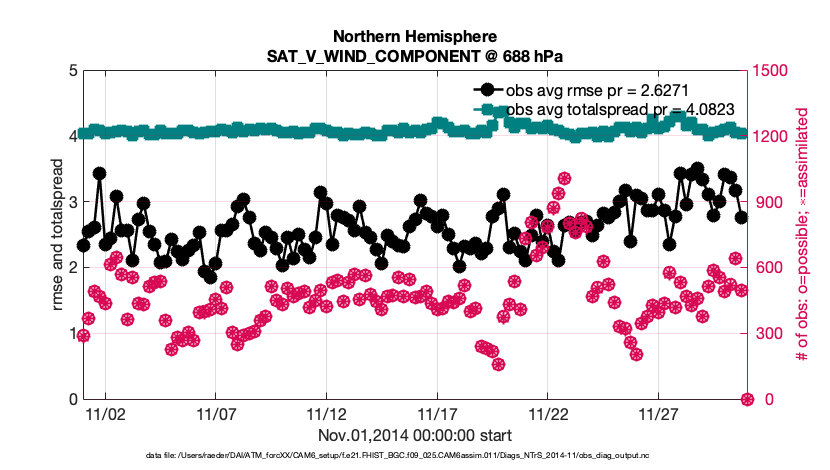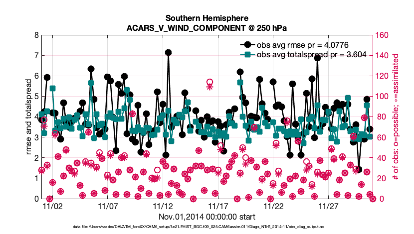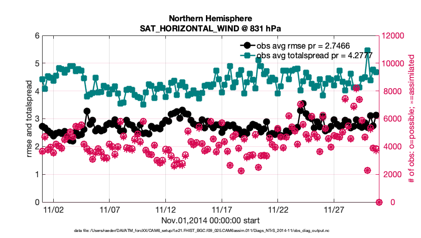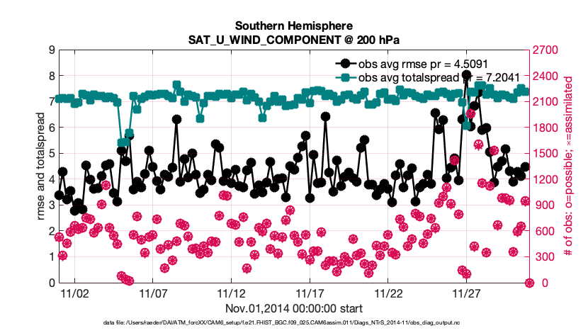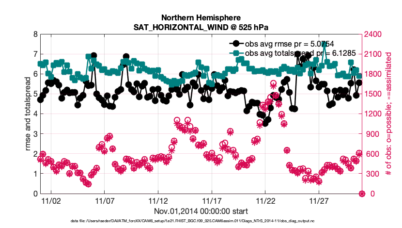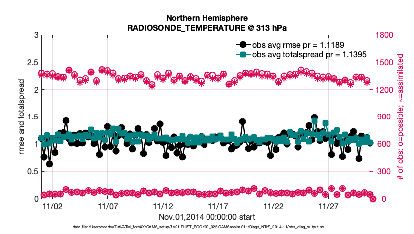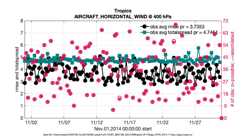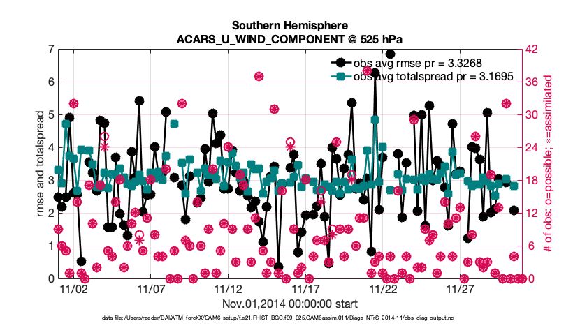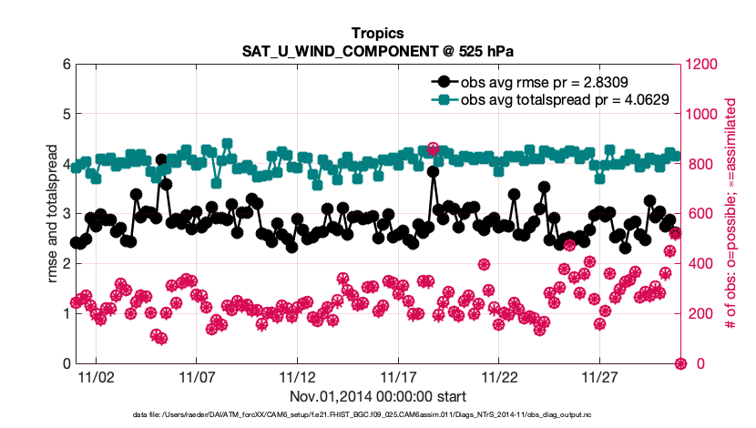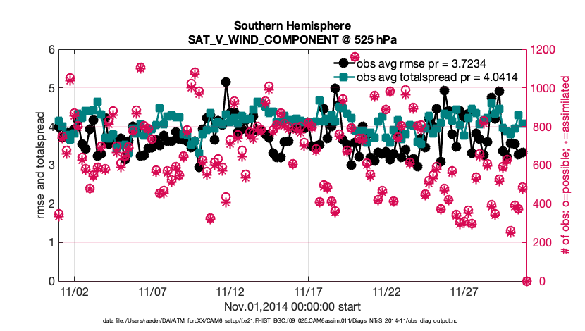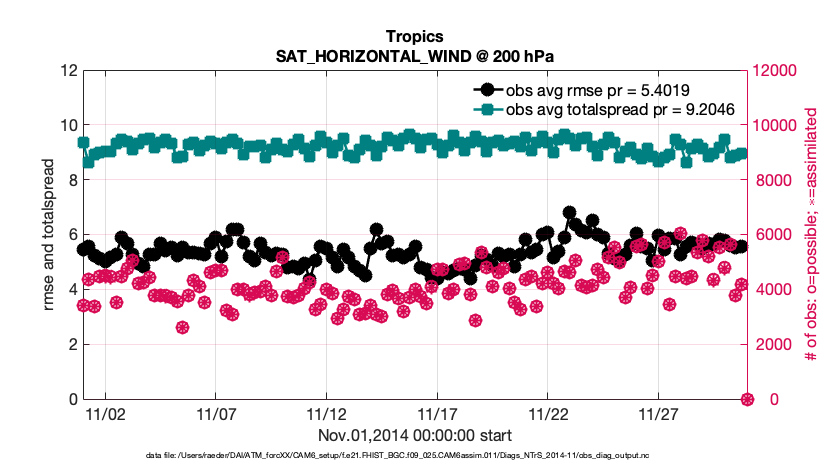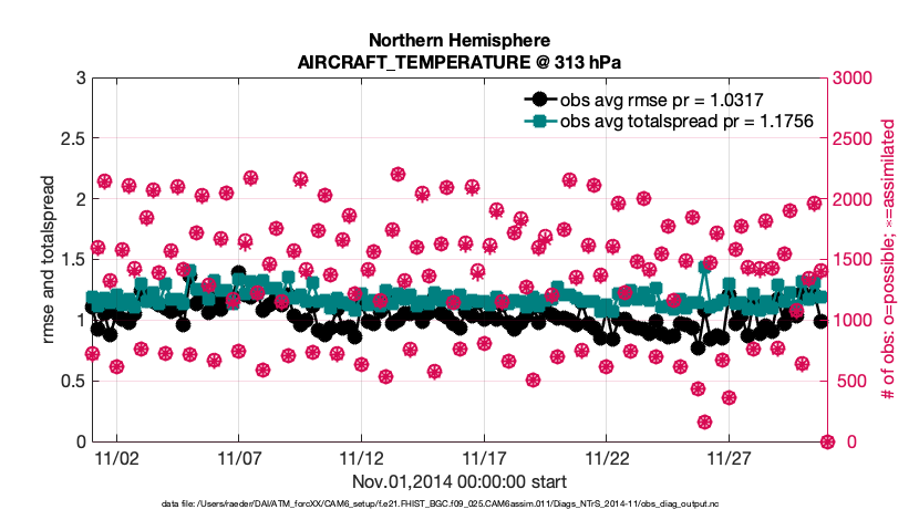 For each observation kind, the root-mean-squared-error (RMSE) is plotted together with: (i) BIAS and (ii) TOTALSPREAD. The number of available, assimilated (evaluated) and rejected observations are also shown on the plots.