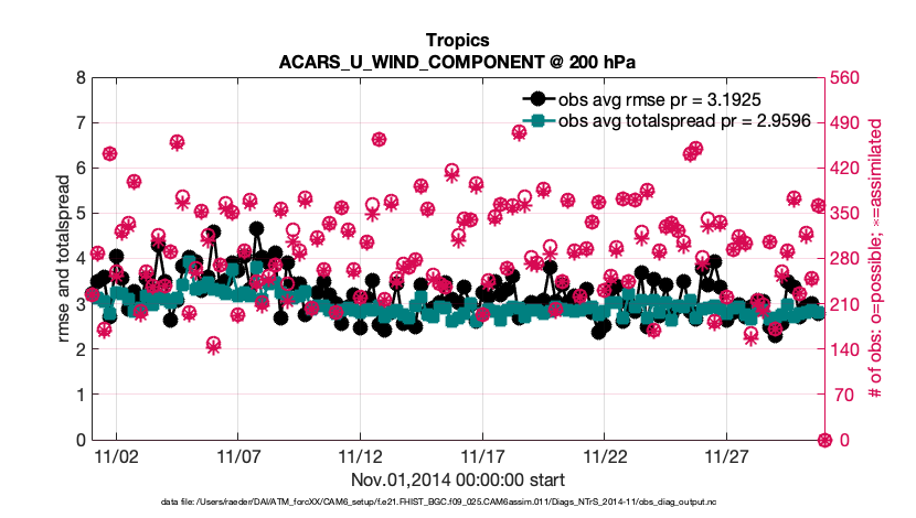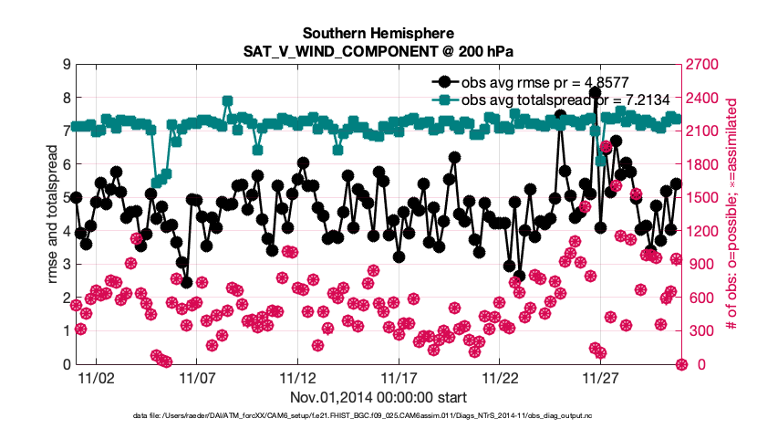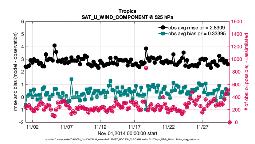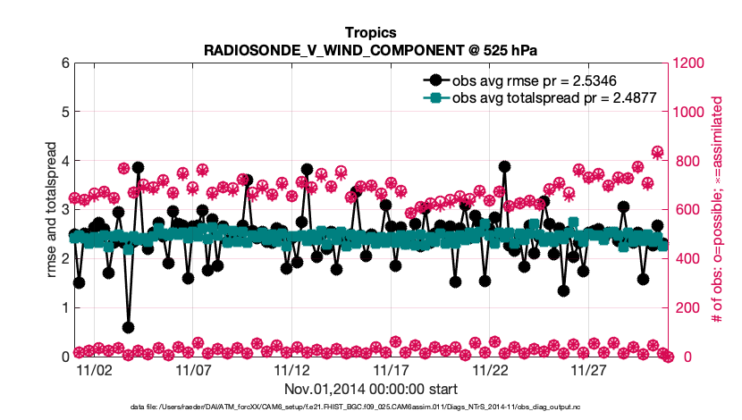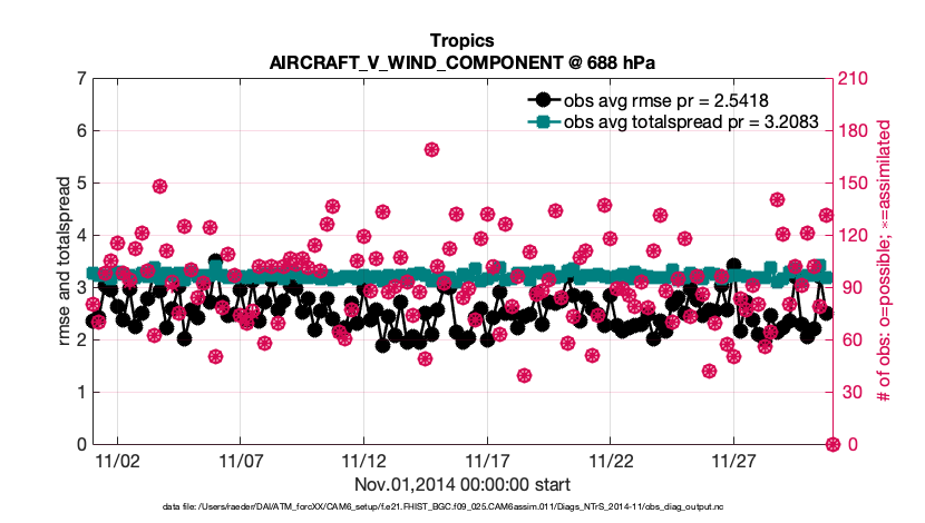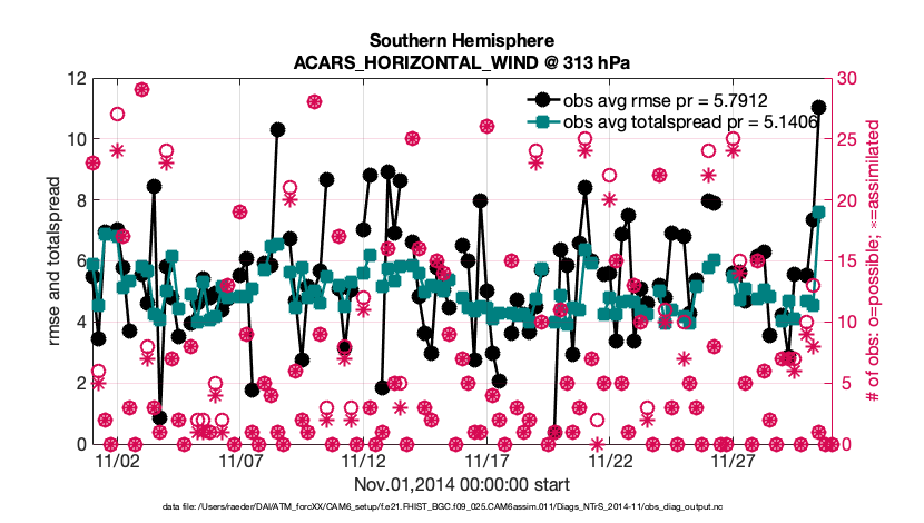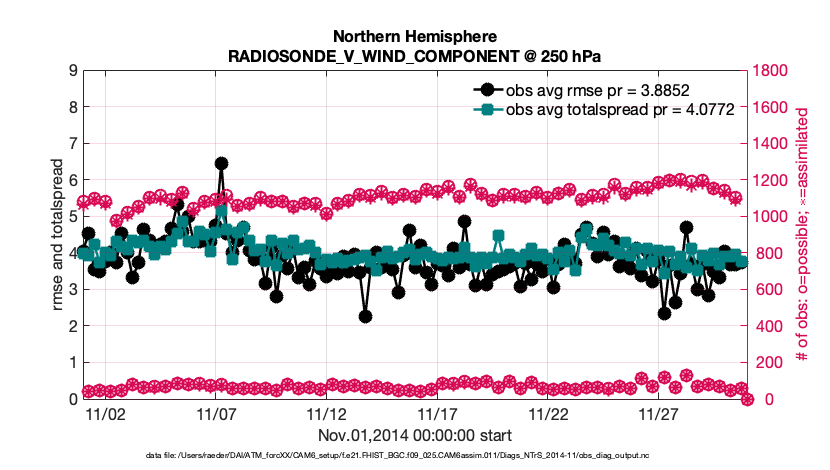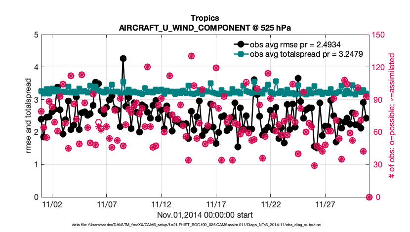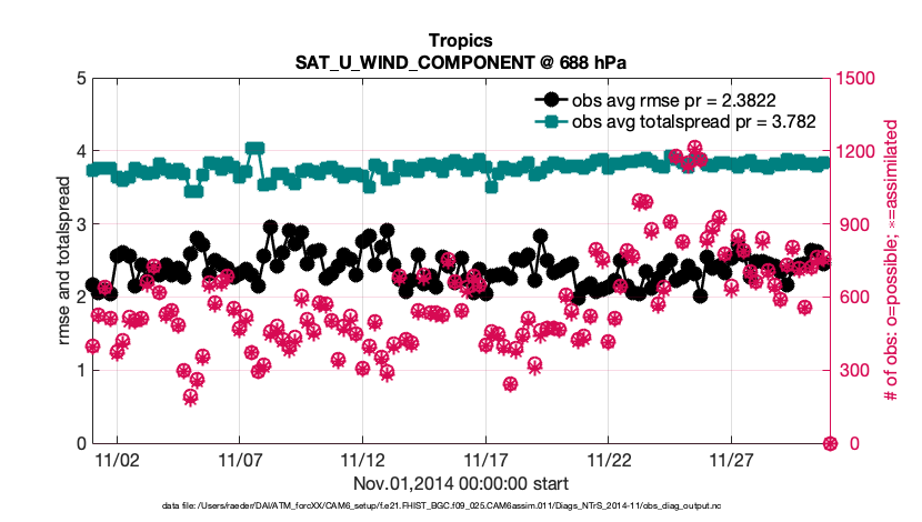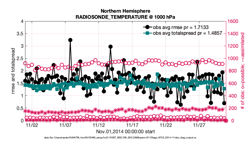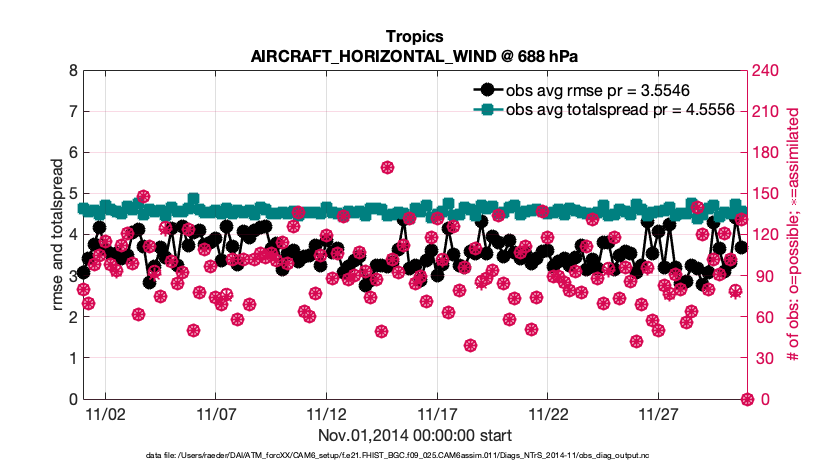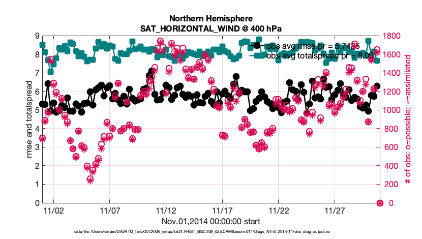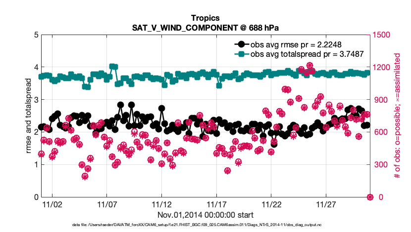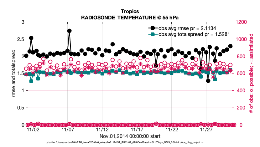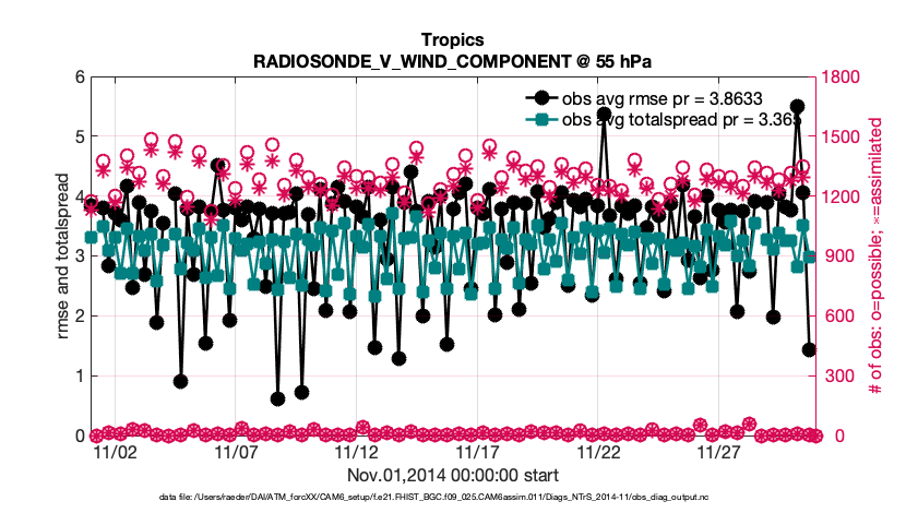 For each observation kind, the root-mean-squared-error (RMSE) is plotted together with: (i) BIAS and (ii) TOTALSPREAD. The number of available, assimilated (evaluated) and rejected observations are also shown on the plots.