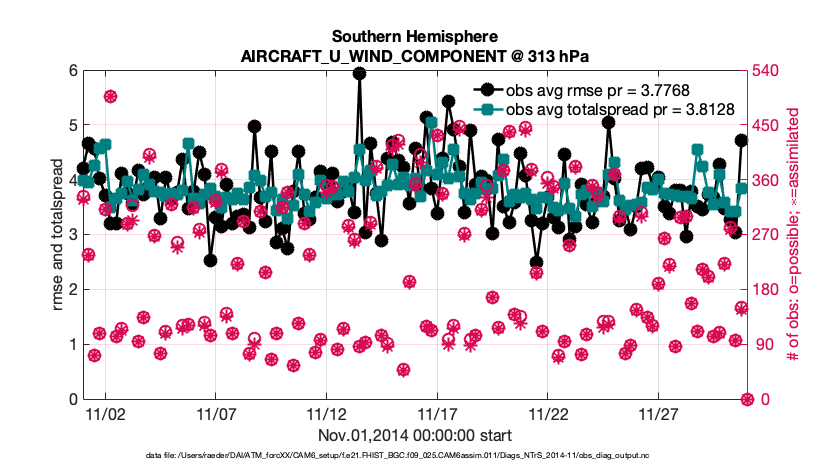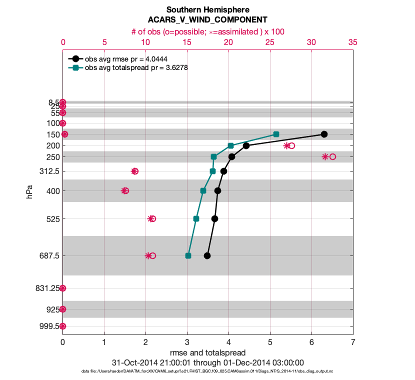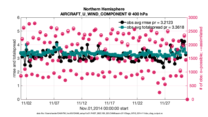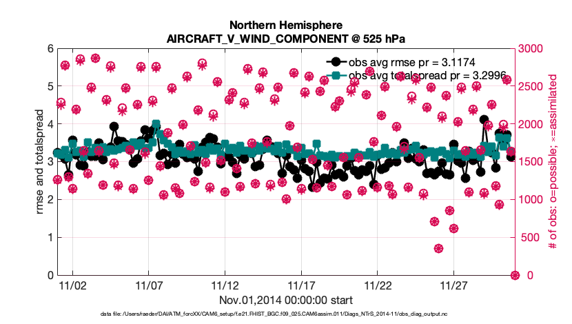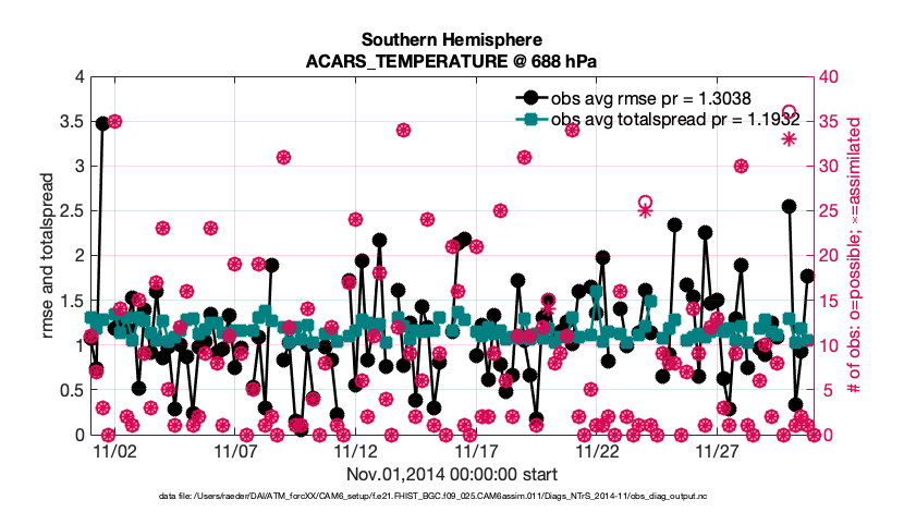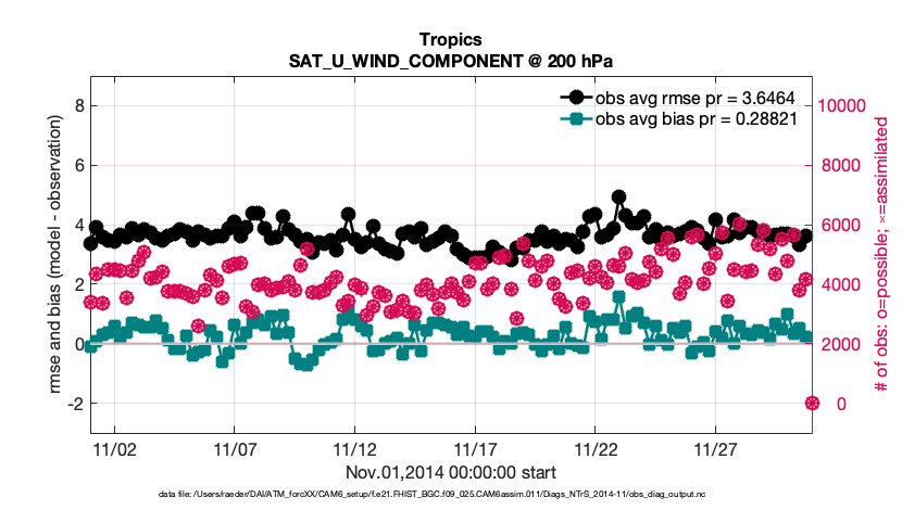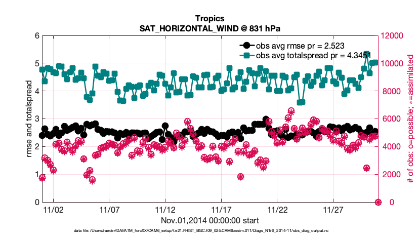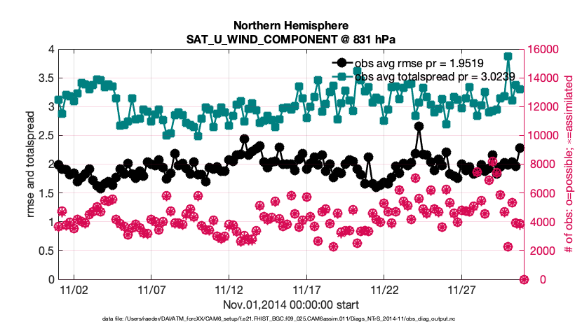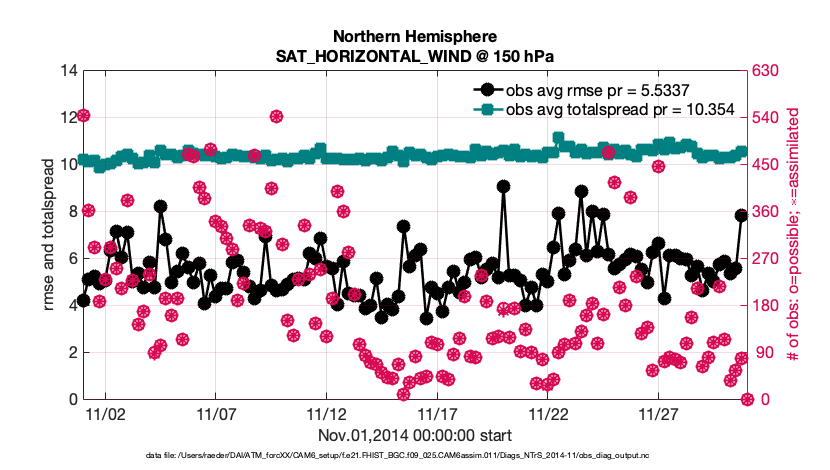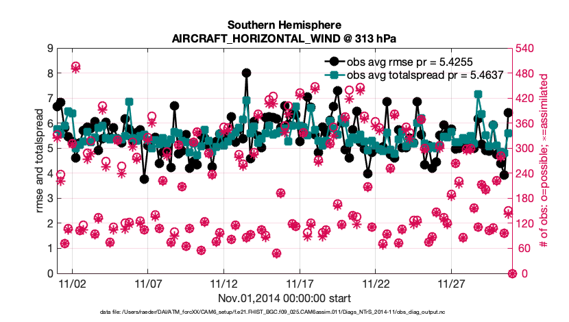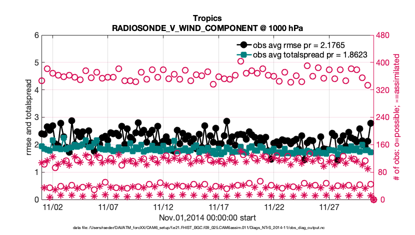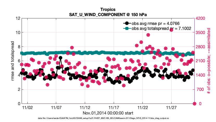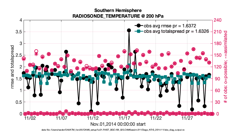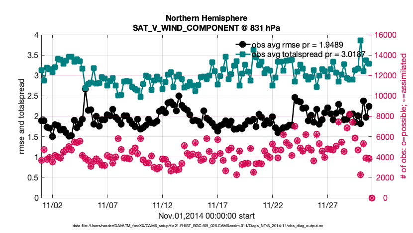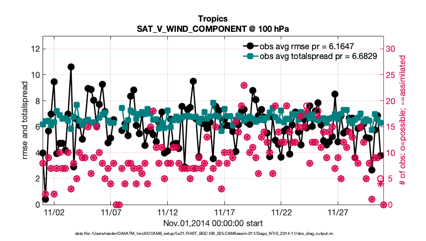 For each observation kind, the root-mean-squared-error (RMSE) is plotted together with: (i) BIAS and (ii) TOTALSPREAD. The number of available, assimilated (evaluated) and rejected observations are also shown on the plots.