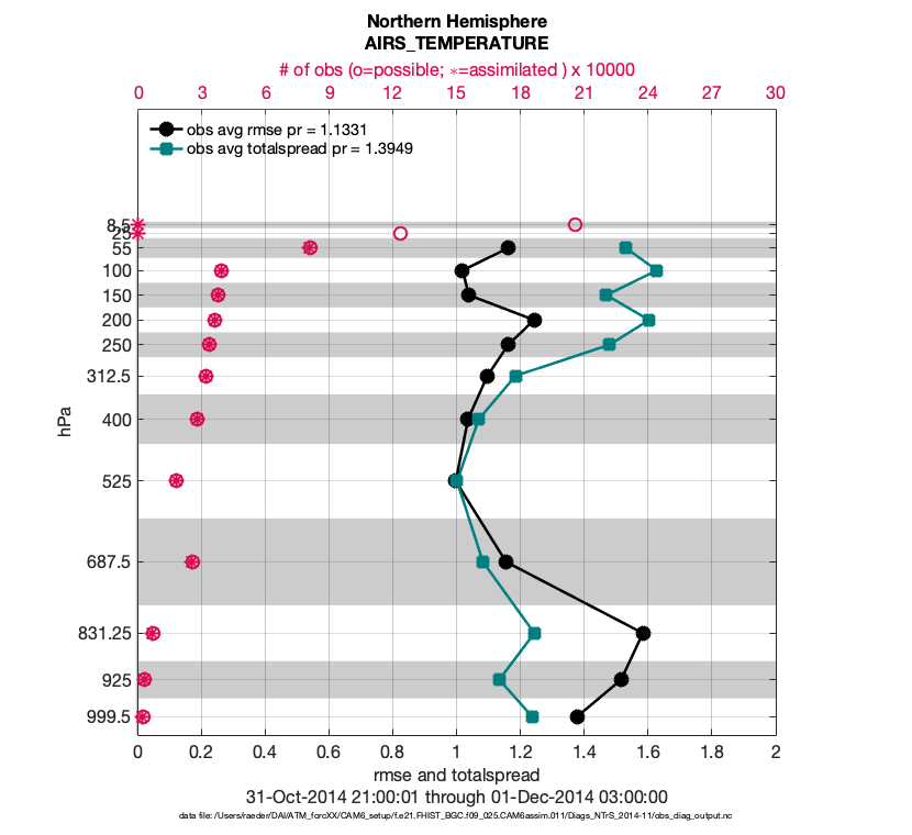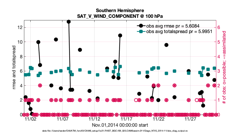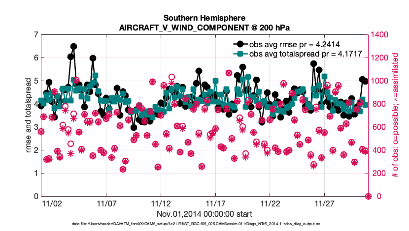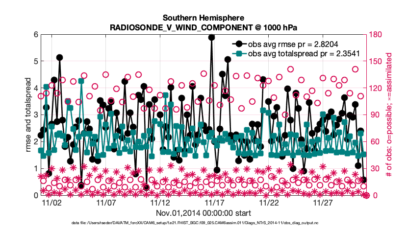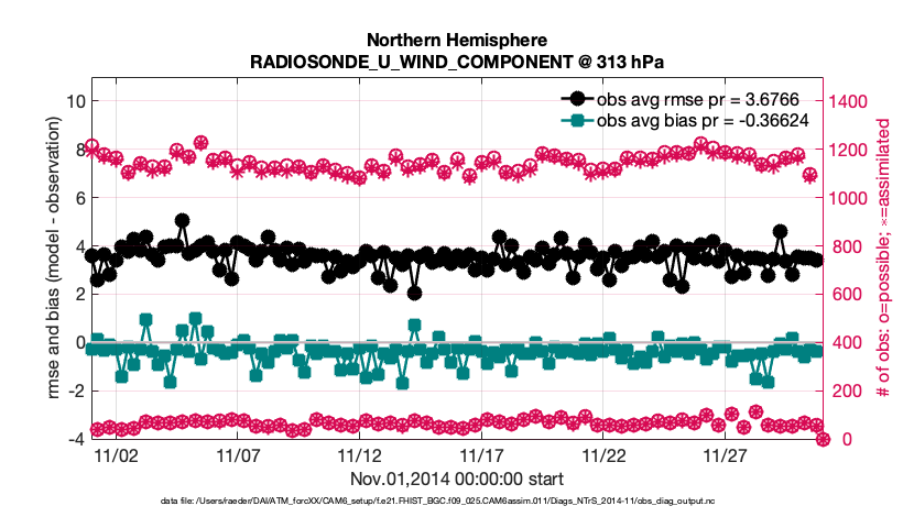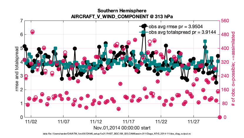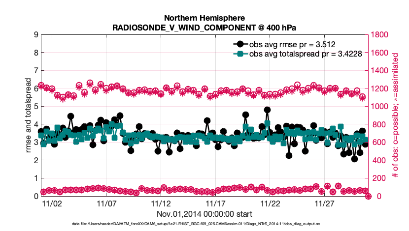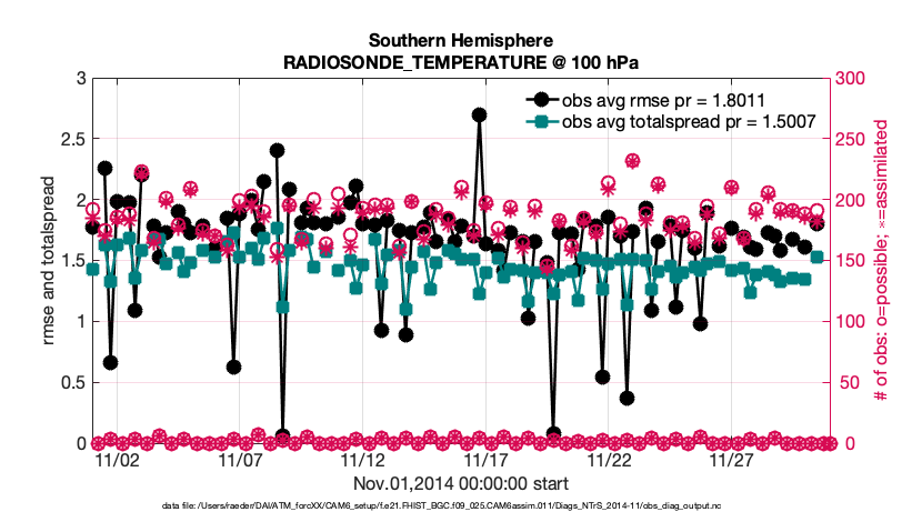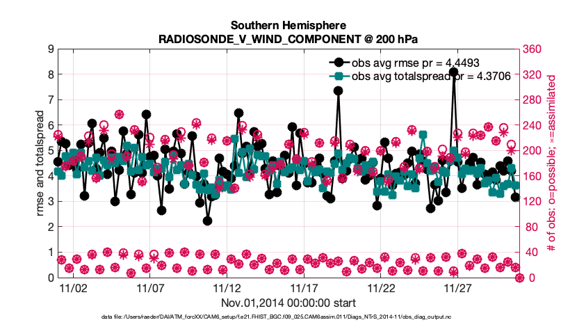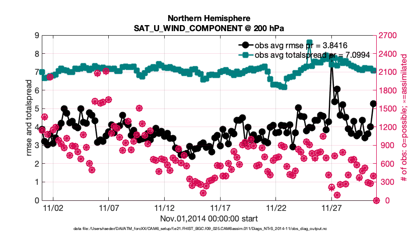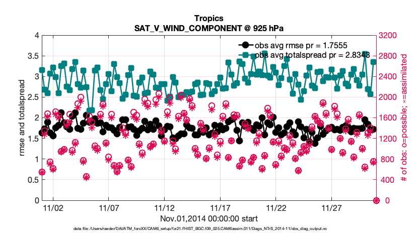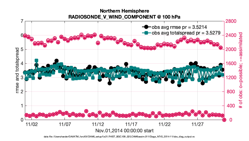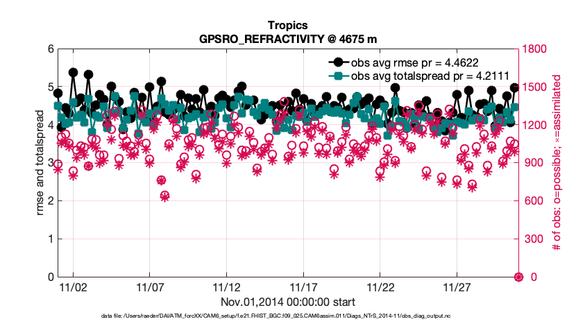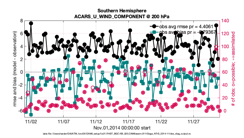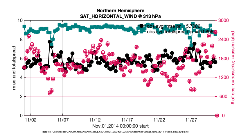 For each observation kind, the root-mean-squared-error (RMSE) is plotted together with: (i) BIAS and (ii) TOTALSPREAD. The number of available, assimilated (evaluated) and rejected observations are also shown on the plots.