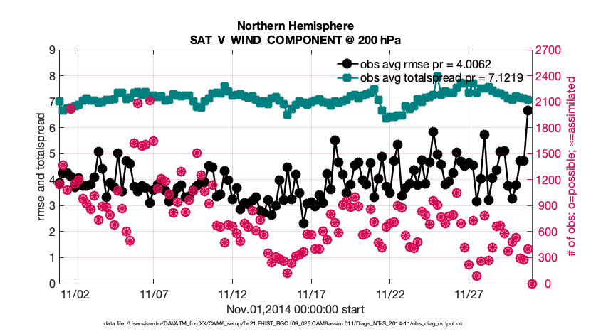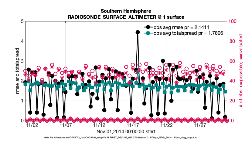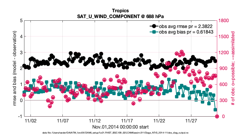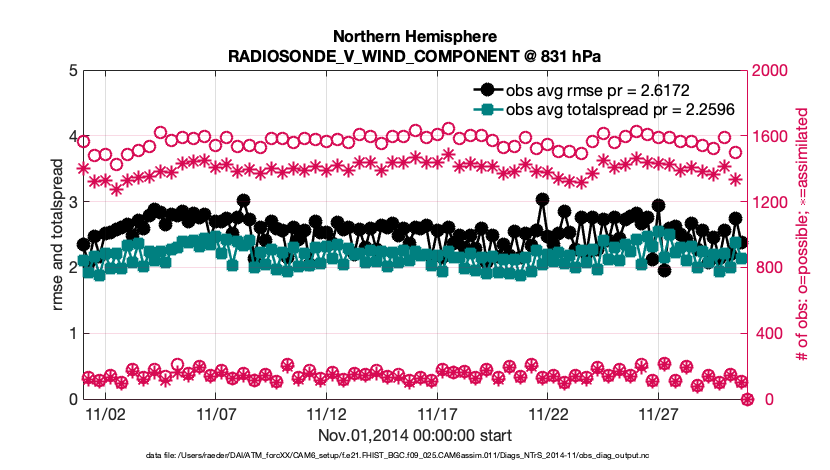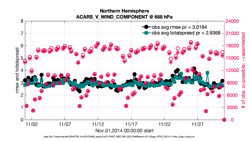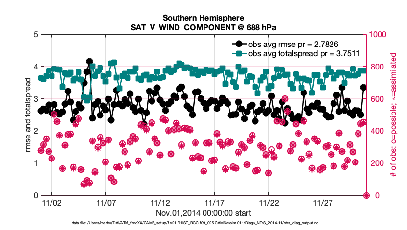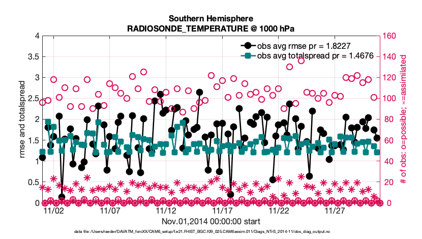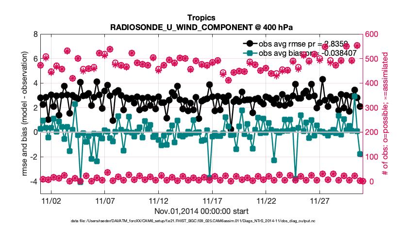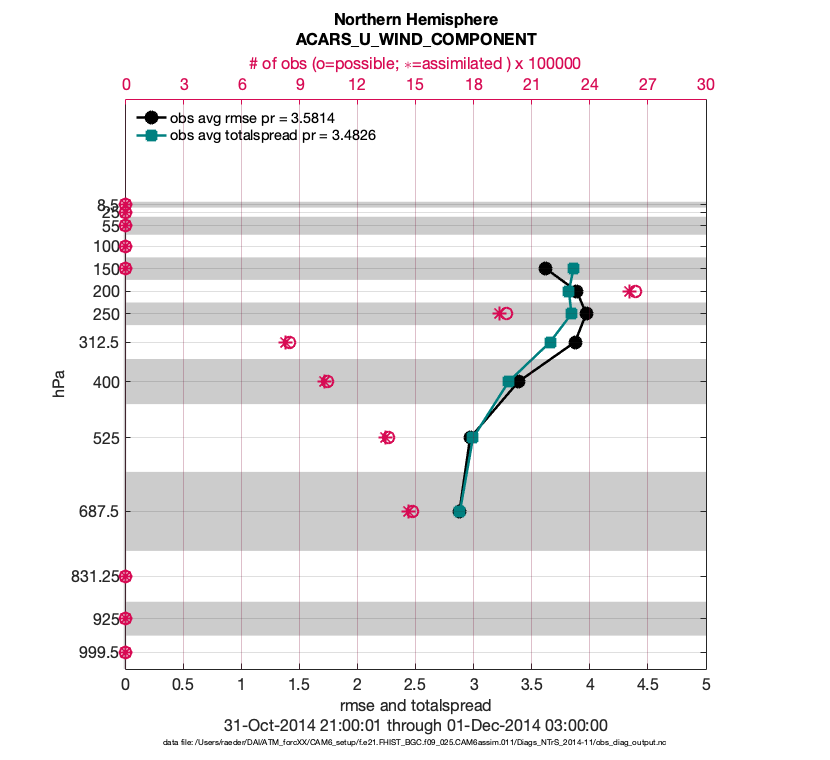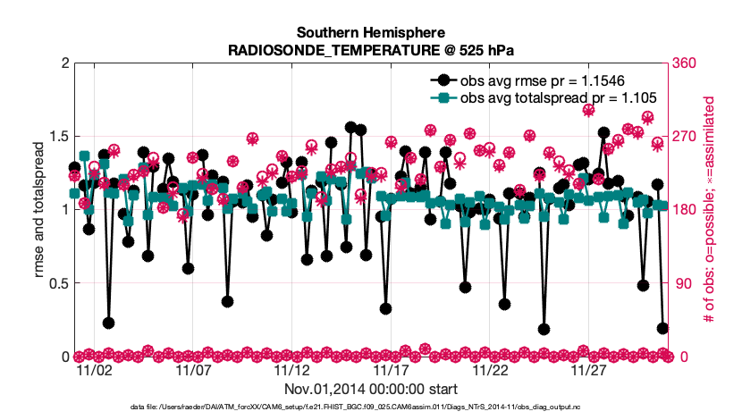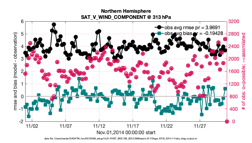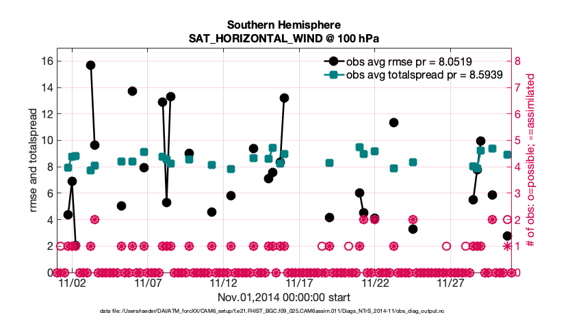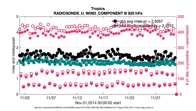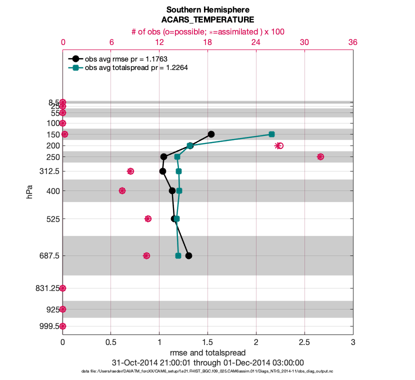 For each observation kind, the root-mean-squared-error (RMSE) is plotted together with: (i) BIAS and (ii) TOTALSPREAD. The number of available, assimilated (evaluated) and rejected observations are also shown on the plots.