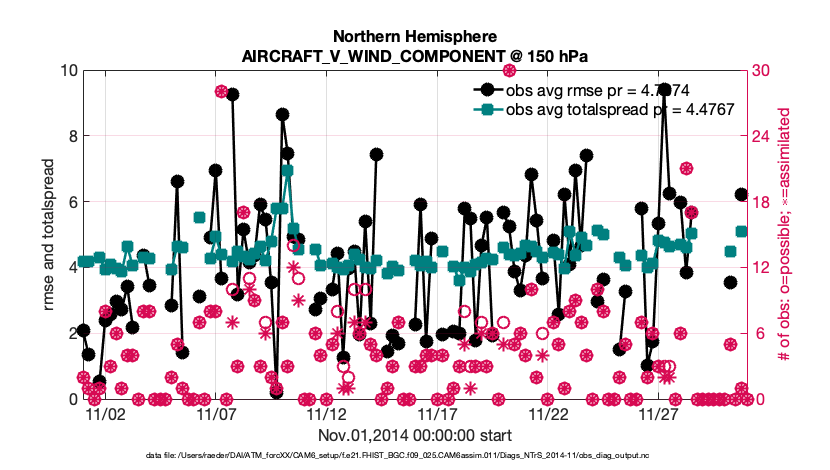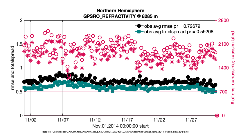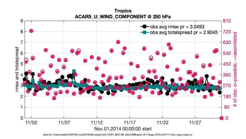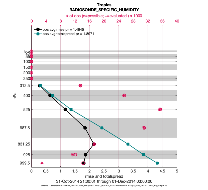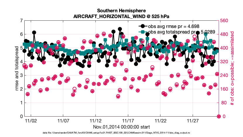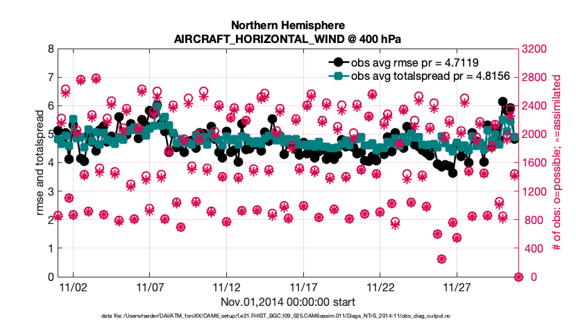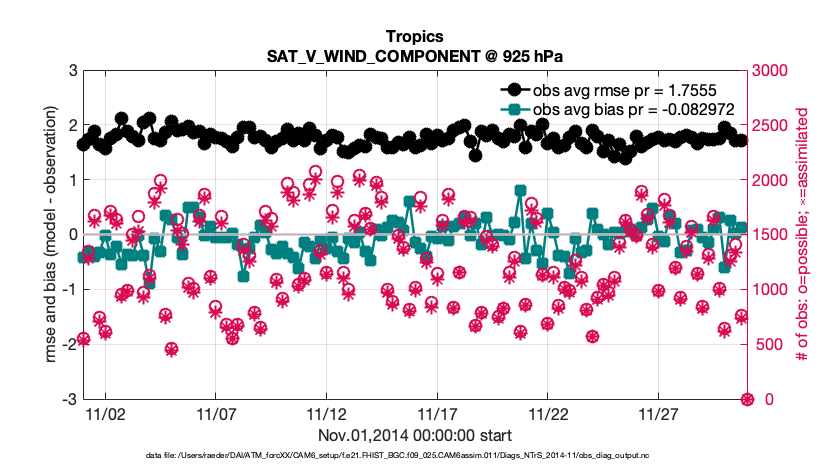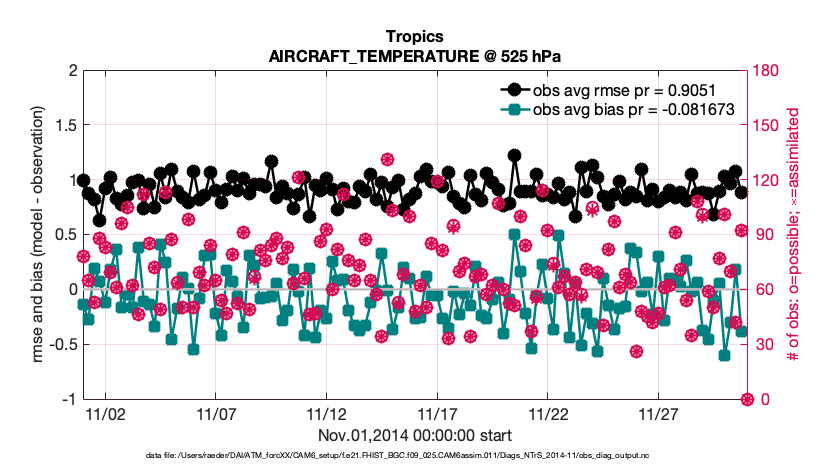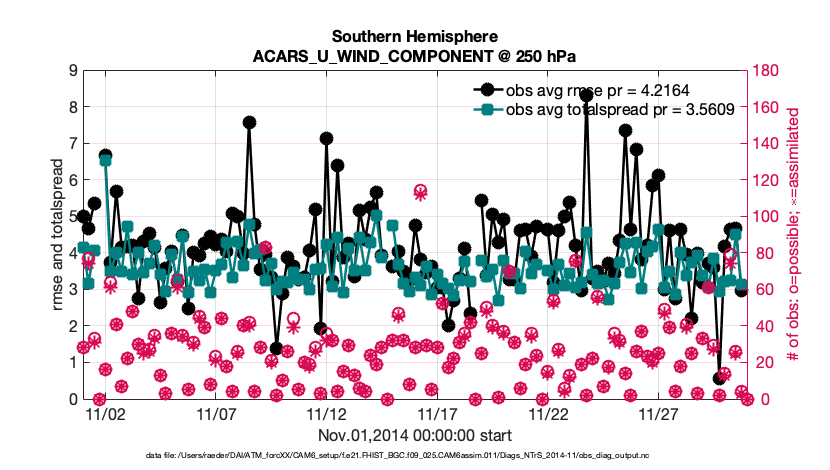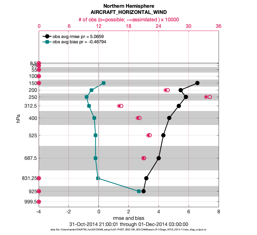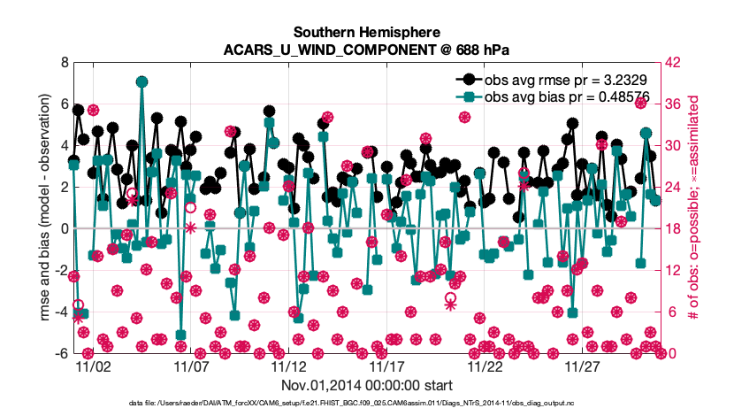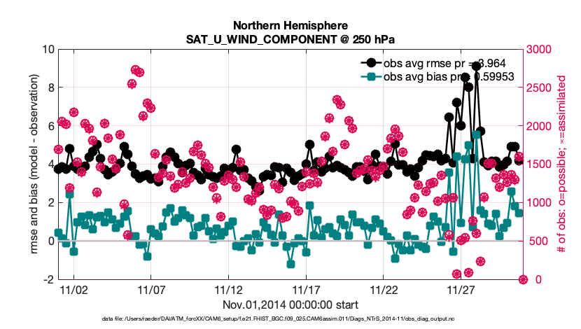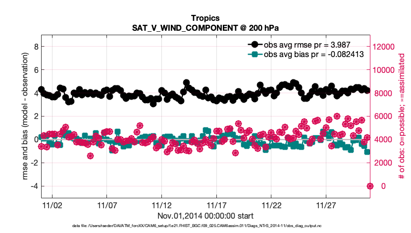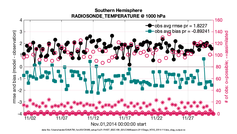 For each observation kind, the root-mean-squared-error (RMSE) is plotted together with: (i) BIAS and (ii) TOTALSPREAD. The number of available, assimilated (evaluated) and rejected observations are also shown on the plots.